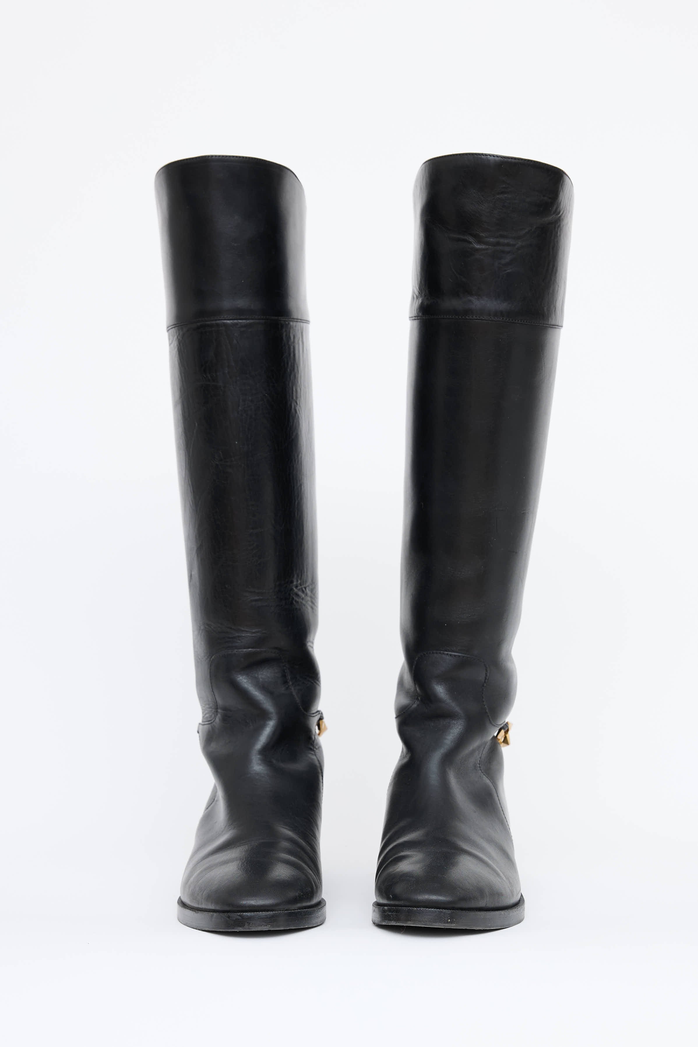 Pre-owned Jimmy Choo black leather Nell boot featuring round toe, stacked heel, and gold tone chain at ankle.