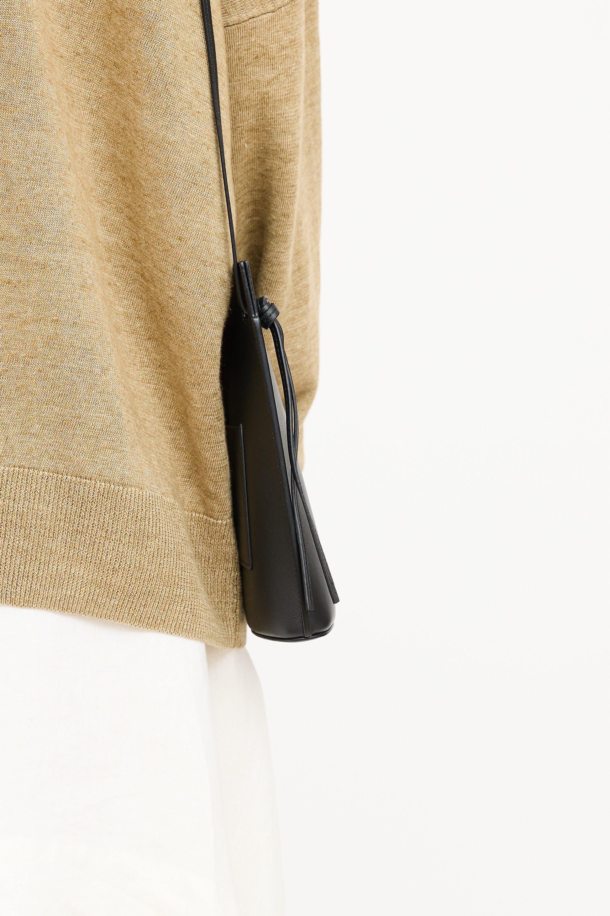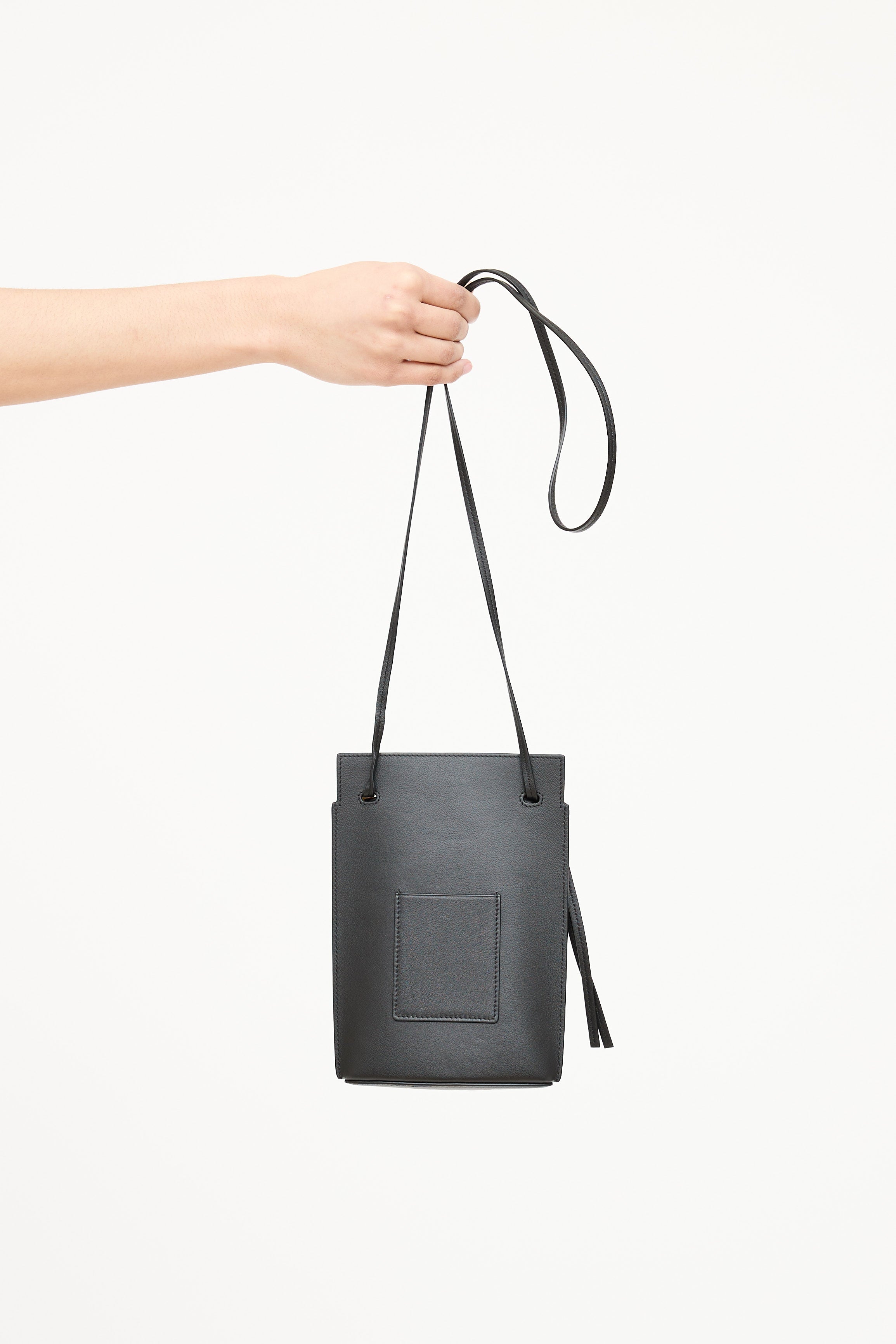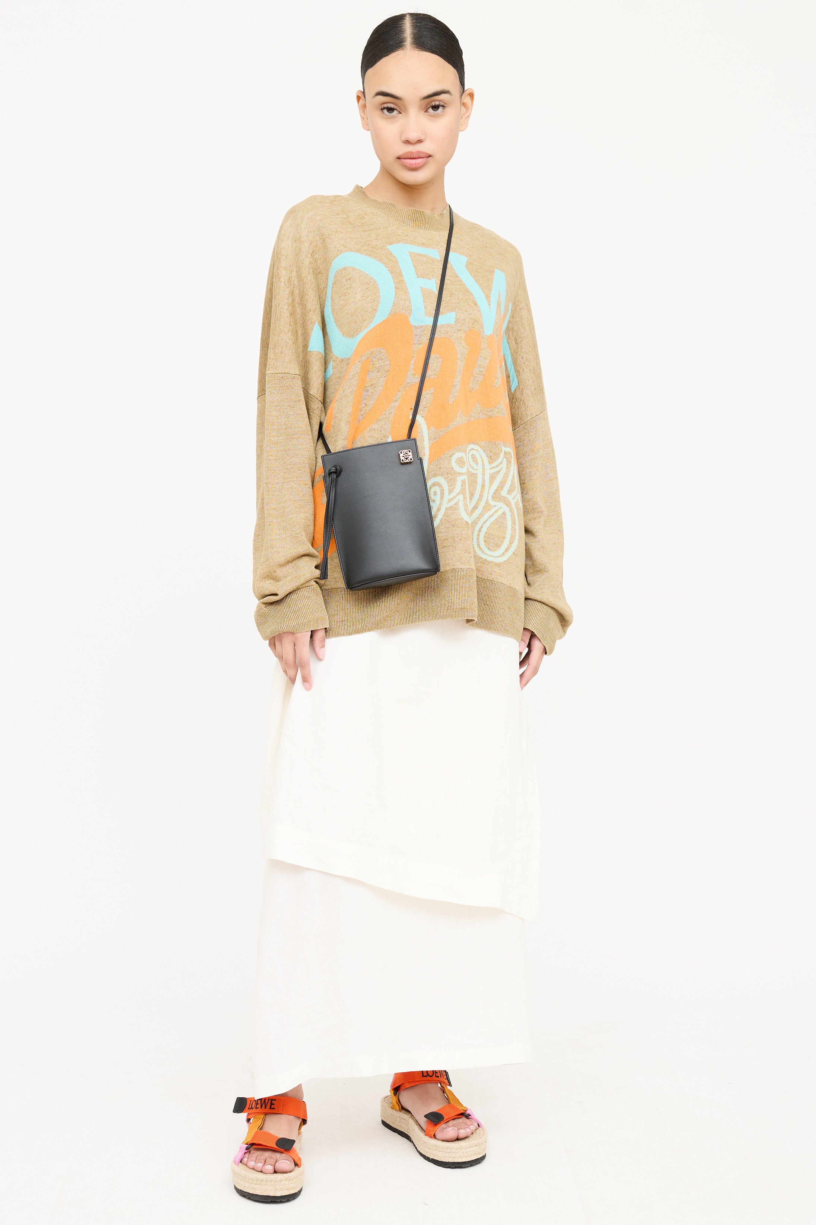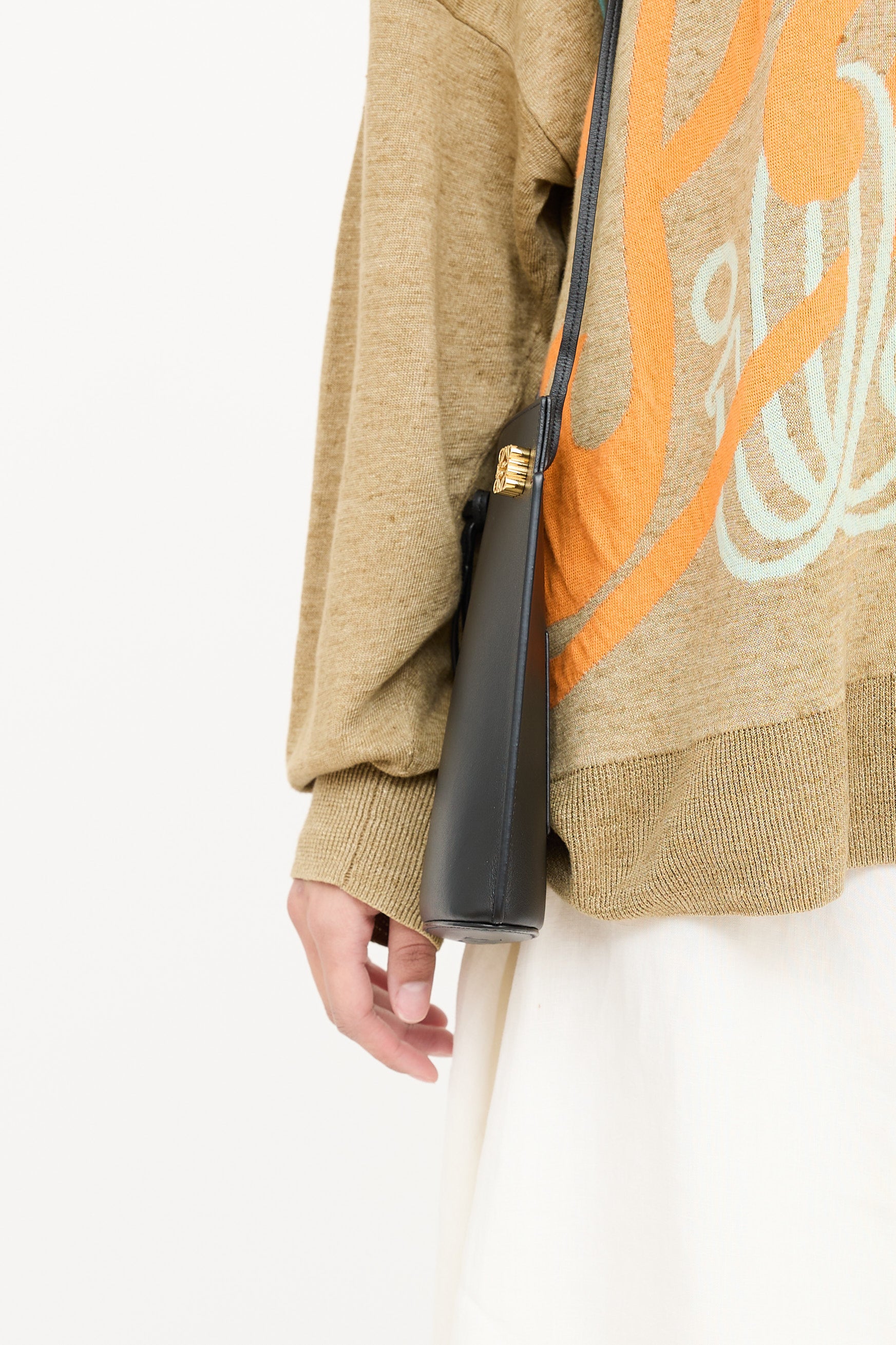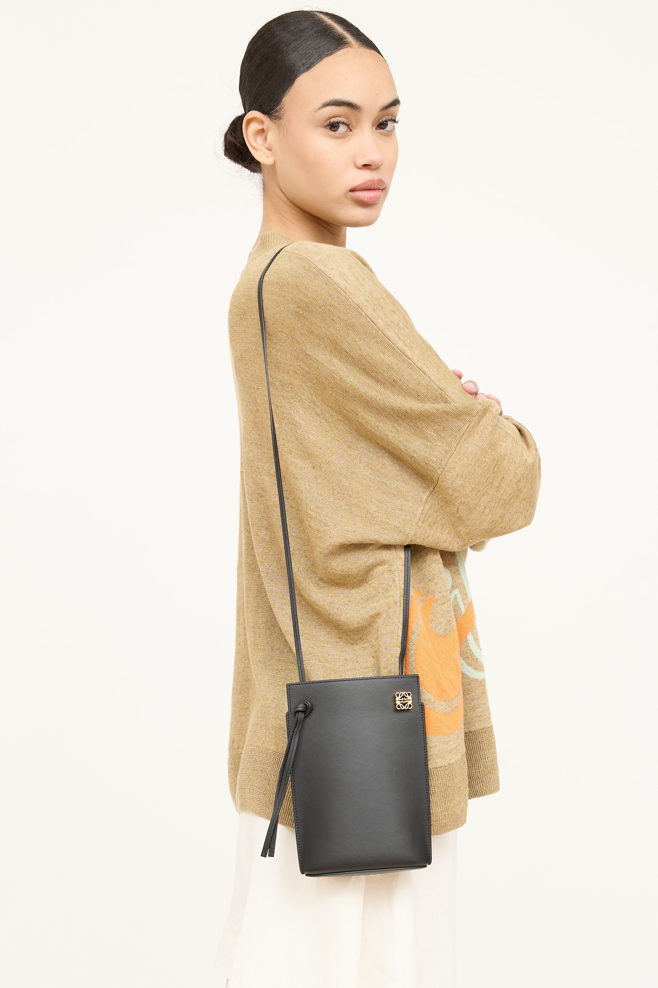 Pre-owned Loewe black Classic Dice Pocket bag featuring calfskin leather, gold tone logo plaque at front, structured base with embossed logo text and adjustable thin leather shoulder strap and singular slip pocket at back.