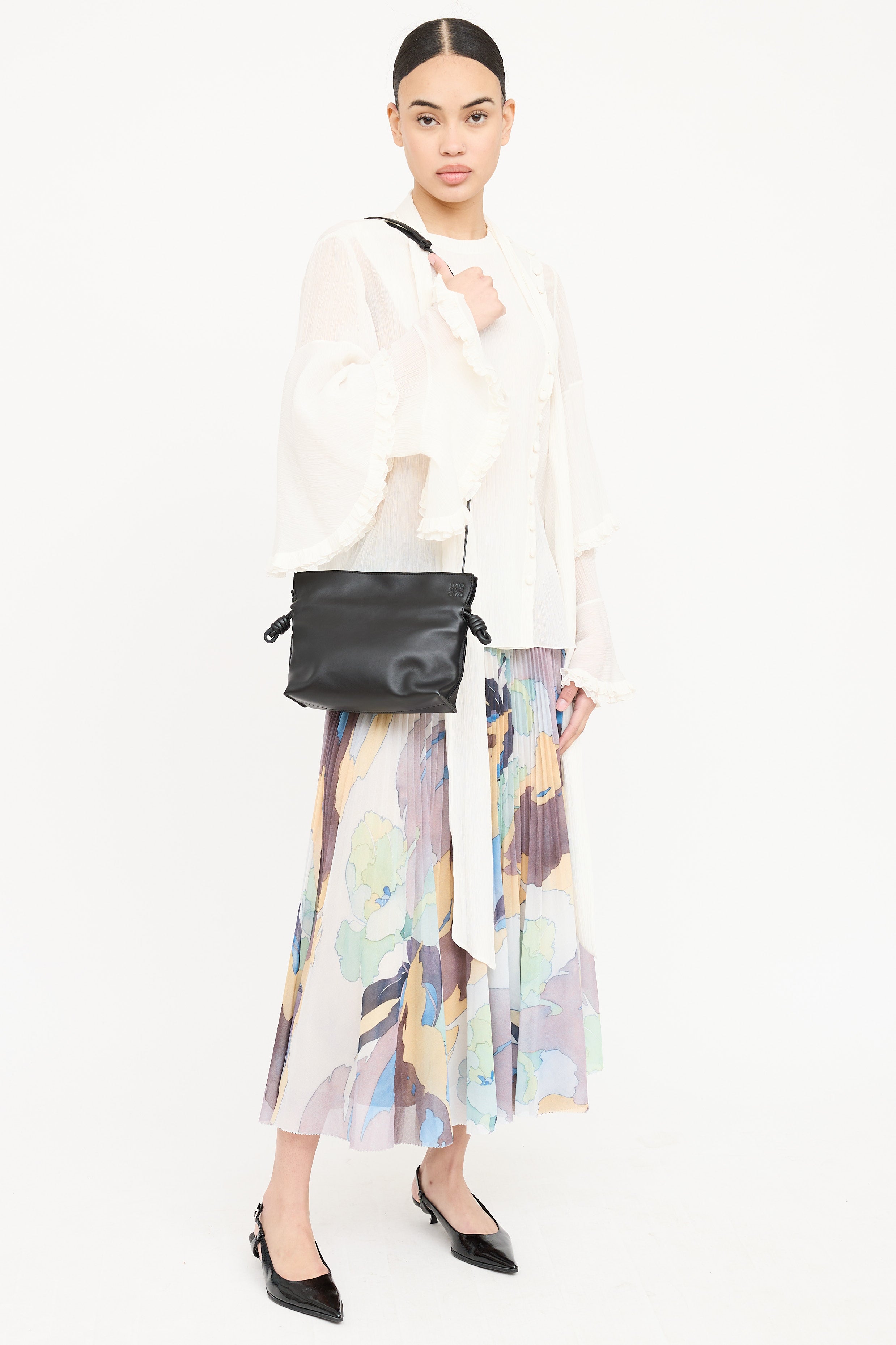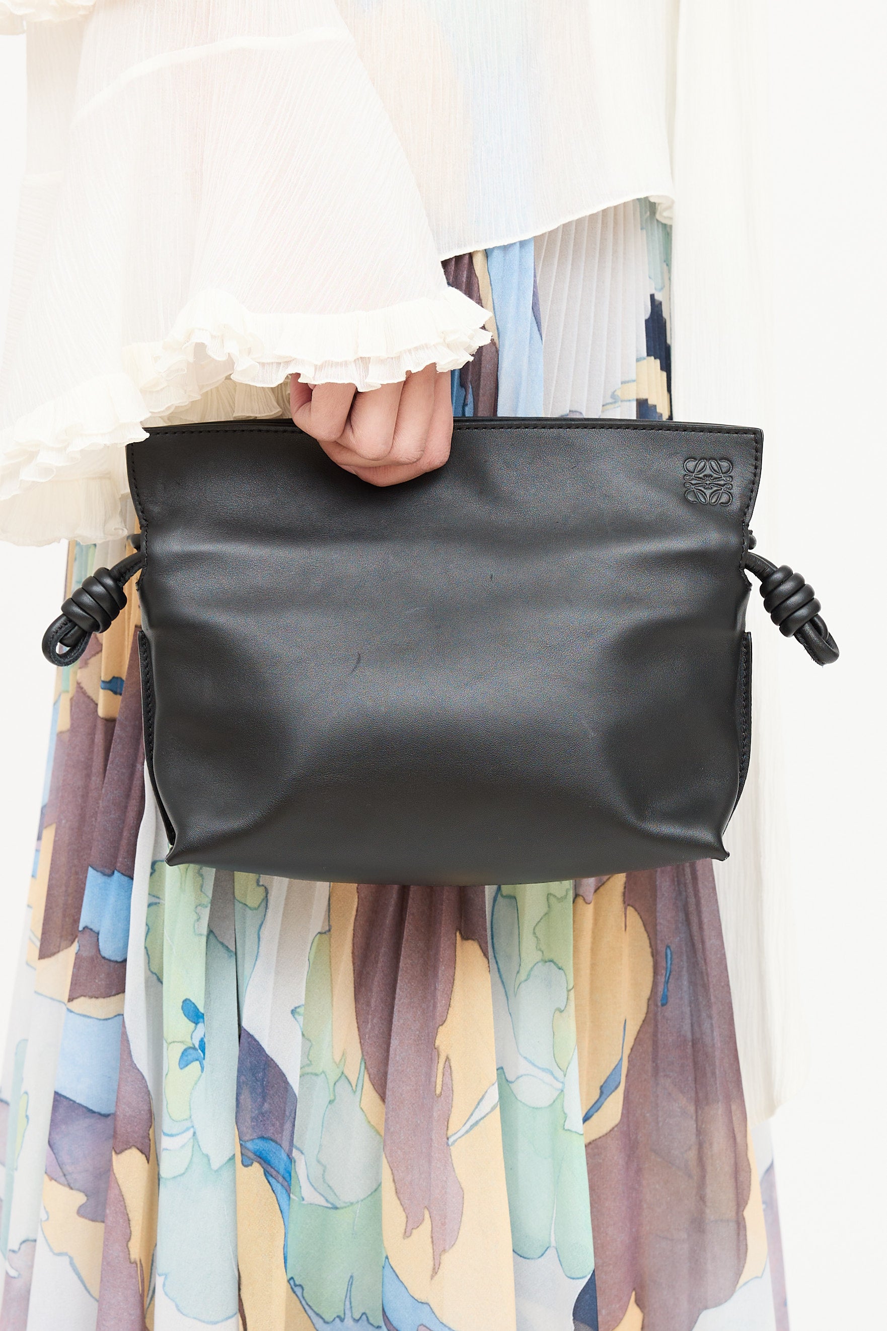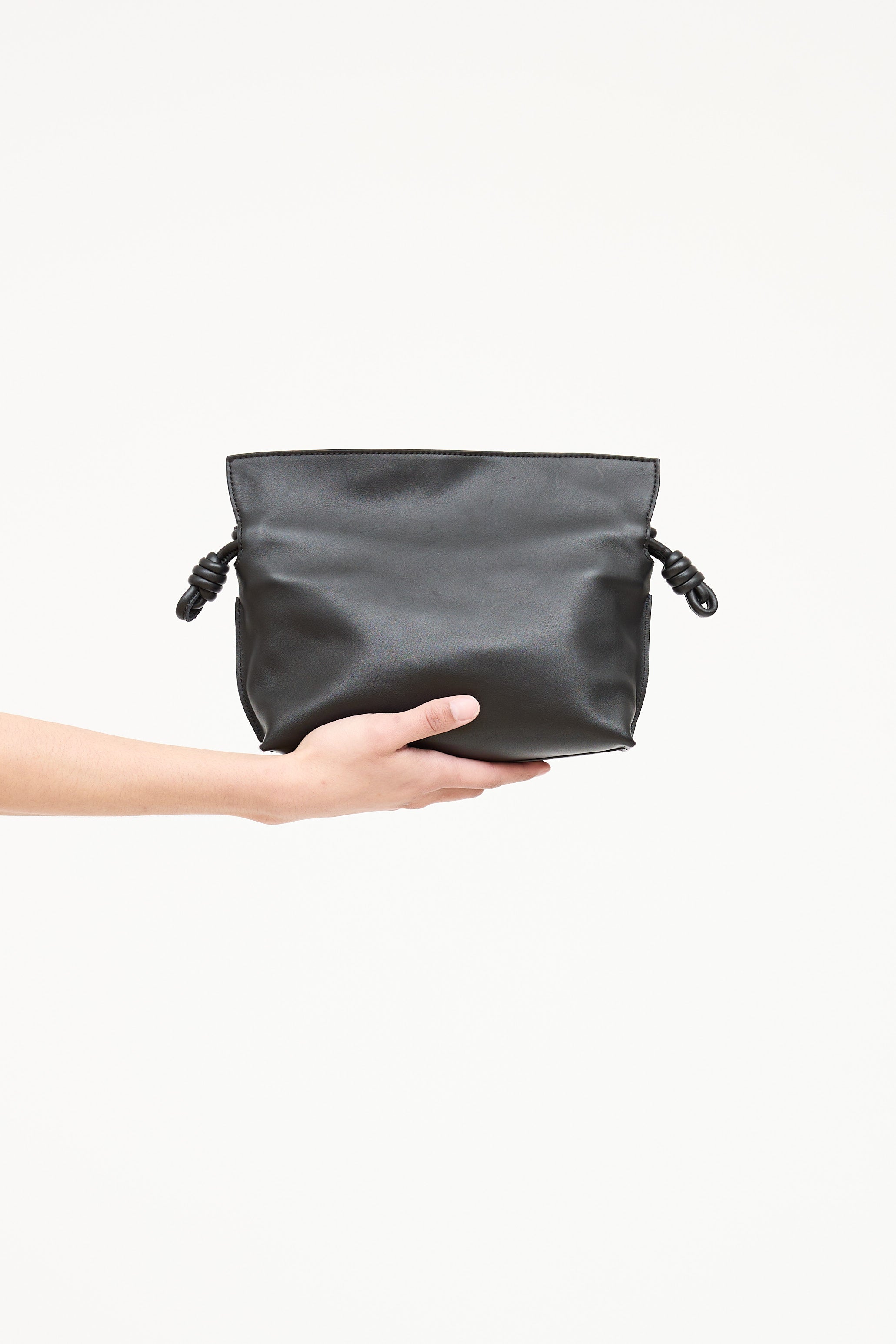 Pre-owned Loewe black leather Flamenco clutch bag featuring adjustable and removable crossbody strap, structured base, embossed logo at front, knotted detail on side and open top with single magnetic closure and suede lined main compartment.