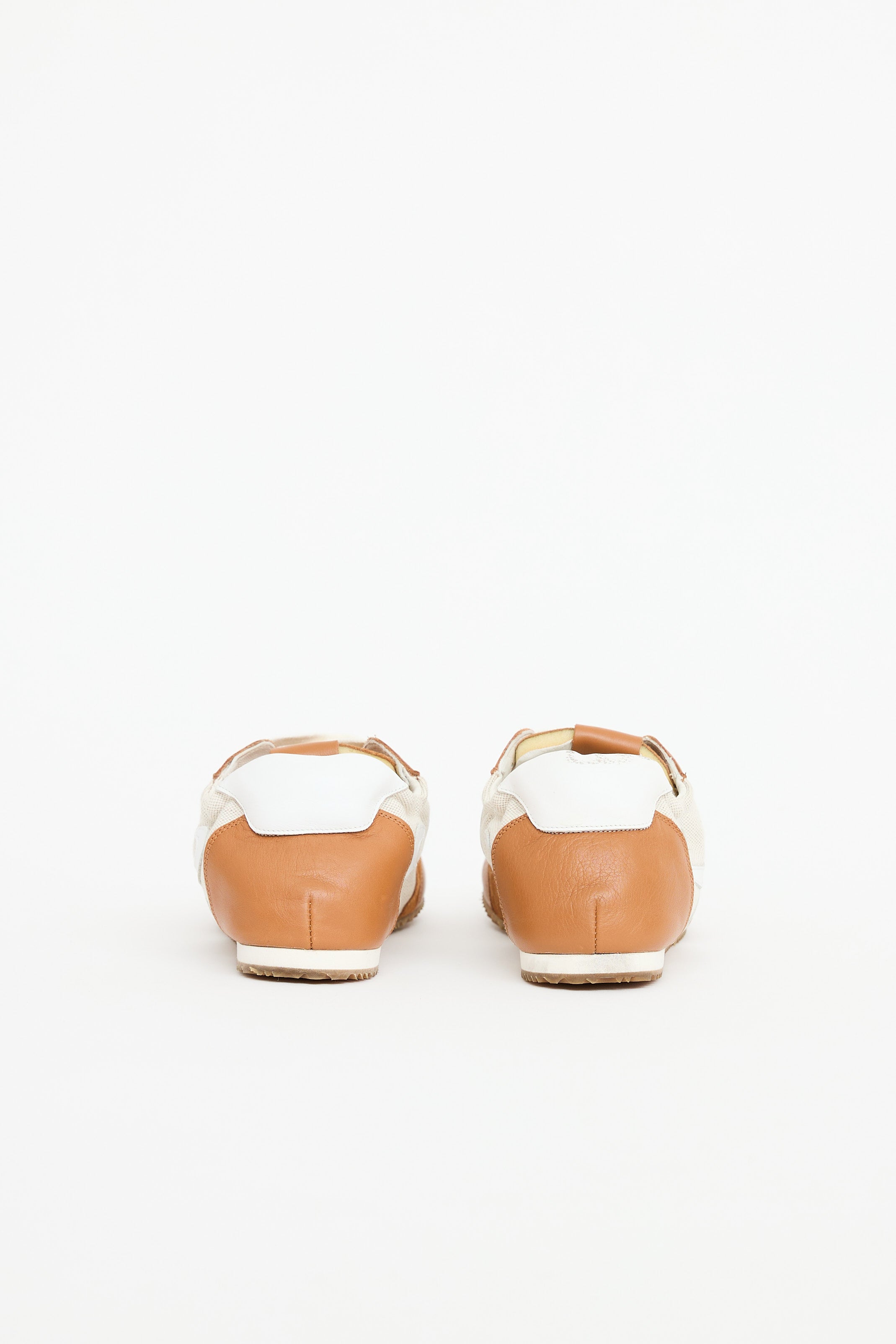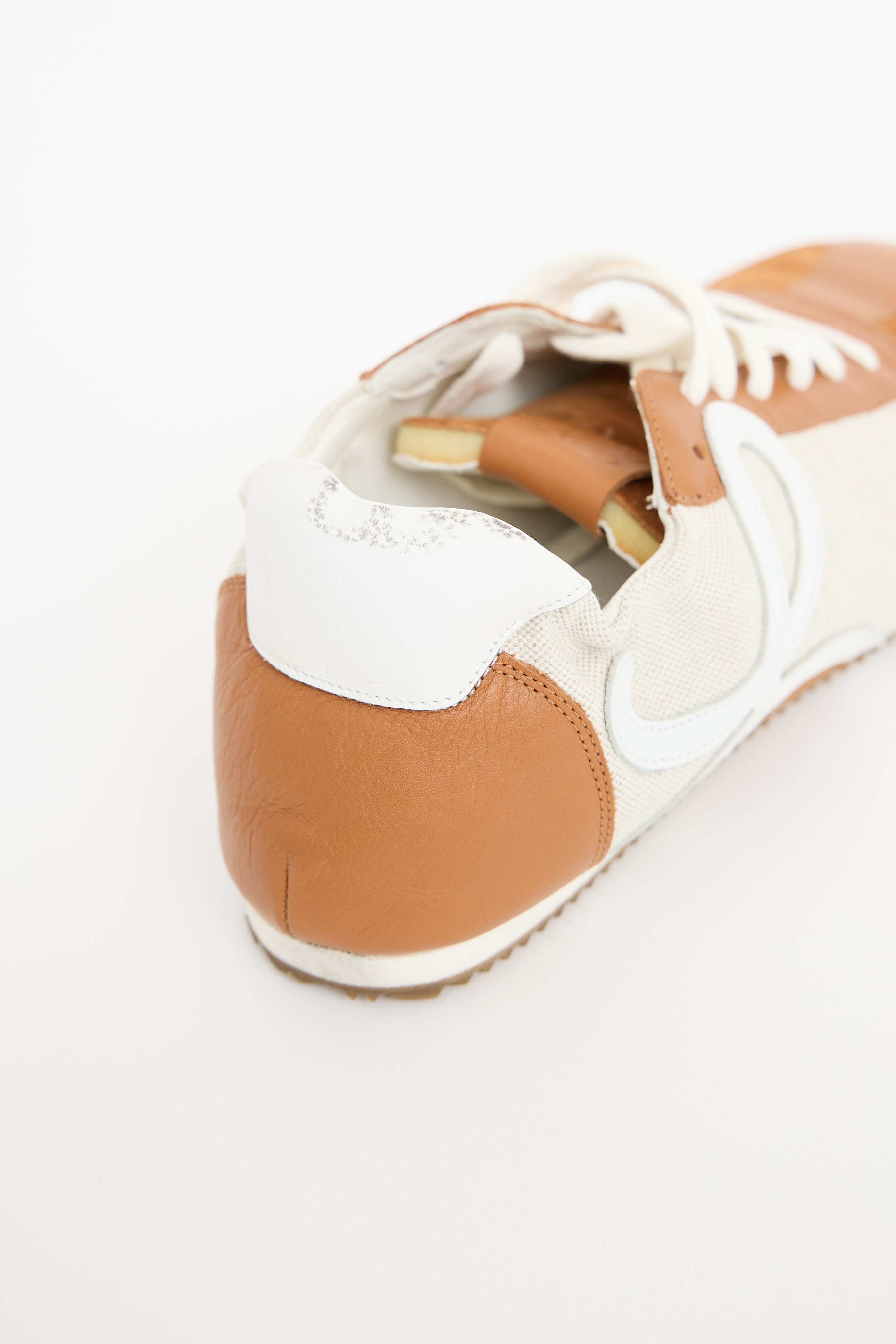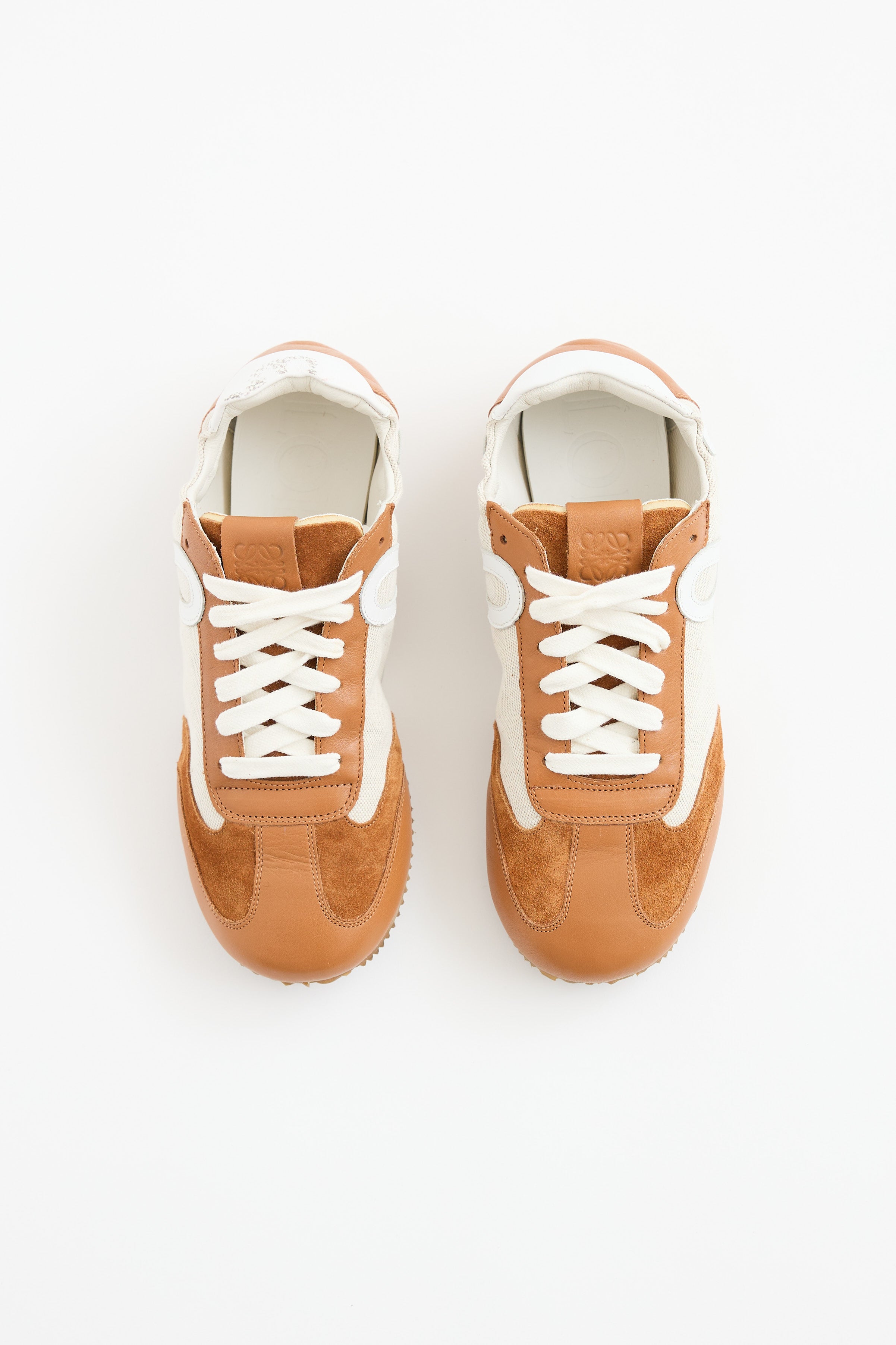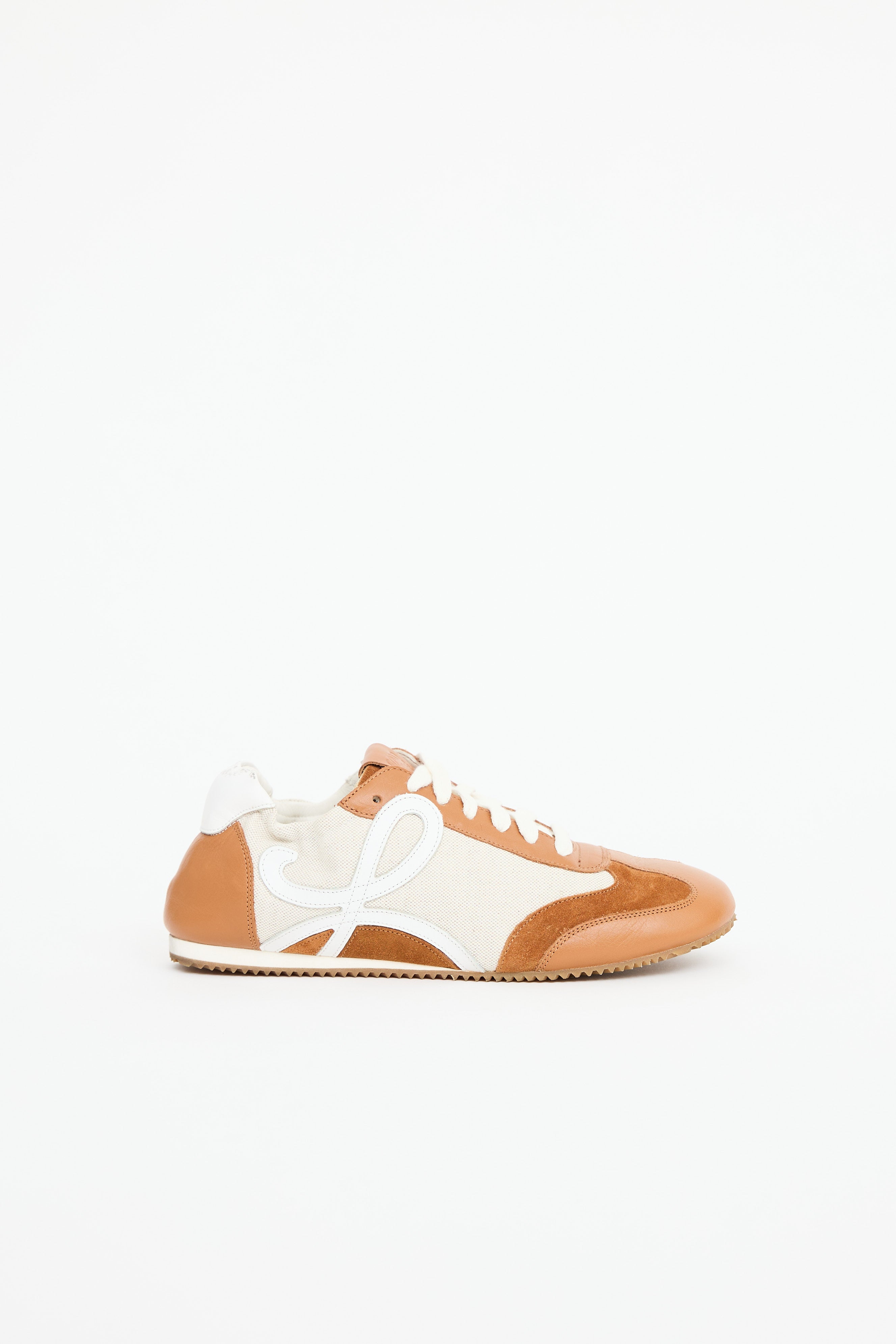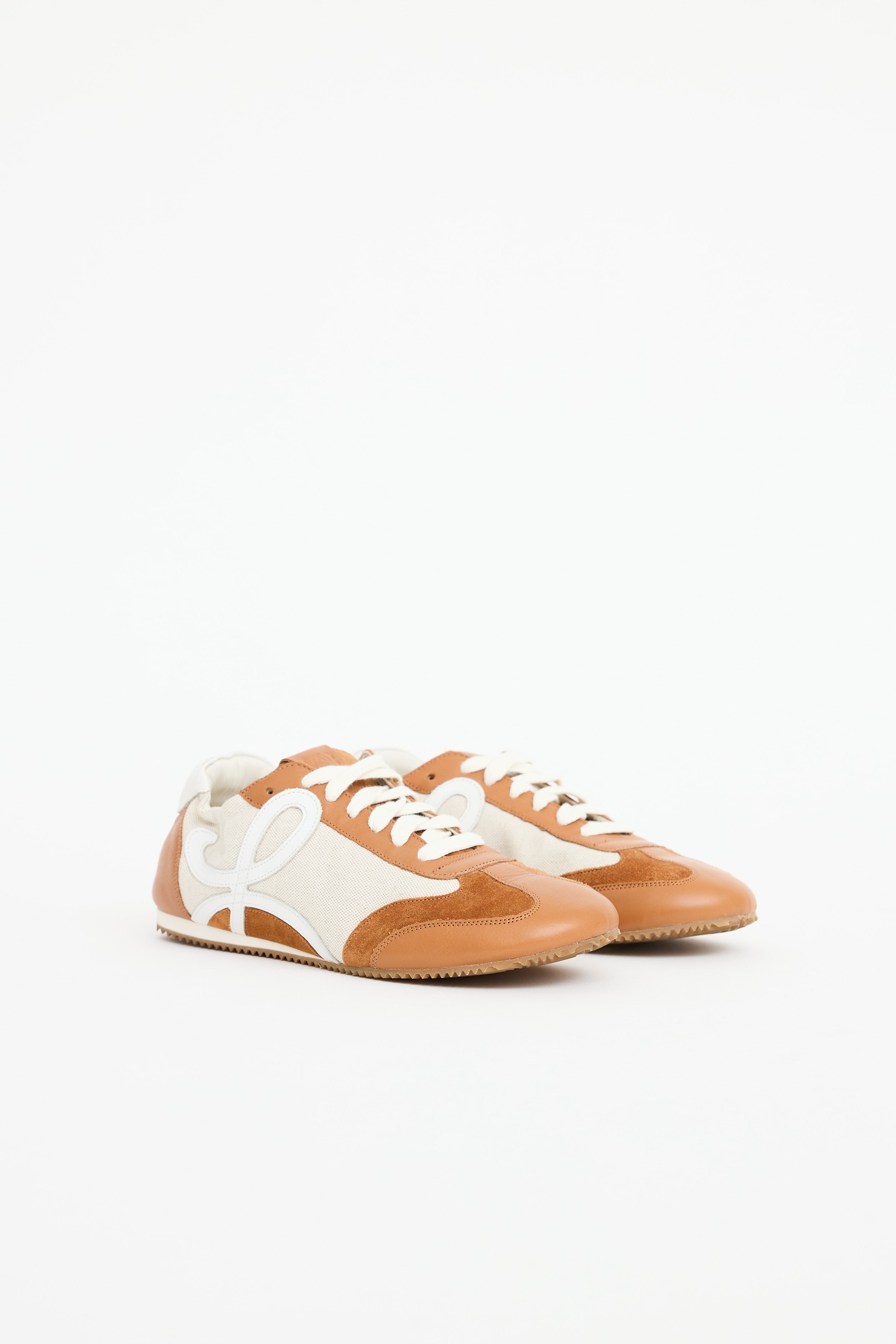 Pre-owned Loewe brown Ballet leather sneakers featuring a round toe, beige canvas paneling, leather logo detailing at sides, elastic collar, fold over heel, gum outsole, and lace up closure.
