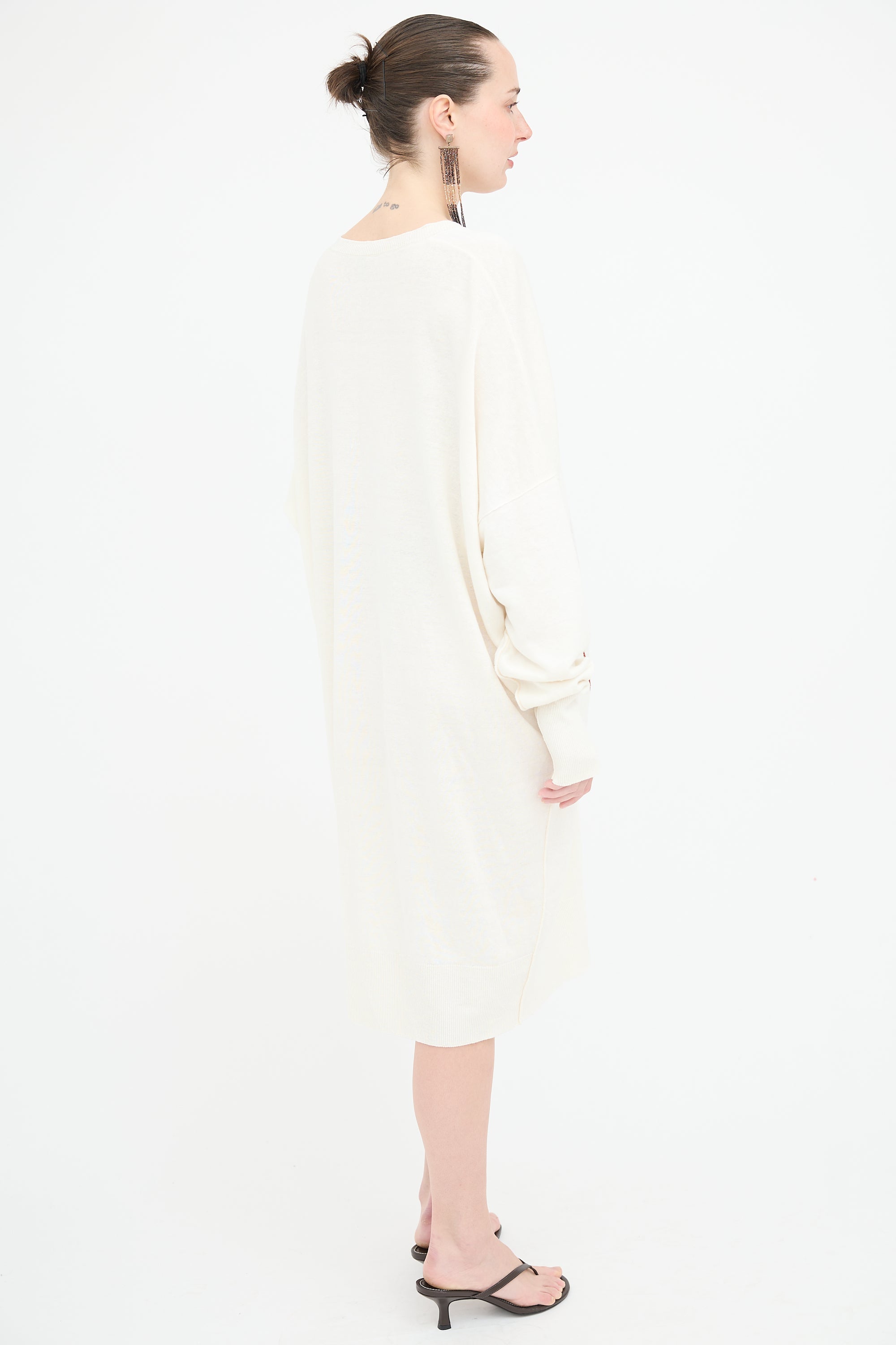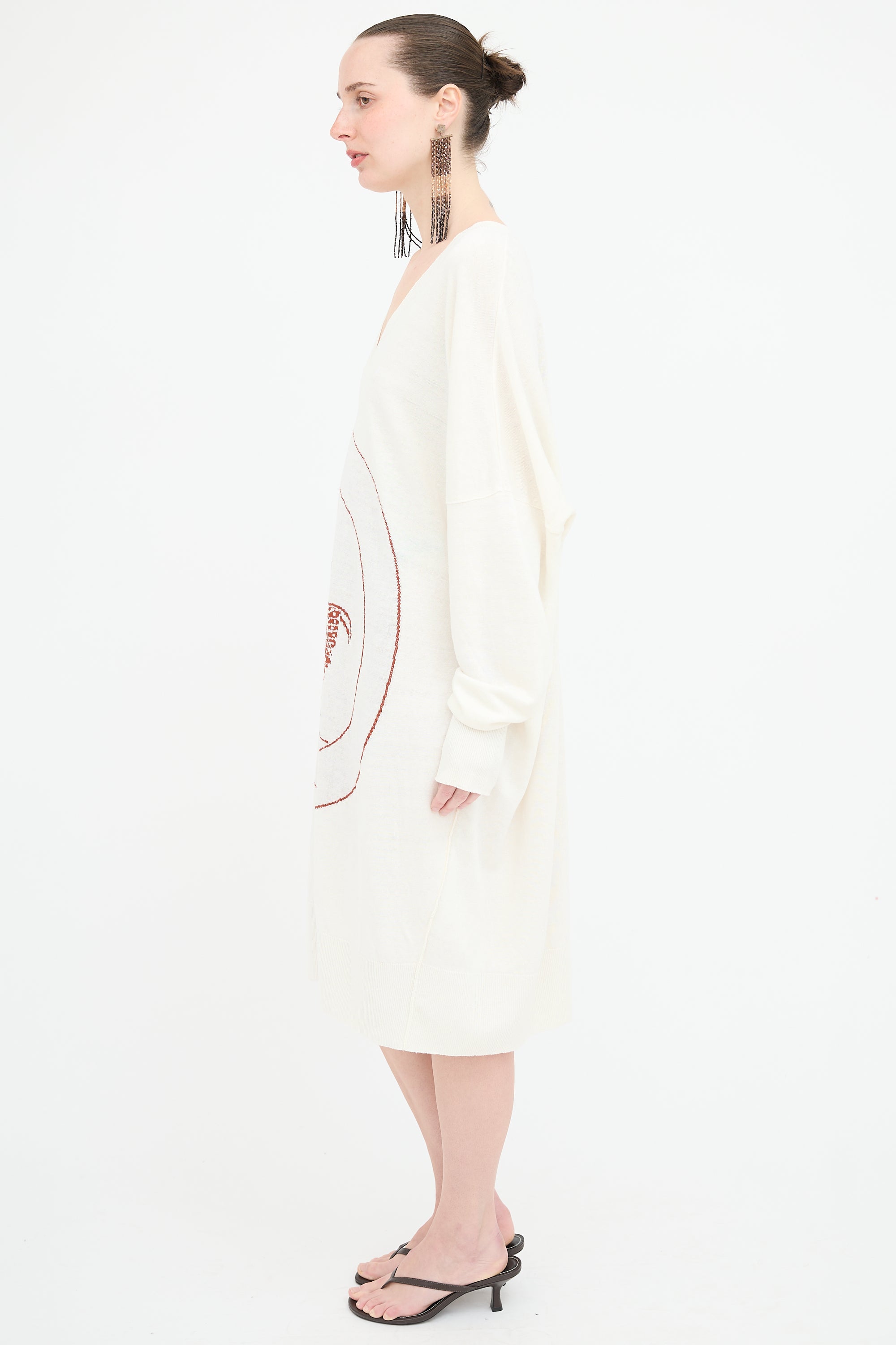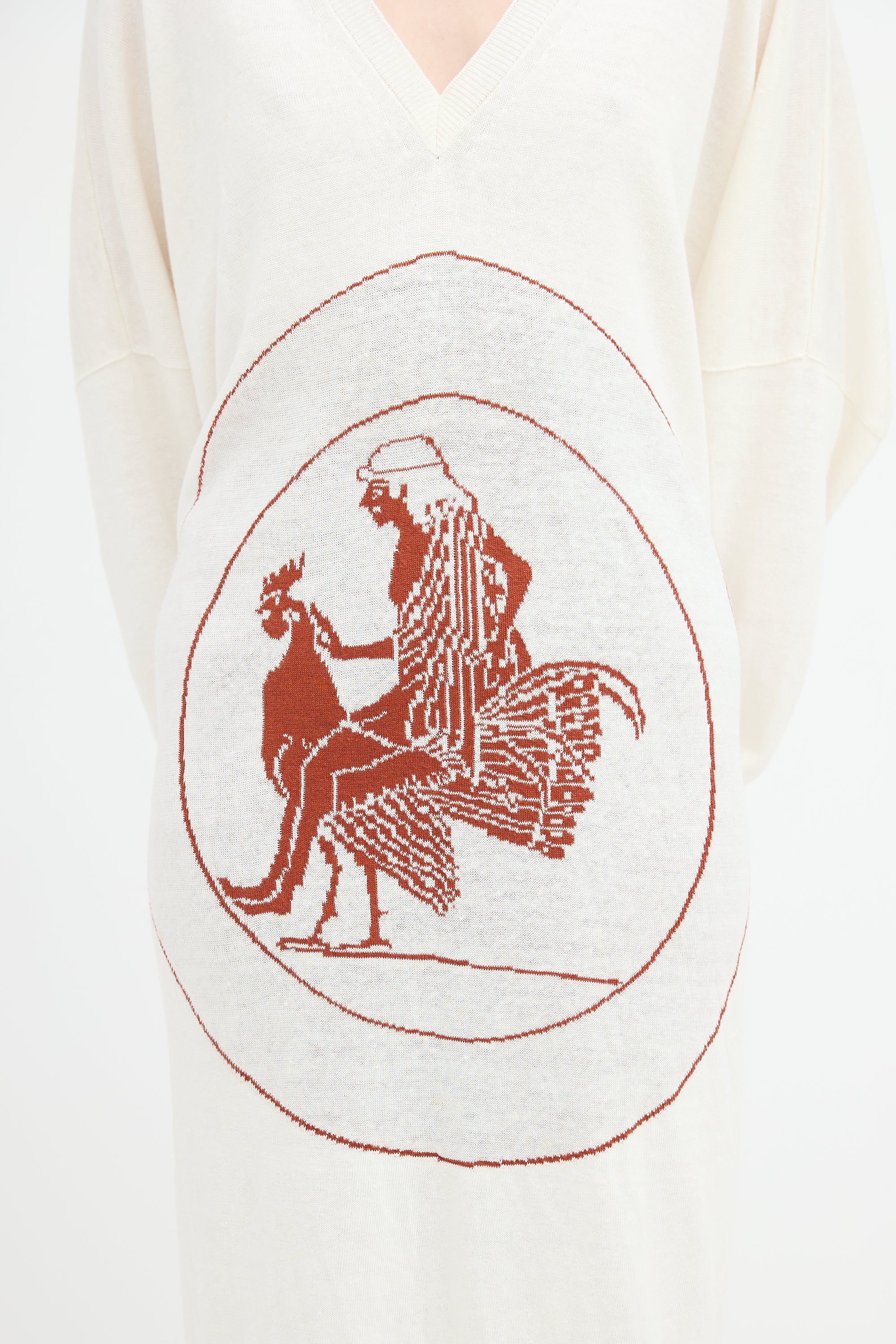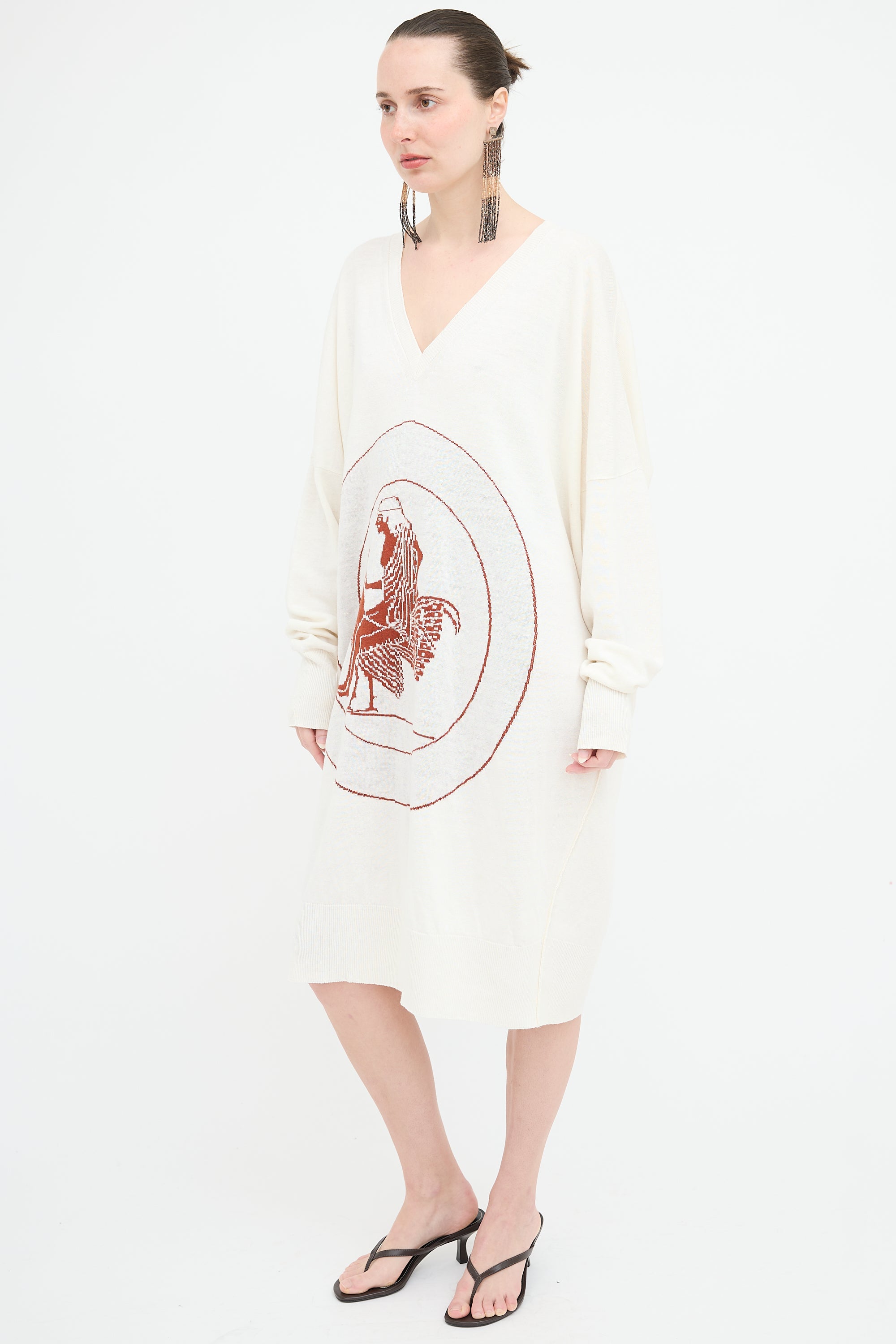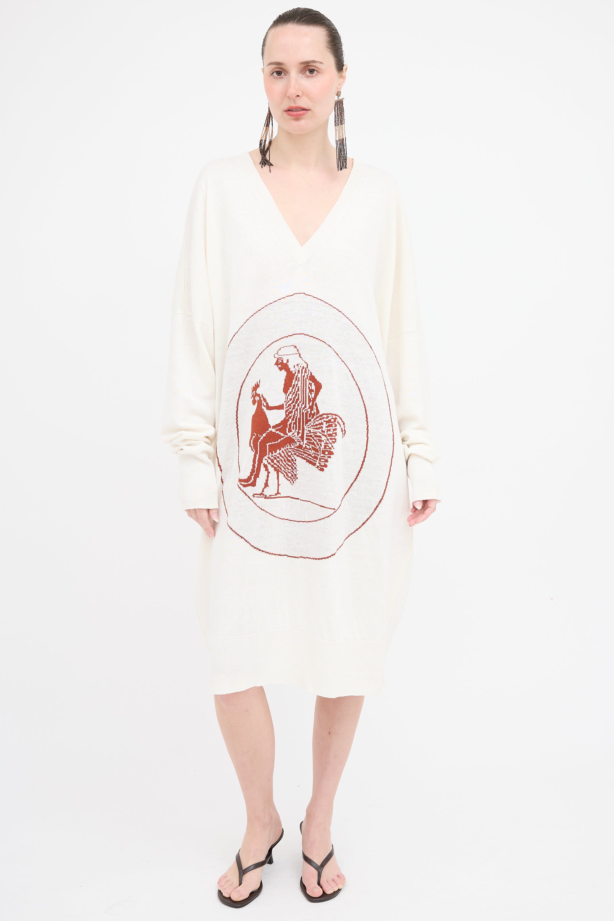 Pre-owned Loewe cream linen sweater dress featuring a V-neckline, reverse seam details, man and rooster jacquard at front, and a ribbed hem and cuffs.