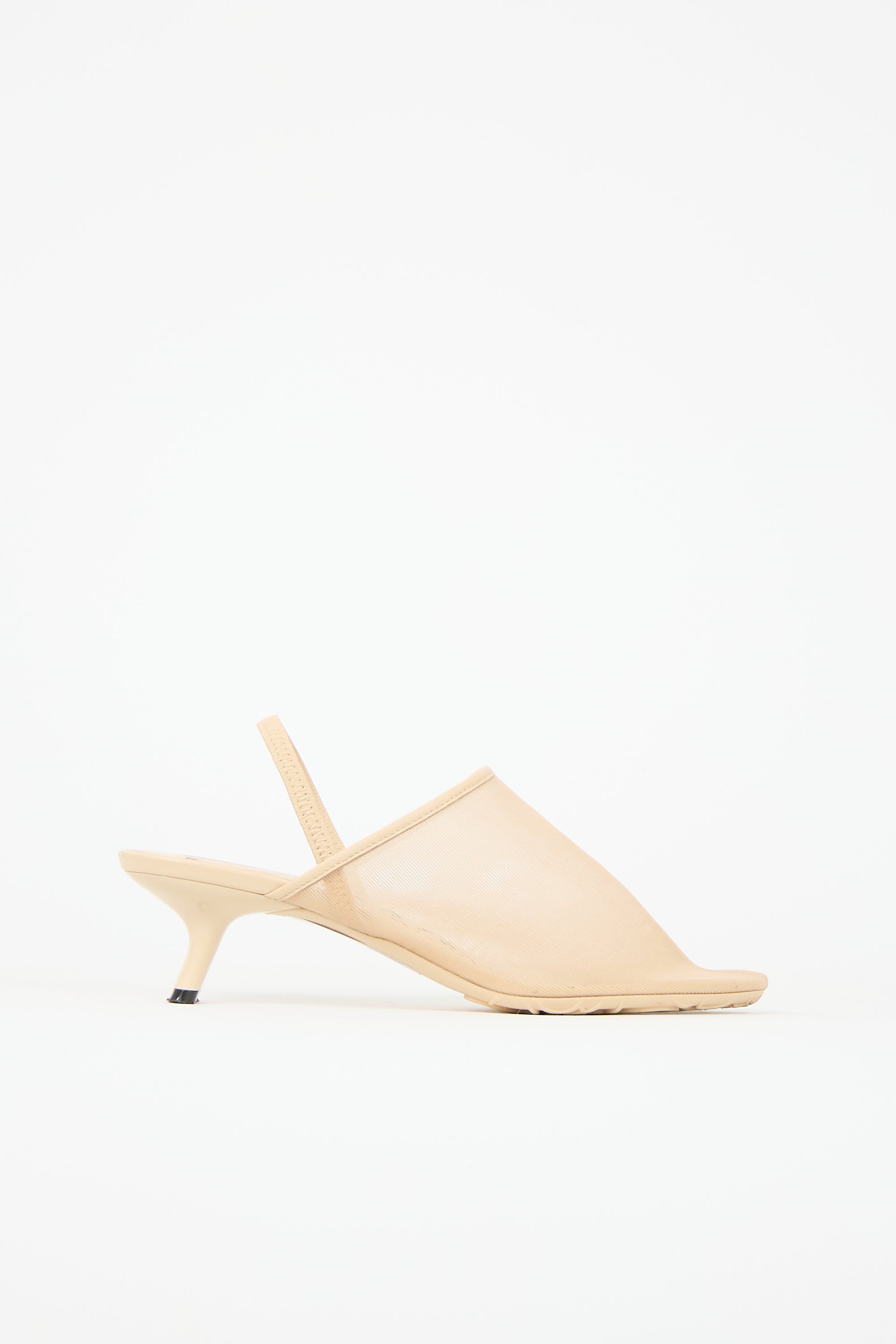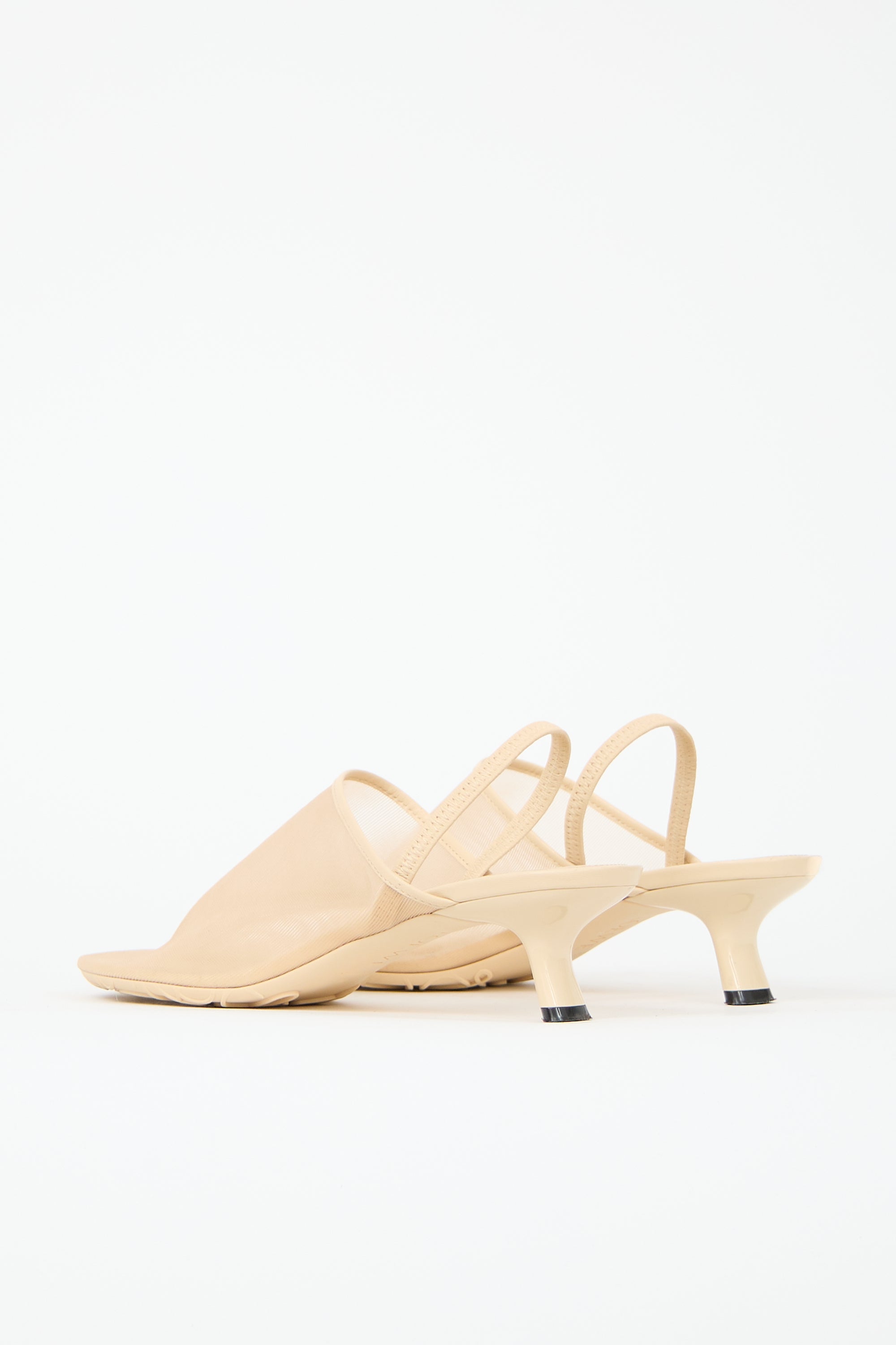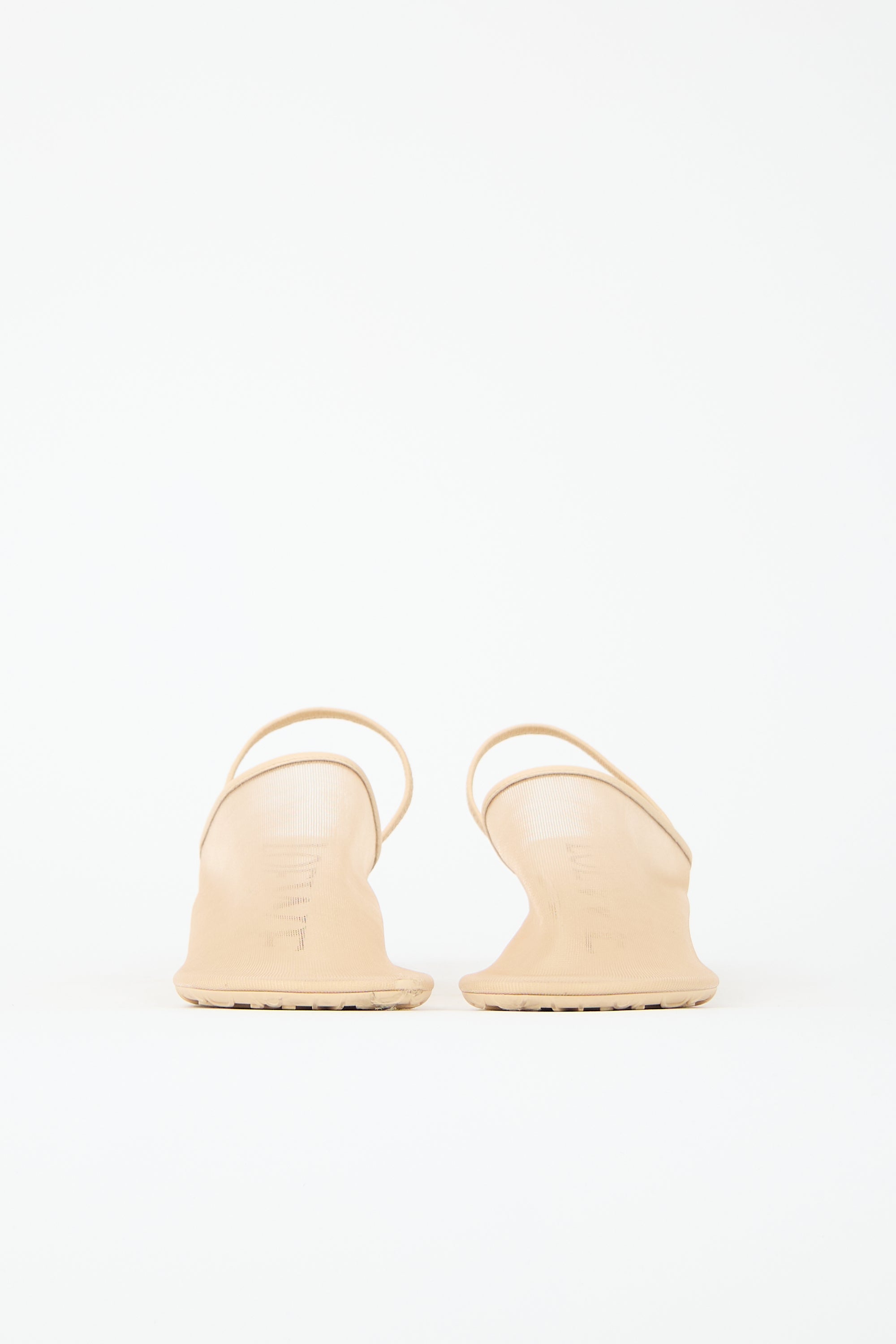 Pre-owned Loewe beige mesh Petal mules featuring petal toe, elasticized slingback strap, and lacquered comma heel.