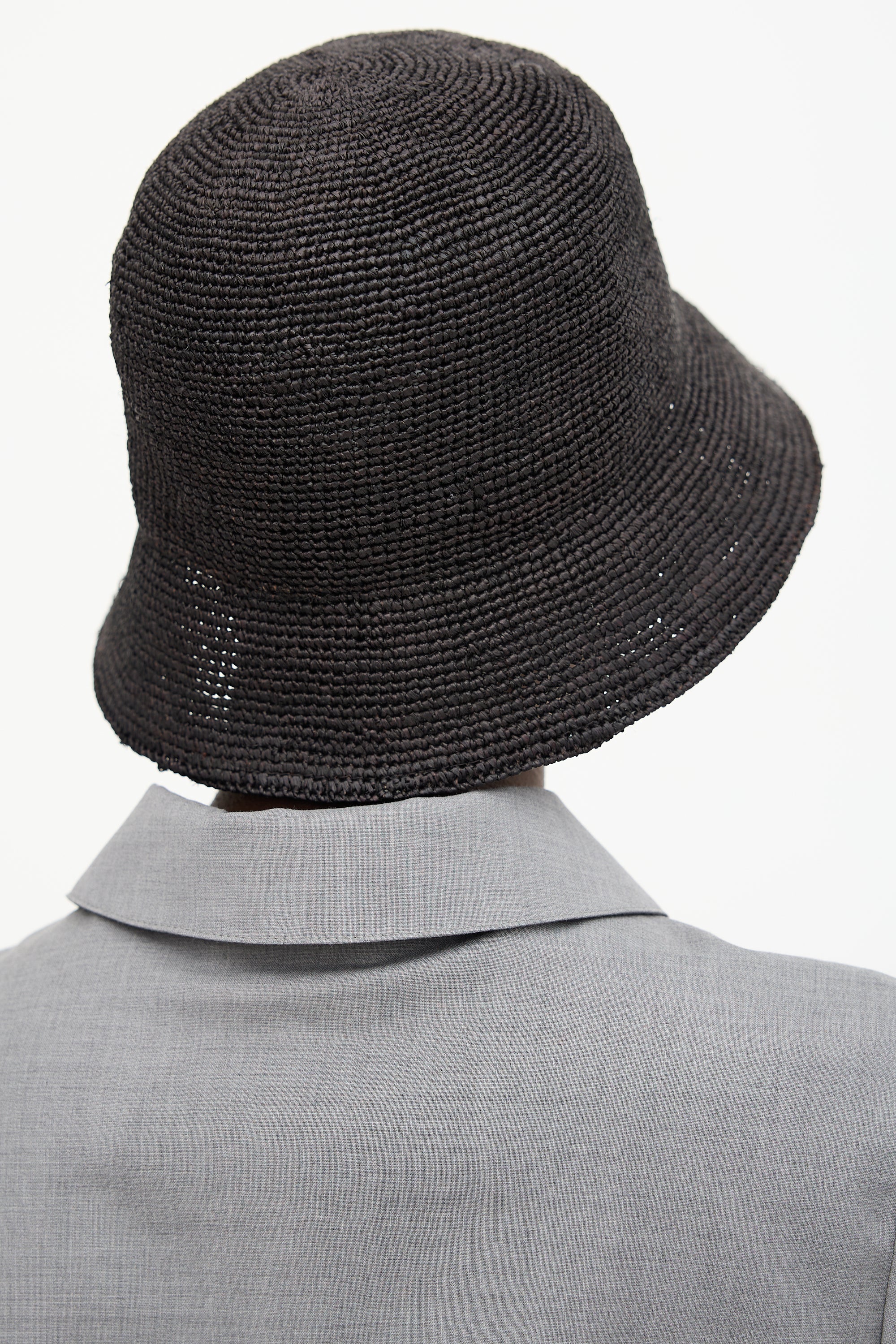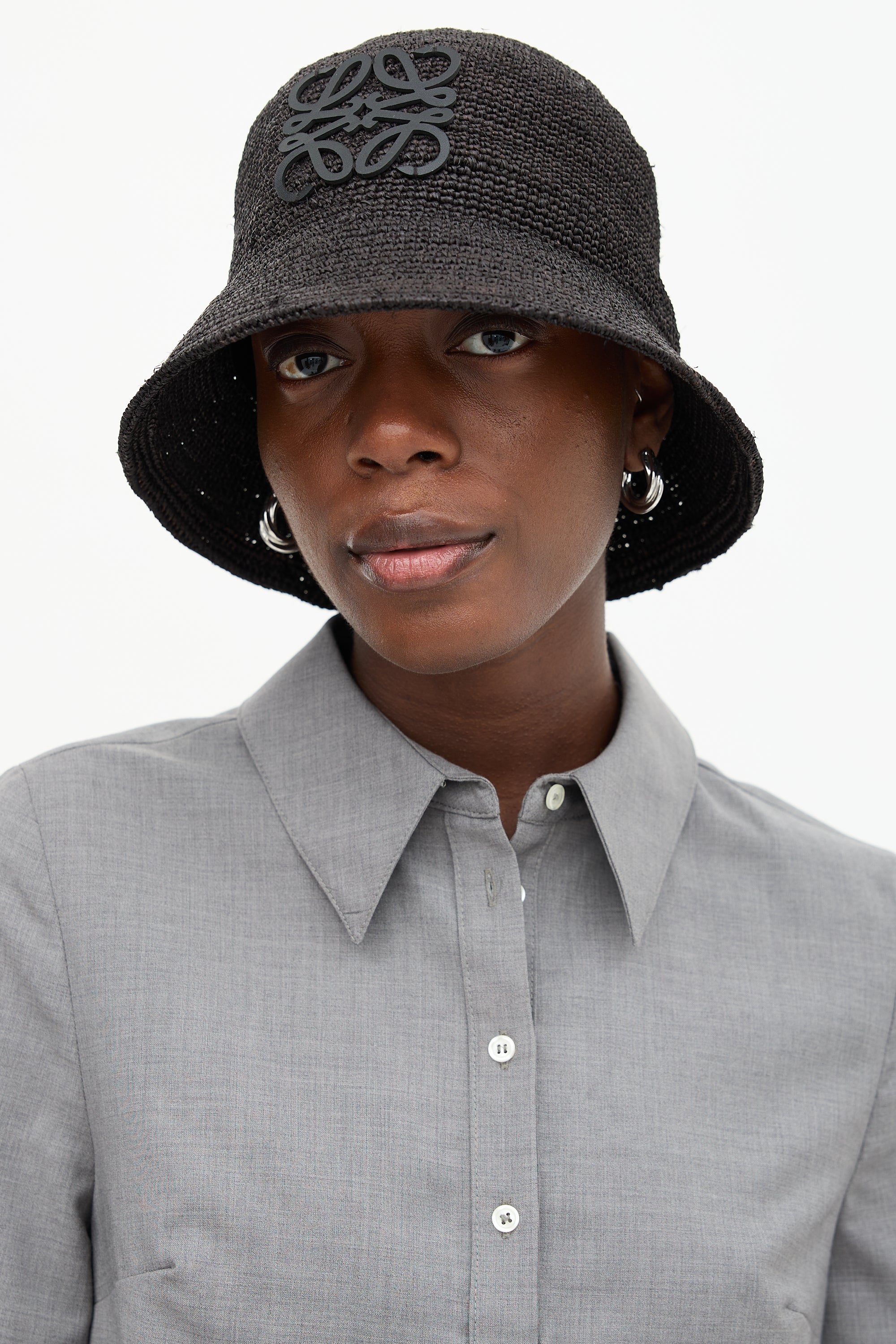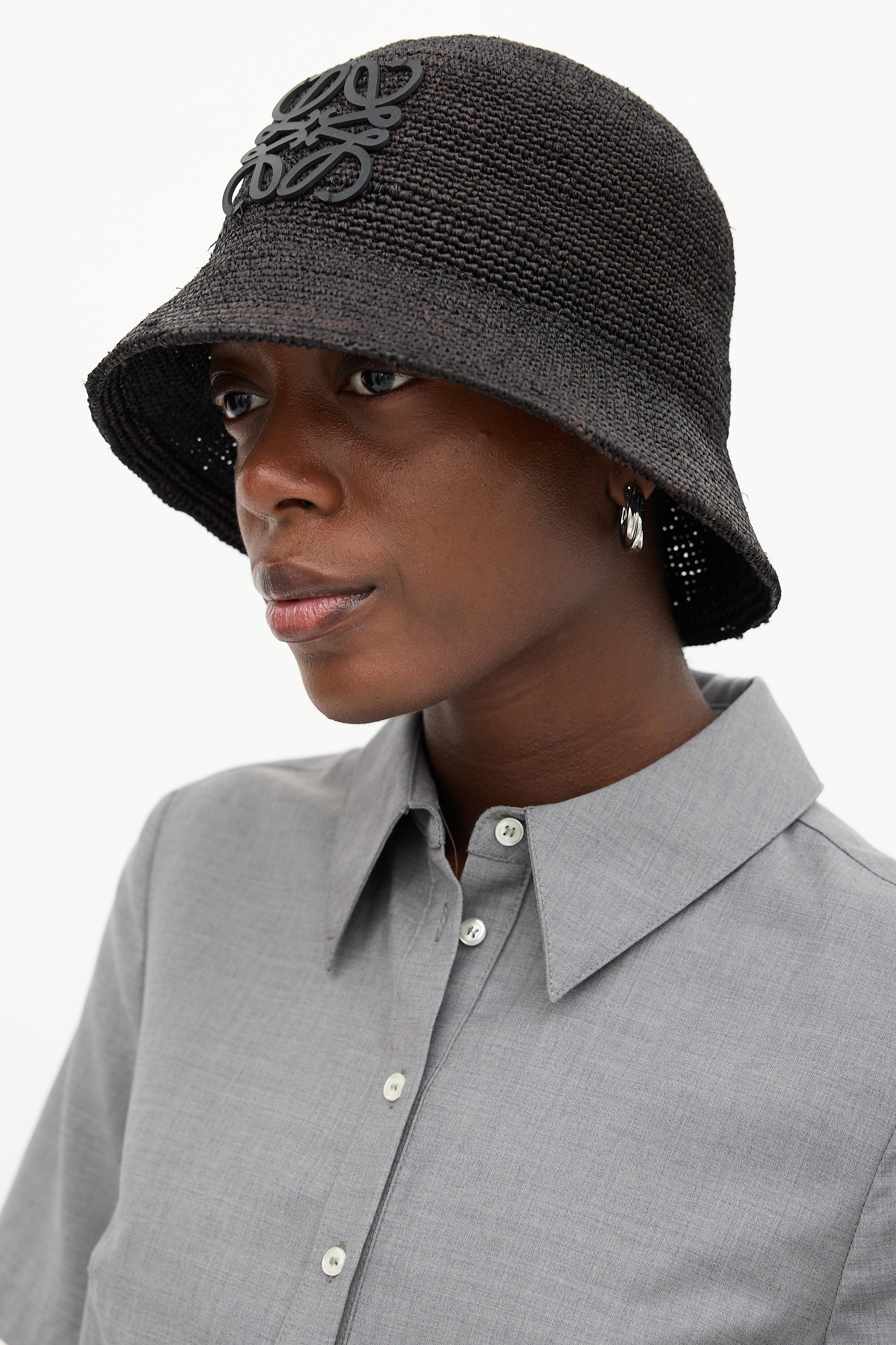Pre-owned Loewe black raffia bucket hat featuring woven rows and calfskin Anagram logo patch.