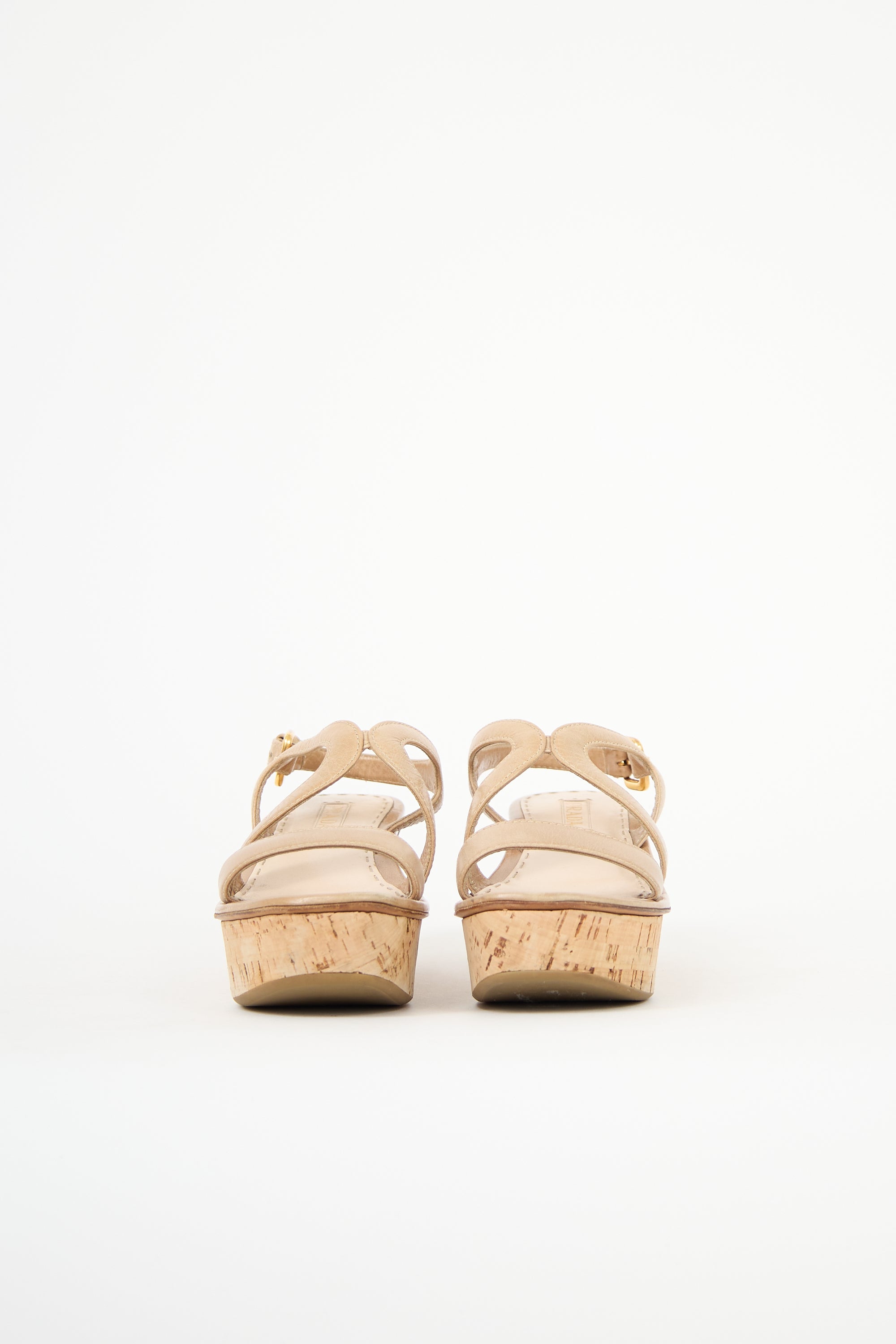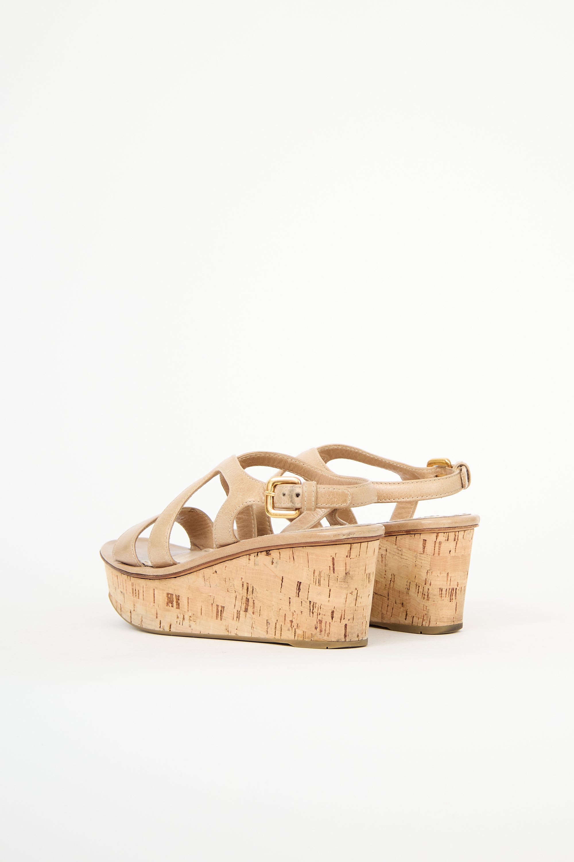 Pre-owned Prada beige sandals featuring open square toe, cut out leather upper, adjustable slingback strap, and cork wedge. Comes with original dust bag.