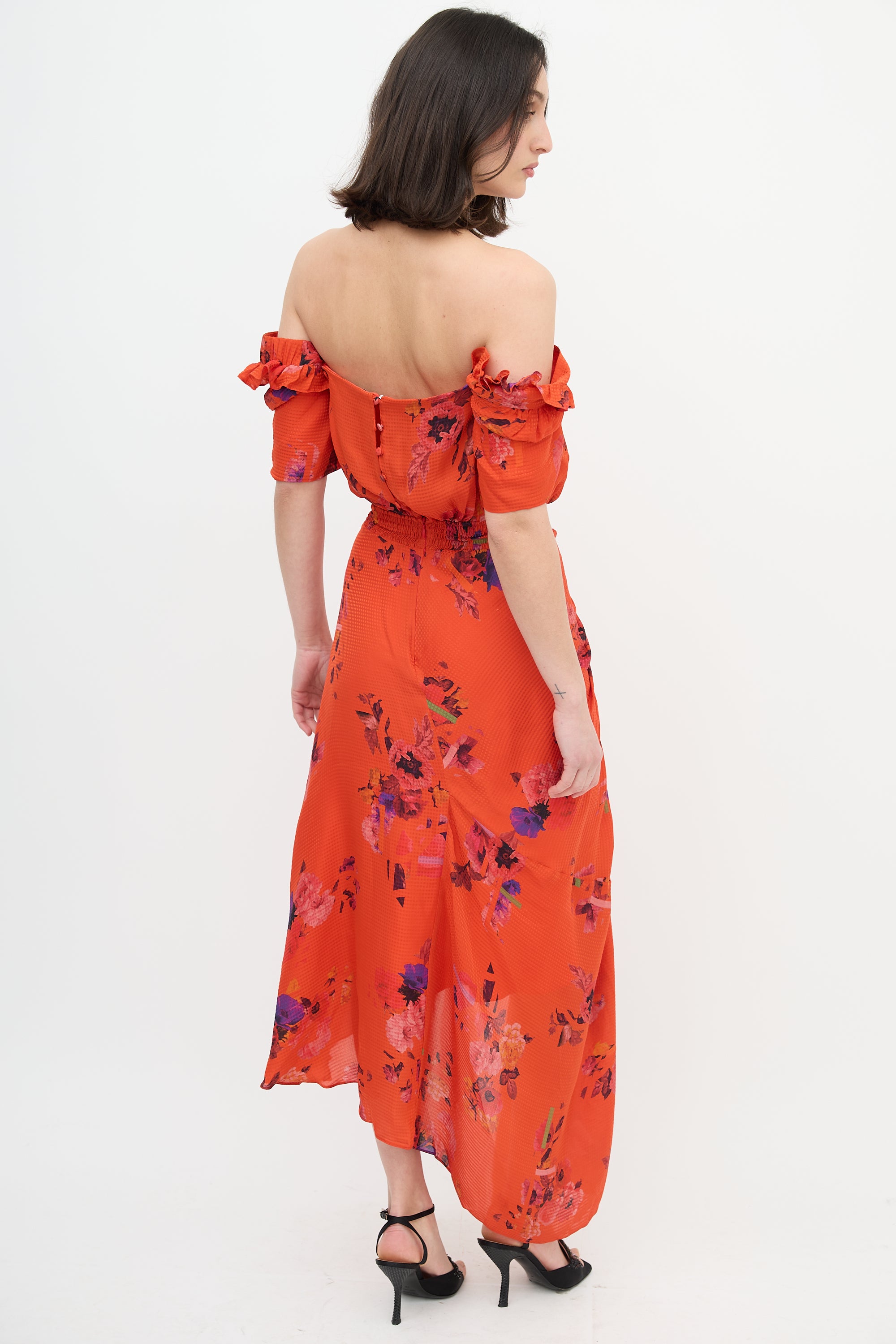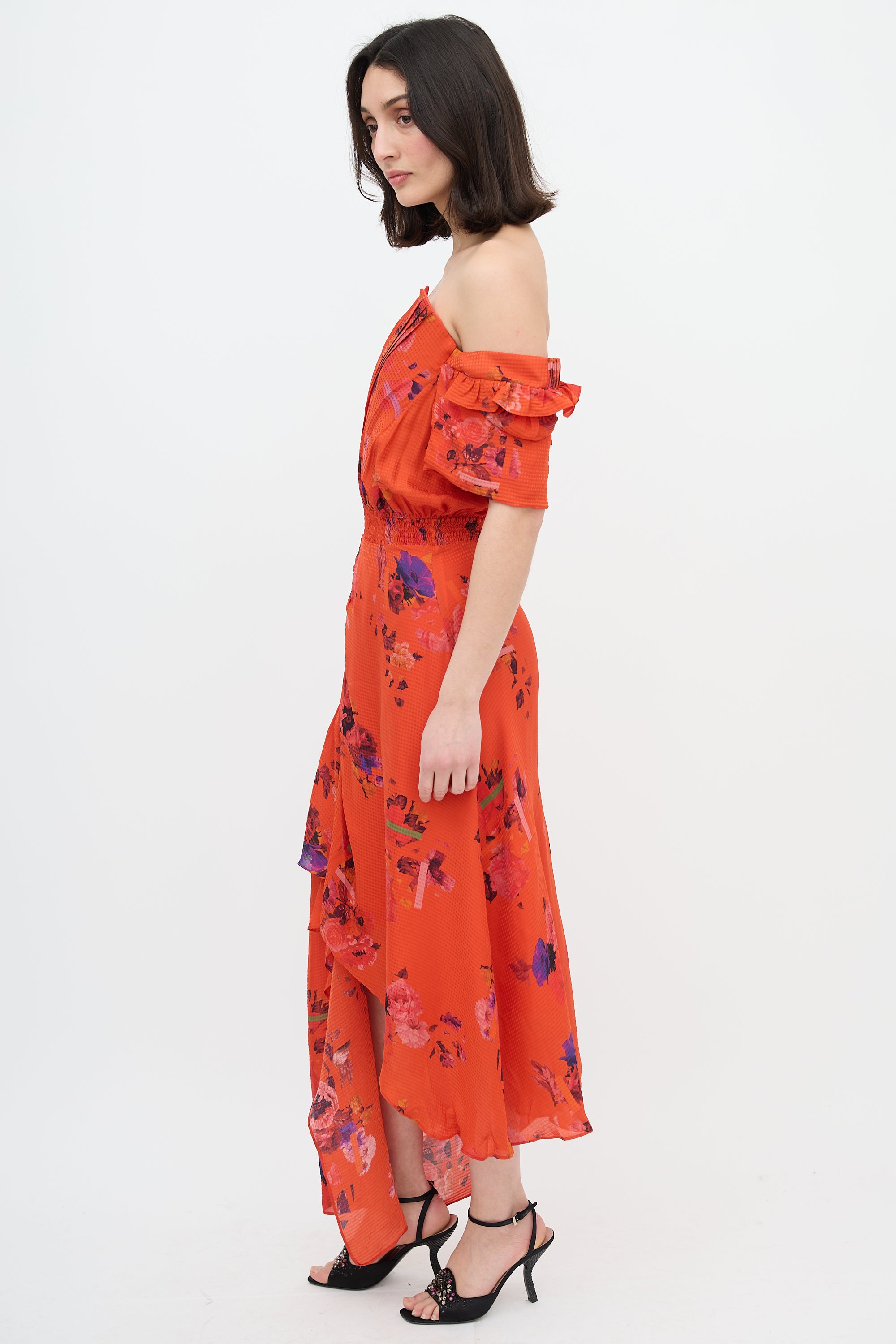 Pre-owned Preen by Thorton Bregazzi Pre-Fall 2018 red floral Dana dress featuring a V-neckline with pleated front, short sleeves with ruffle trim, elasticized waist, back zip and button closure, elasticized panel ruching at skirt, and an asymmetrical hem. Lined.