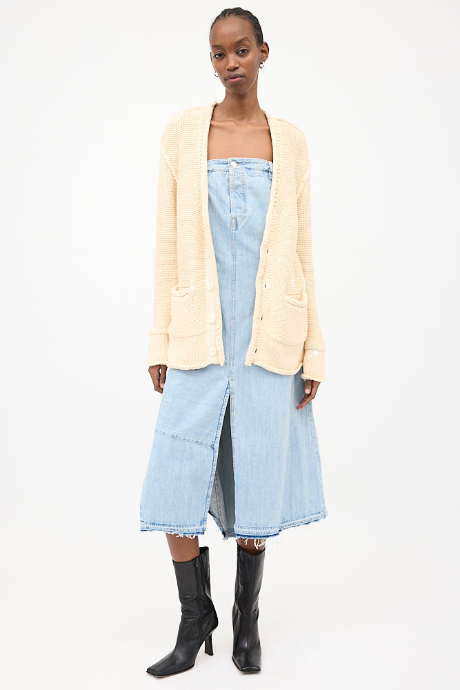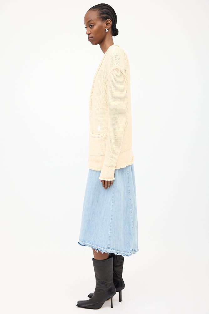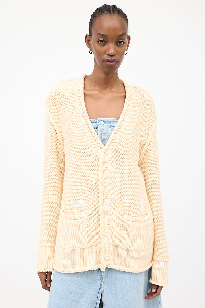 Pre-owned R13 beige Boxy cardigan featuring a V-neckline, button up front closure, two slip pockets at front hip, rolled edges, and white paint splatter detail throughout.
