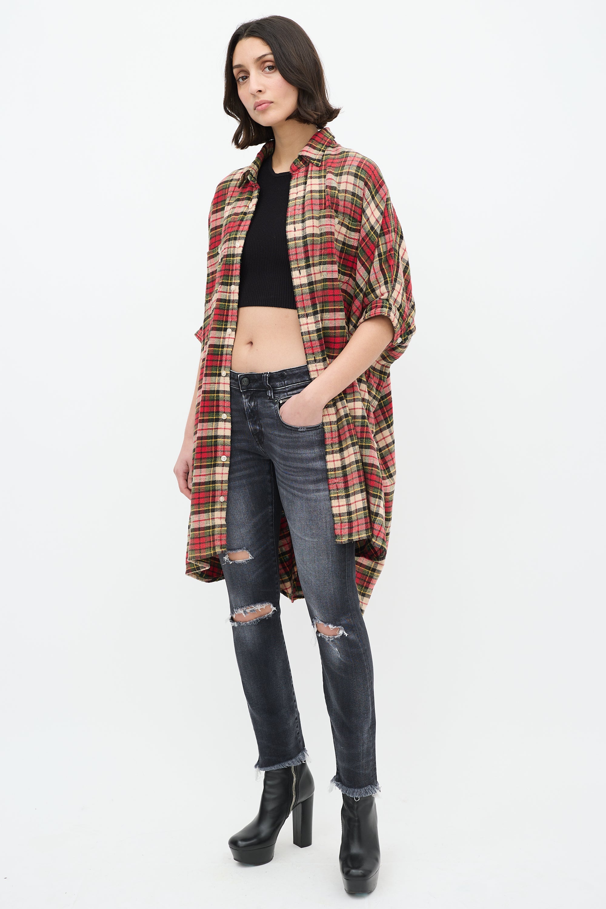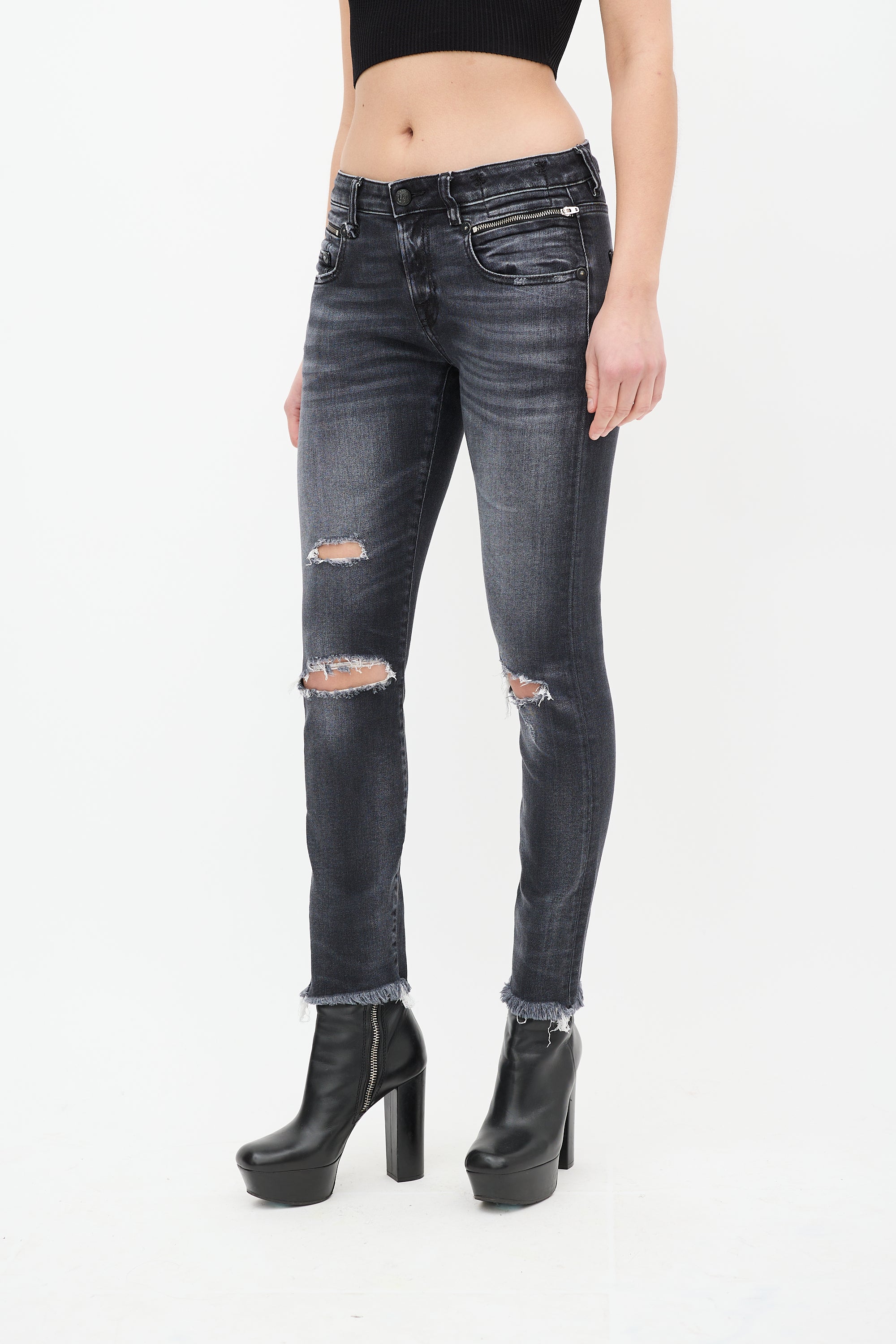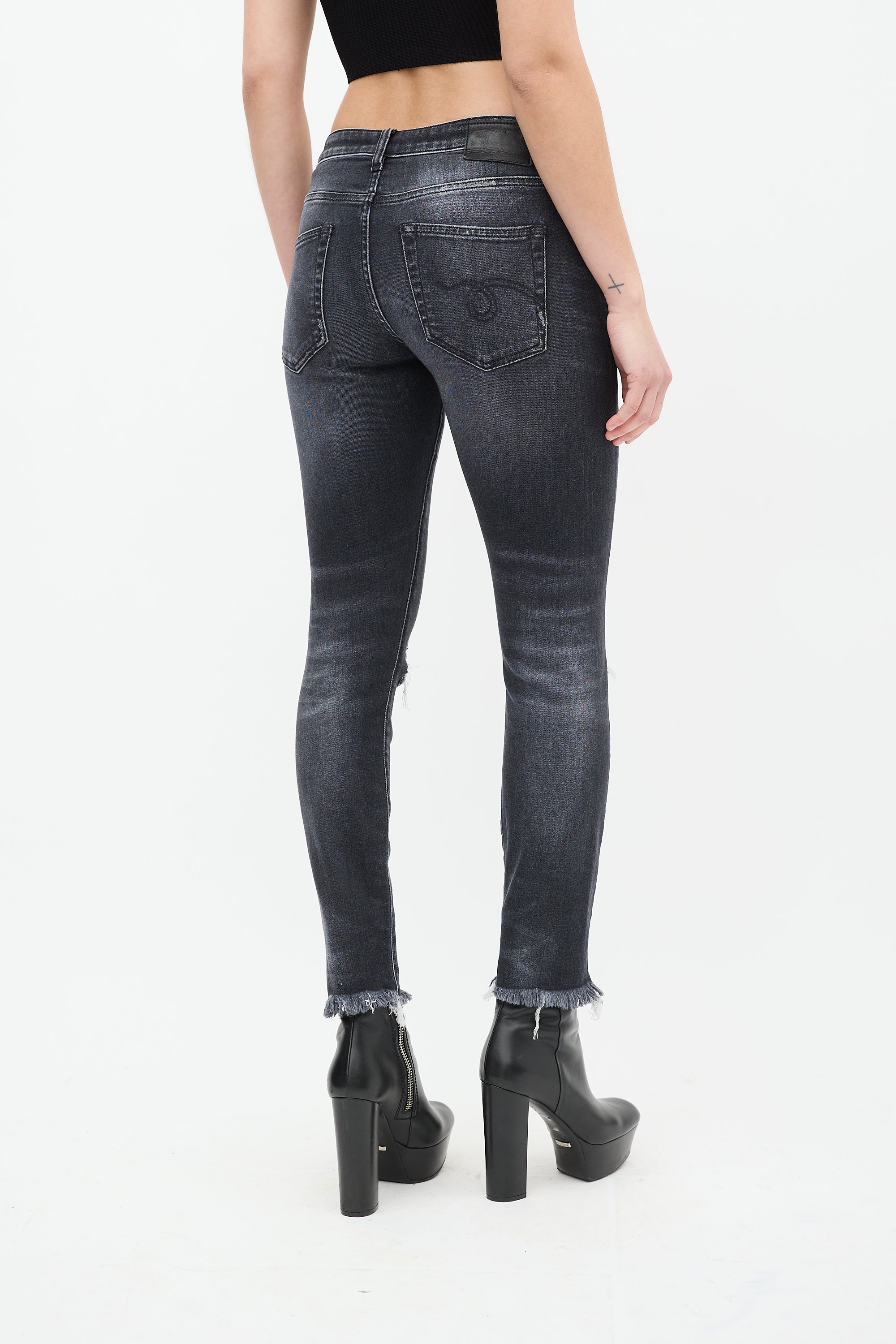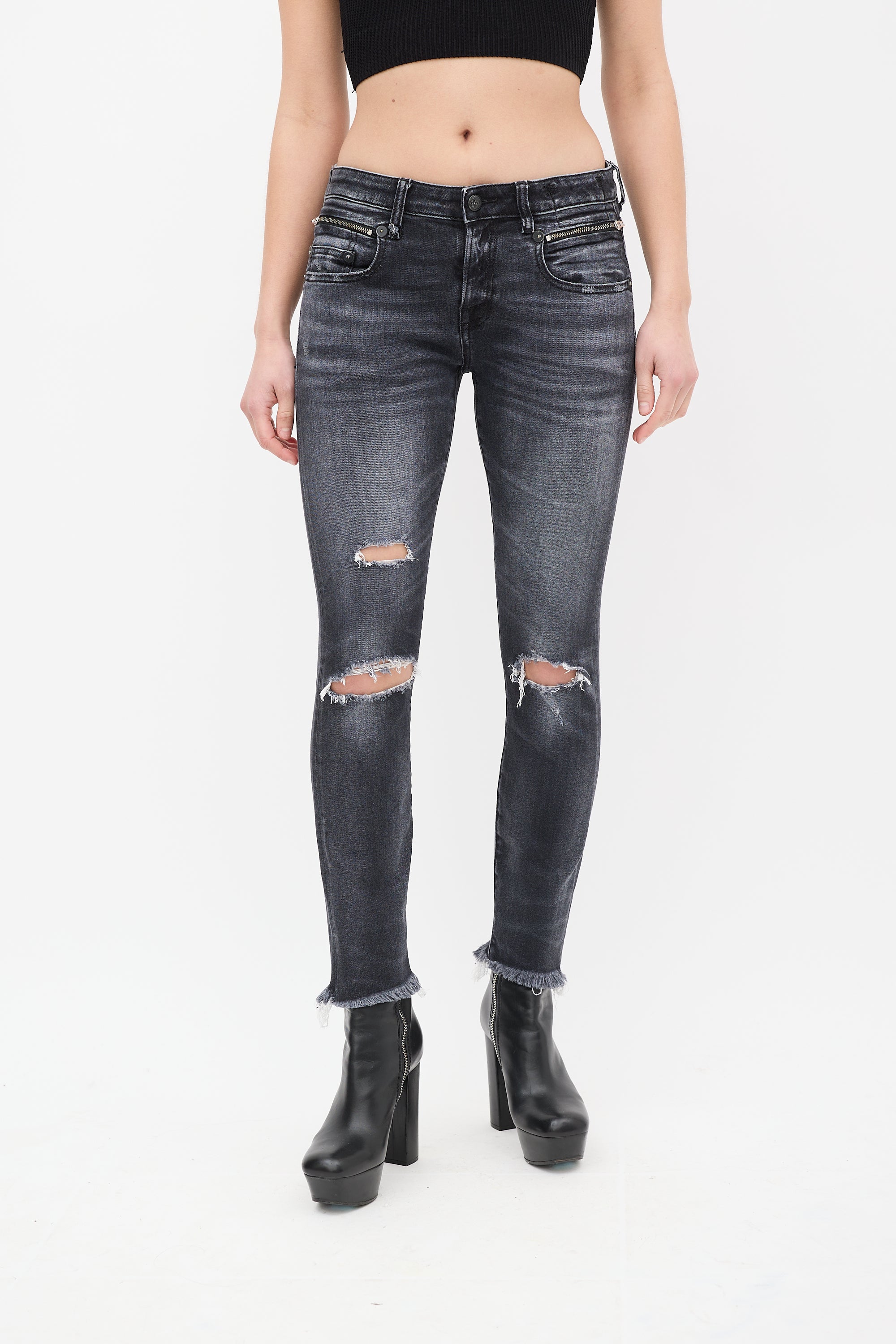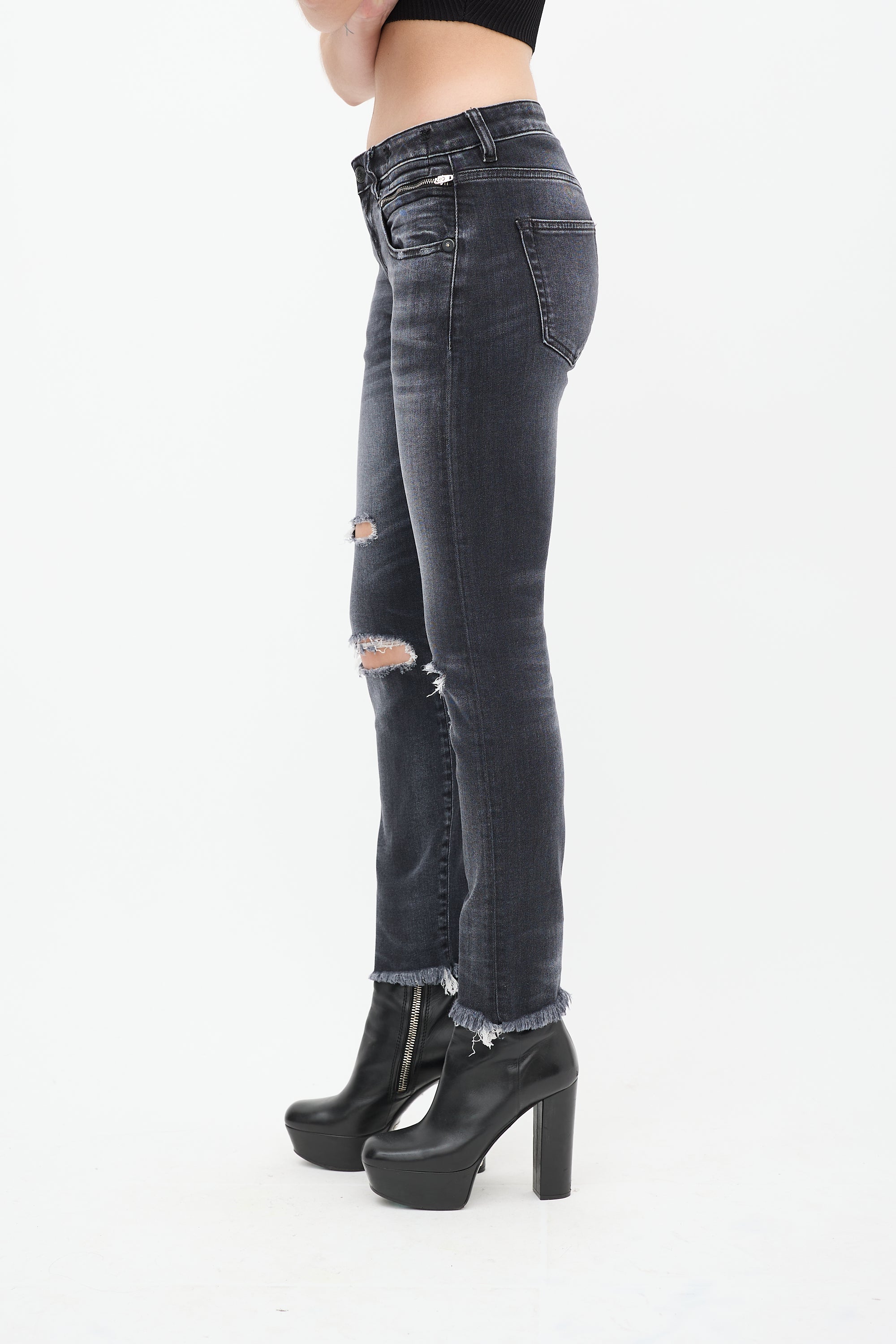 Pre-owned R13 black Biker Boy jeans in 297 Albany wash featuring belt loops, five pocket styling, two zip pockets at waist, skinny leg with ripped knee and frayed hem, and leather logo patch at back.