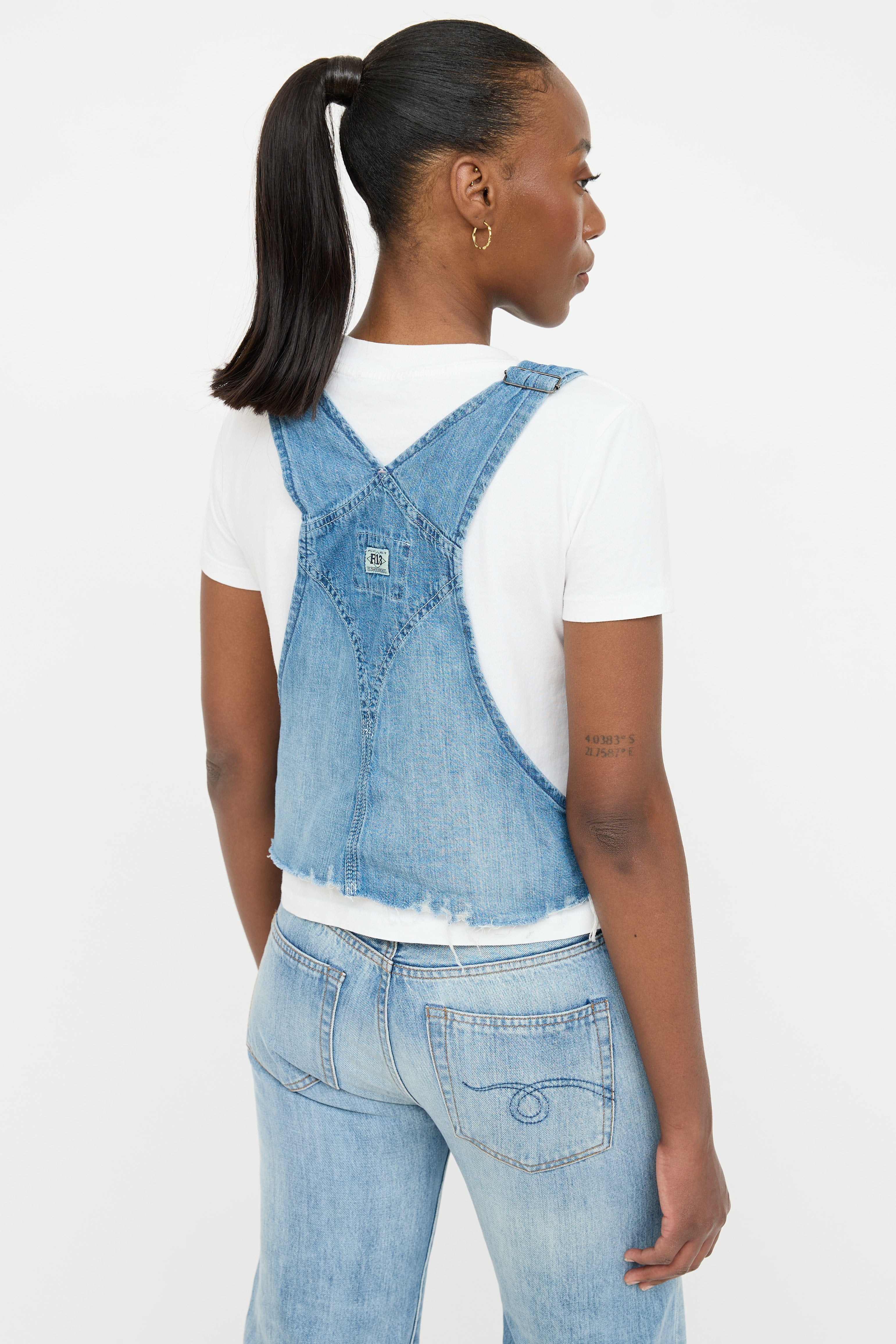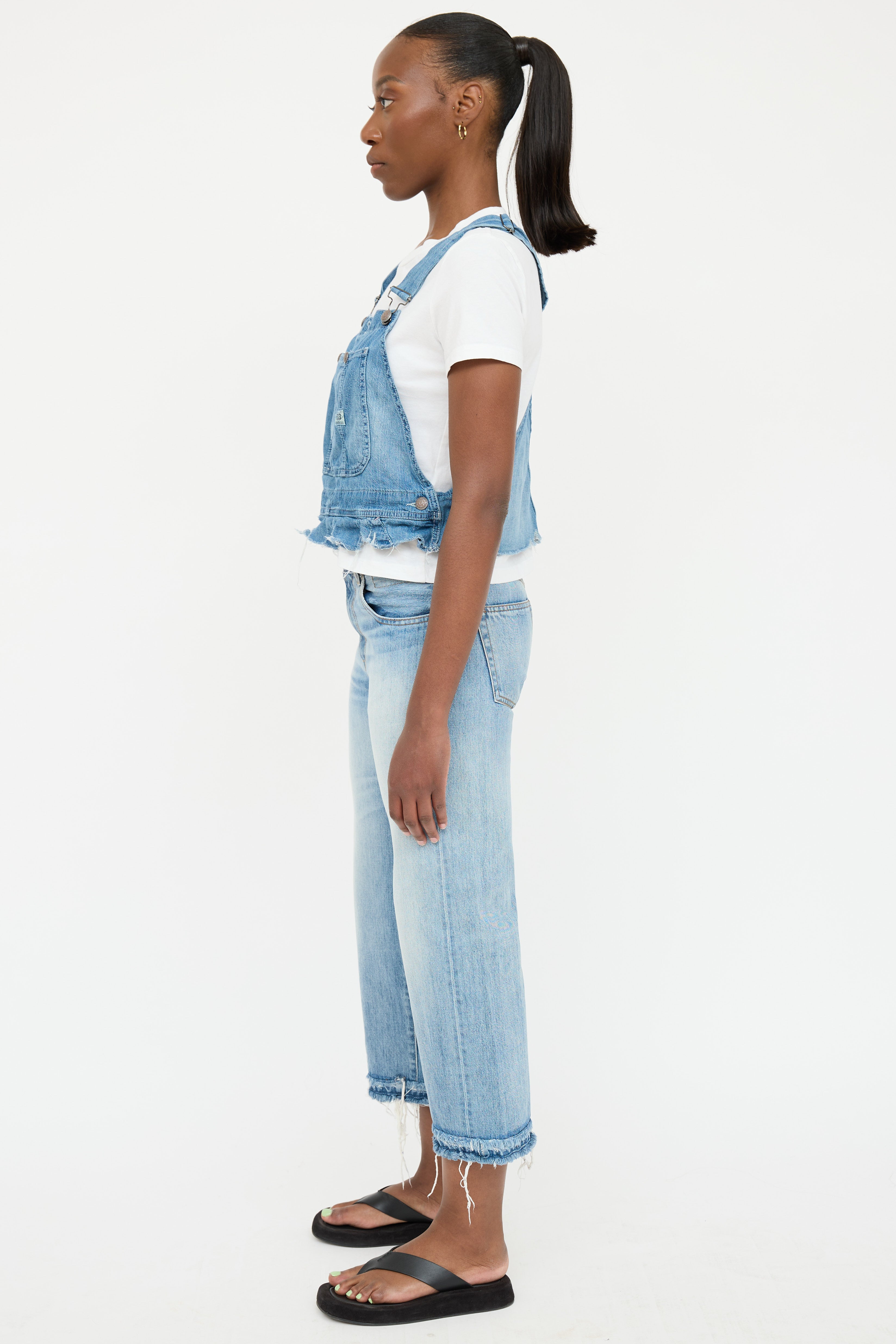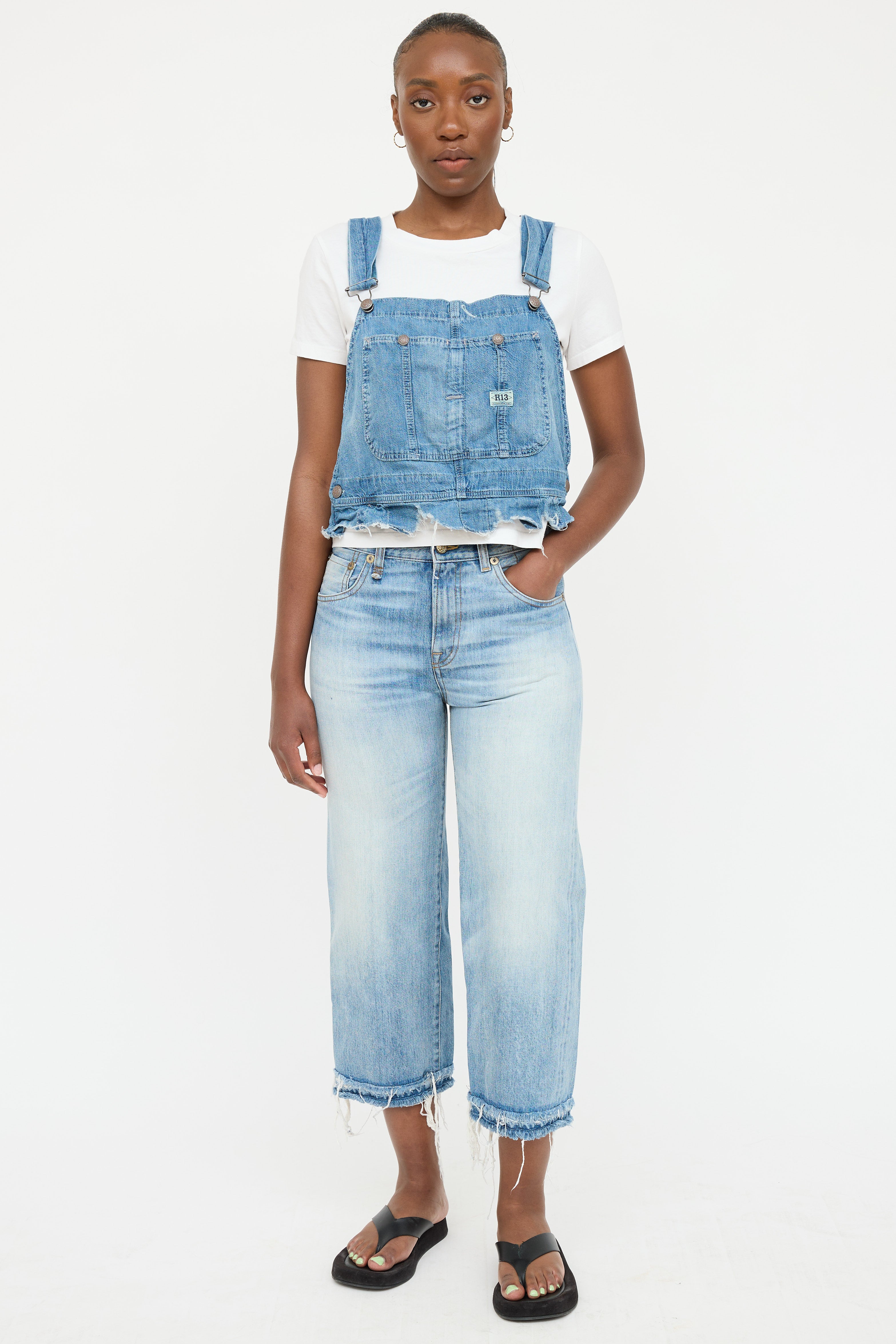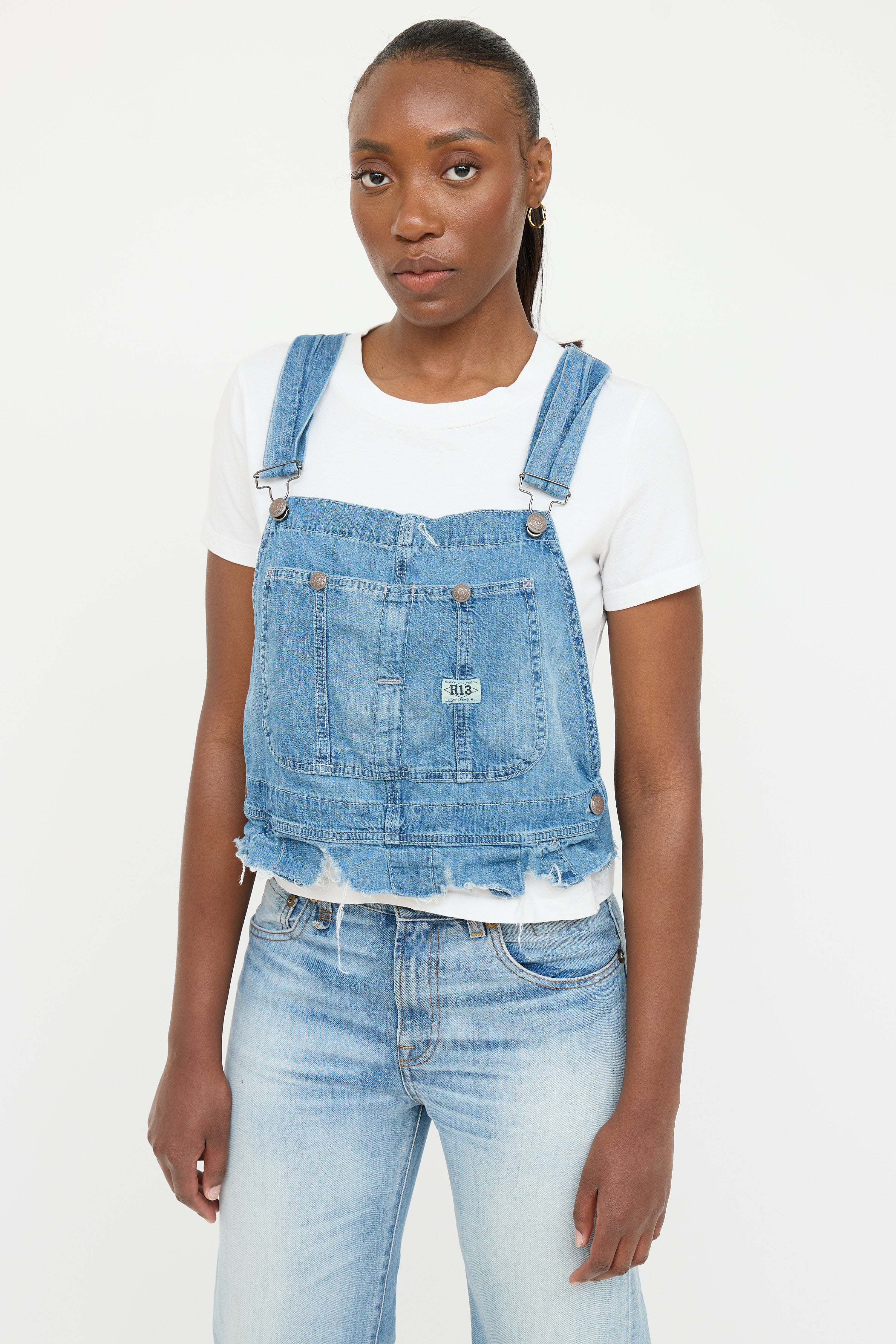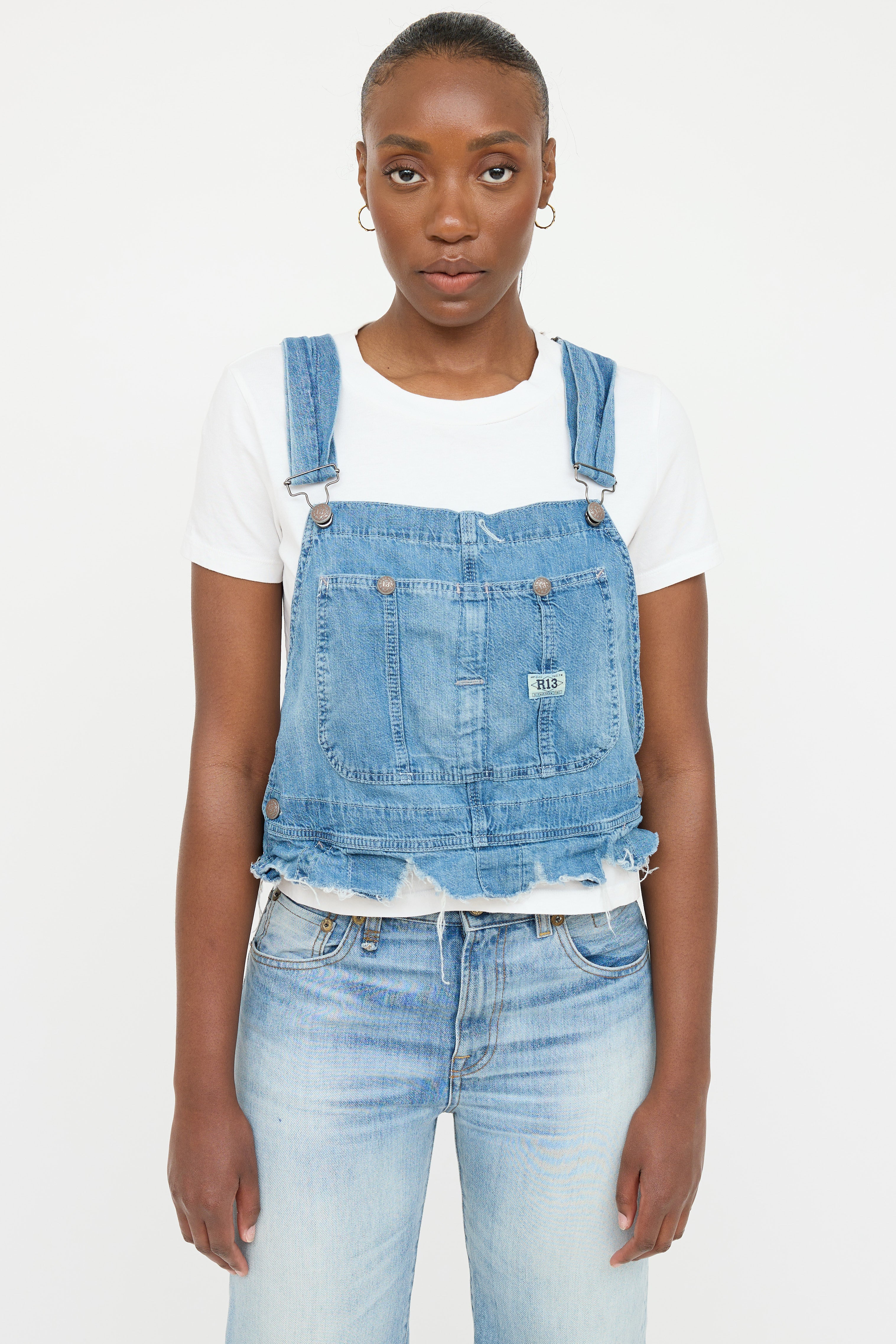 Pre-owned R13 light wash denim overall top featuring adjustable silver tone overall straps, patch pockets at chest with snap closure, and raw distressed hemline.