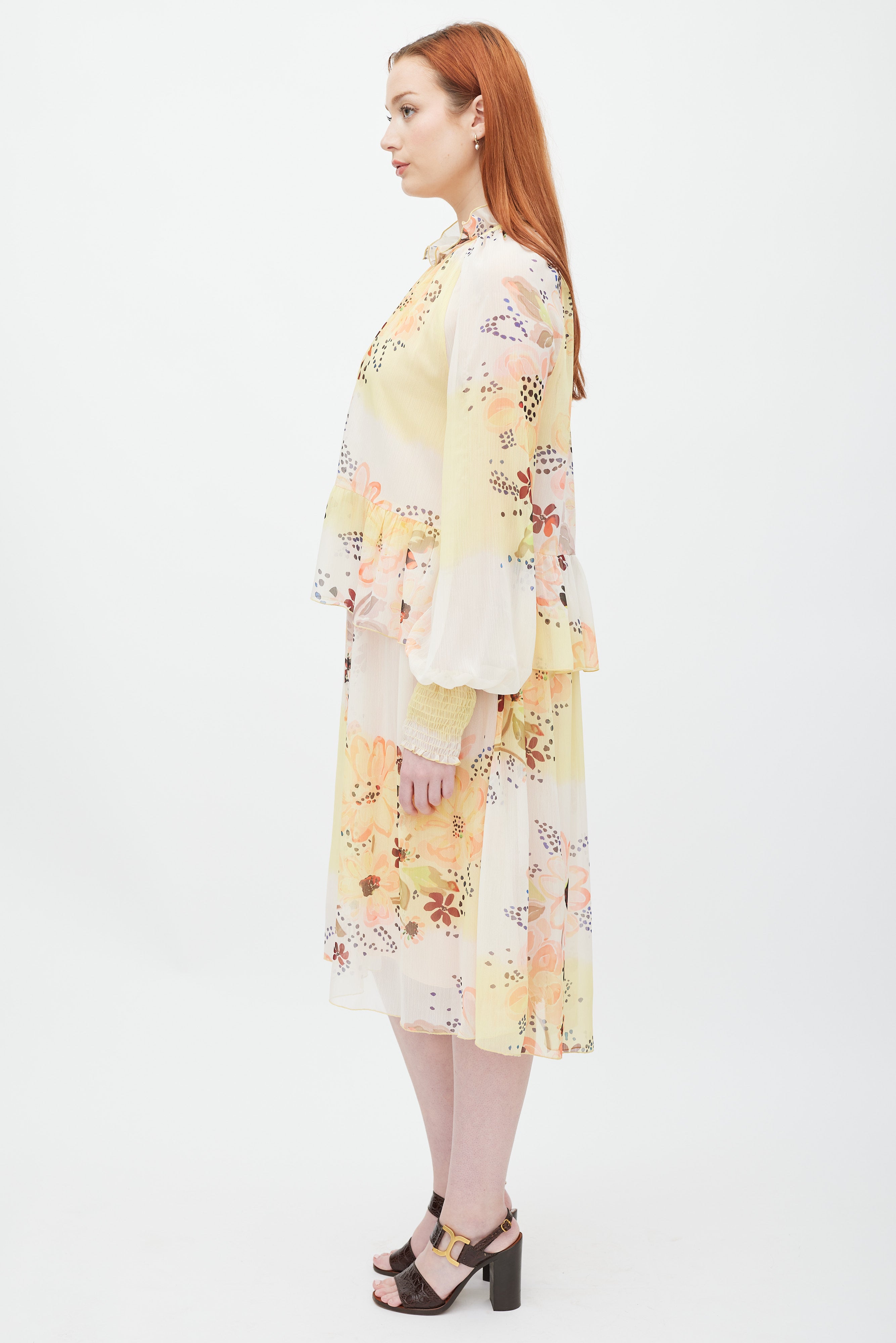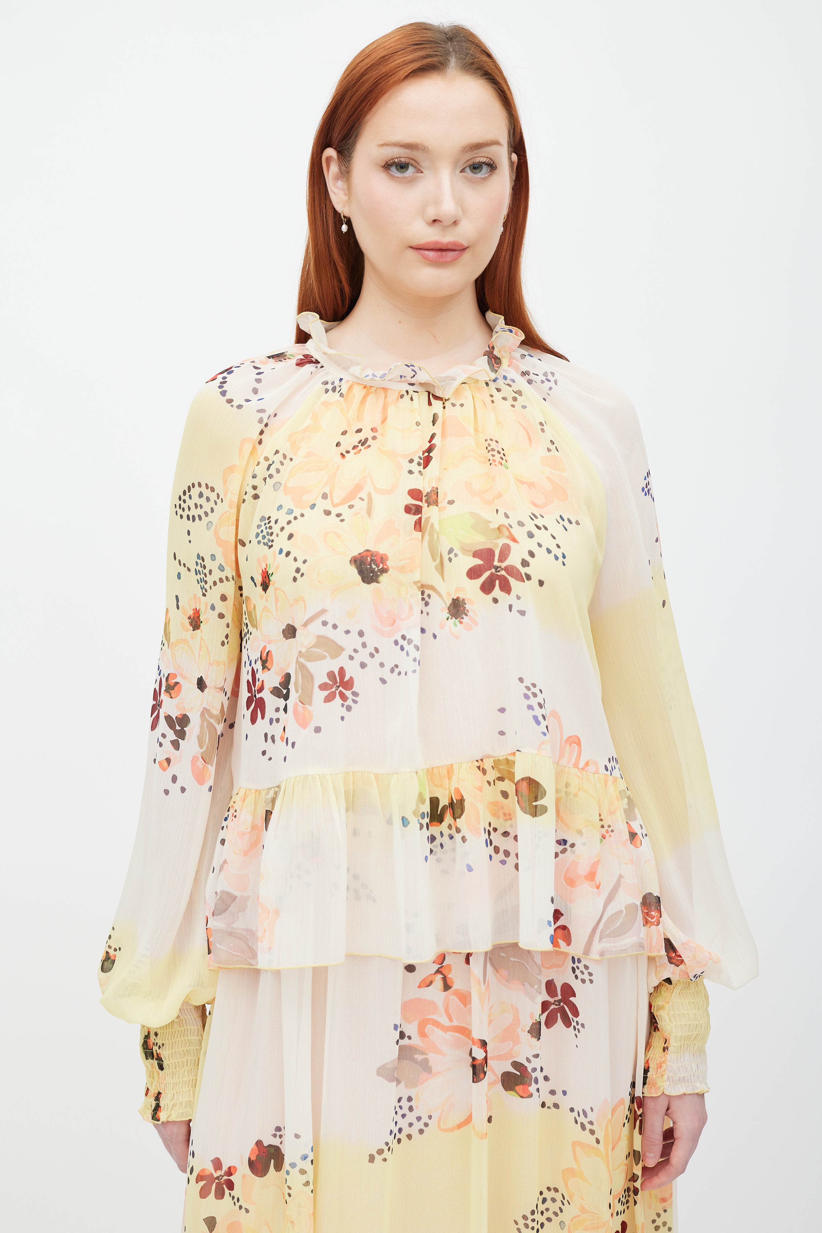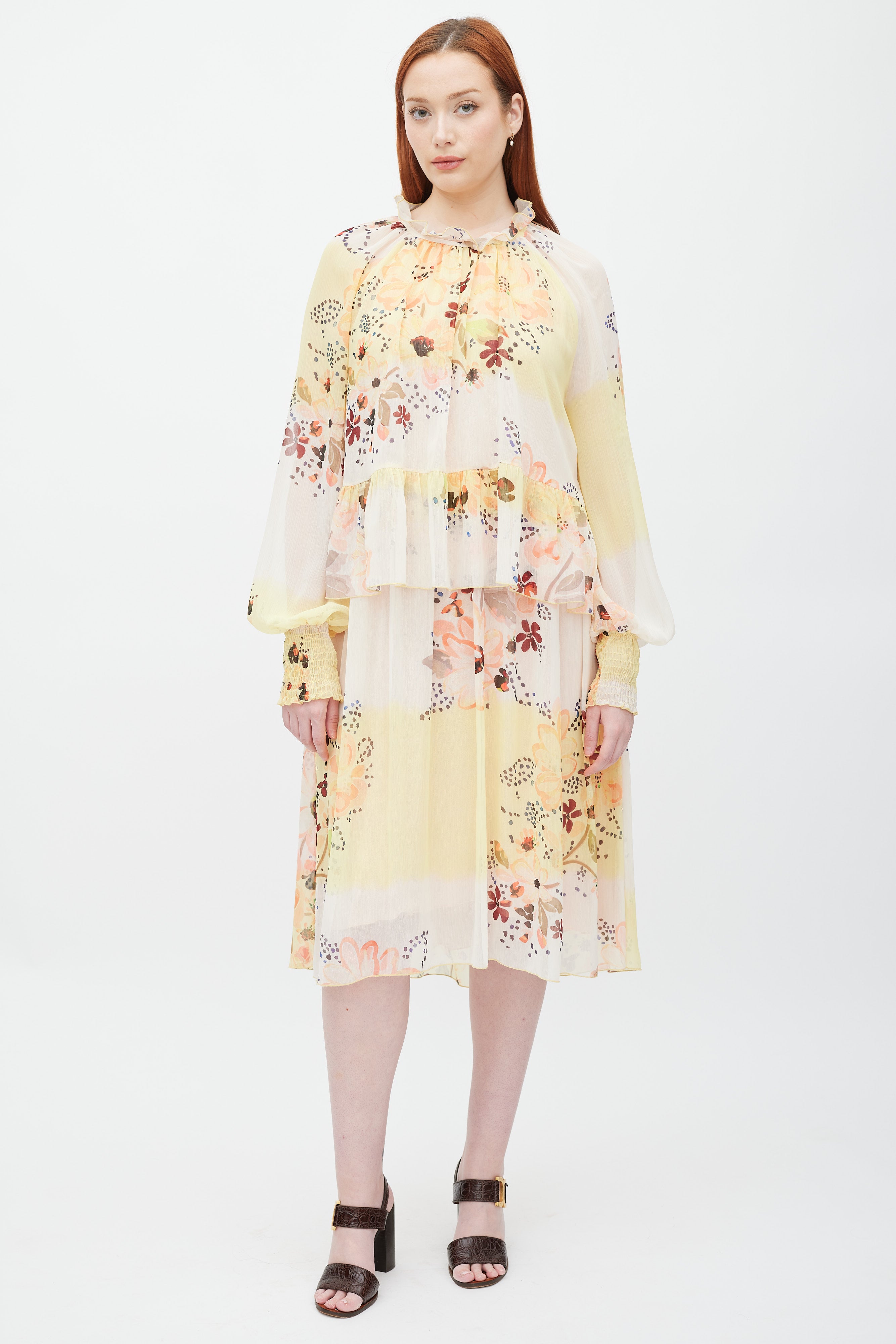 Pre-owned See By Chloé cream sheer midi dress featuring layered construction, yellow and multicolour floral print throughout, rounded neckline with ruffle trim and self tie at centre back, long sleeves with smocking at cuffs, and ruffle at waist. Lined.
