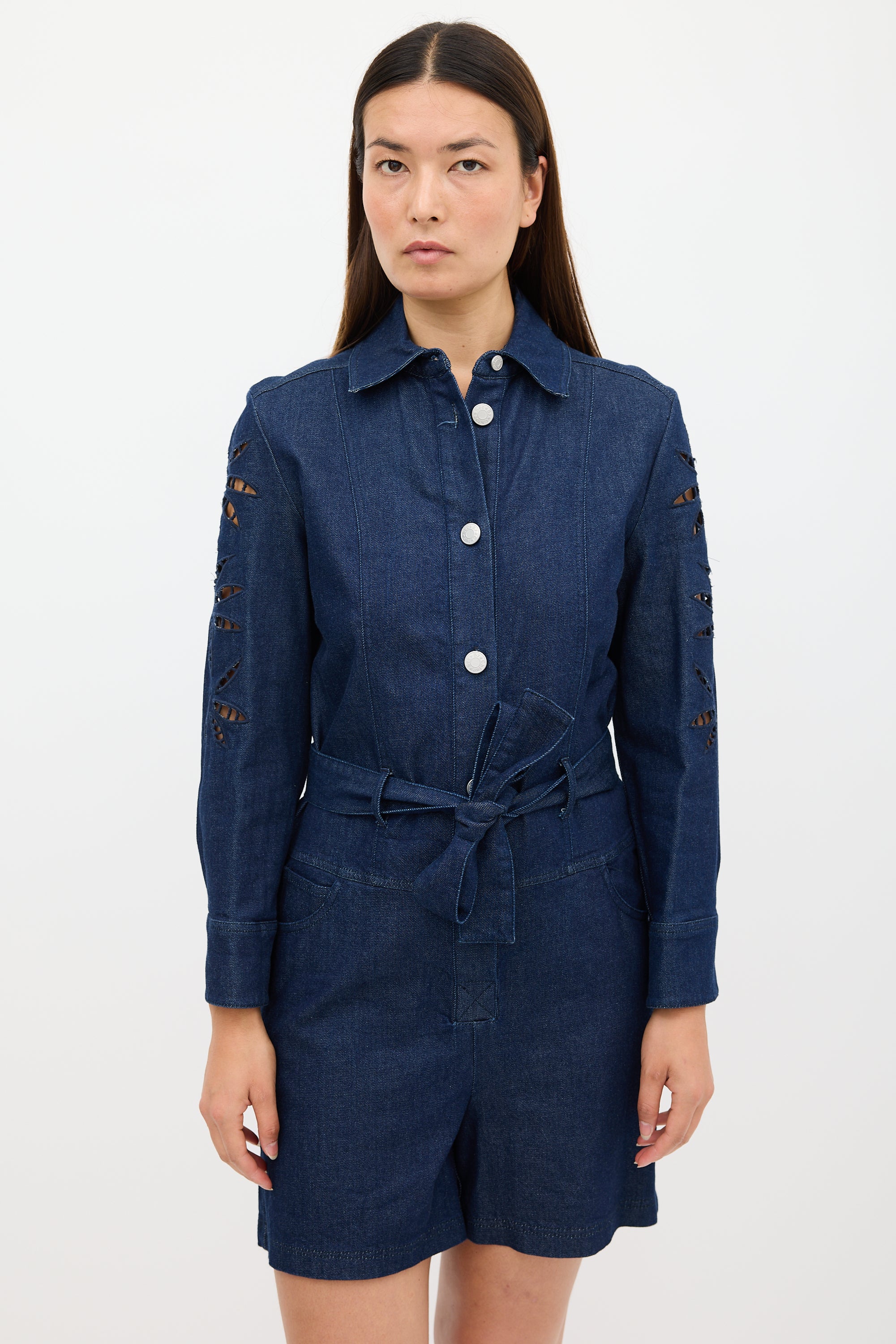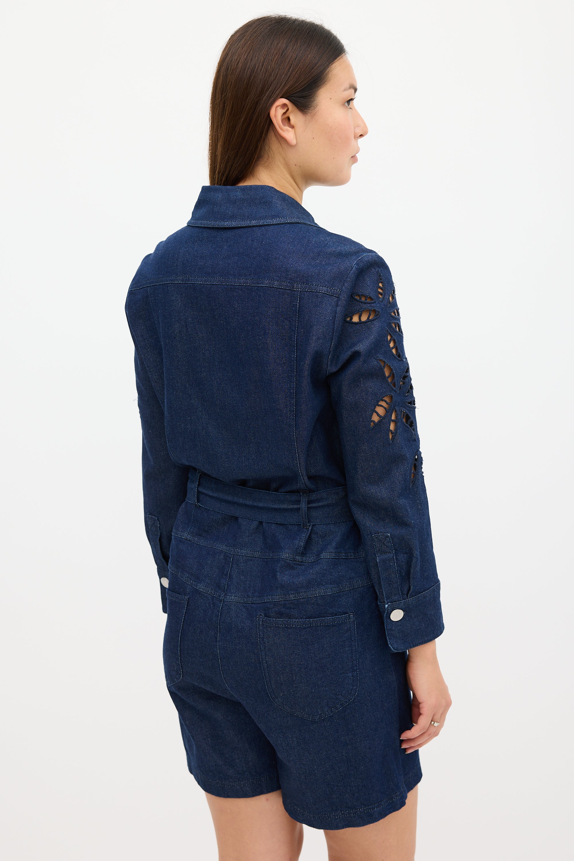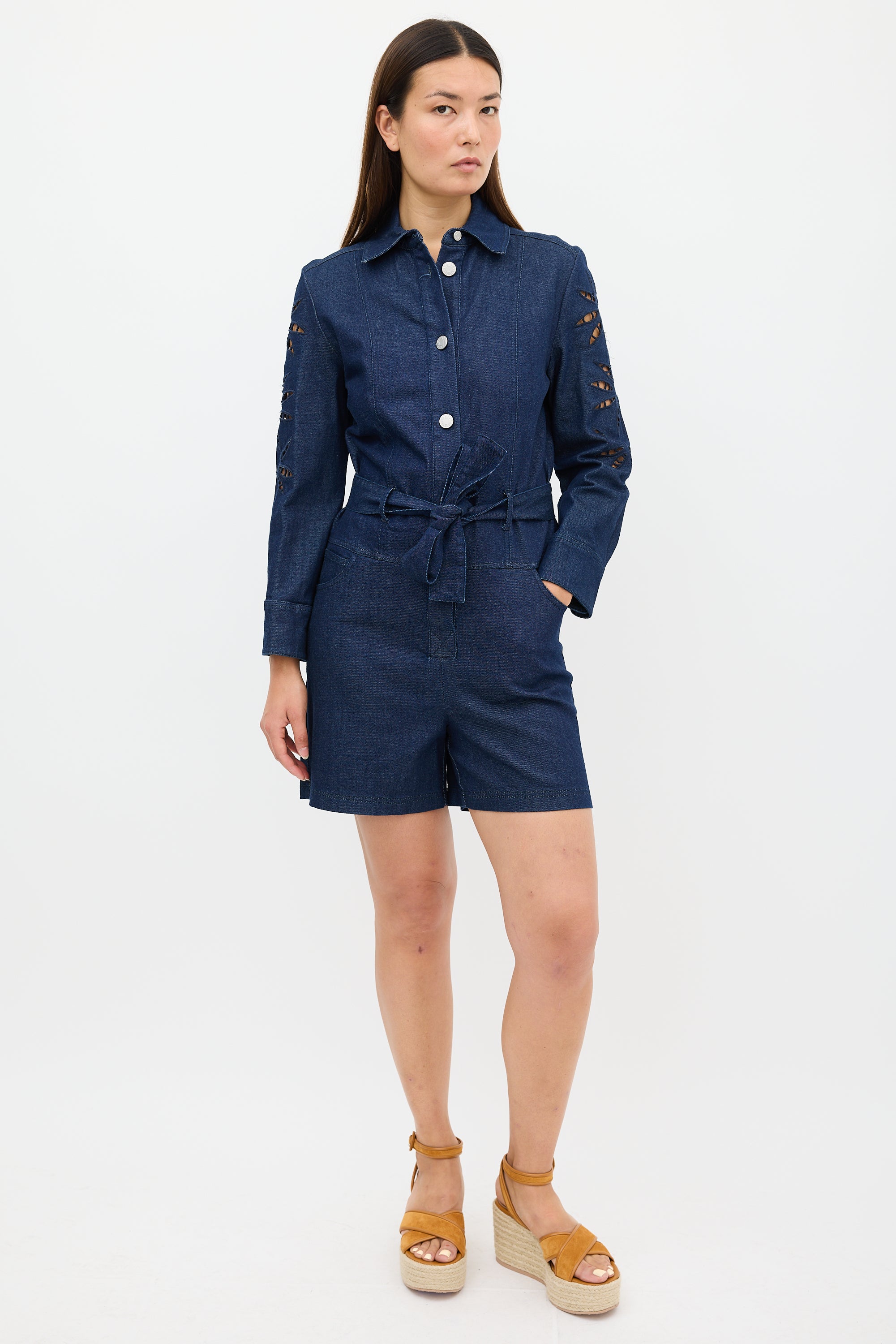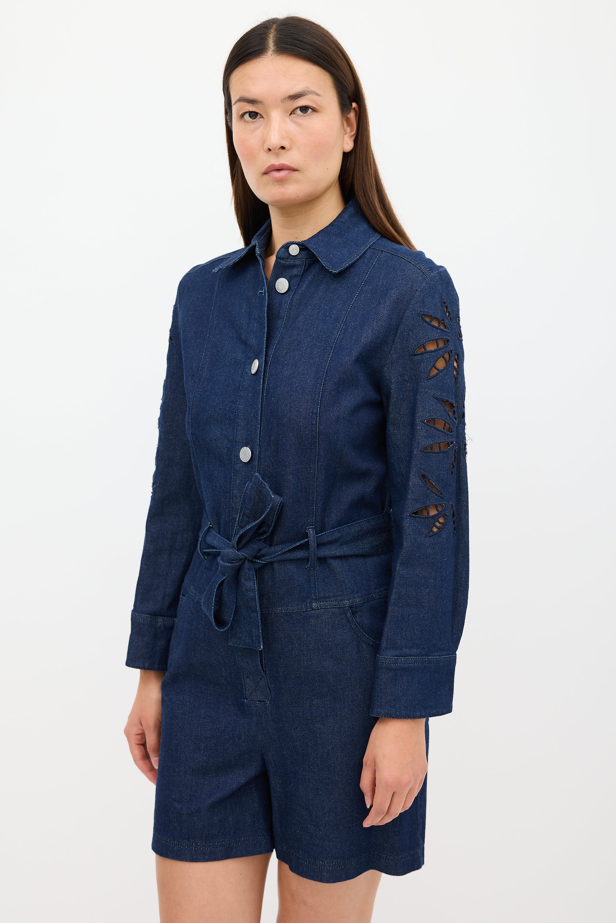 Pre-owned See By Chloé dark wash denim romper featuring classic collar, button up front, belt loops, self tie waist belt, five pocket styling, long sleeves, and laser floral cutout at shoulders.