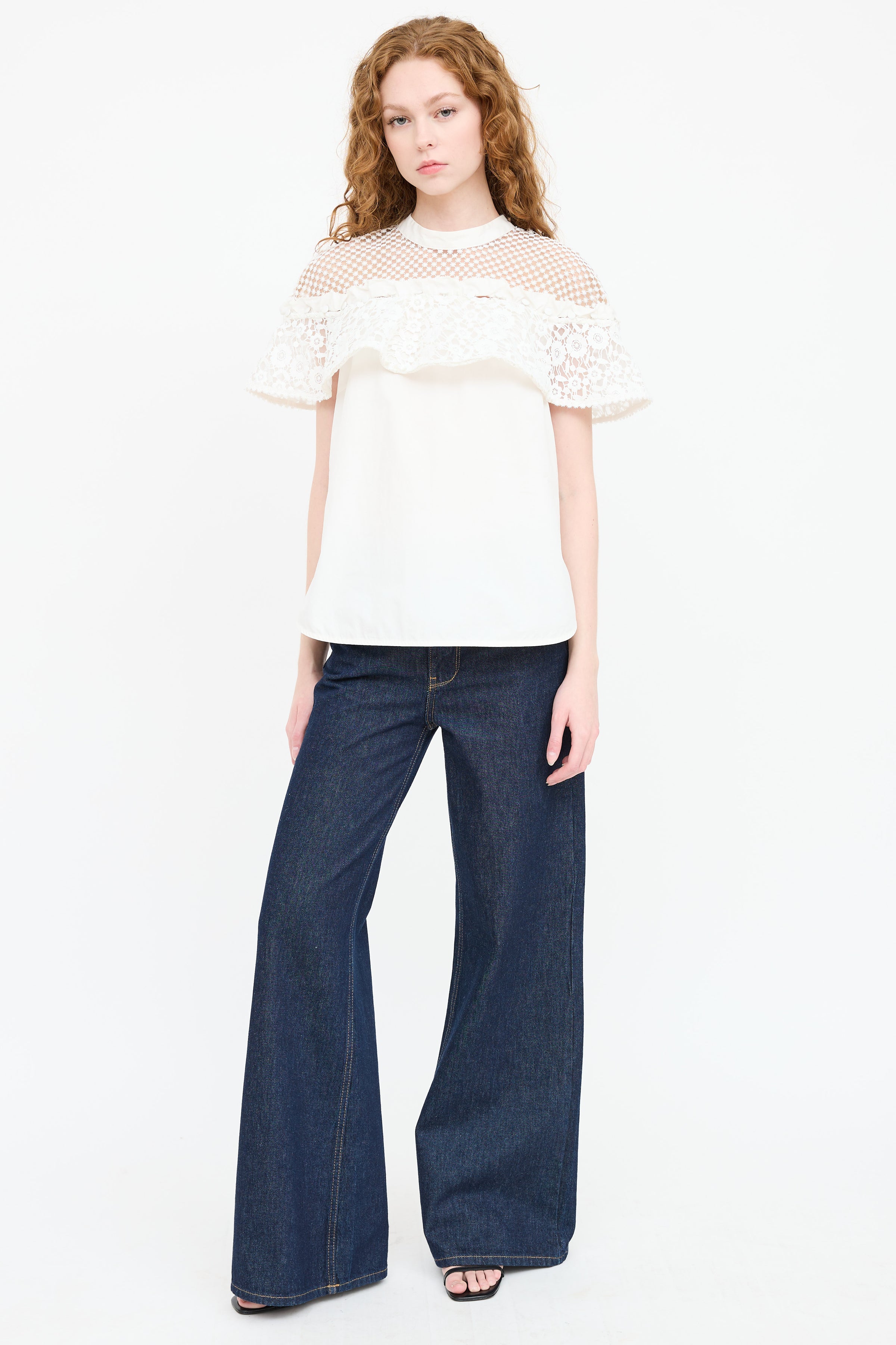 Pre-owned Self-Portrait white top featuring a round neckline, lace detailing at bust with cut out detail, ruffled overlay at chest, short cap sleeves, and zip at back.