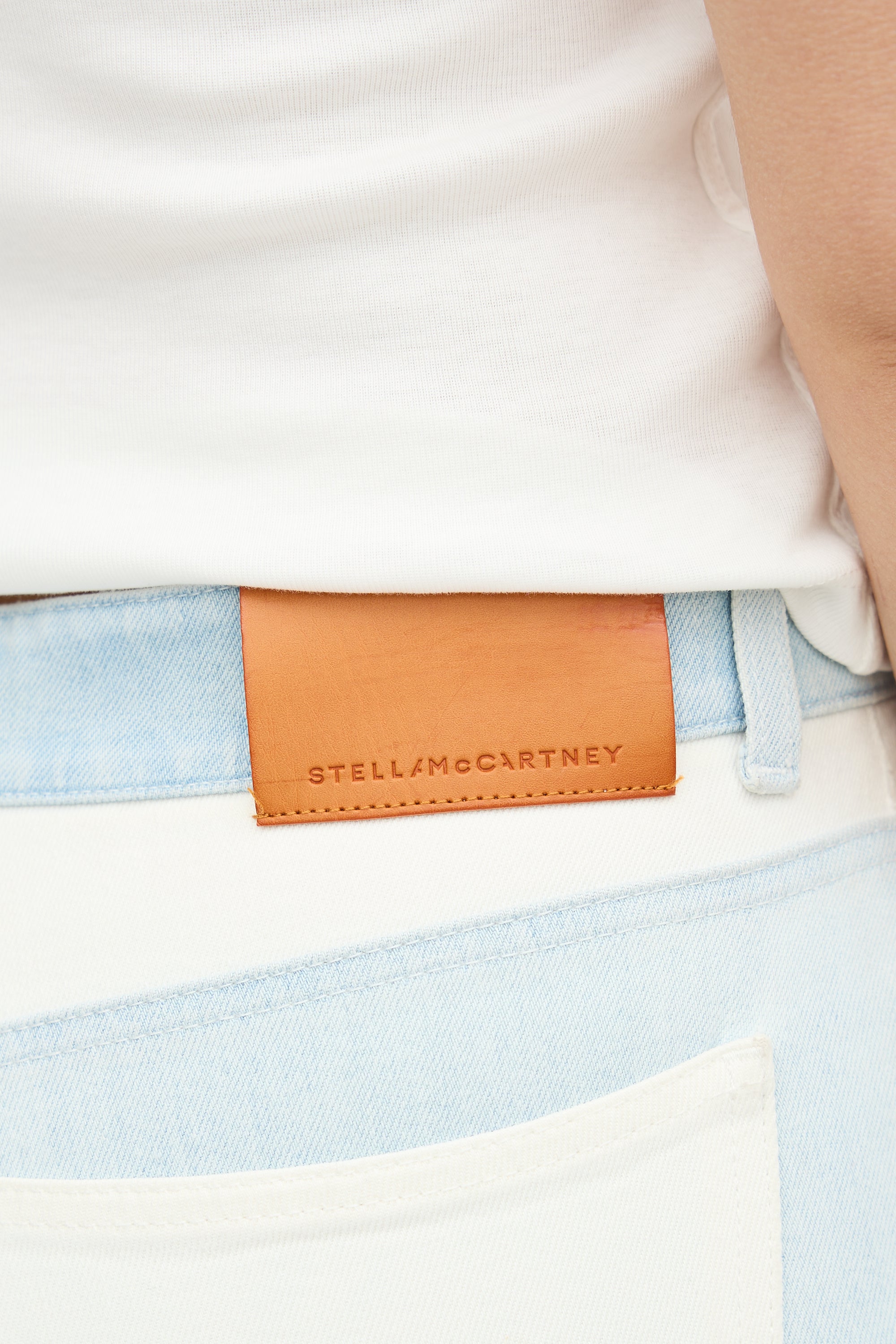 Pre-owned Stella McCartney blue and white patchwork jeans featuring mid rise, embroidered star panels, zip fly, five pocket styling, and cropped straight leg.