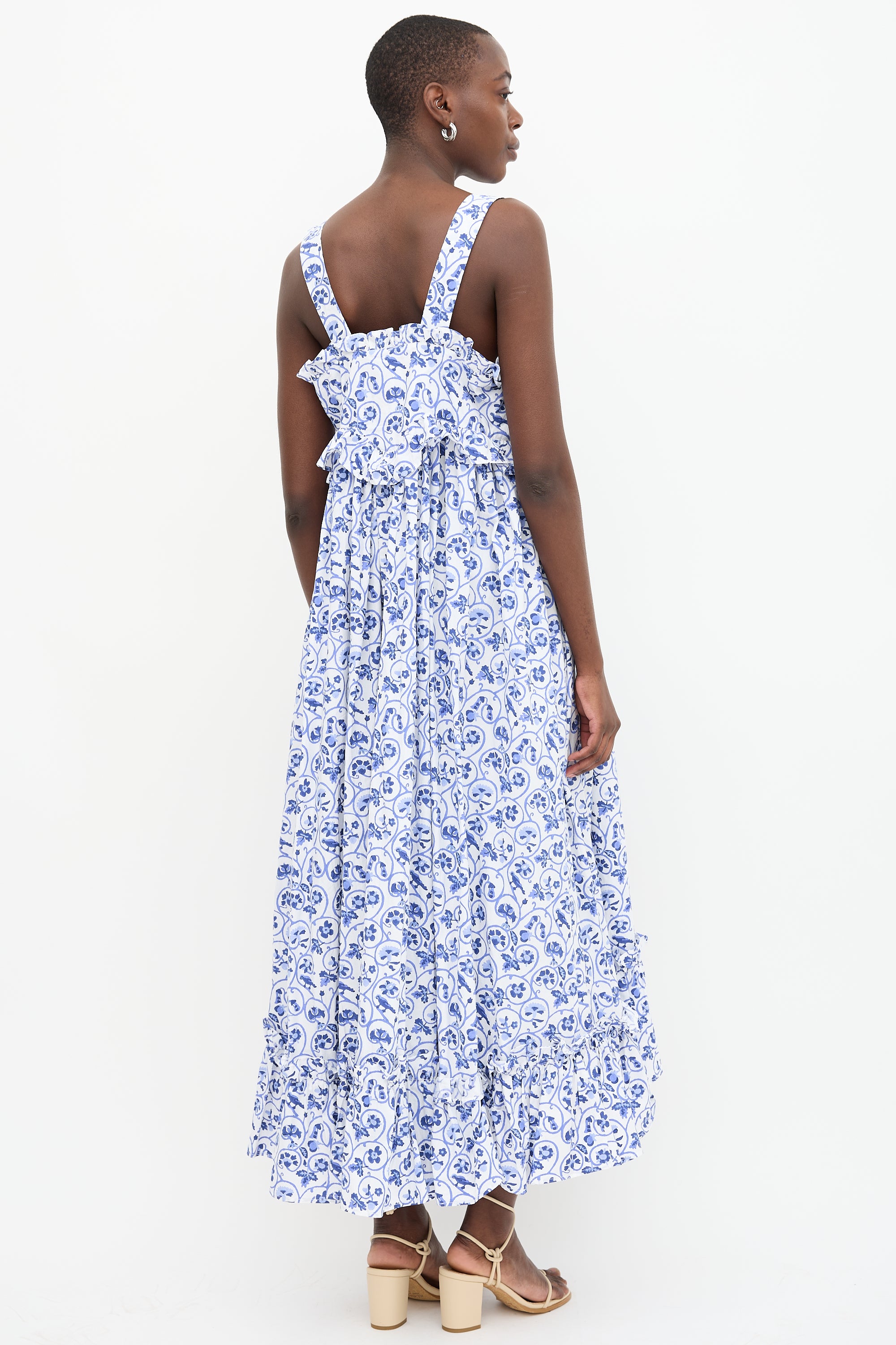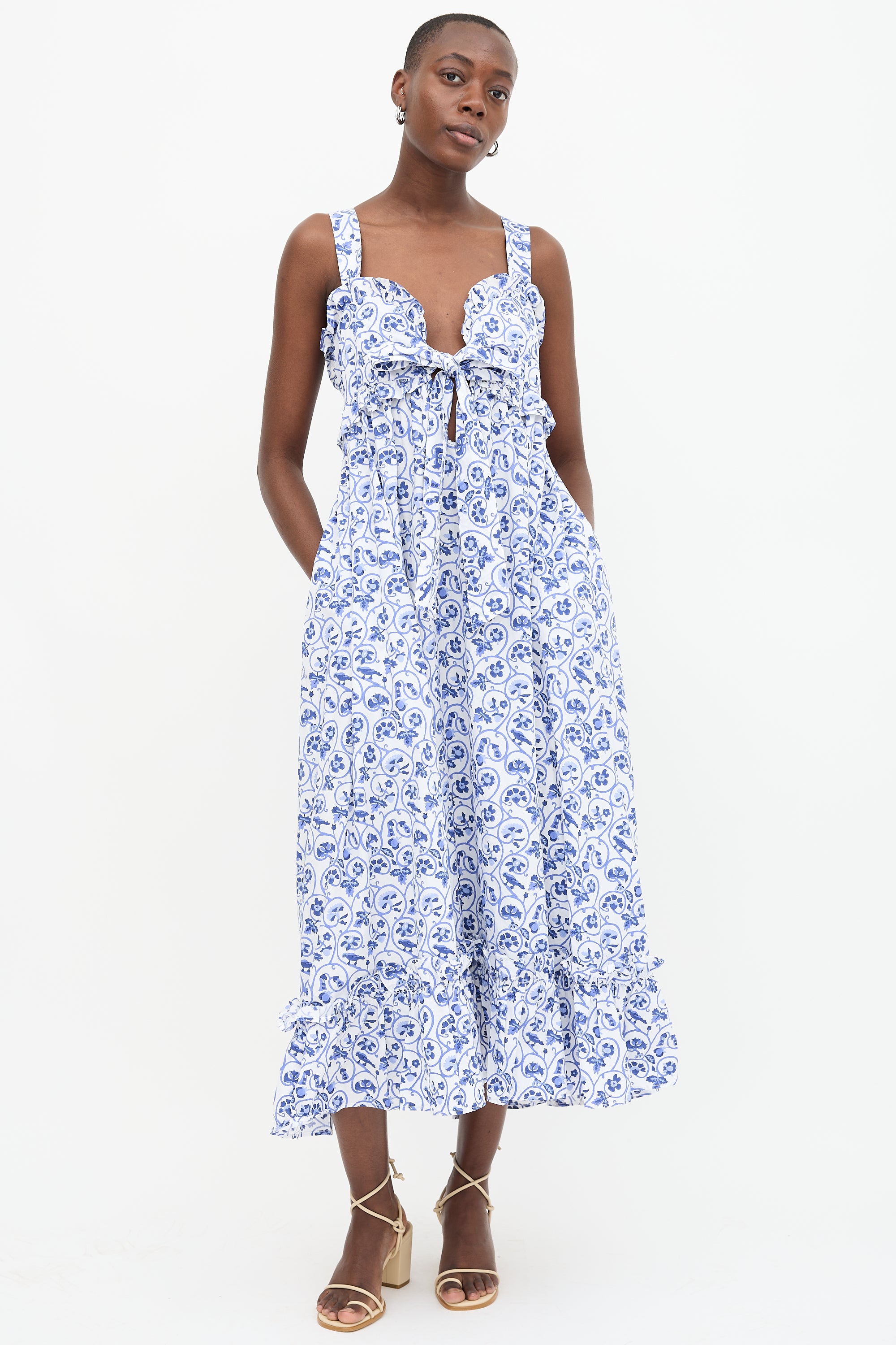 Pre-owned Thierry Colson blue and white maxi dress featuring sweetheart neckline with bow, empire waist, floral pattern, and ruffled neck, waist, and hem. Clipped to fit model.