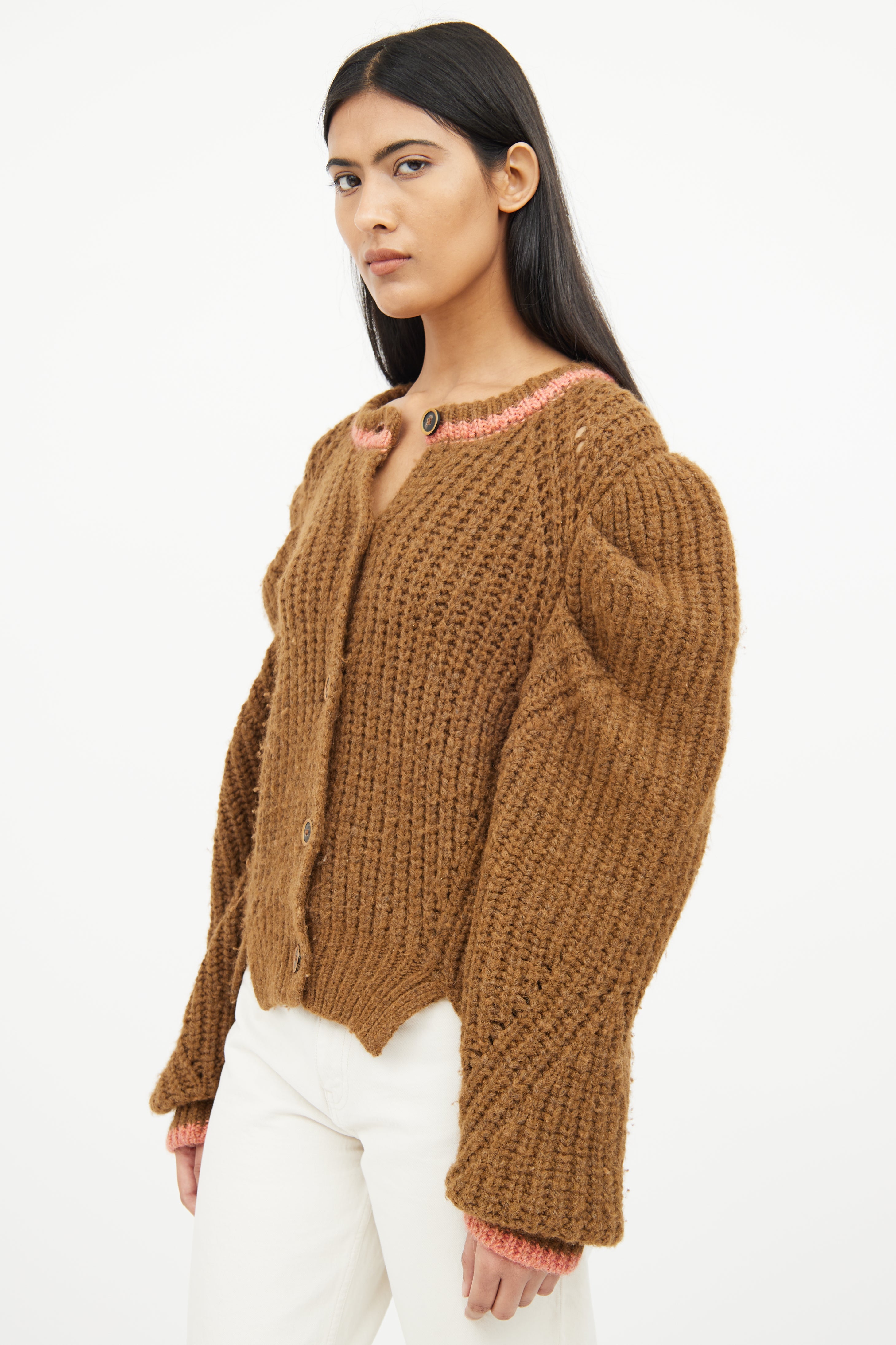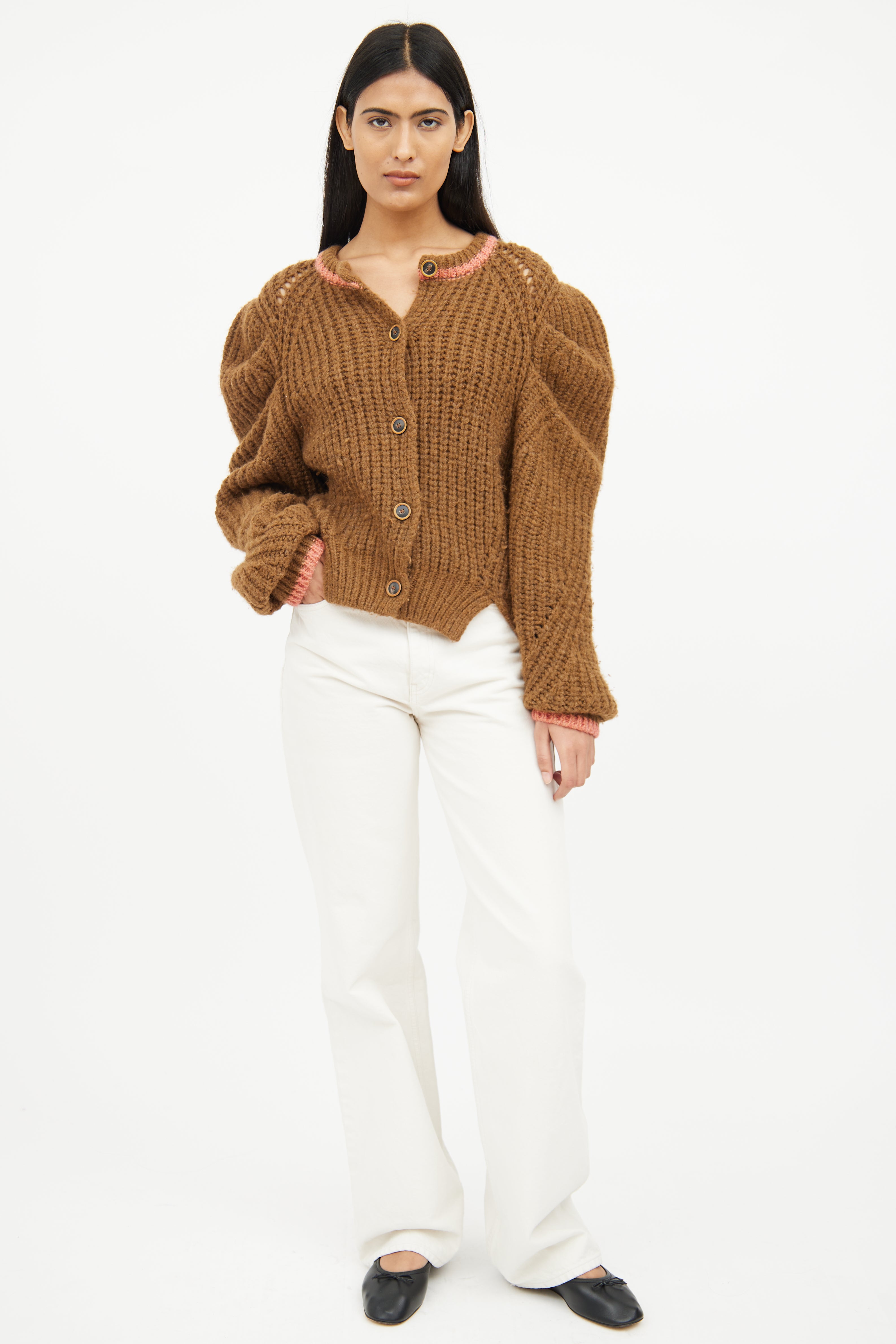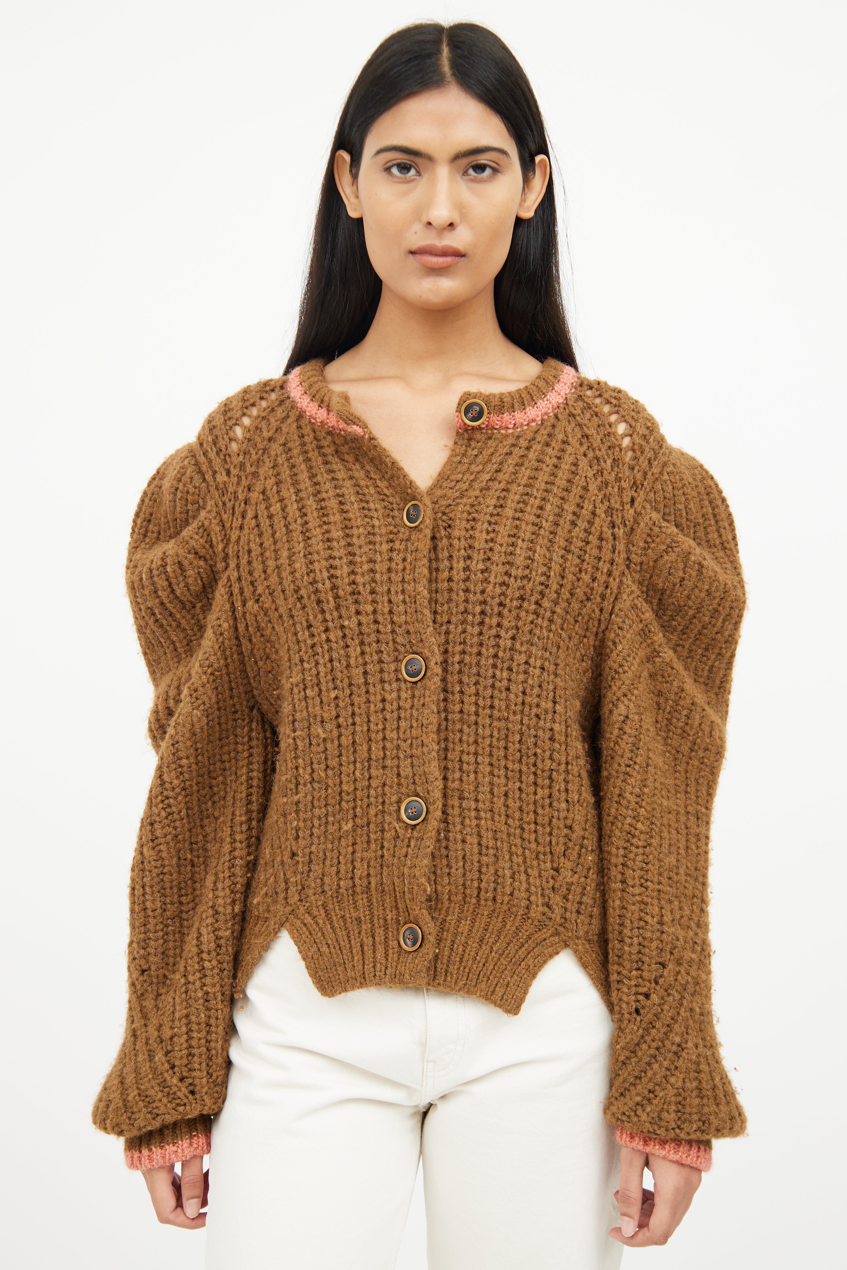 Pre-owned Ulla Johnson brown Alpaca wool long sleeve knit cardigan featuring puff sleeves, round collar, button up, pink trim around neckline and cuffs, and crop fit with dual slits on hem.