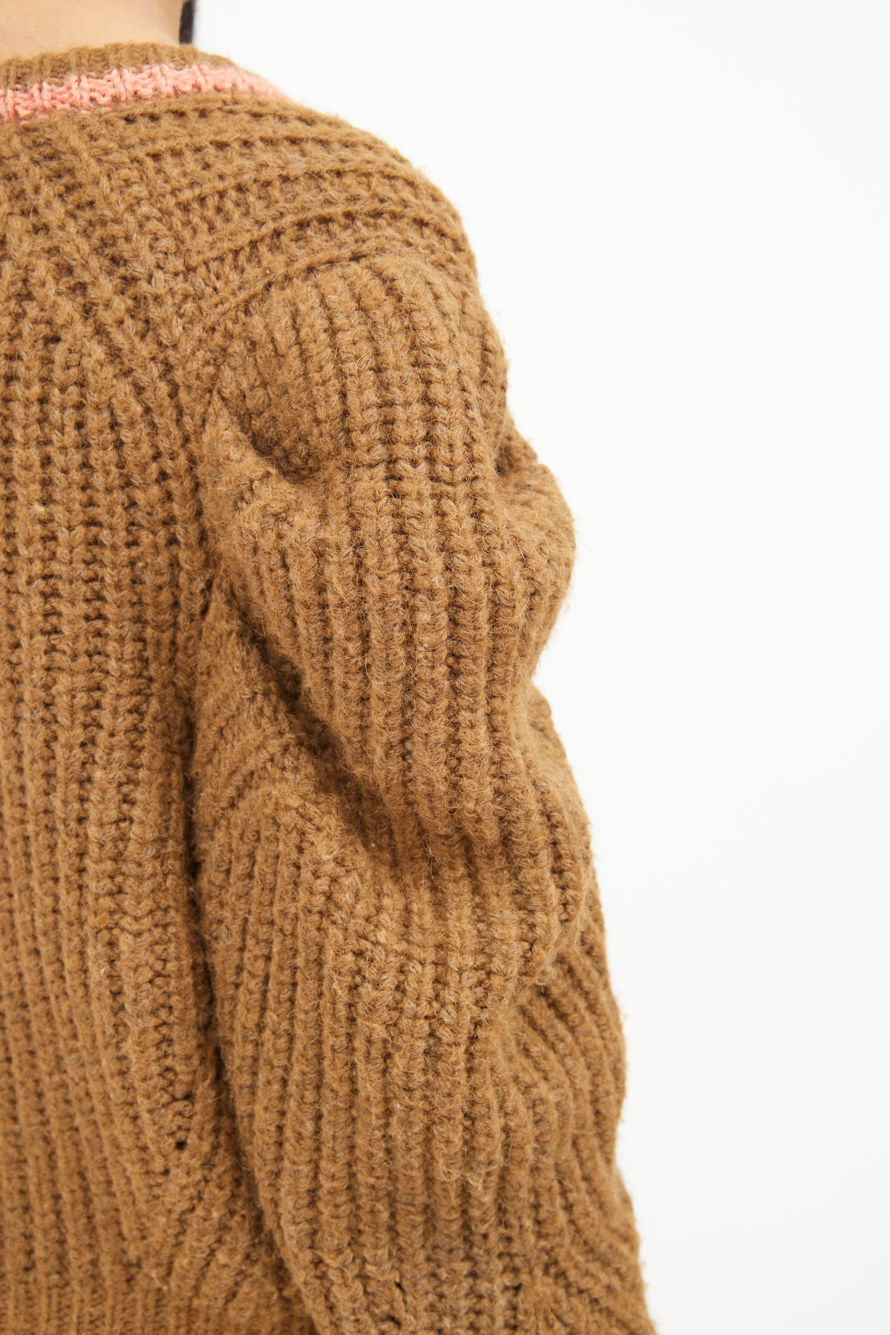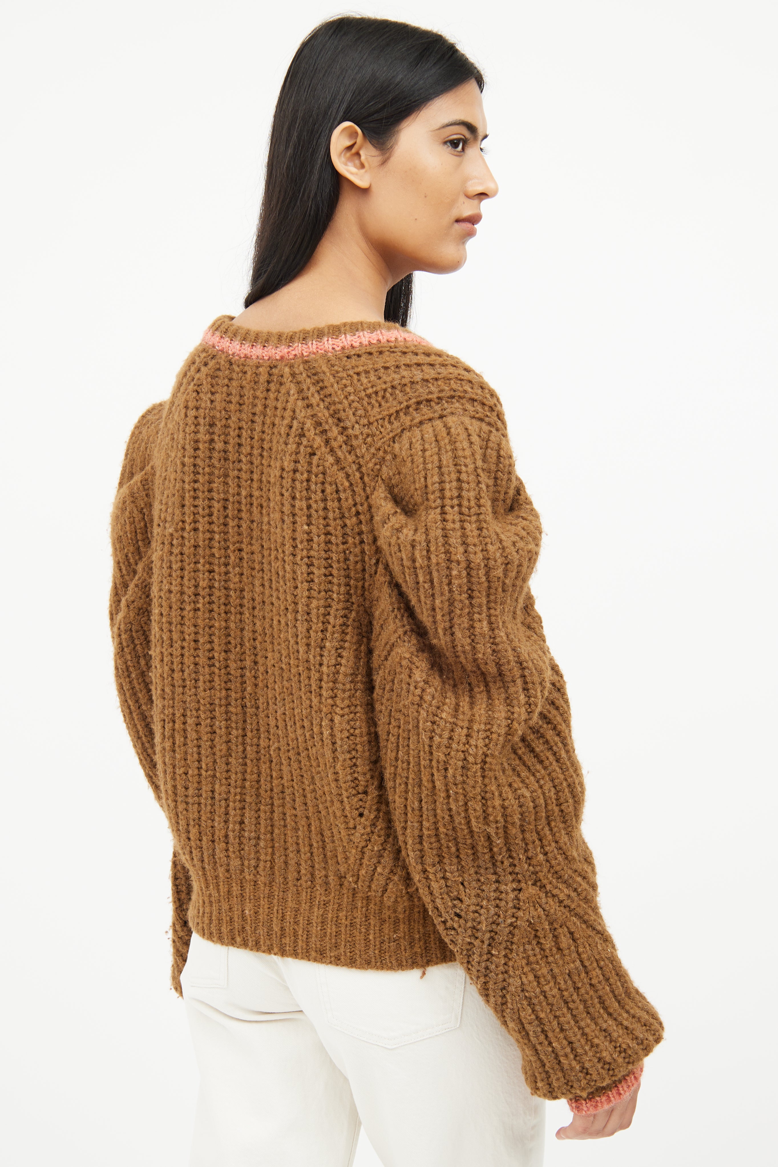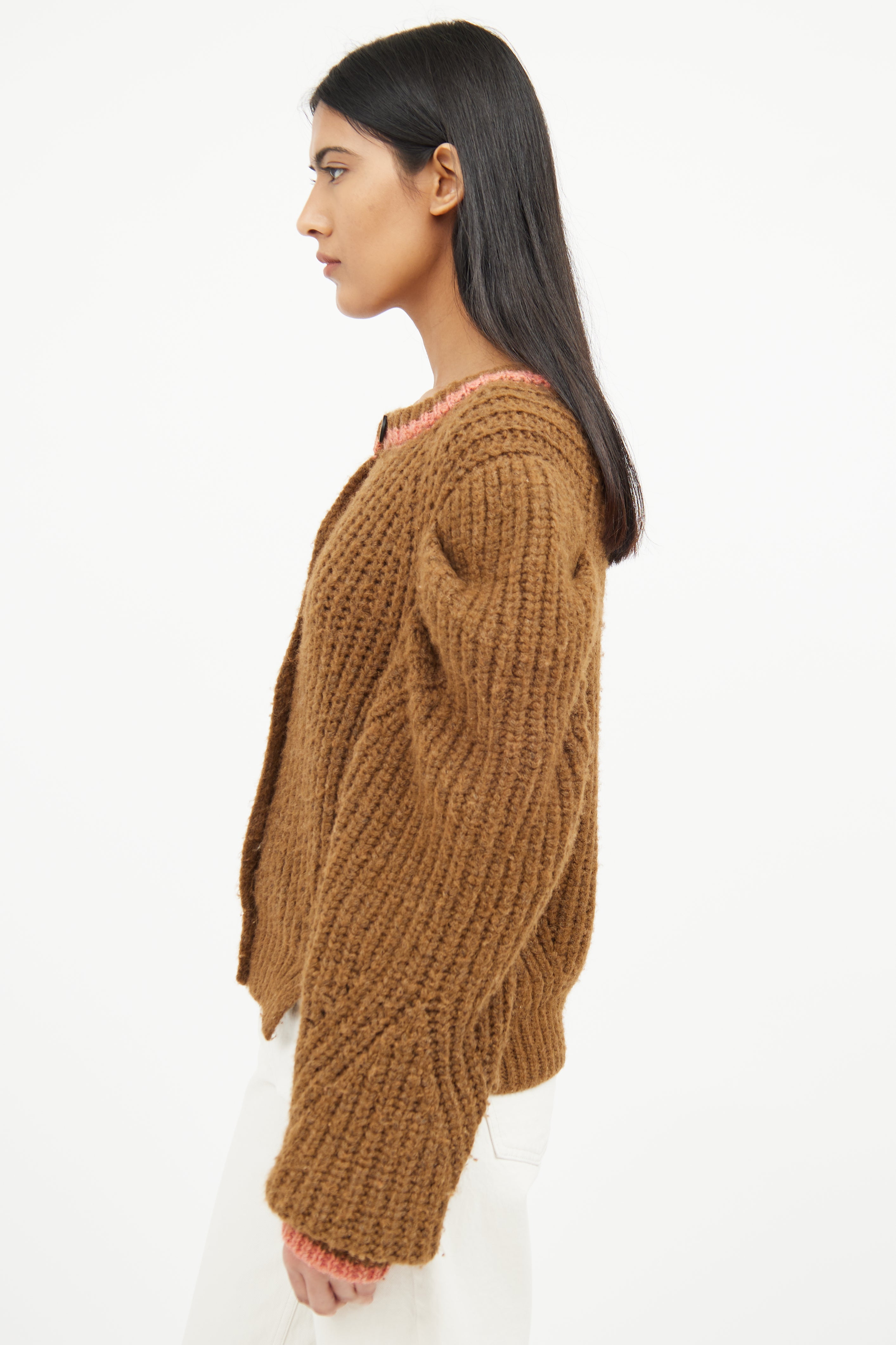 Pre-owned Ulla Johnson brown Alpaca wool long sleeve knit cardigan featuring puff sleeves, round collar, button up, pink trim around neckline and cuffs, and crop fit with dual slits on hem.