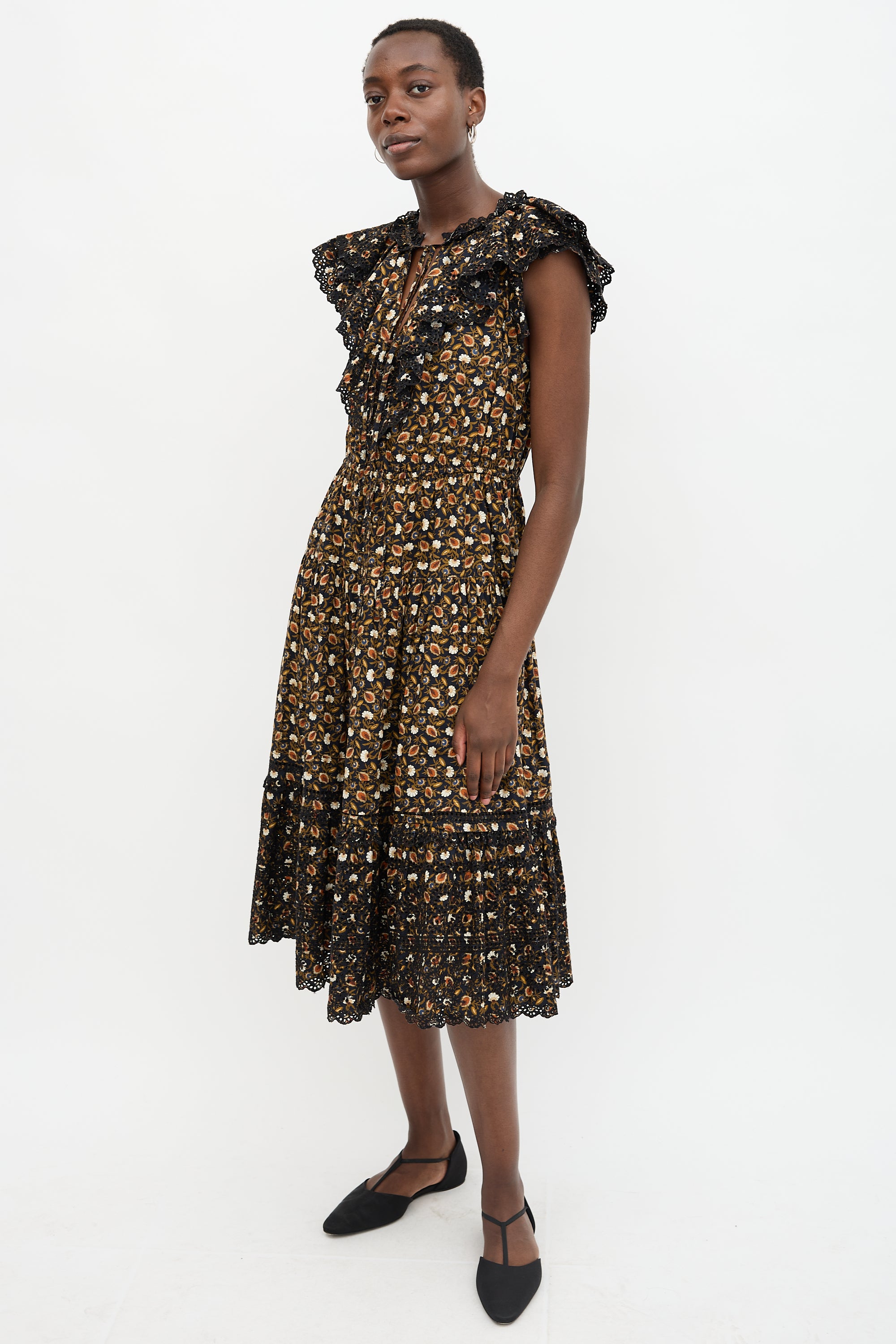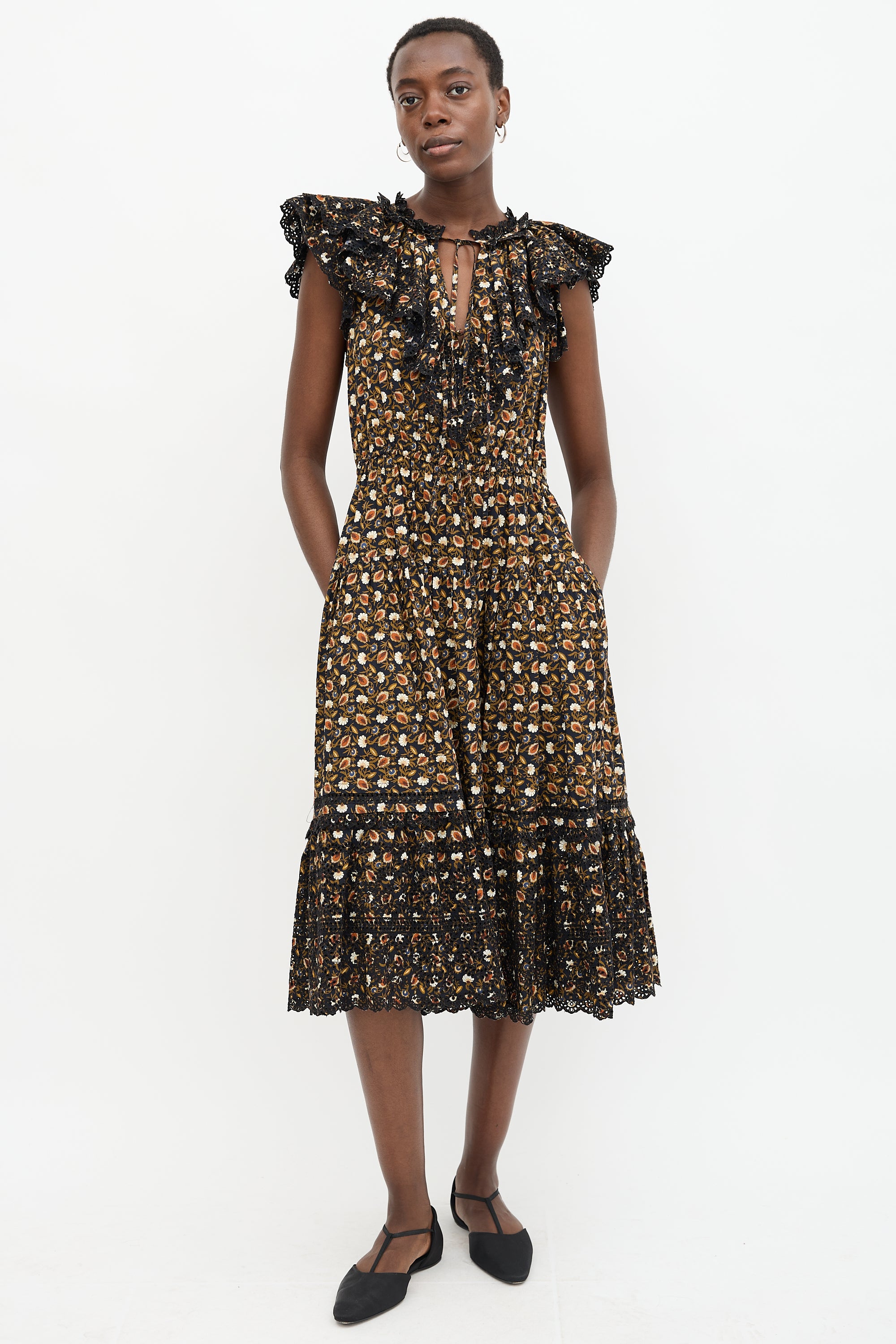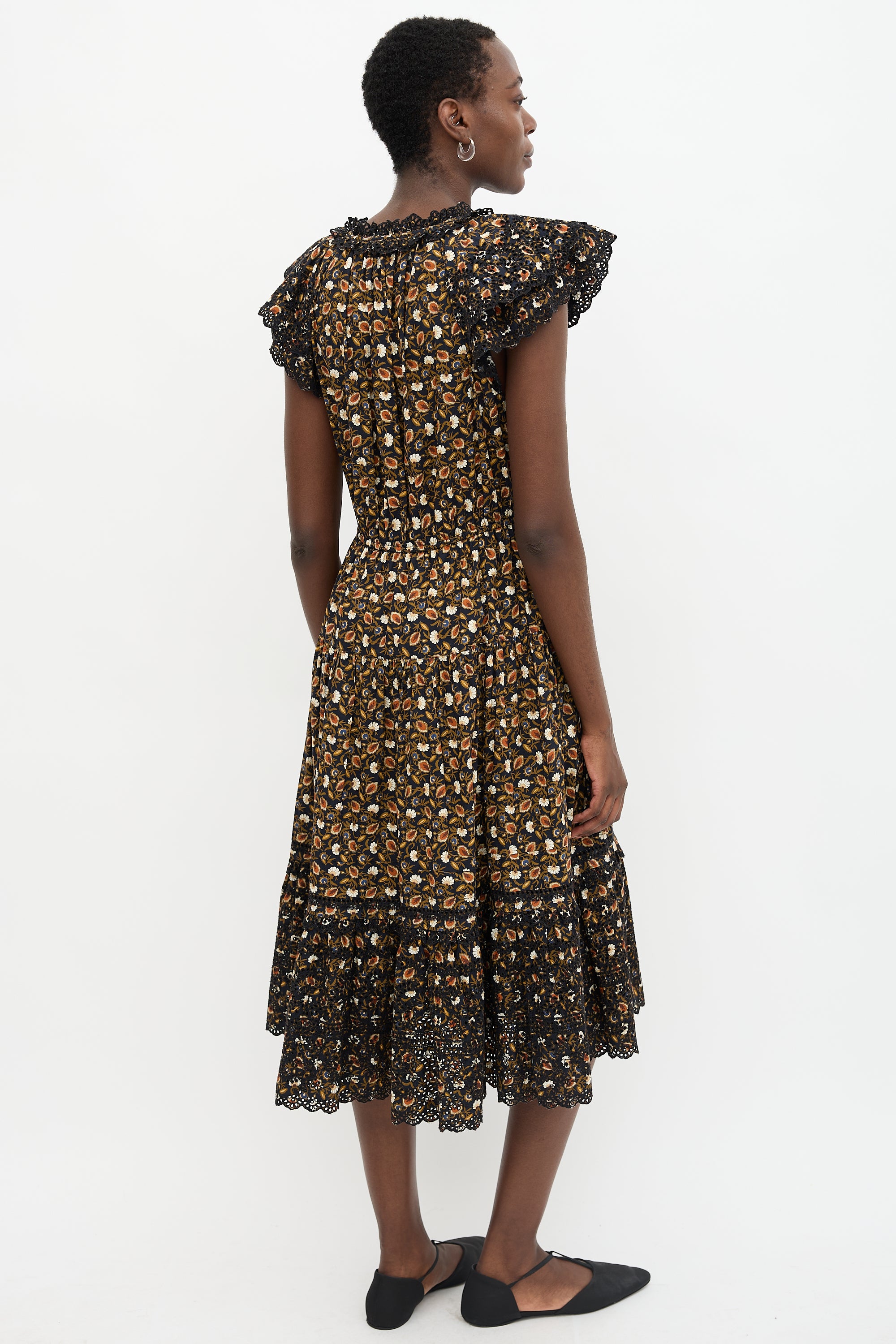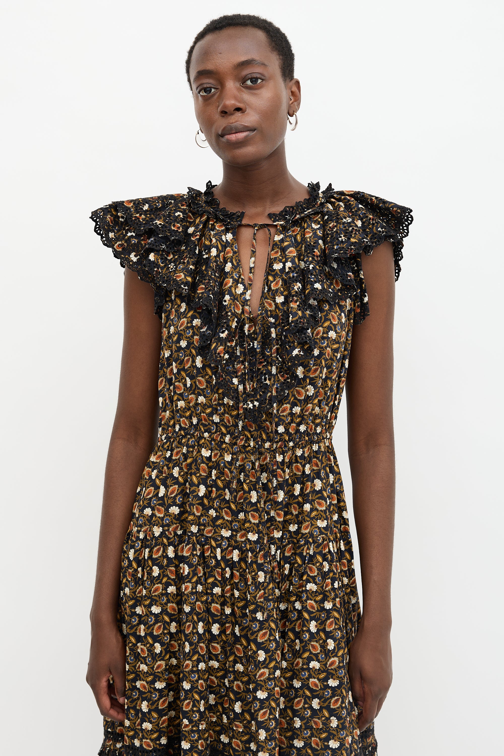 Pre-owned Ulla Johnson navy and multicolour floral printed Yvette dress featuring broderie anglaise trims, round neckline with keyhole tie chest, cap sleeves, elasticized drawstring waist, ruffles throughout, two inseam pockets, and a tiered skirt with scalloped hem.