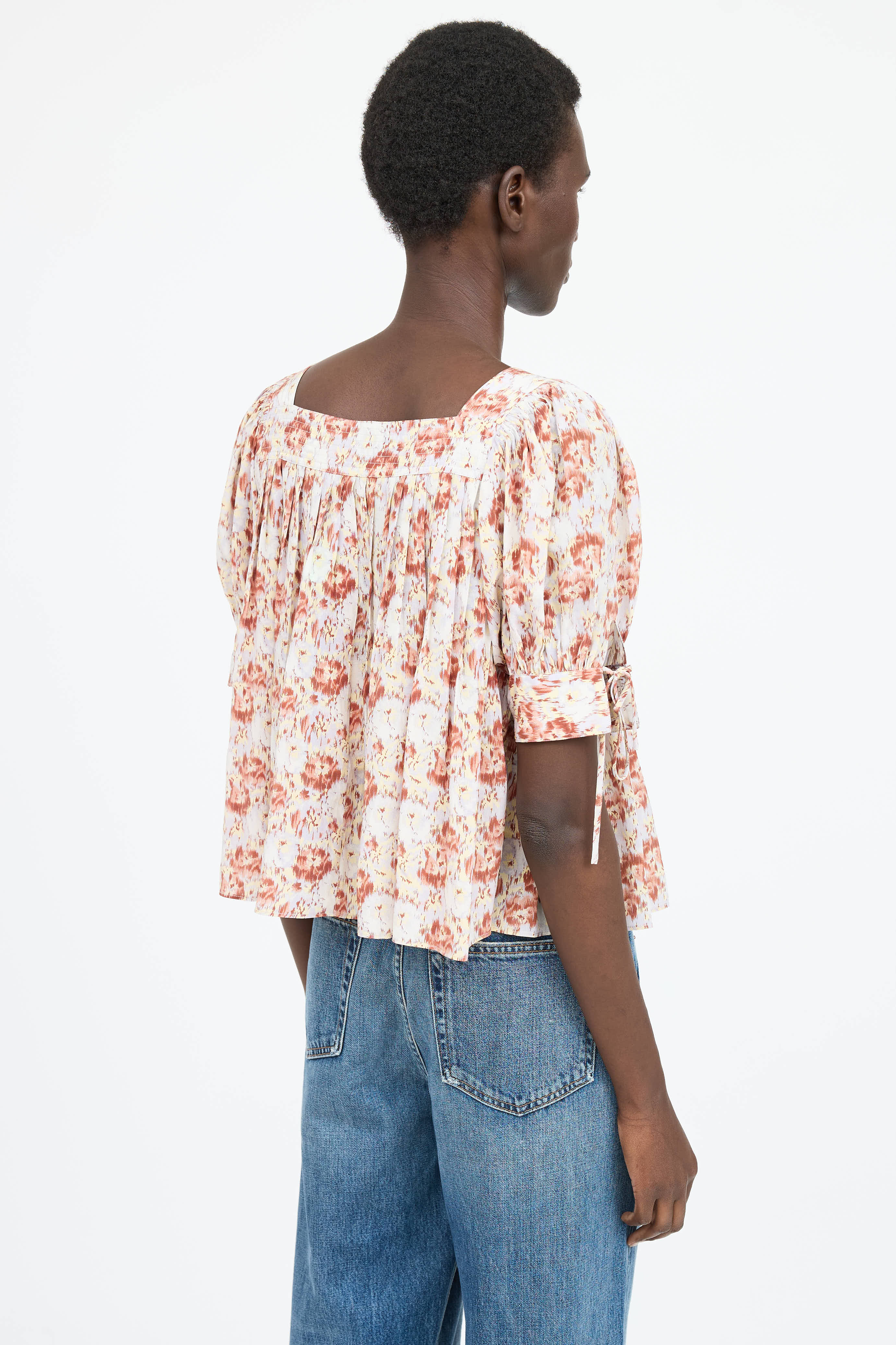 Pre-owned Ulla Johnson pink and multicolor Lorraine short sleeve blouse featuring square neckline, button front, pleated bodice, and tie at sleeves.
