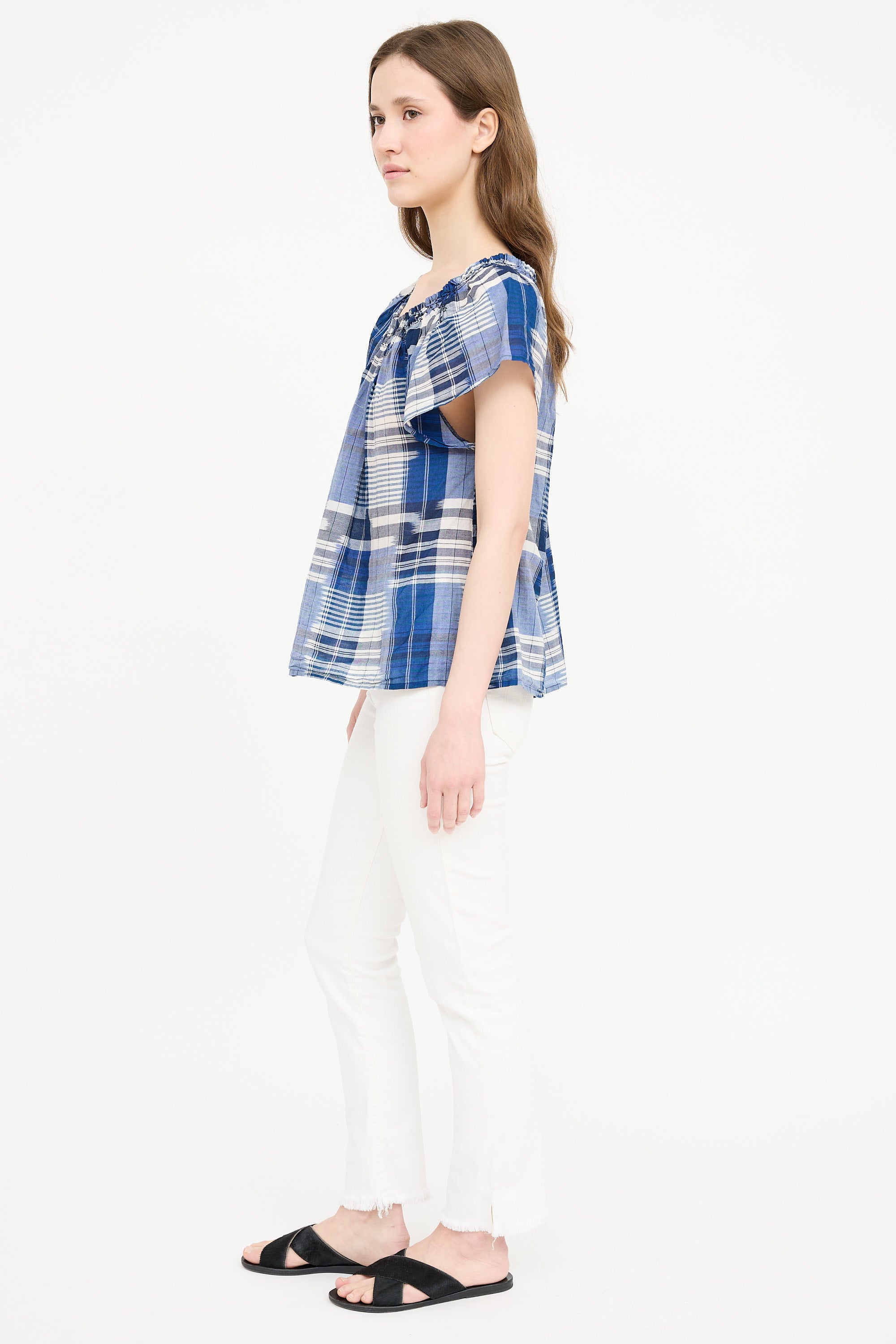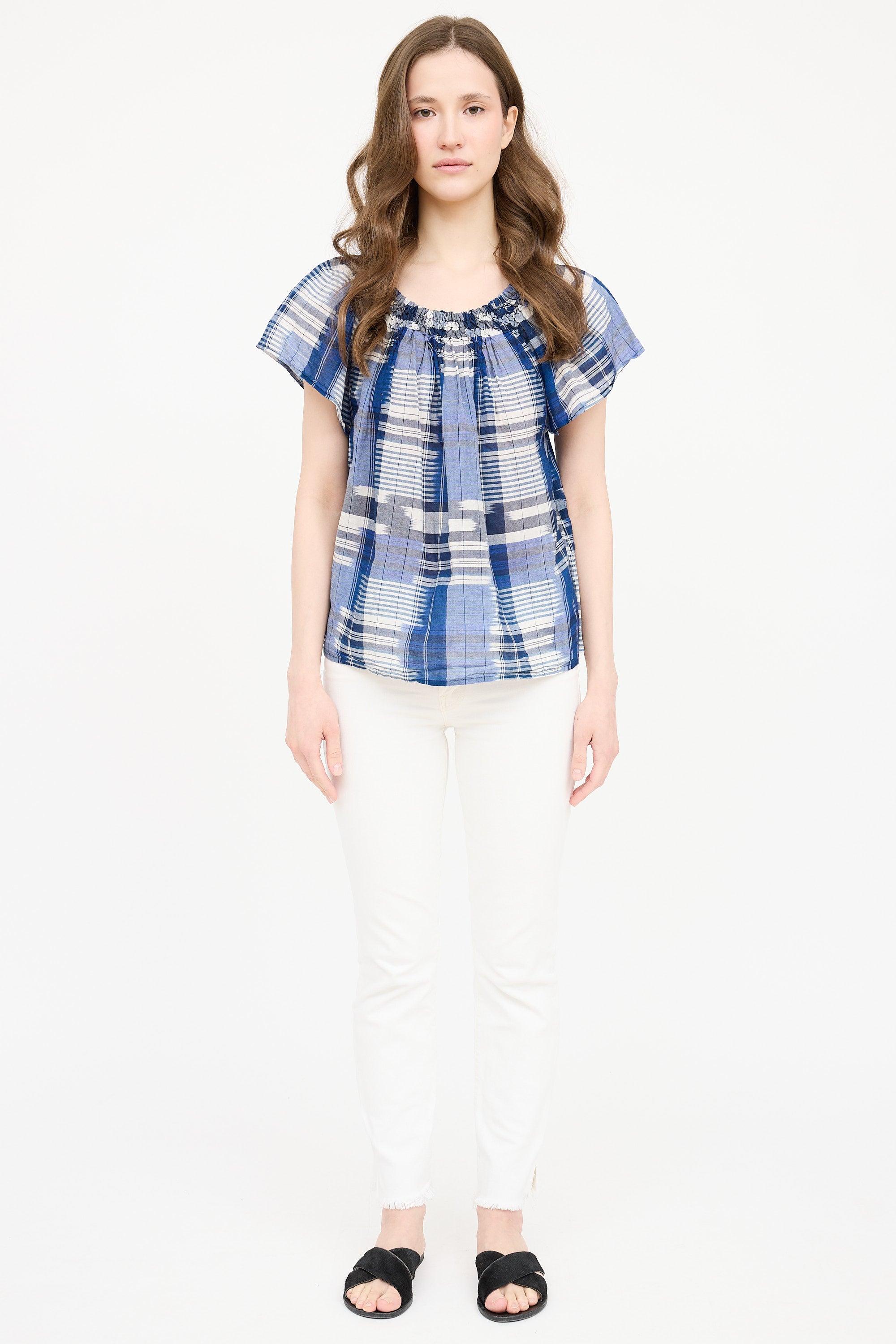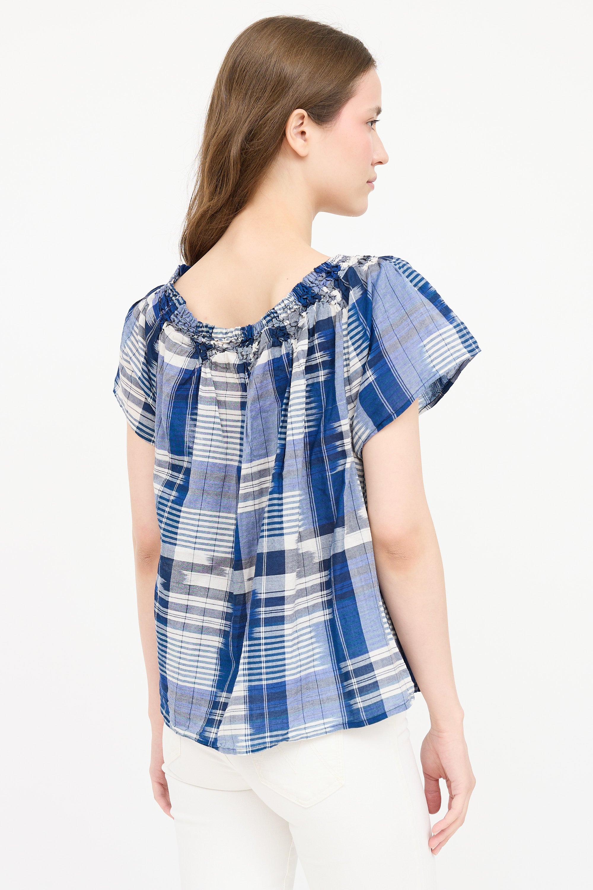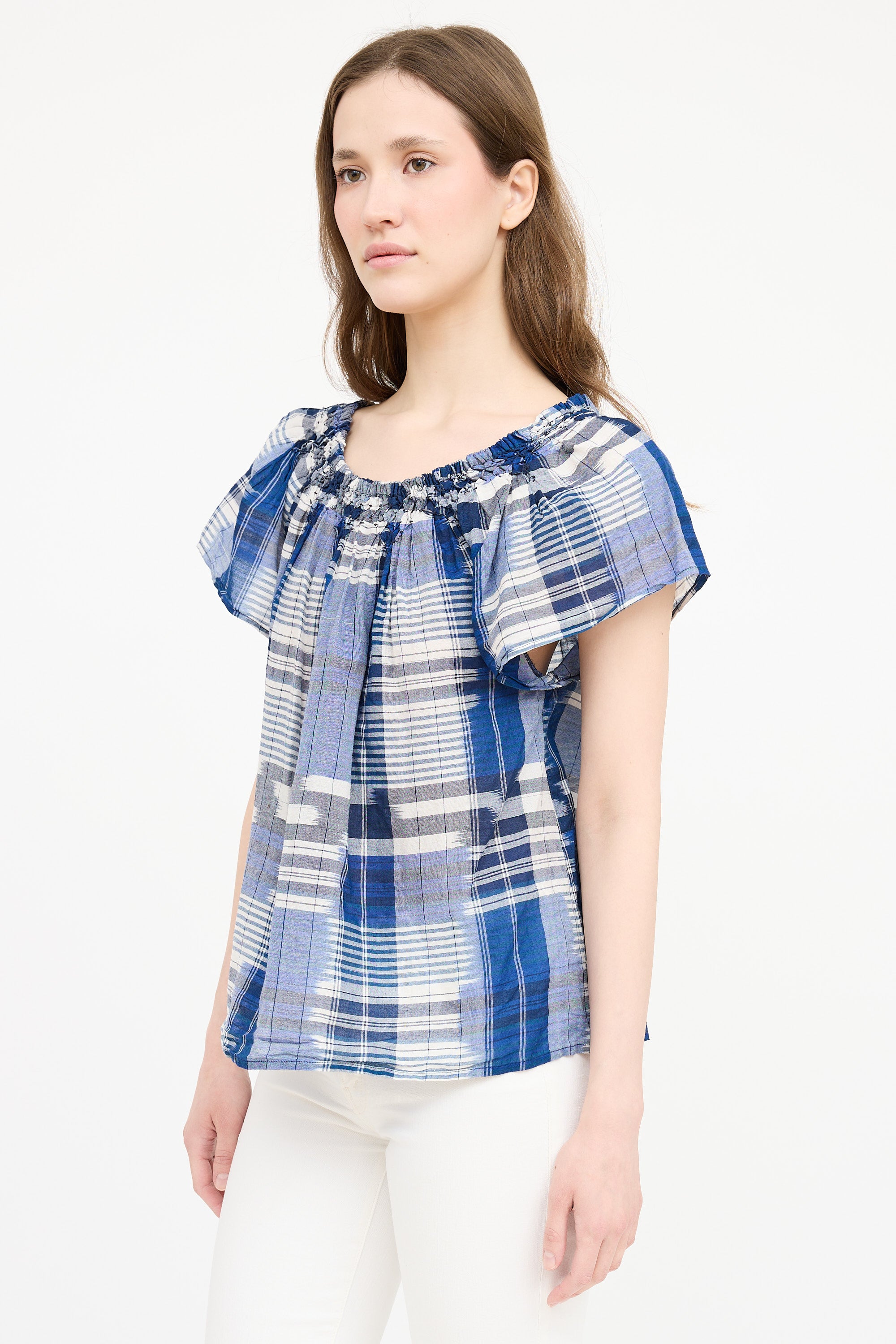 Pre-owned Ulla Johnson navy plaid short sleeve top featuring boat neckline with smocked trim and pleating at front and back.
