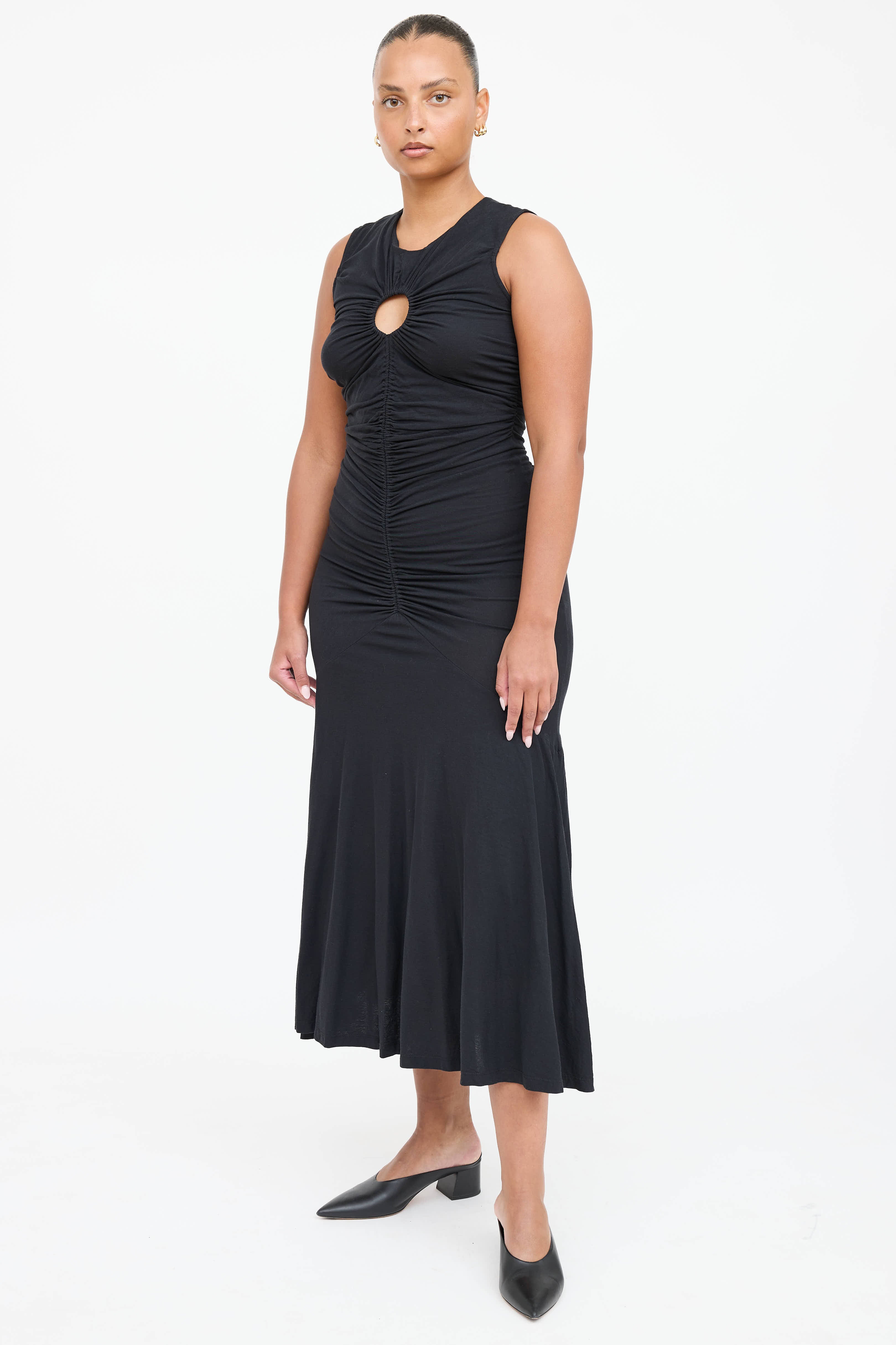 Pre-owned Ulla Johnson black dress featuring a round neckline, cut out at chest, sleeveless styling, gathered detailing, and zip at back with hook and eye closure.