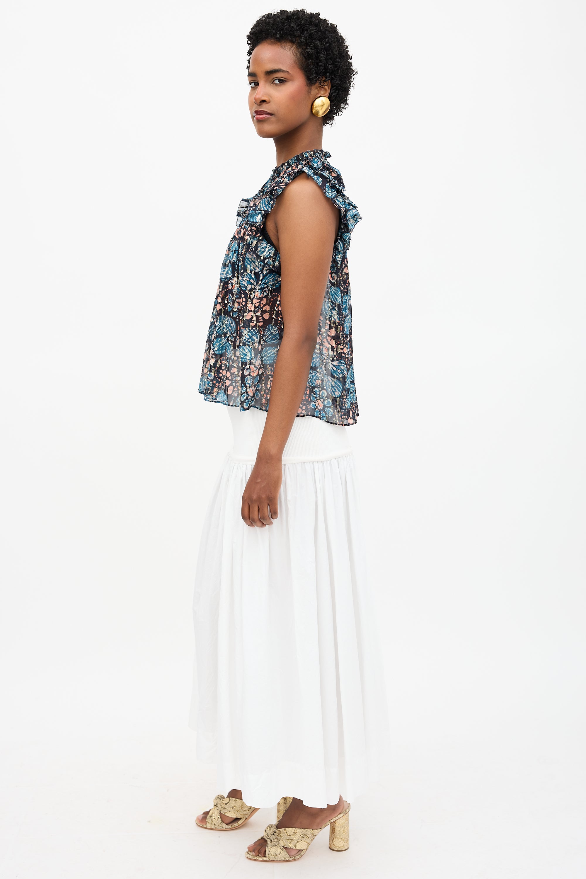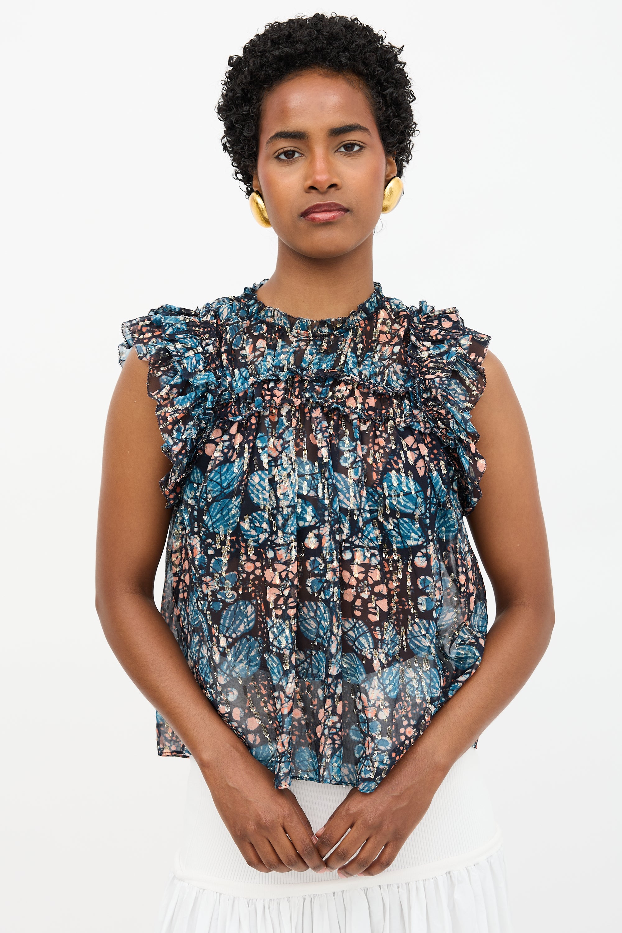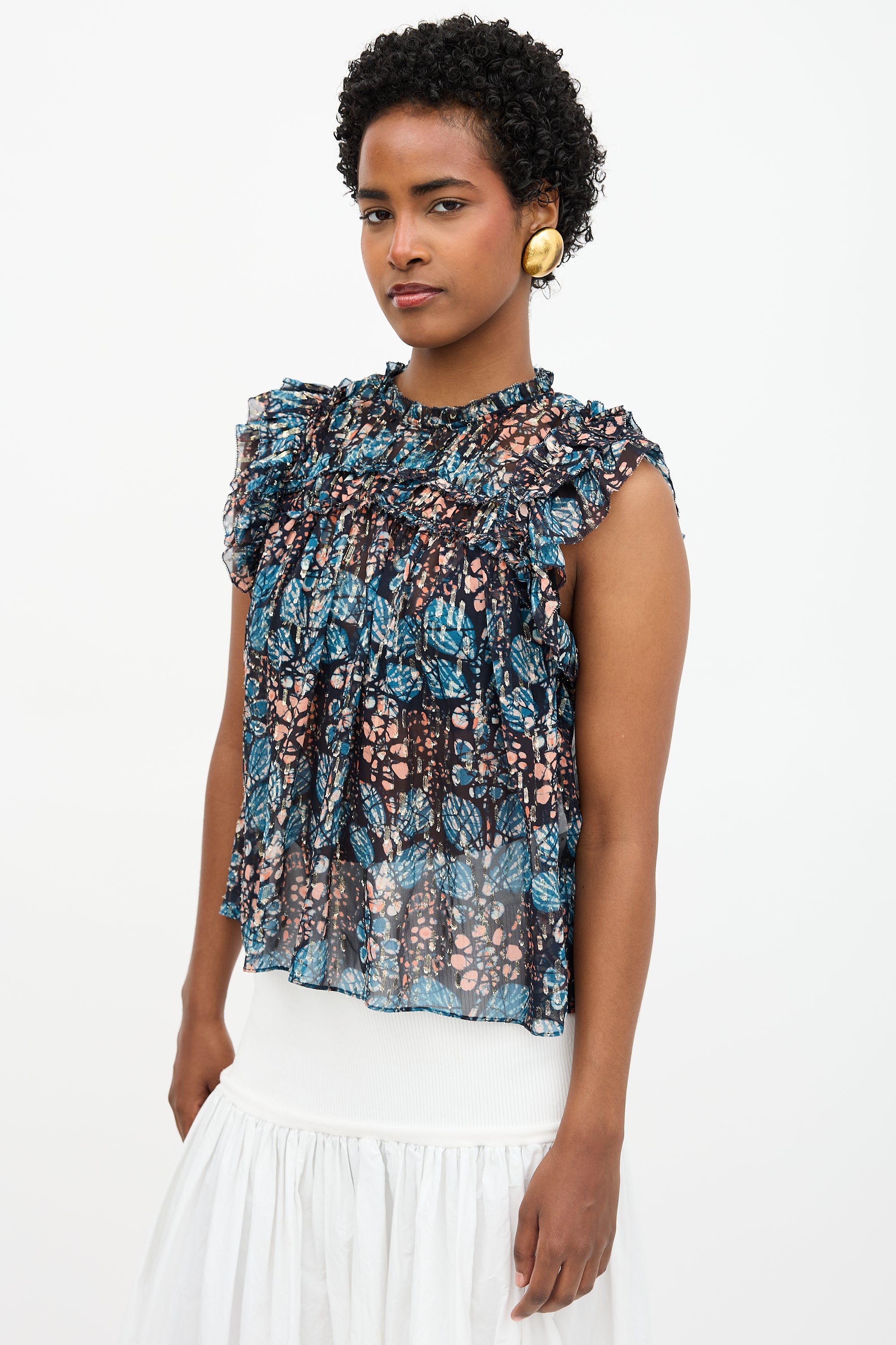 Pre-owned Ulla Johnson silk blend sheer top featuring multicolour and metallic floral print, pleated collar, ruffle trim, and cutout back collar with button closure.