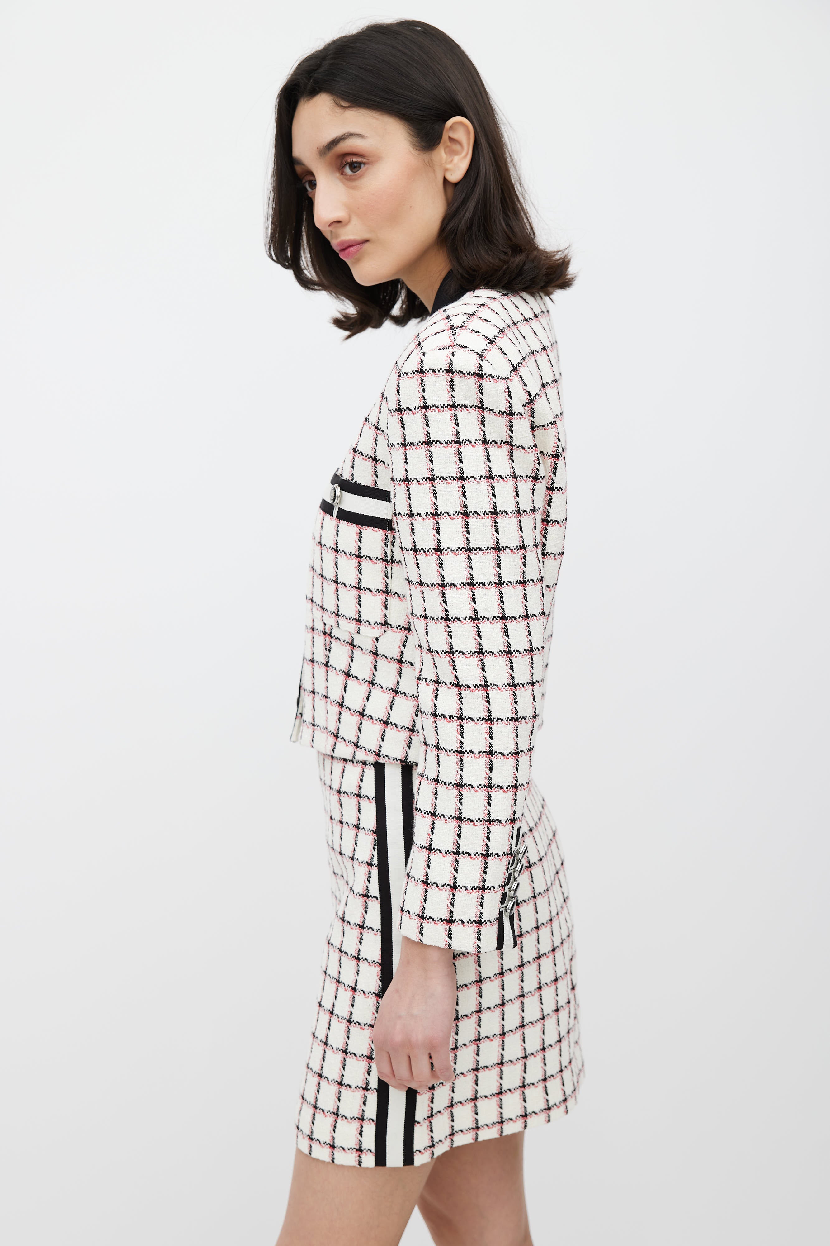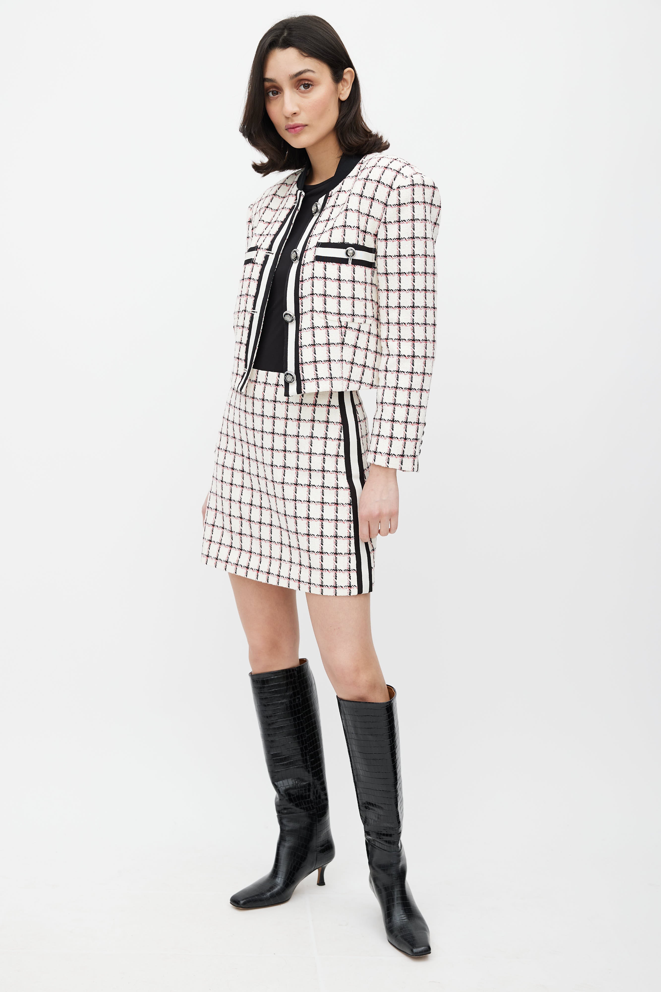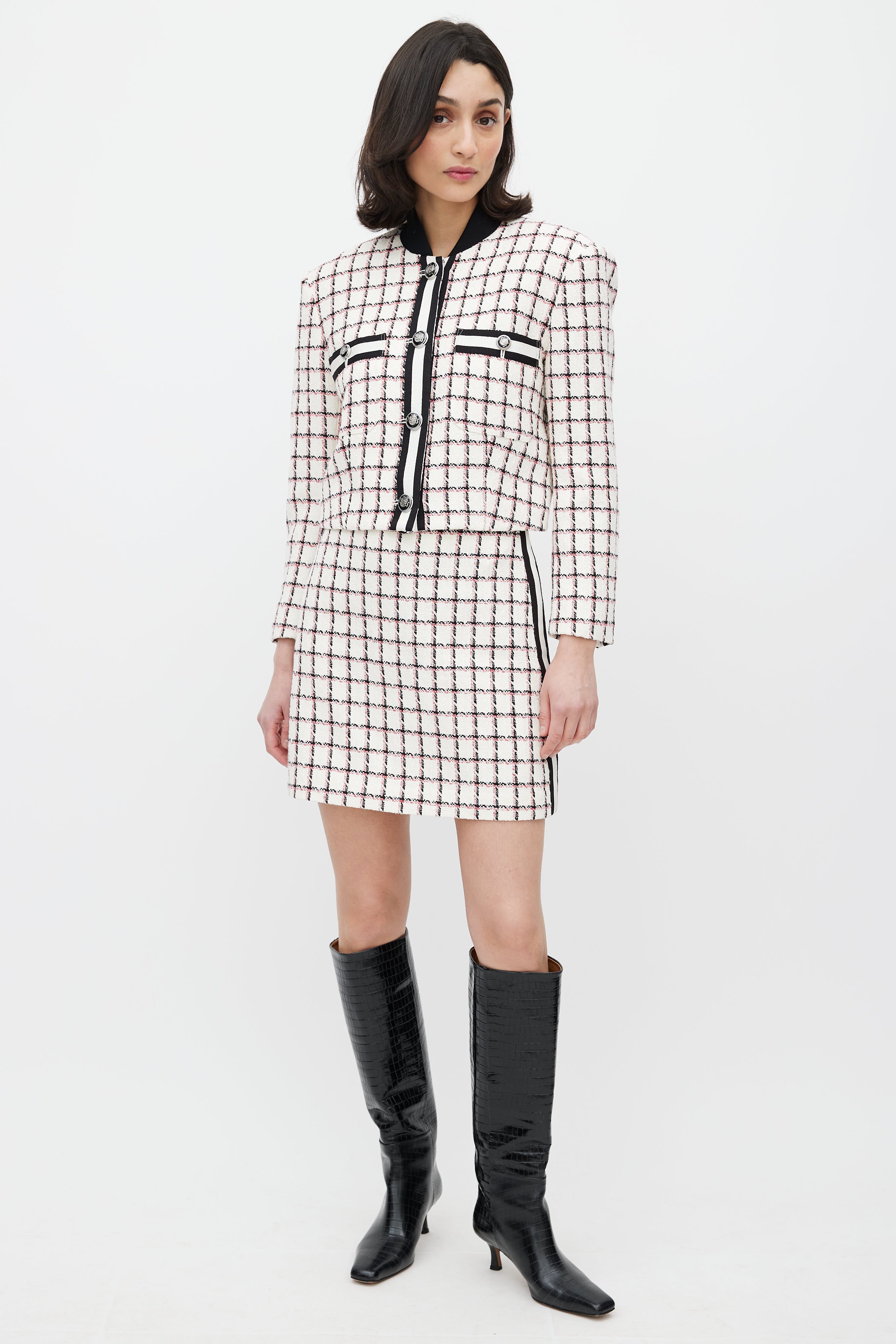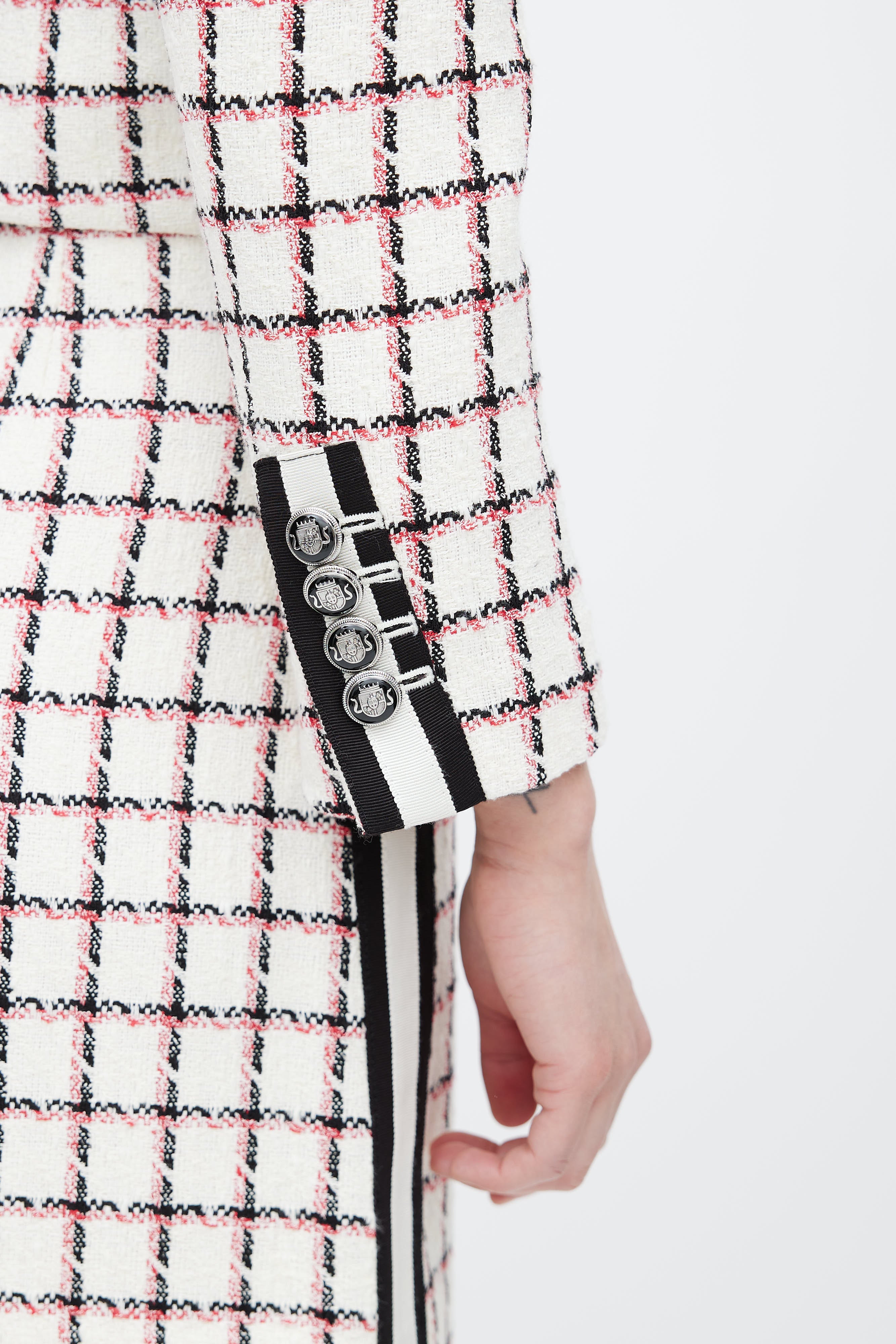 Pre-owned Veronica Beard white and red grid pattern co-ord set featuring a jacket with two front pockets, padded shoulders, ribbed knit collar, and black and white stripe ribbon trim with silver tone and black enamel buttons. front closure. Skirt features black and white side stripes and a concealed back zip closure. Jacket and skirt are lined.