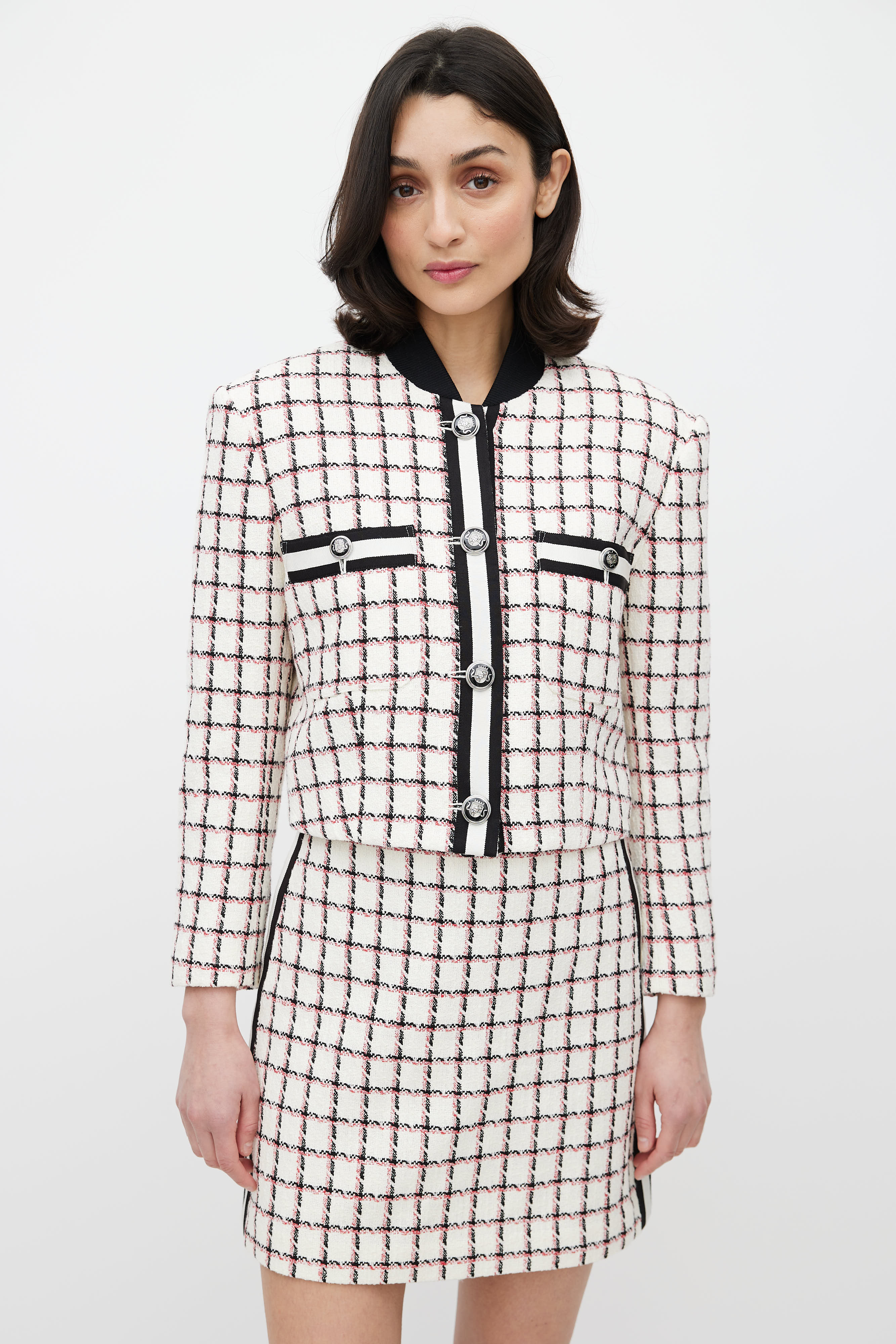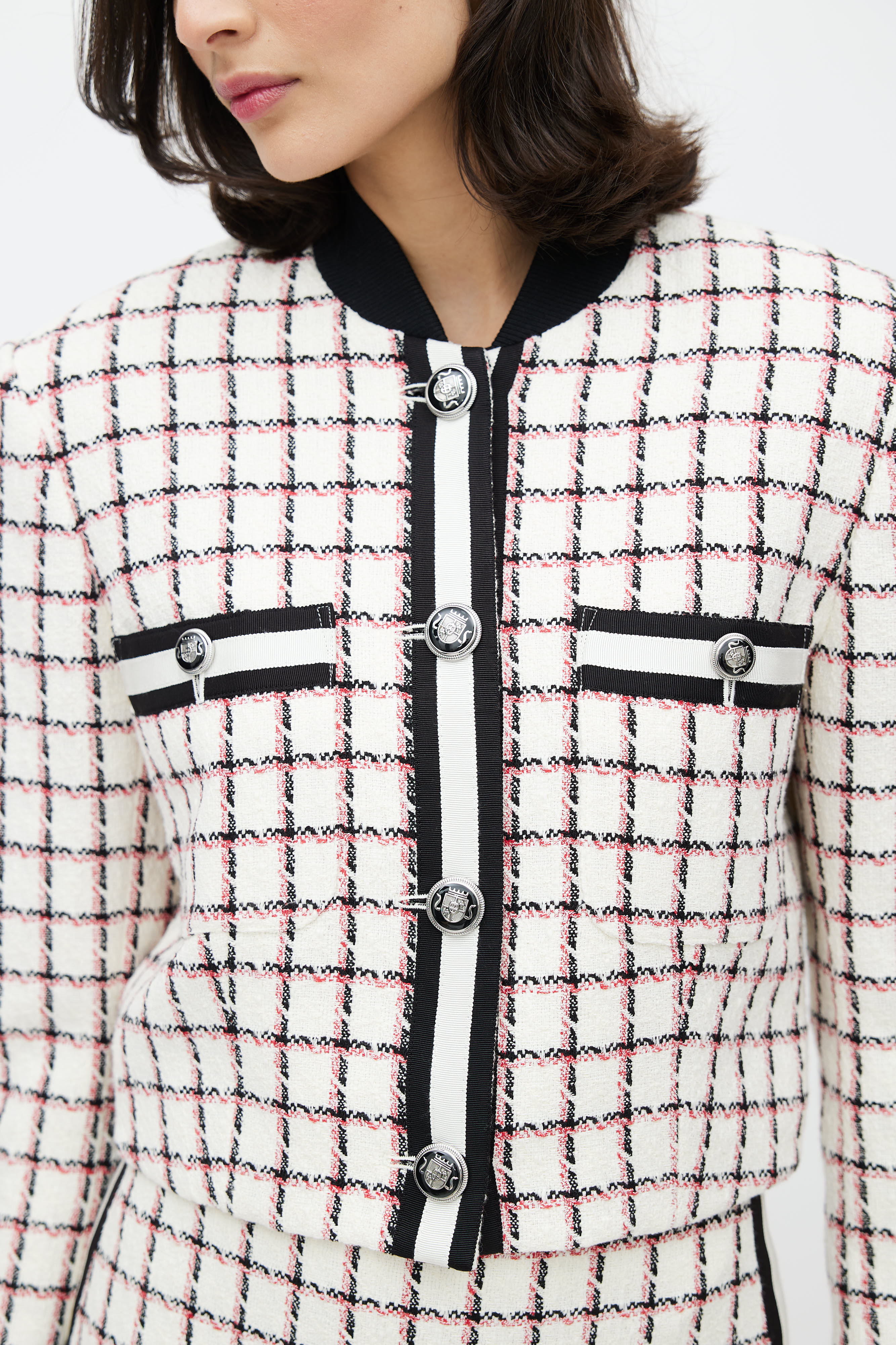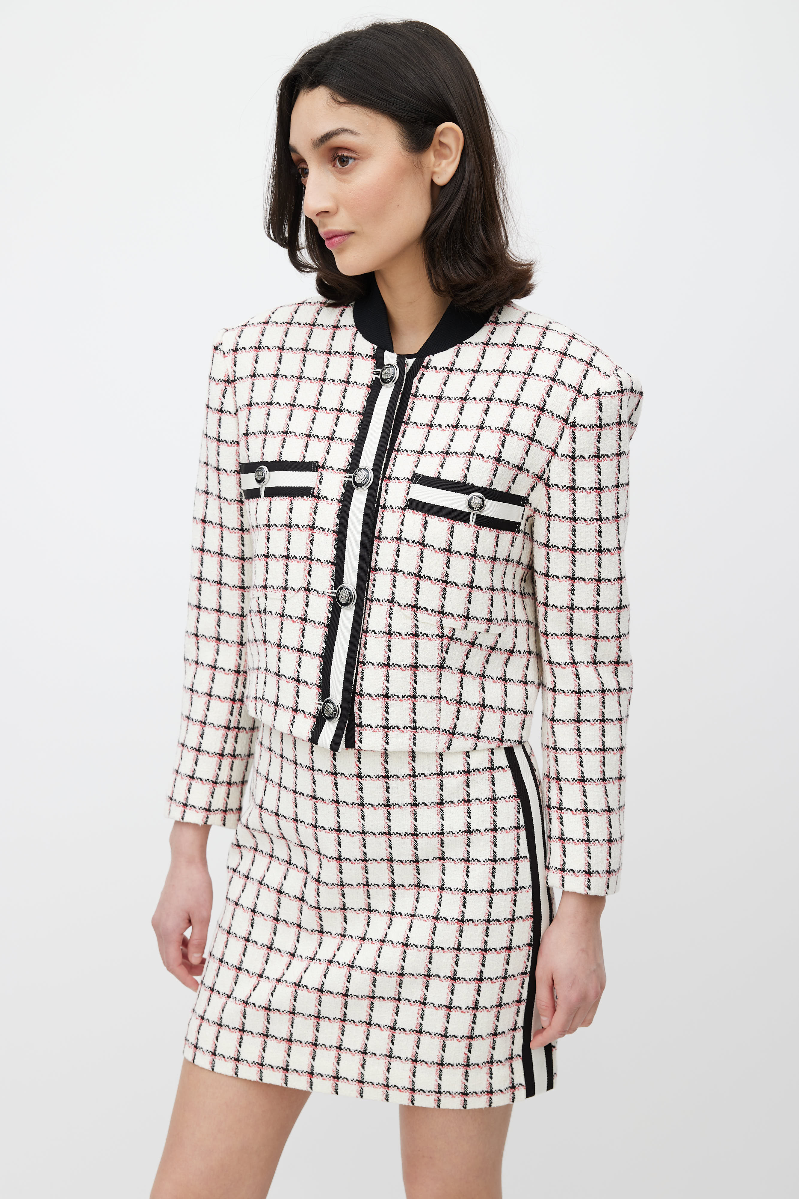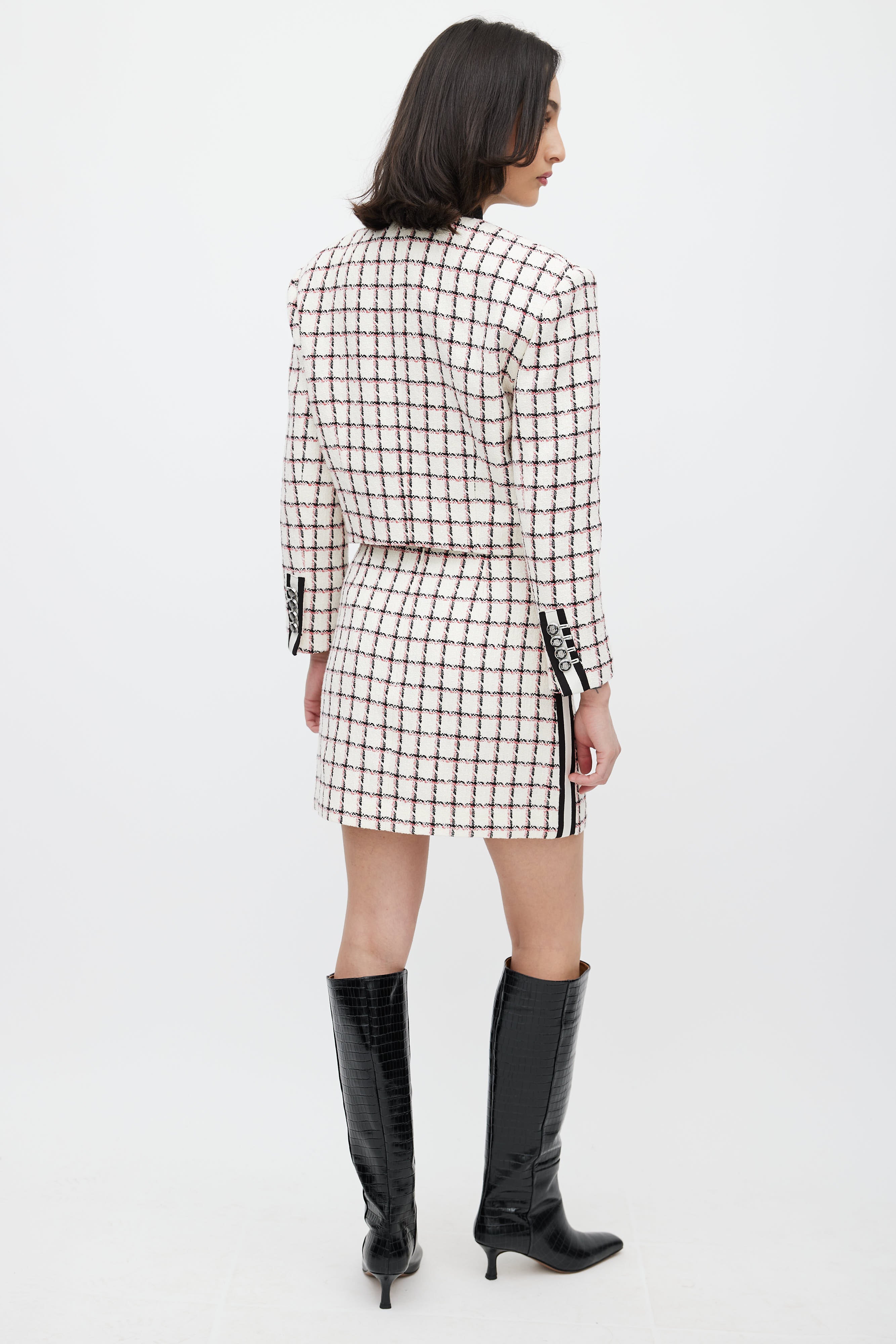Pre-owned Veronica Beard white and red grid pattern co-ord set featuring a jacket with two front pockets, padded shoulders, ribbed knit collar, and black and white stripe ribbon trim with silver tone and black enamel buttons. front closure. Skirt features black and white side stripes and a concealed back zip closure. Jacket and skirt are lined.