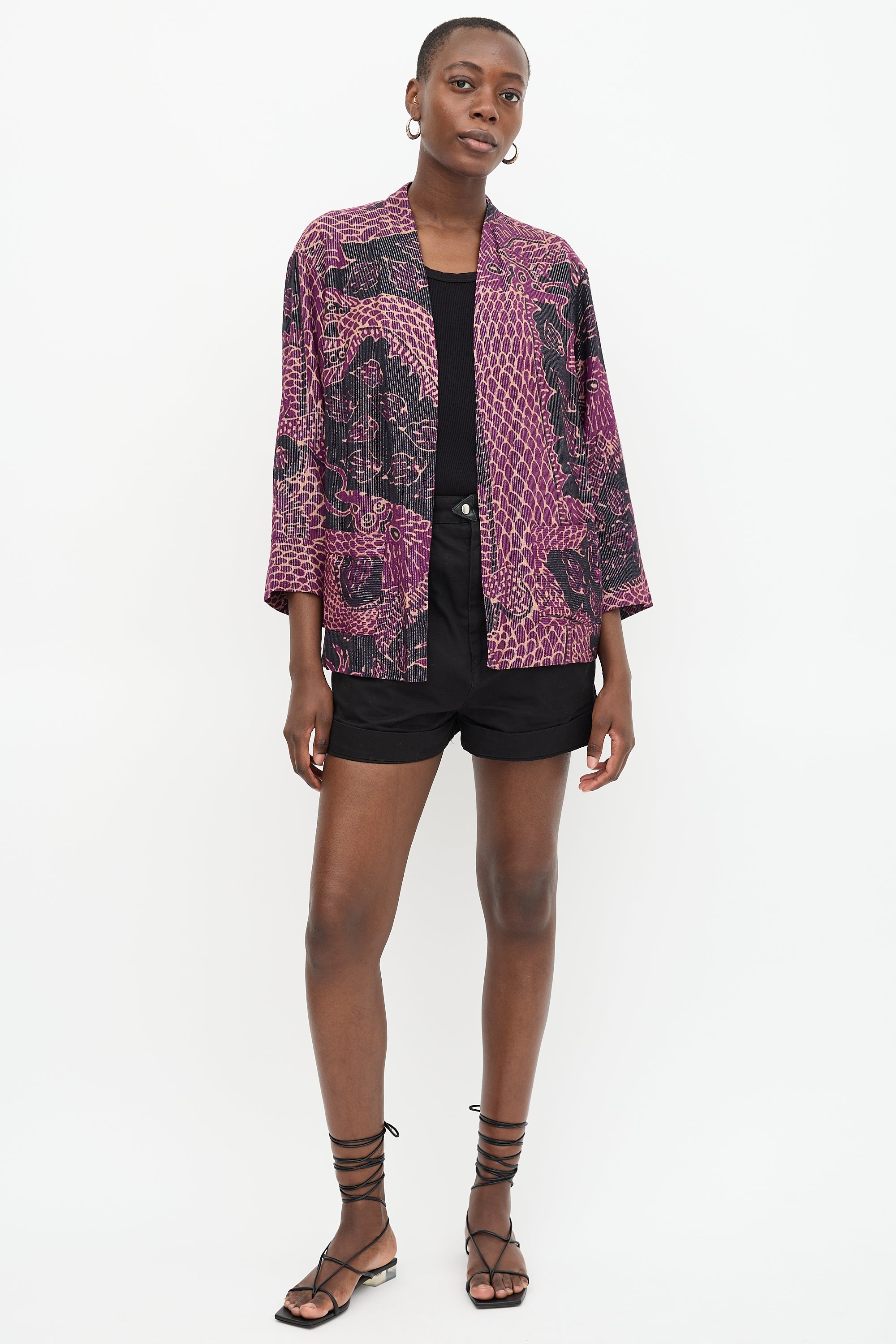 Pre-owned Warm purple and black cardigan featuring dragon print, metallic pinstripes, open front, and two patch pockets.