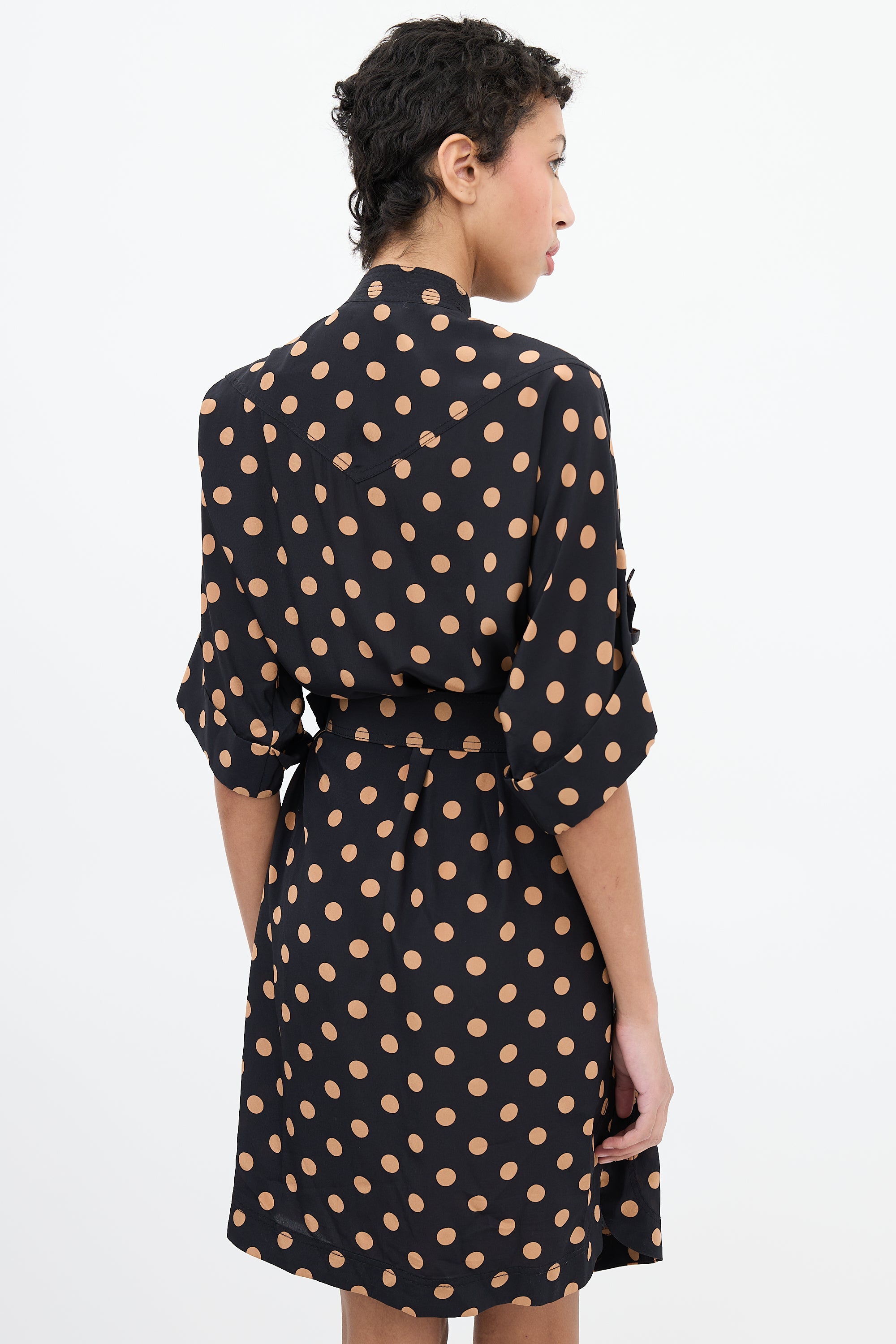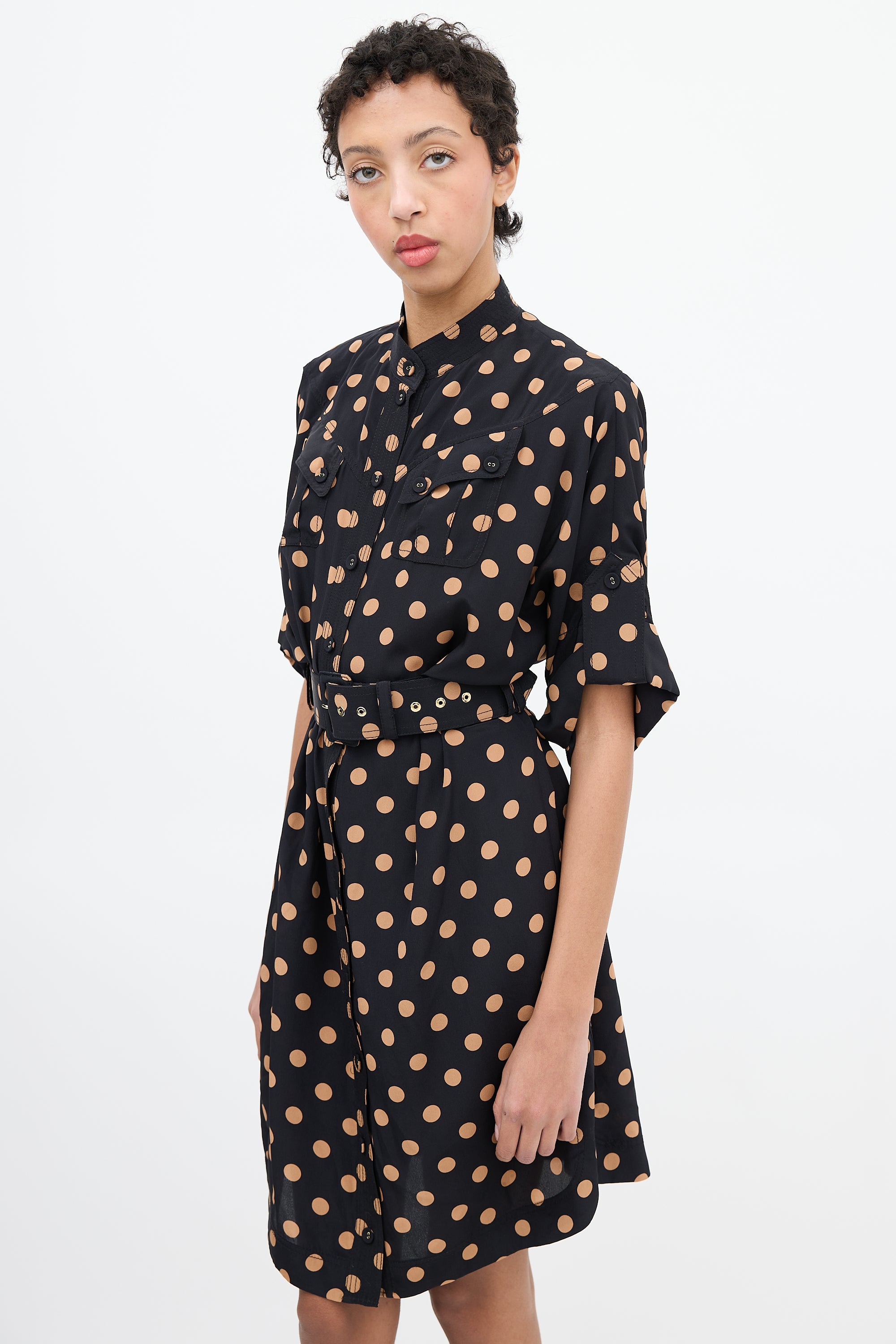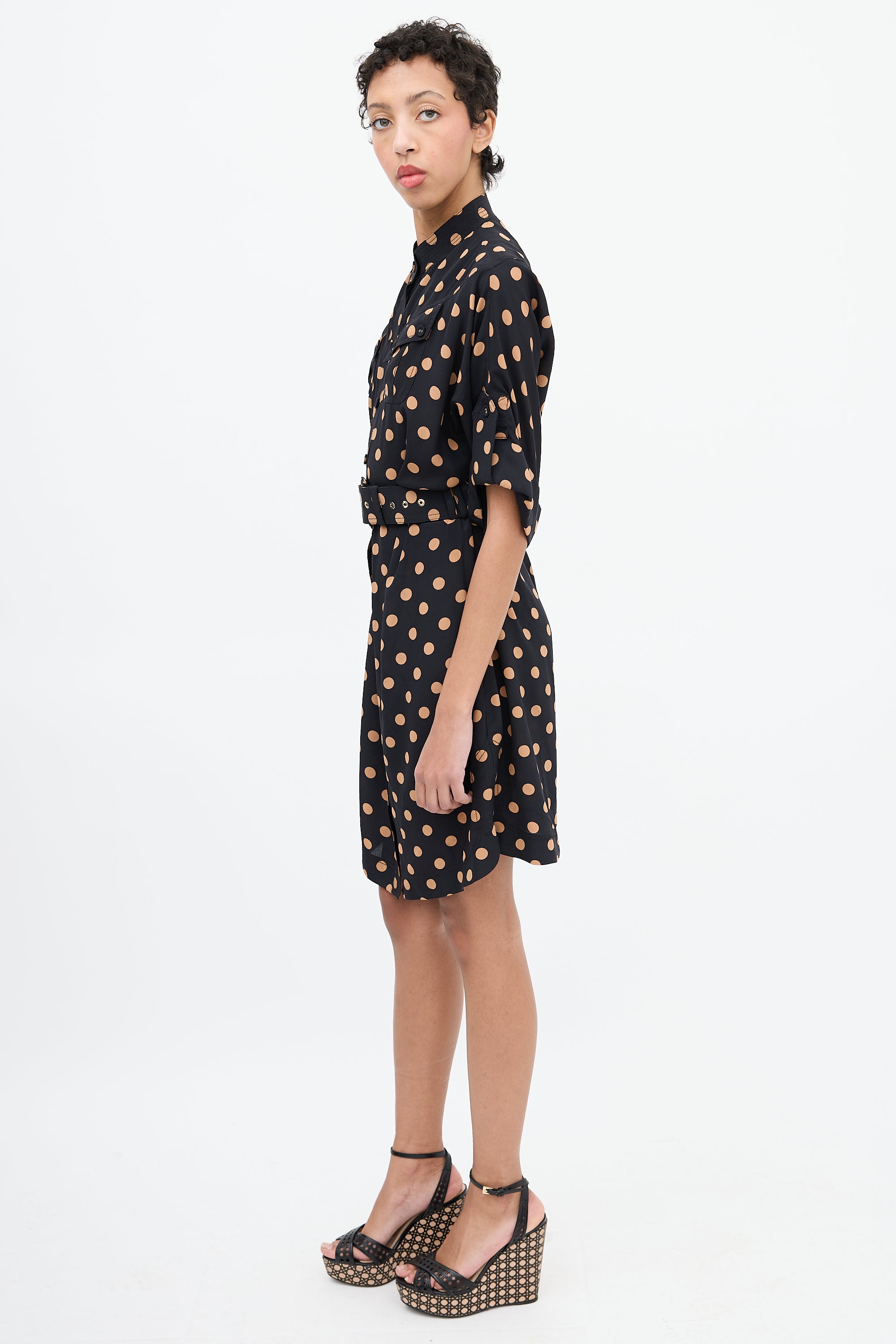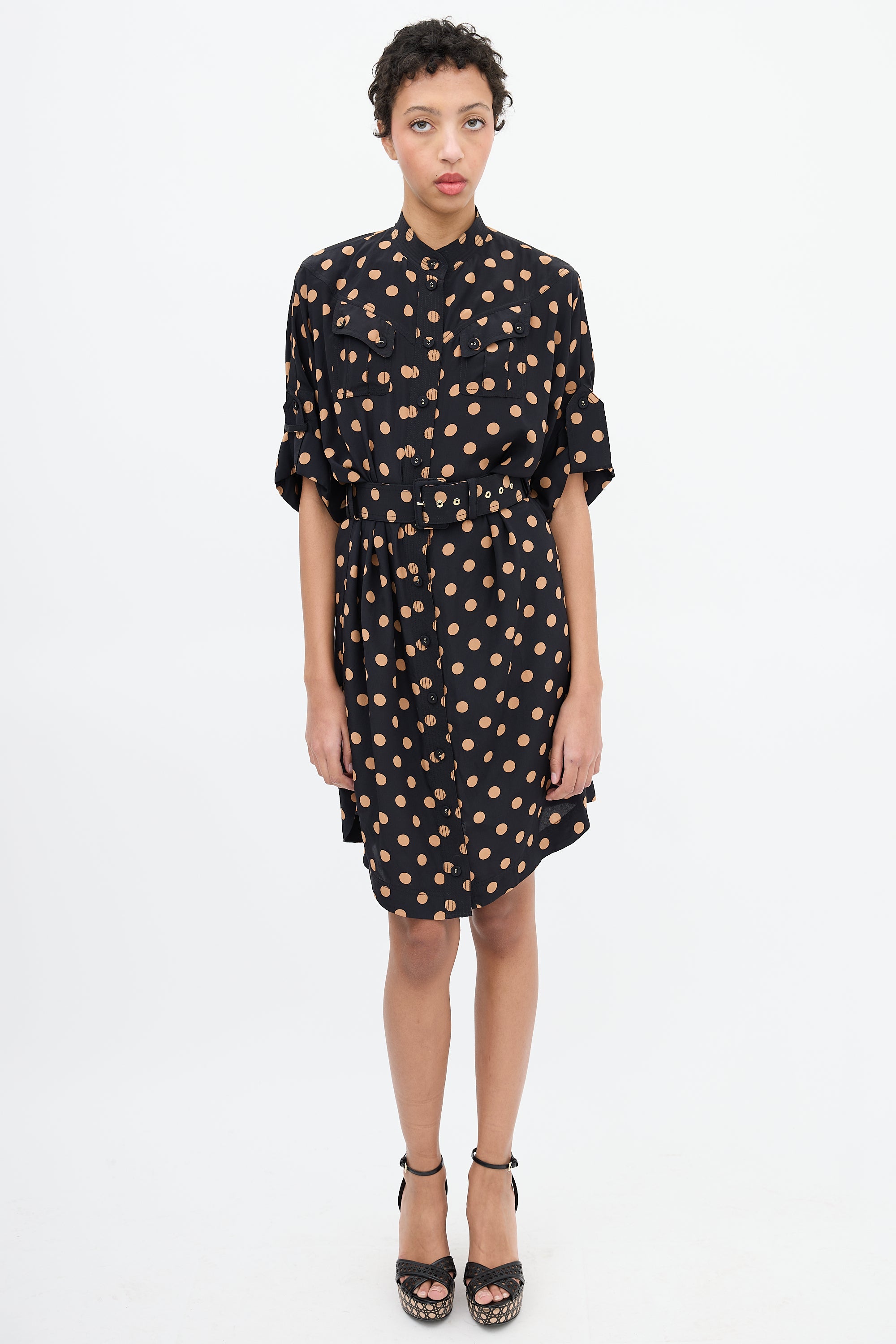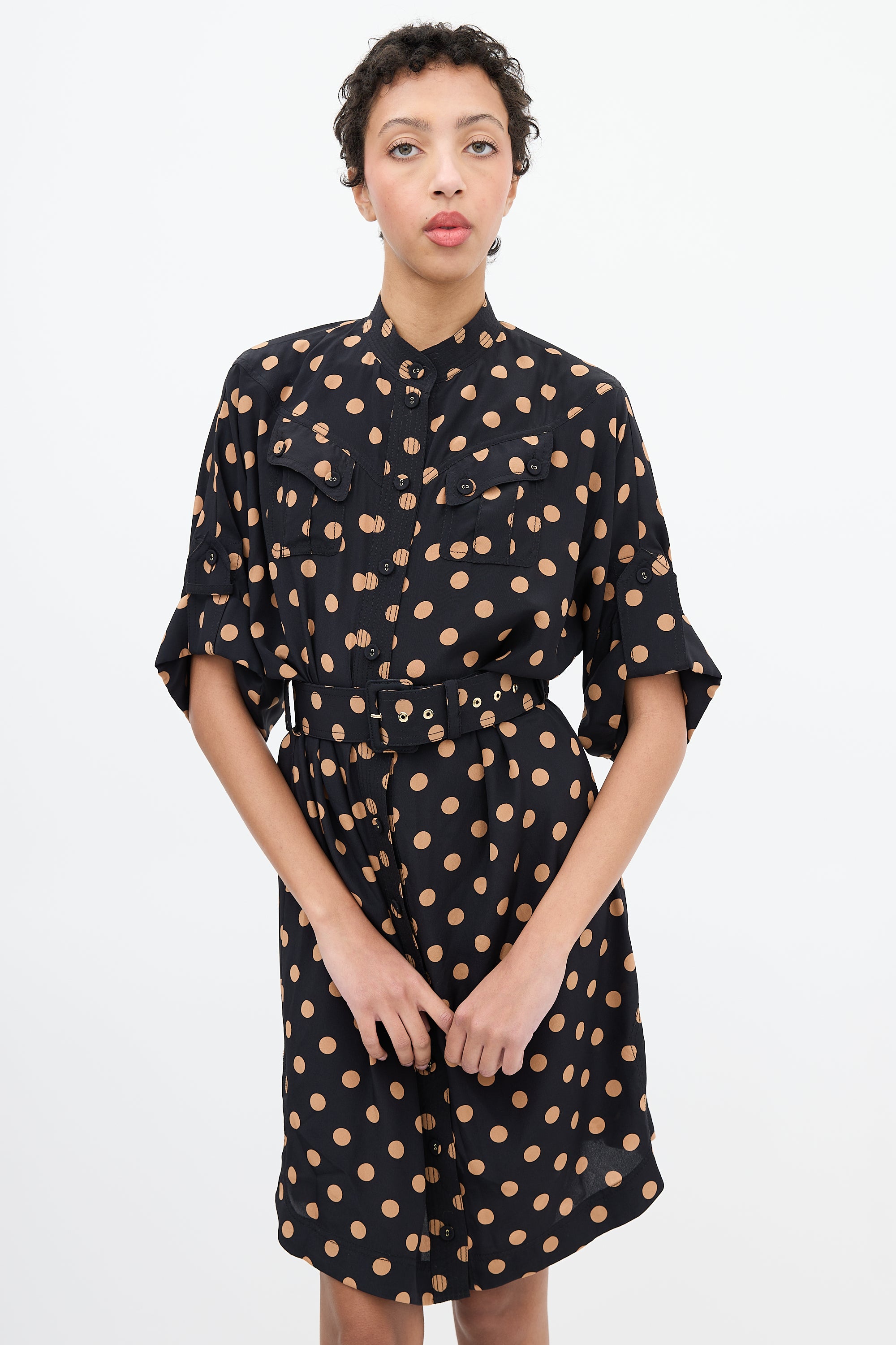 Pre-owned Zimmermann black and brown silk mini shirt dress featuring a polka dot print, stand collar, button front closure, two front pockets, waist belt, side vents, and strap detail at cuff.