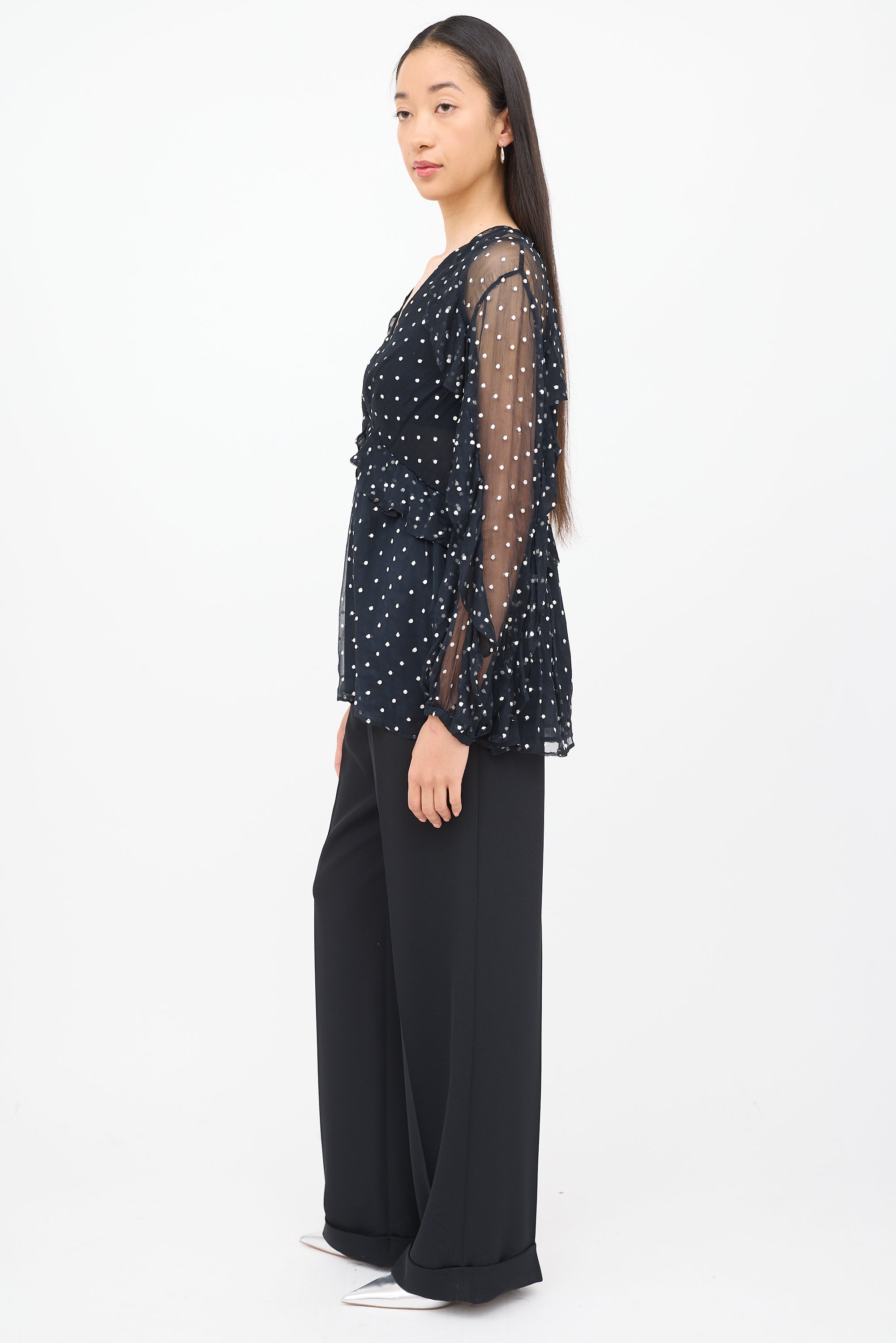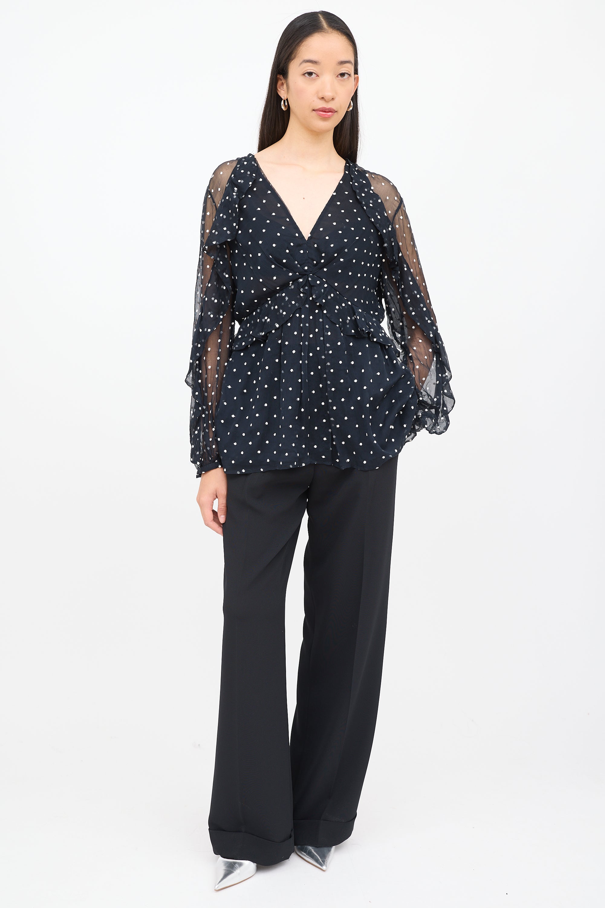Pre-owned Zimmermann black and white long sleeve blouse featuring V neck, polka dot print, ruffling, semi sheer sleeves and zip entry back.