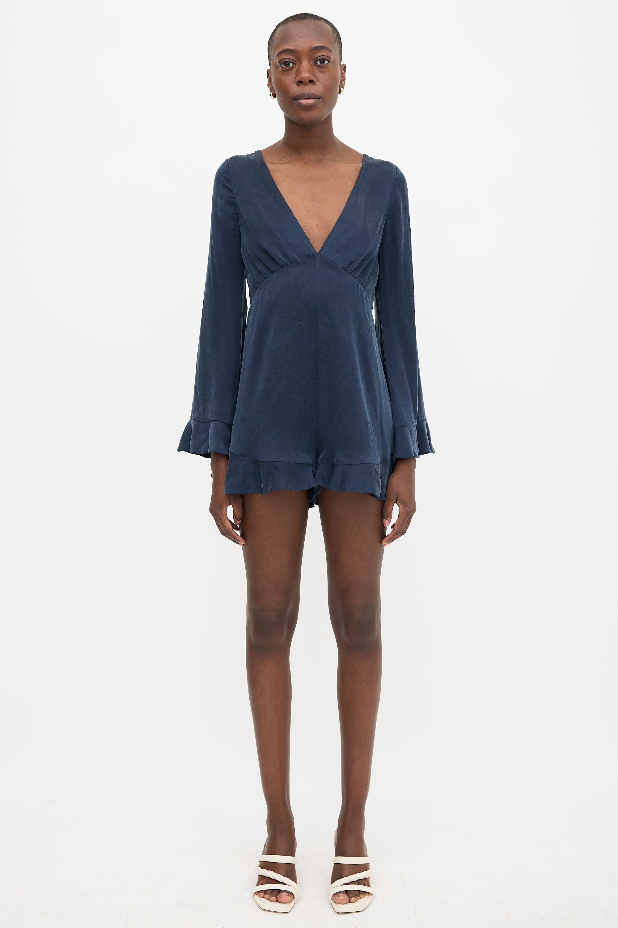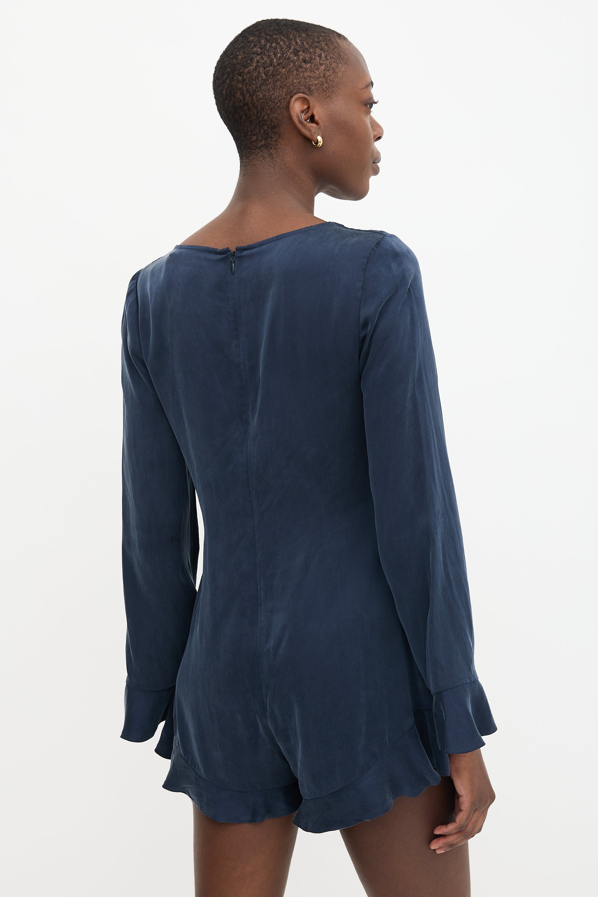 Pre-owned Zimmermann navy silk romper featuring a ruffled tim, V-neckline, back zip closure, and long sleeves.