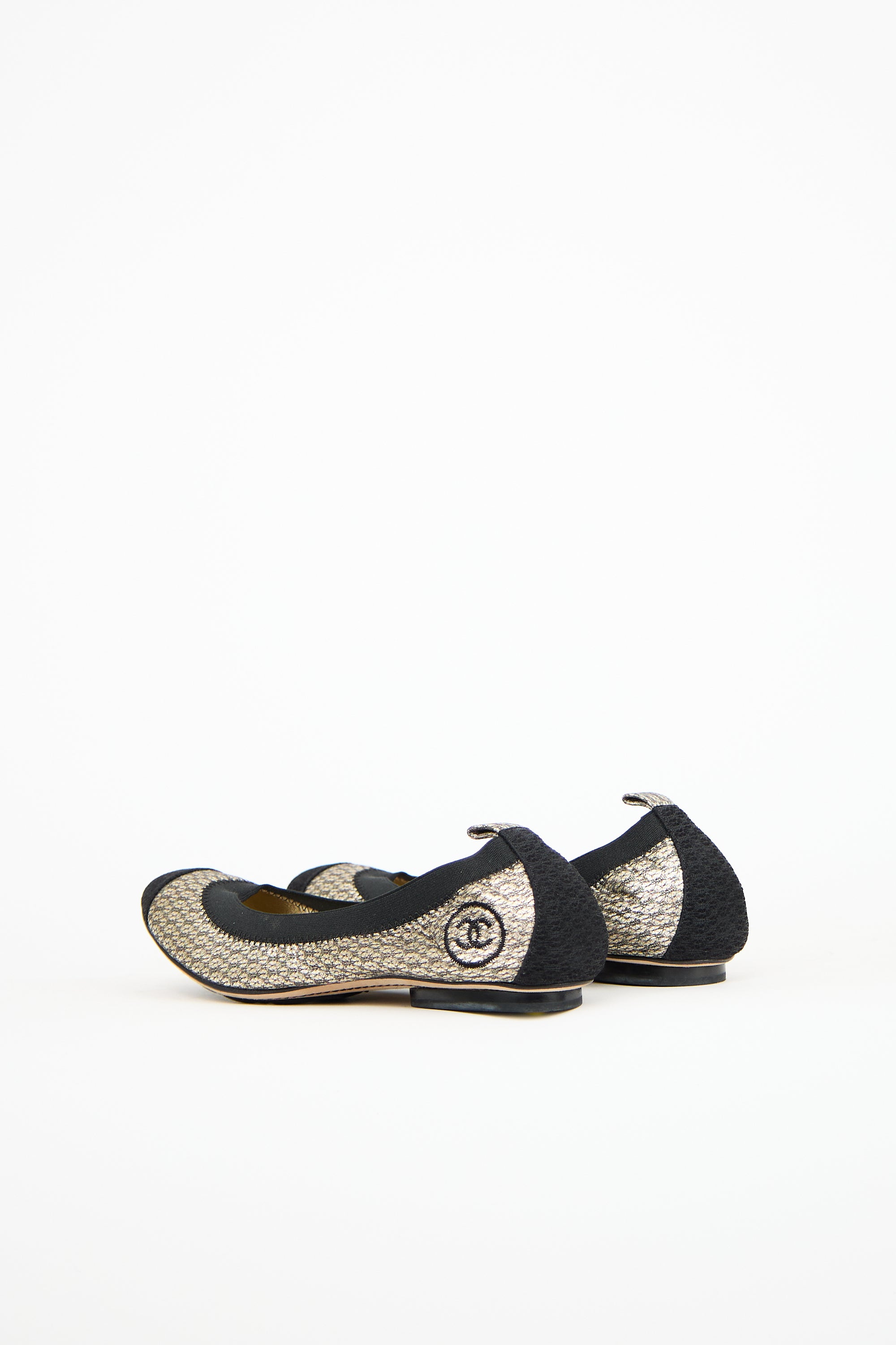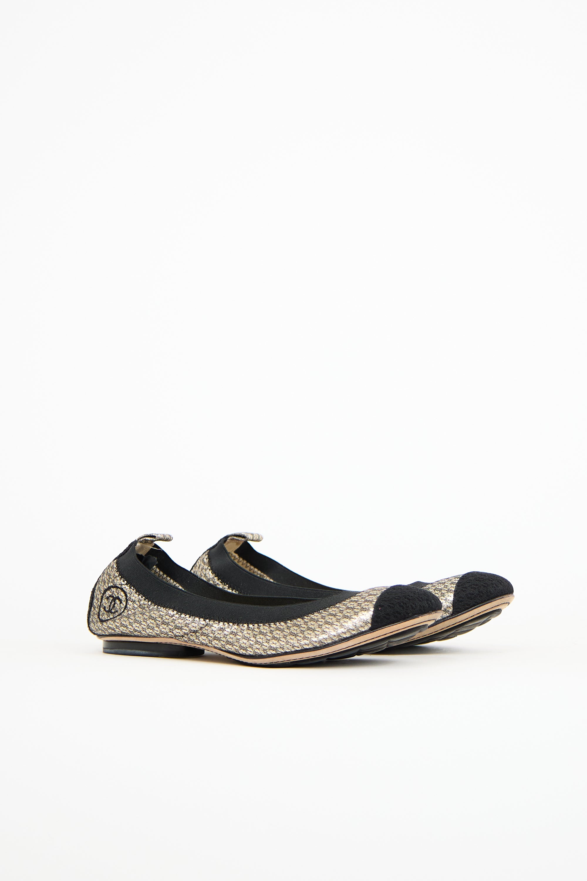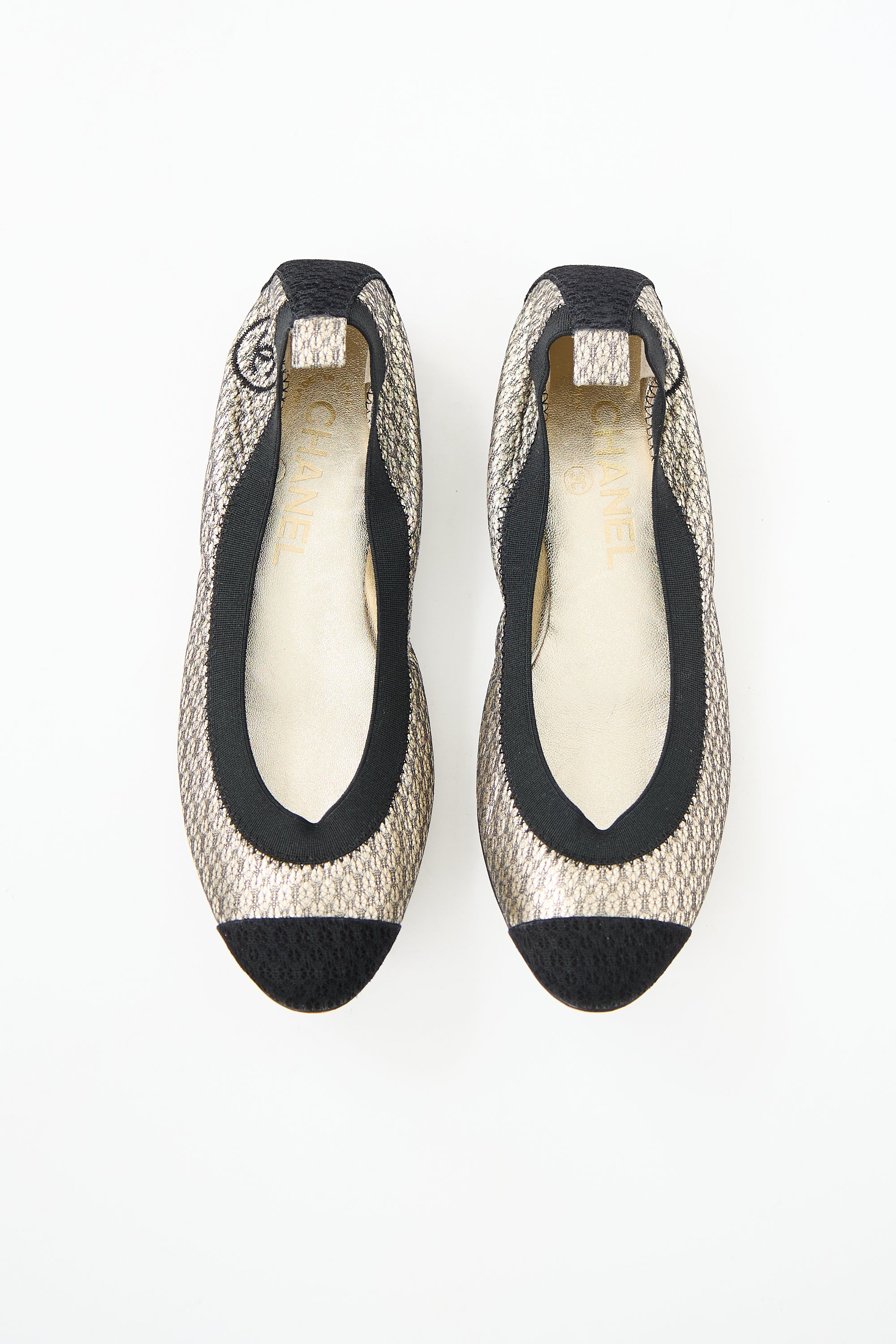 Pre-owned Chanel gold leather CC ballet flat featuring a black capped almond toe, black elasticized top line, embroidered interlocking CC logo at heel counter, and slip on entry. Comes with original box and dust bag.