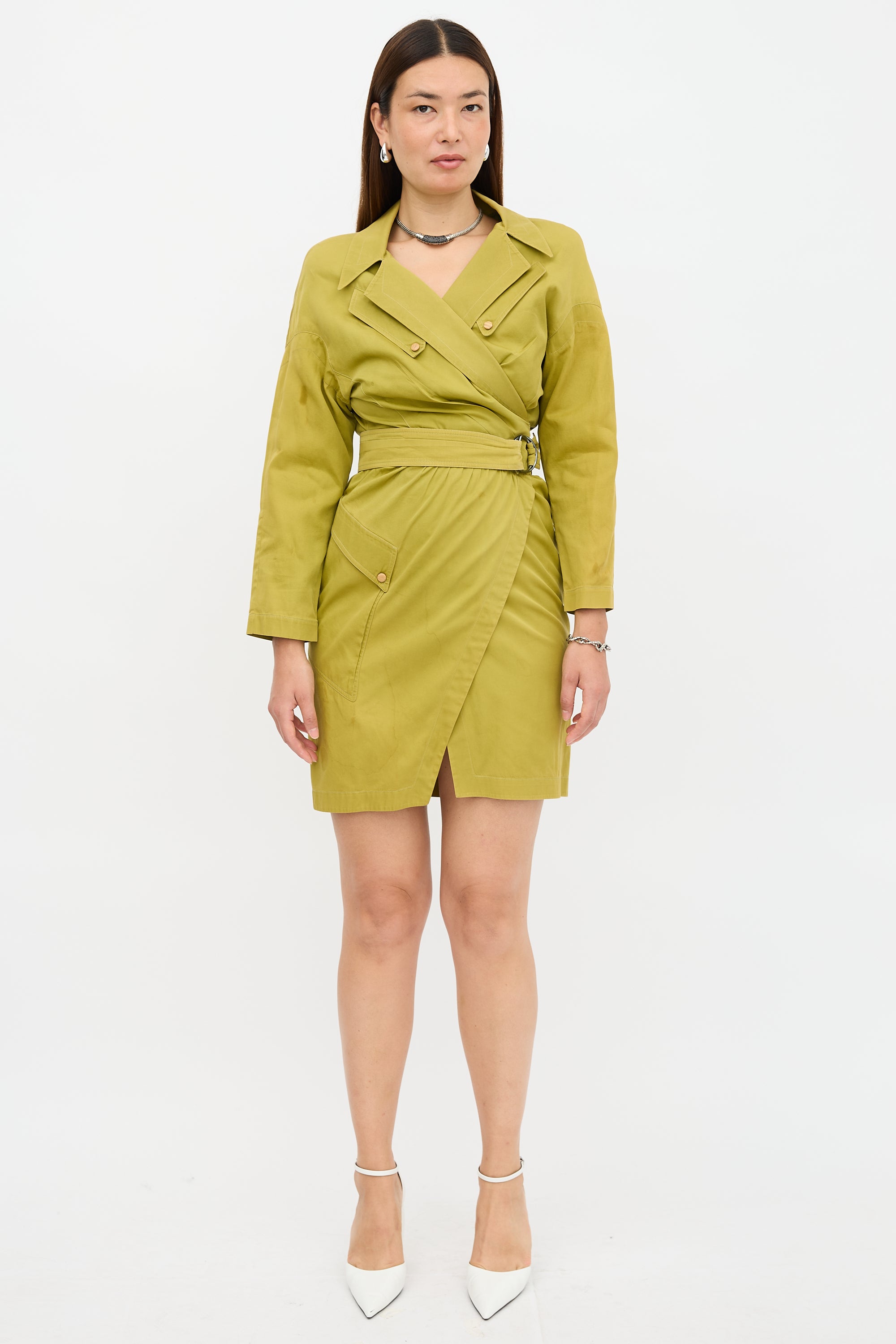 Pre-owned Thierry Mugler vintage green trench dress featuring notched lapels, padded shoulders, decorative welt pockets at chest, wrap front closure with adjustable belt, and flap pockets. Unlined.
