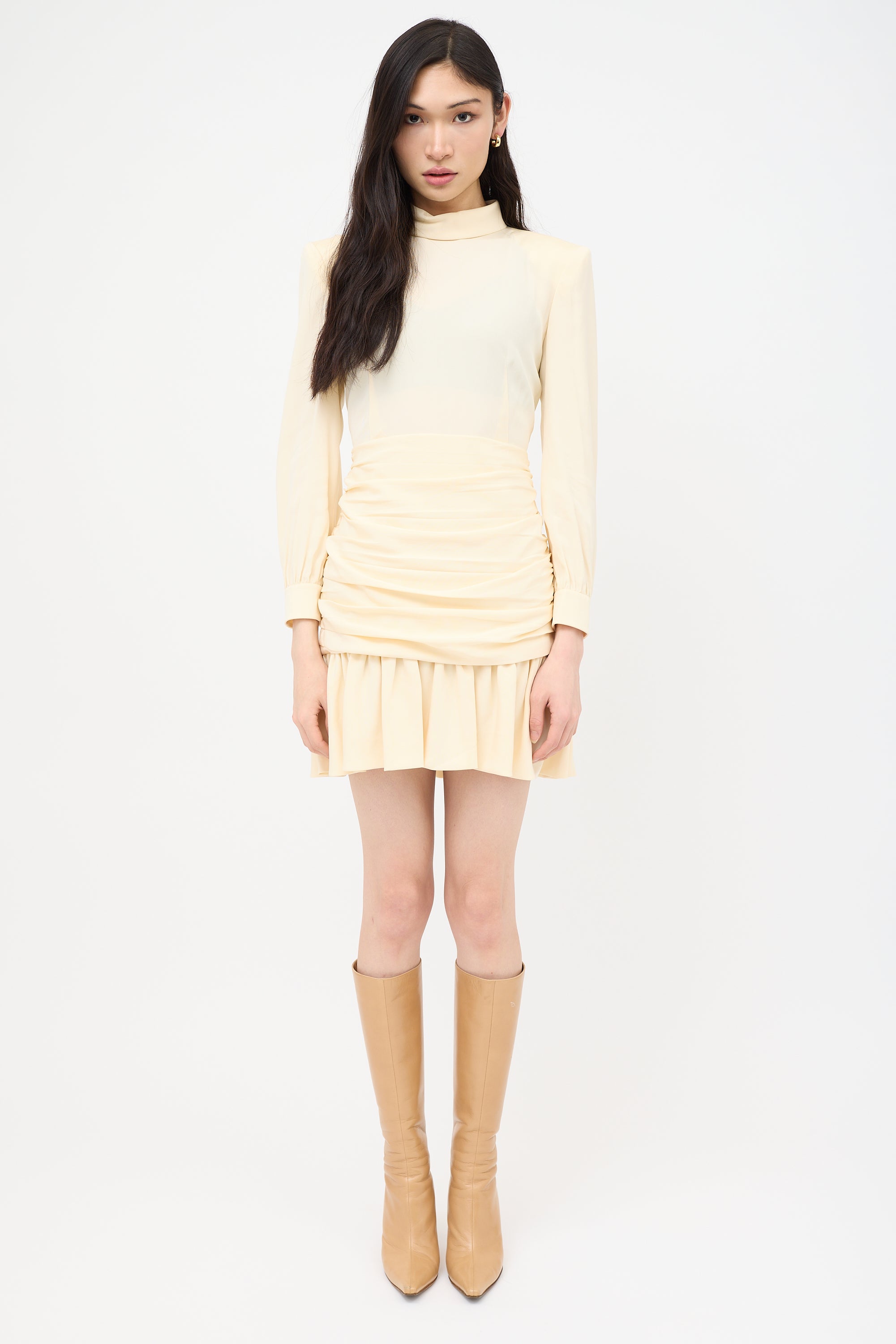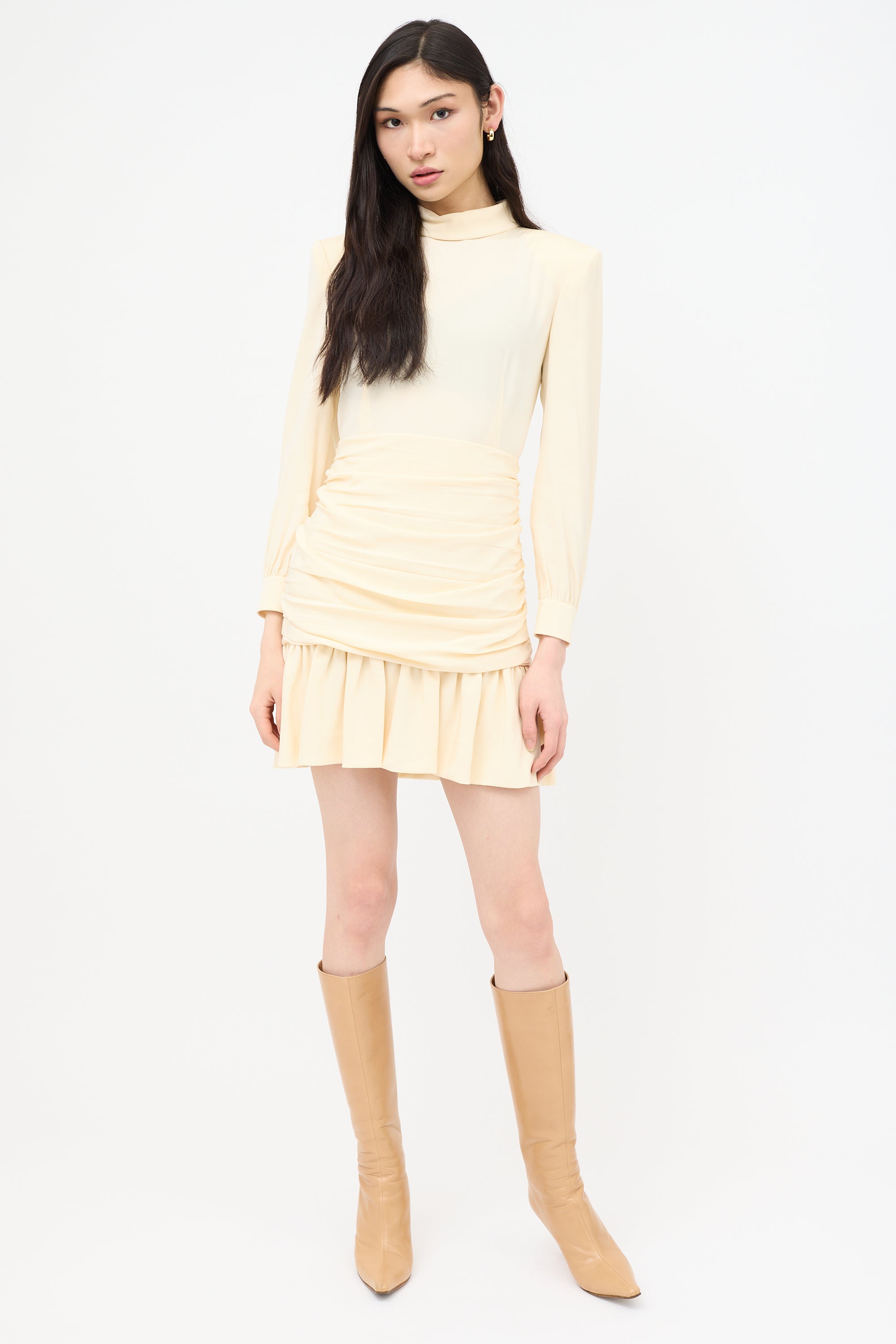 Gucci Resort 2023 cream silk mini dress featuring a mock neck, back zip closure, padded shoulders, darts under bust, ruched waistband with ruffled hem, and buttoned cuffs. Lined. Alessandro Michele era design.