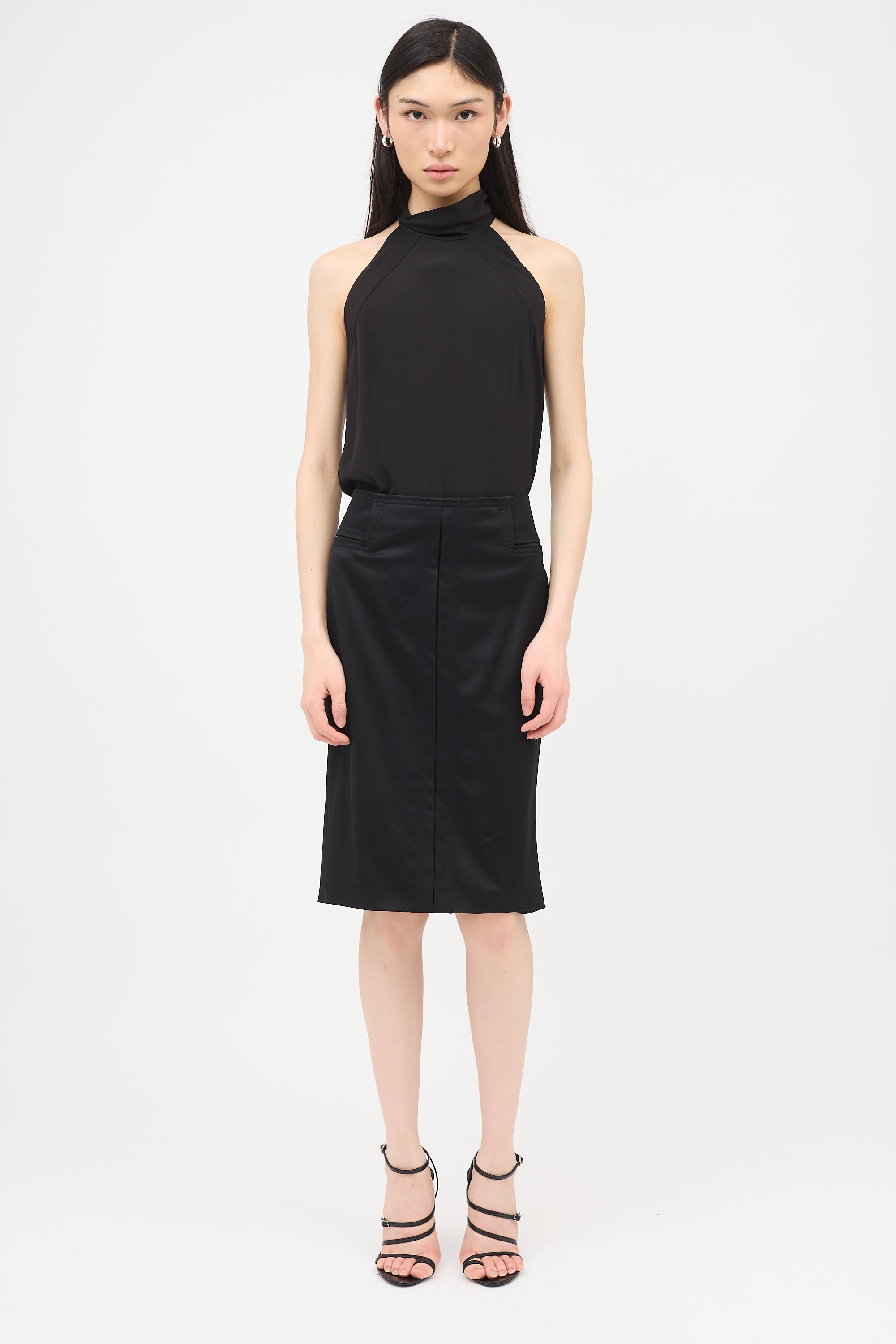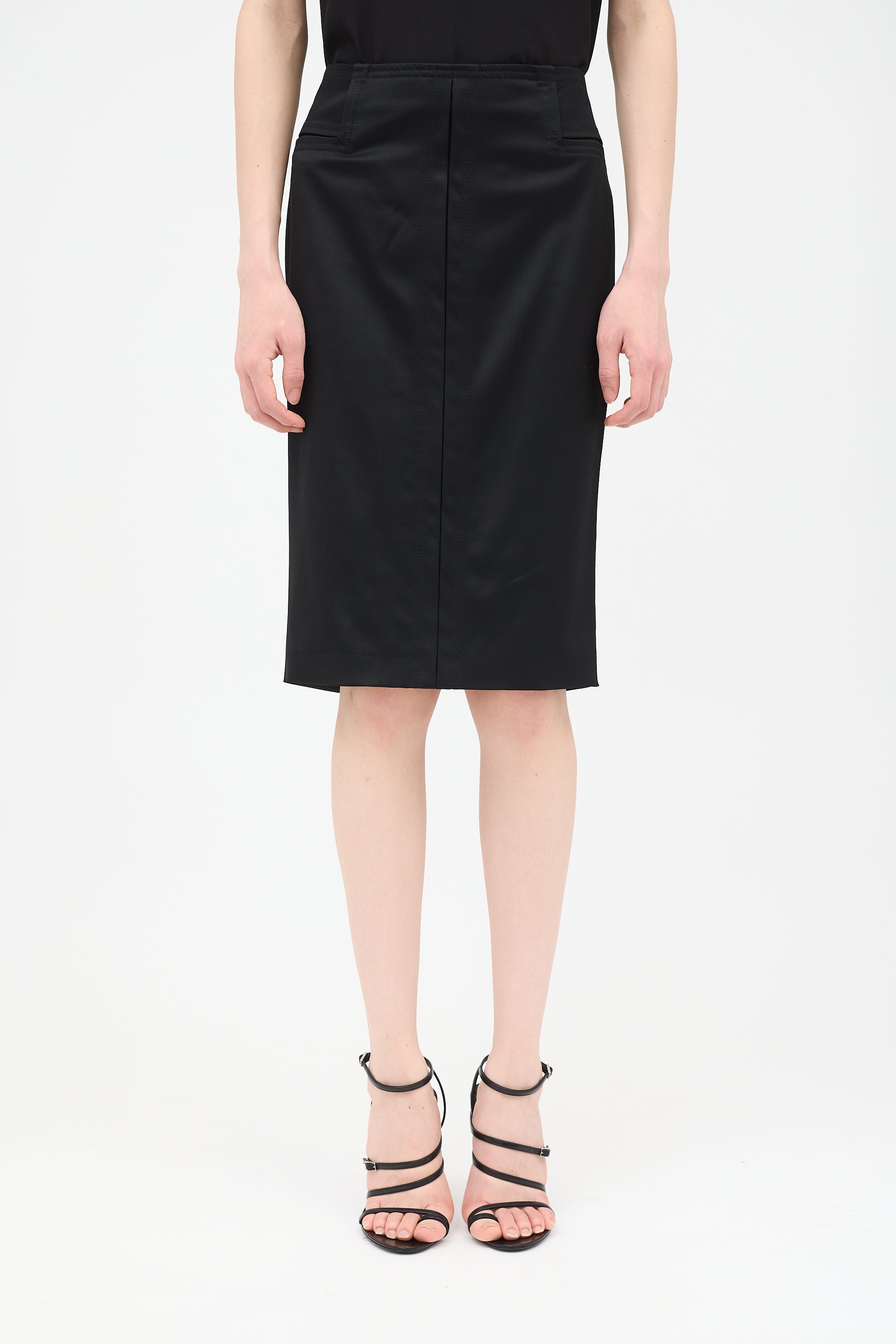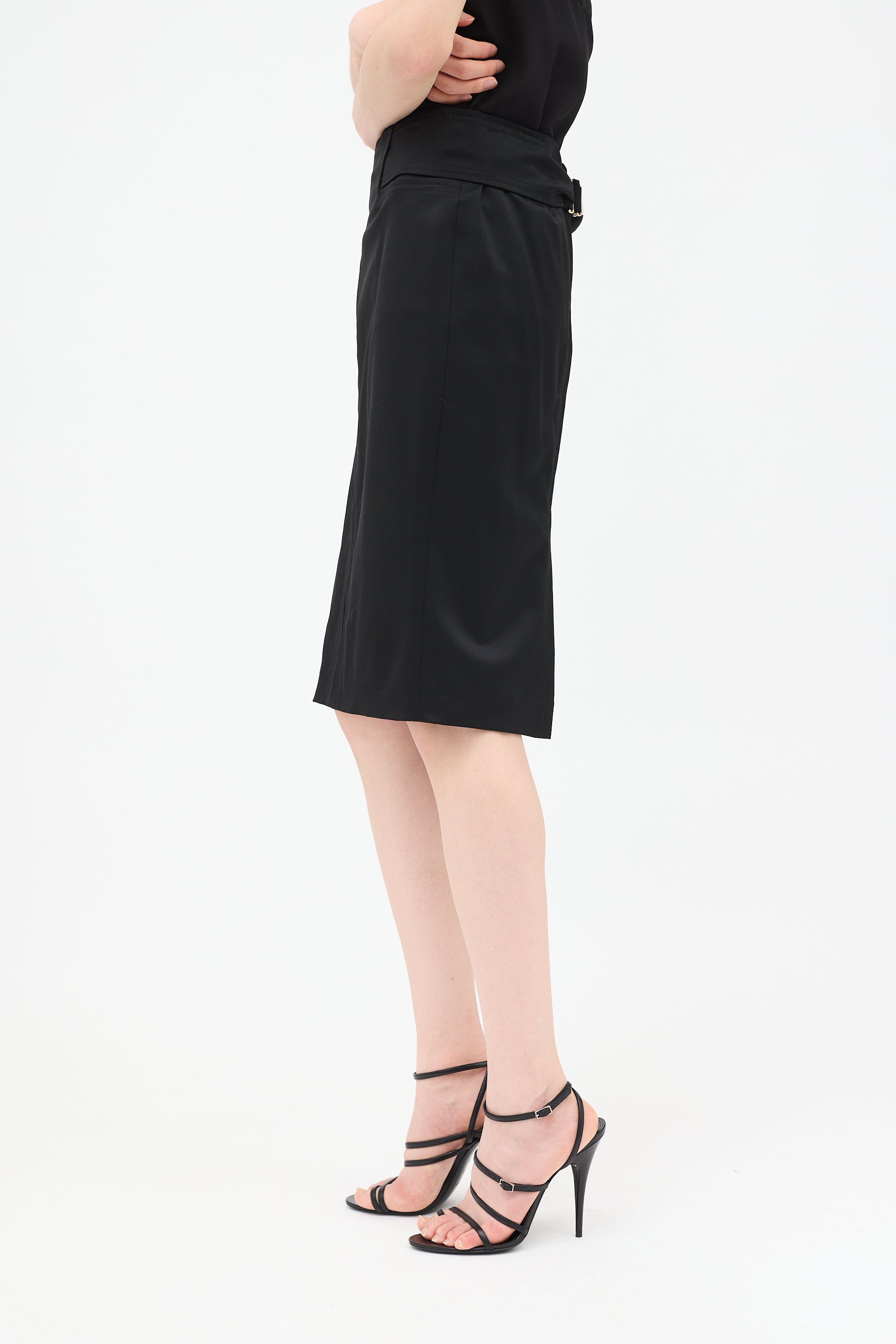 Pre-owned Gucci vintage black wool blend skirt featuring adjustable belt with silver tone buckle, back vent, pleated front and back seams, and concealed back zip. Unlined. Tom Ford era design. Clipped to fit model.