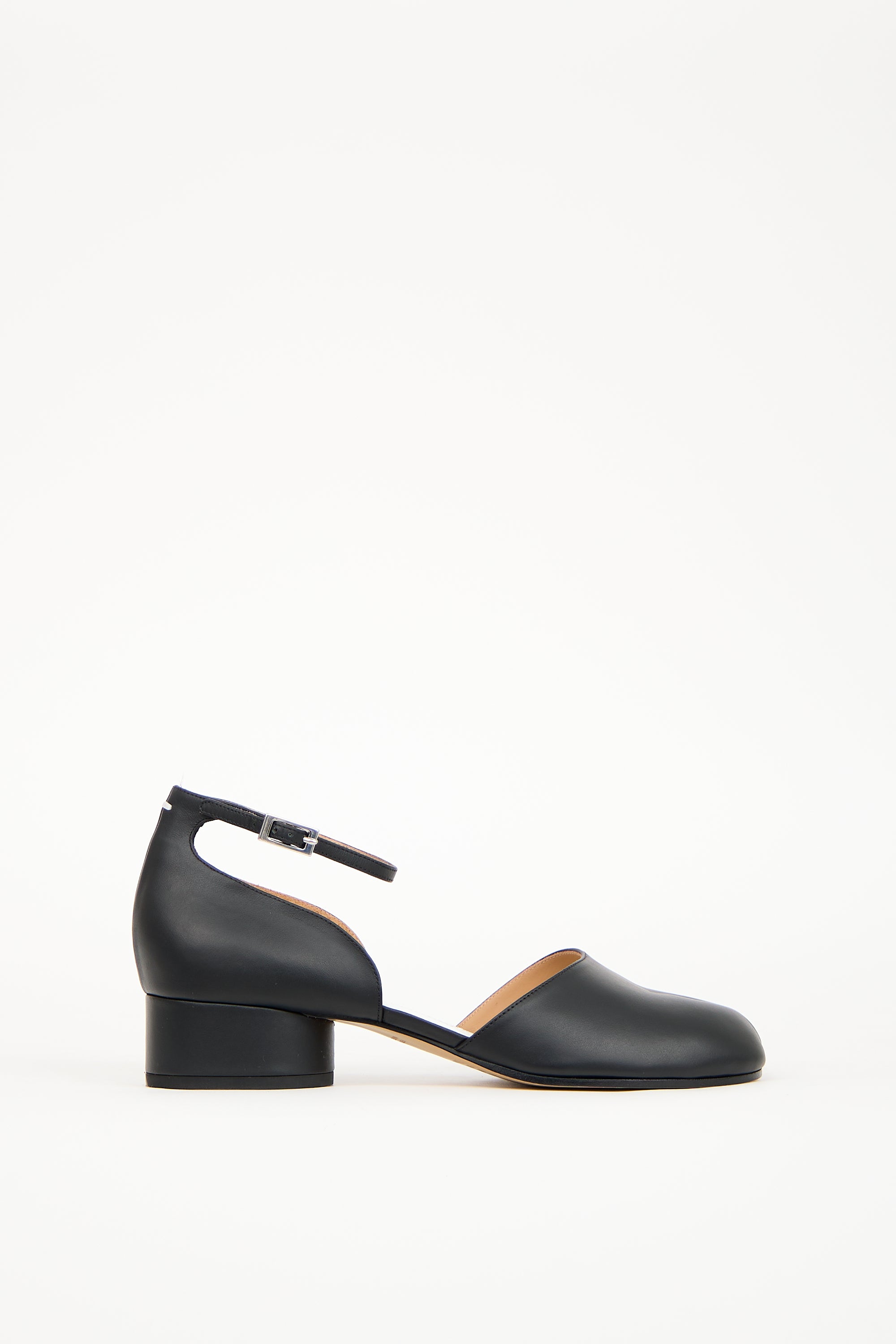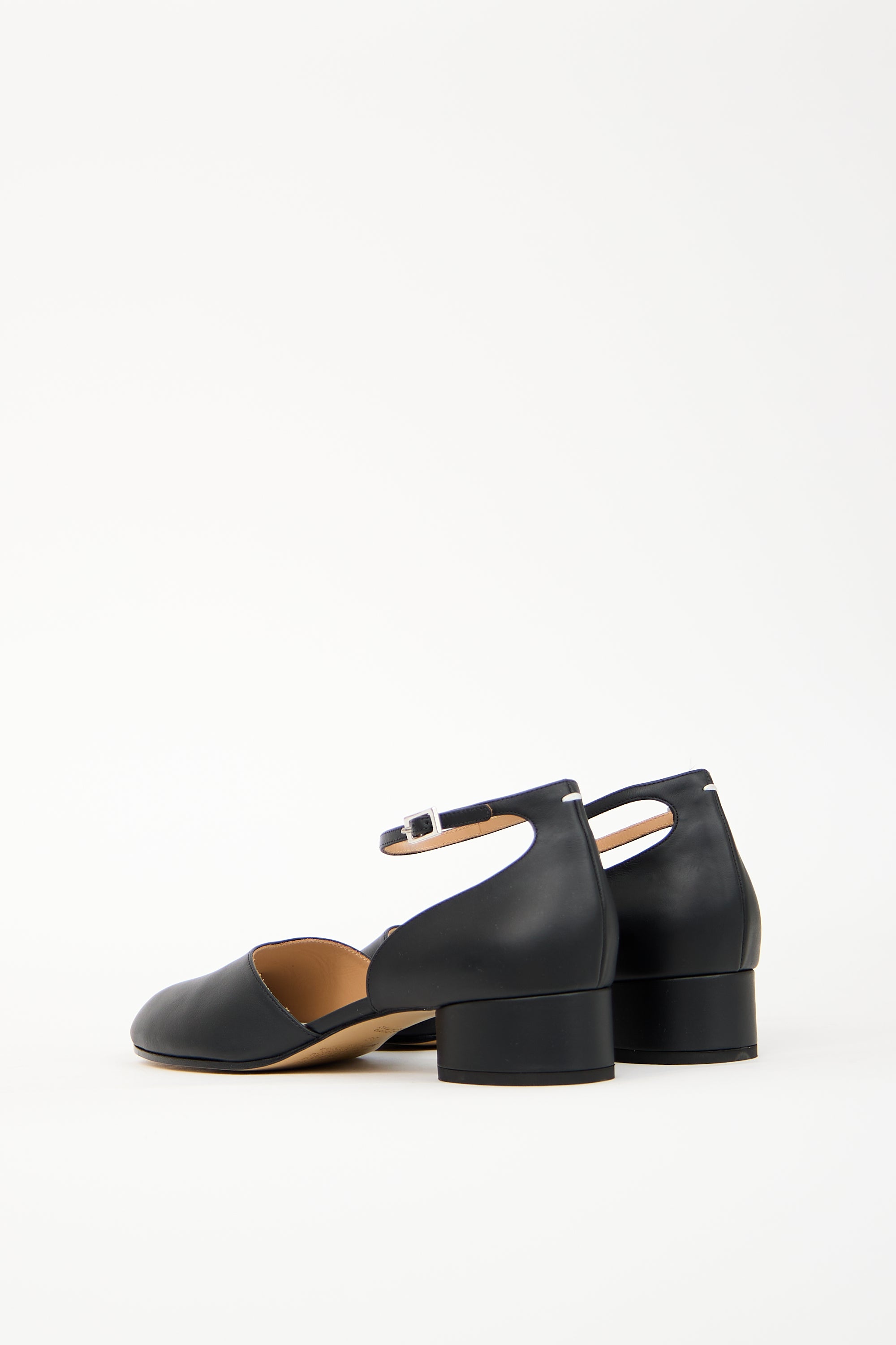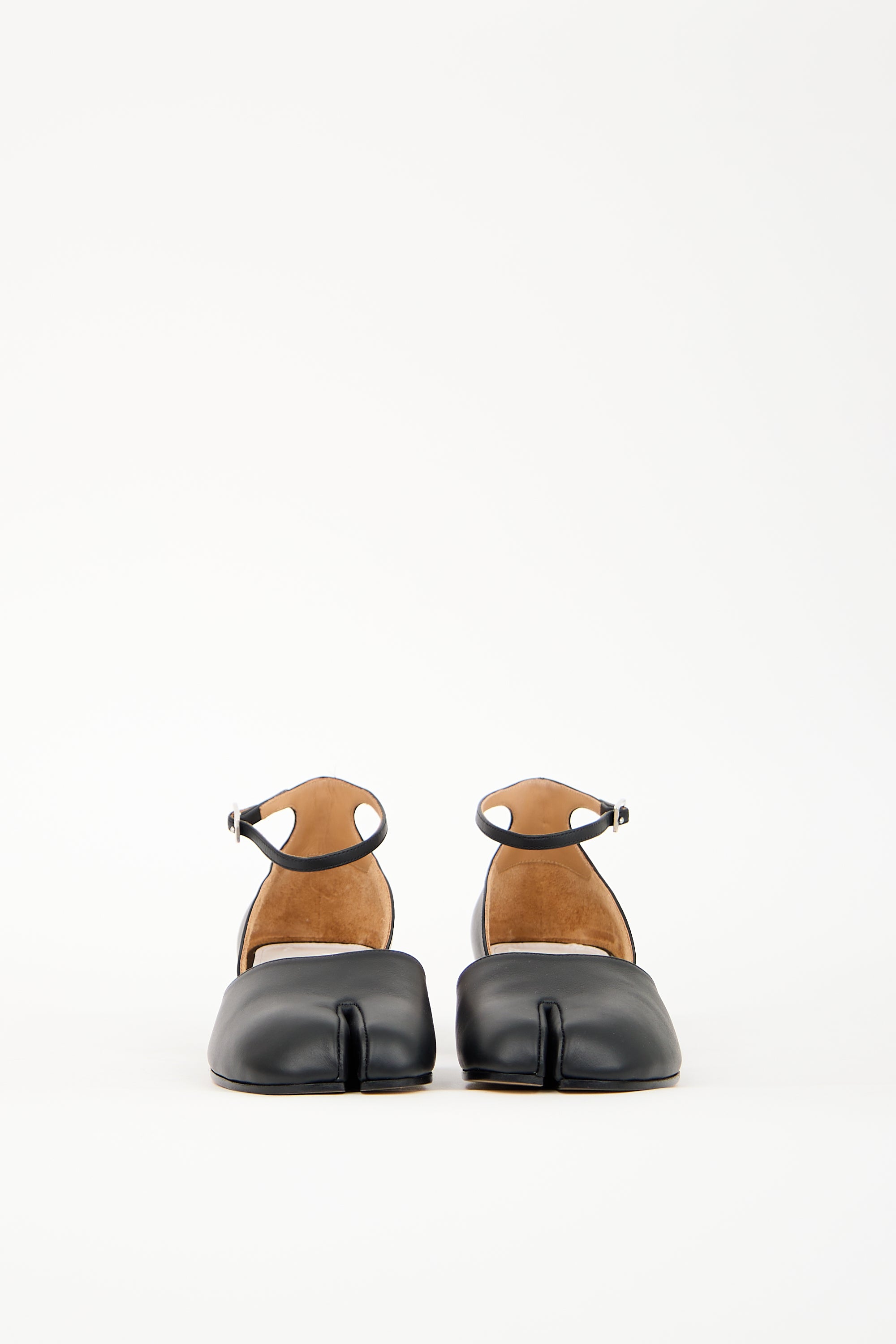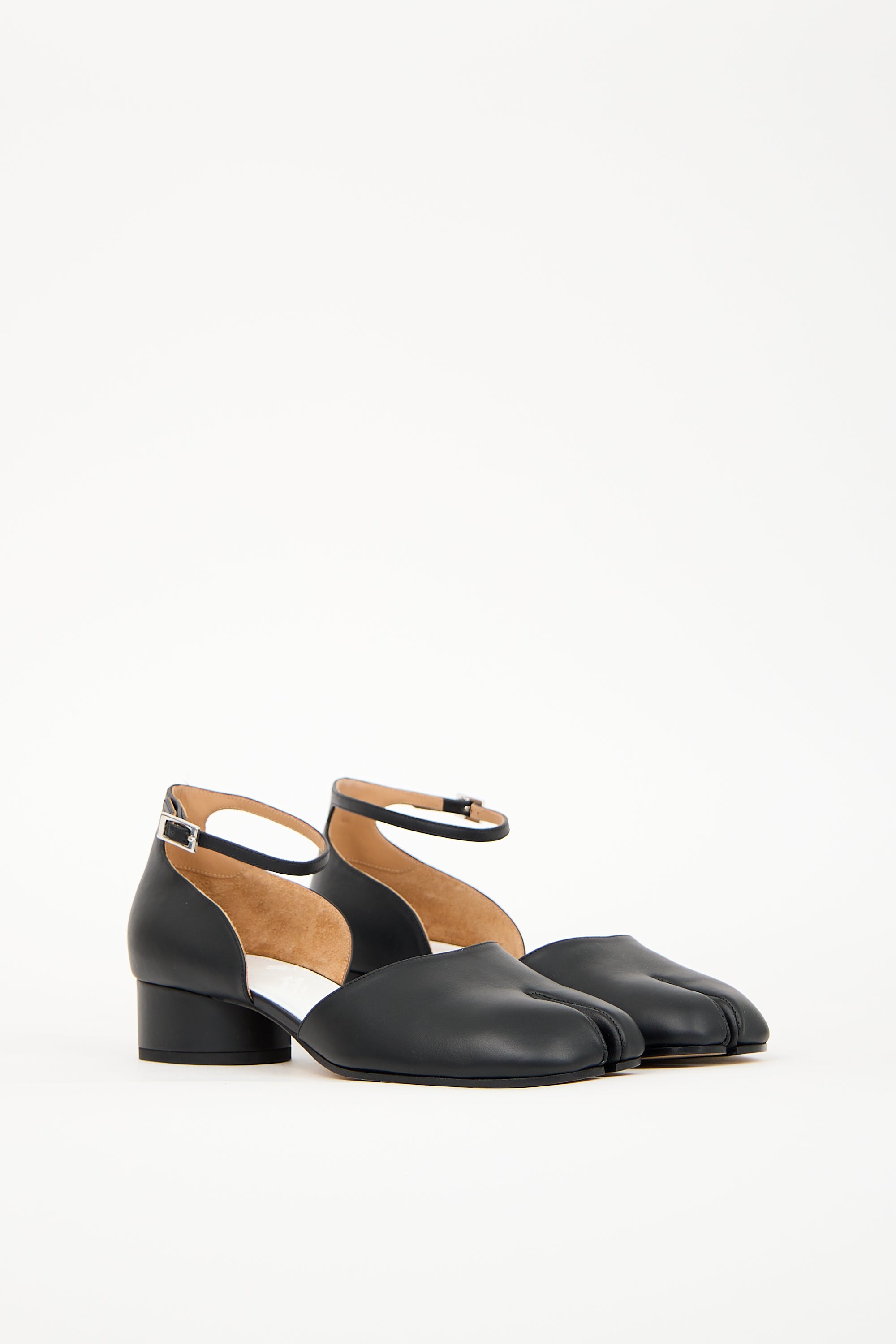Pre-owned Maison Margiela black leather Tabi Decollete Mary Jane pumps featuring signature split toe, adjustable ankle strap, signature white stitch at counter, stamped logo throughout insole, and covered cylinder heel. Comes with original box and dust bags.