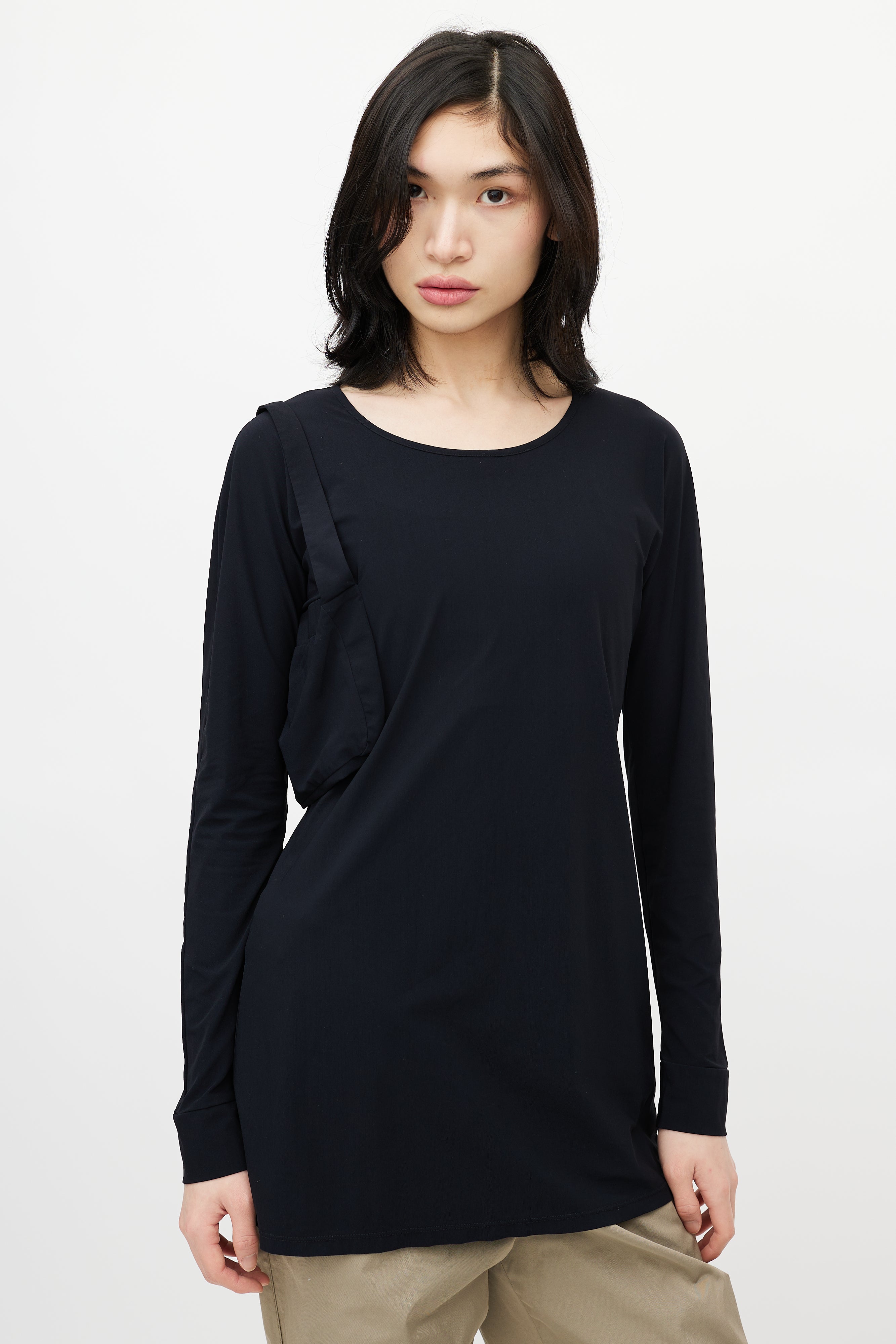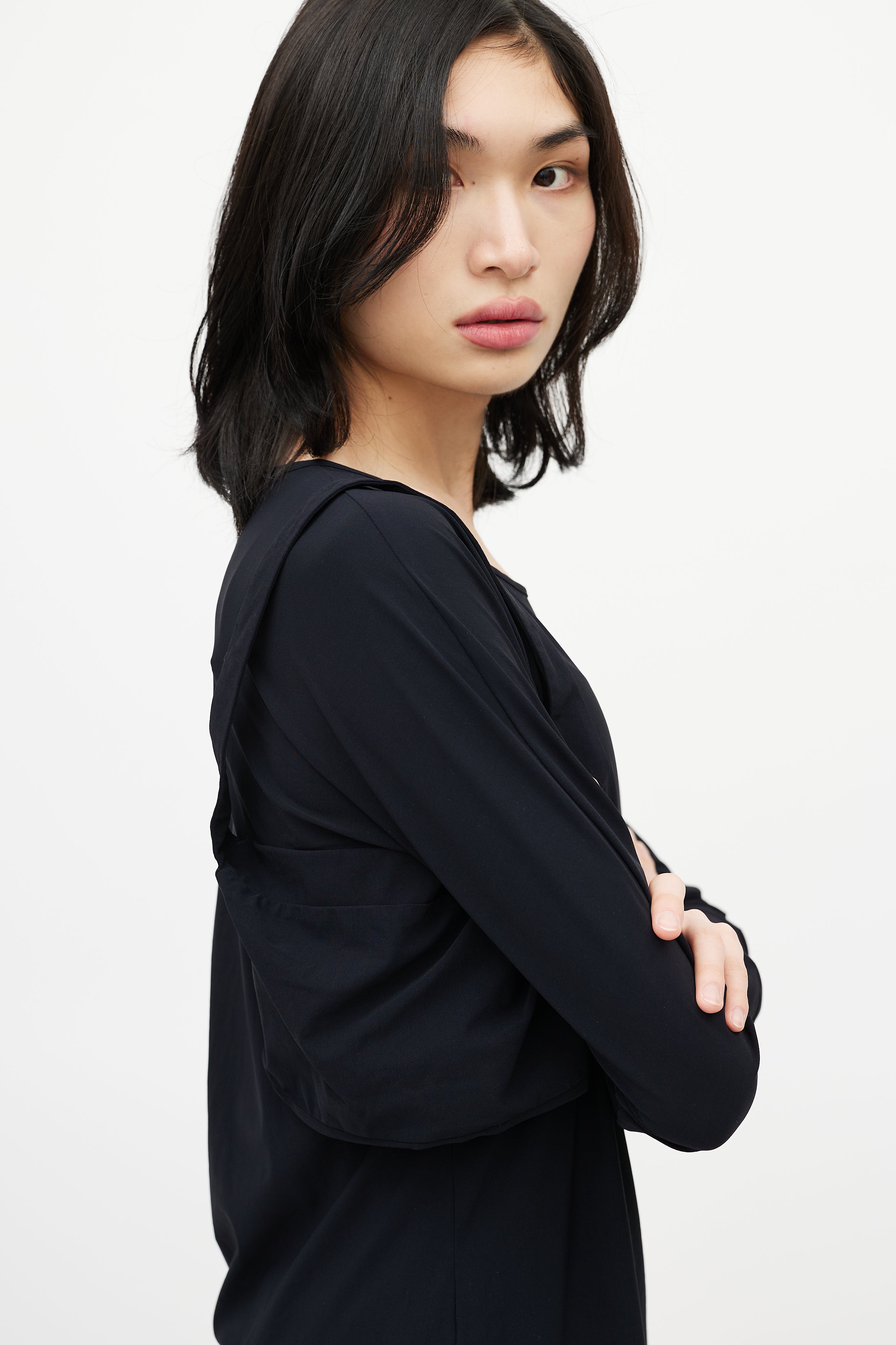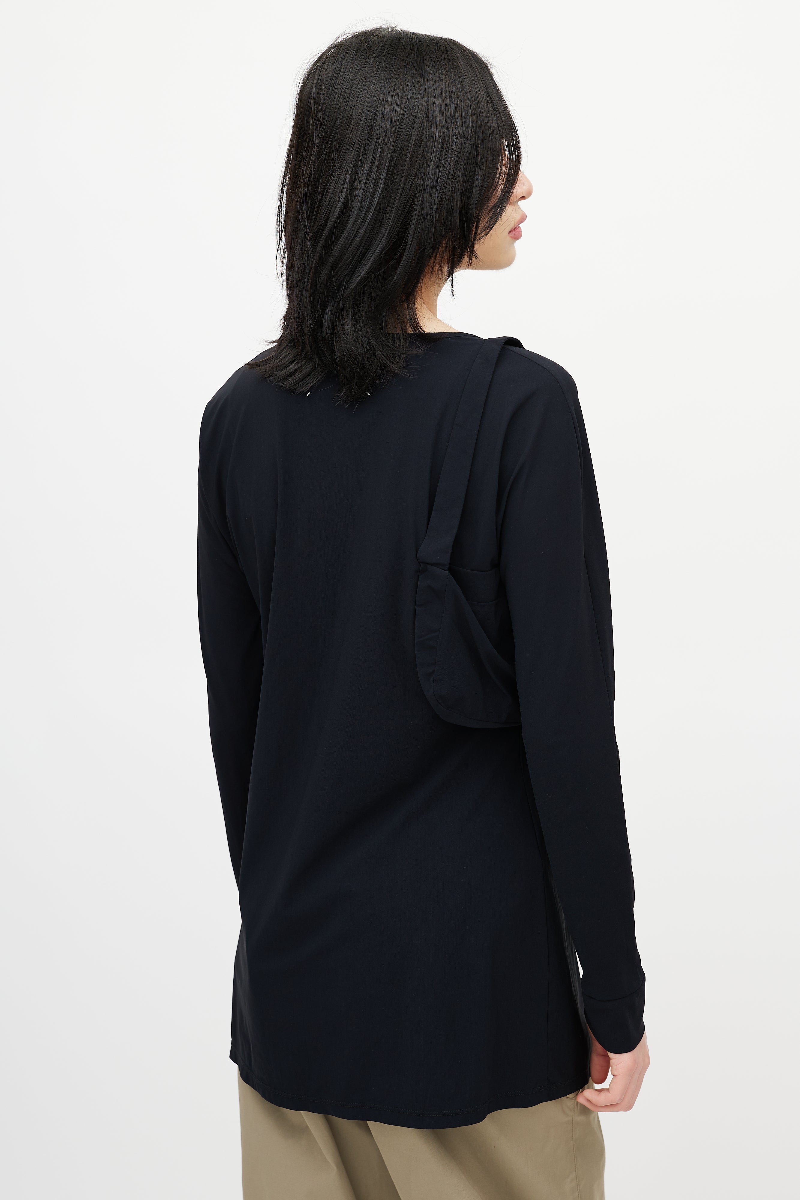 Pre-owned Maison Margiela black long sleeve top featuring crew neckline, purse with strap detail at right shoulder, and signature white stitching at back.