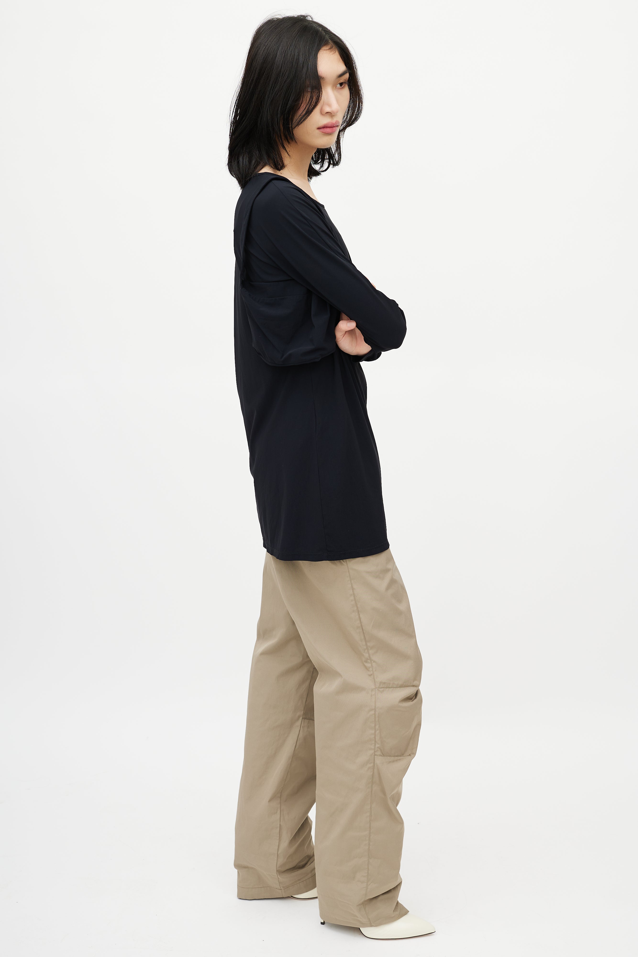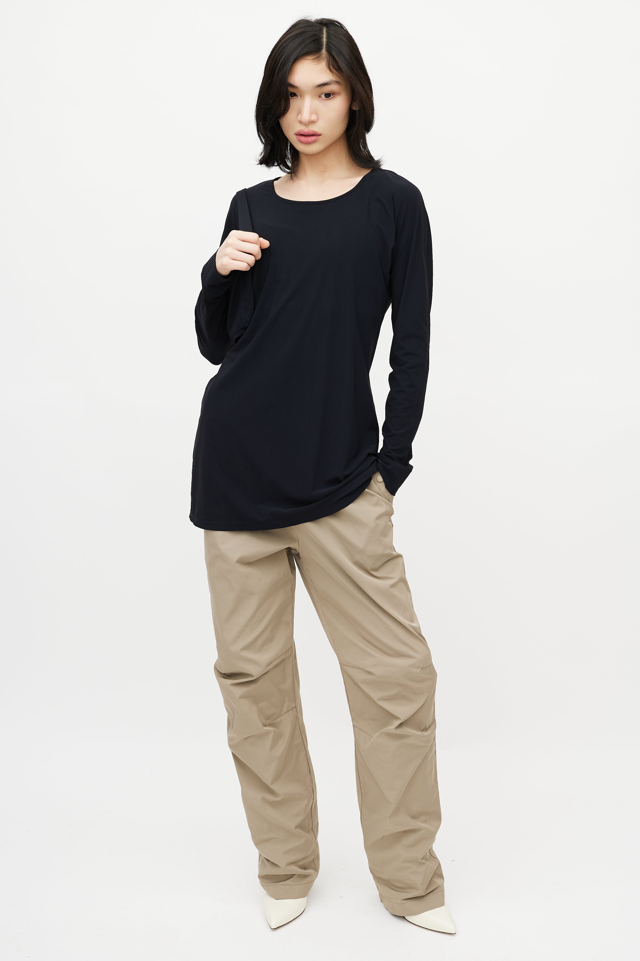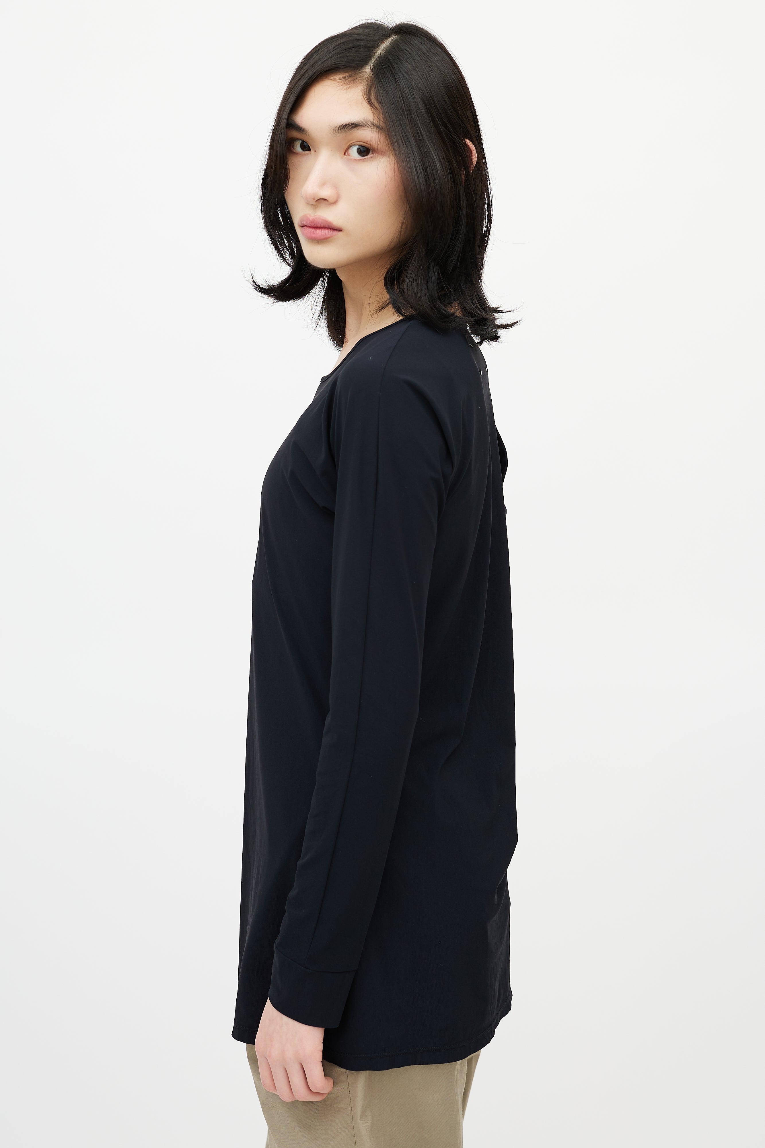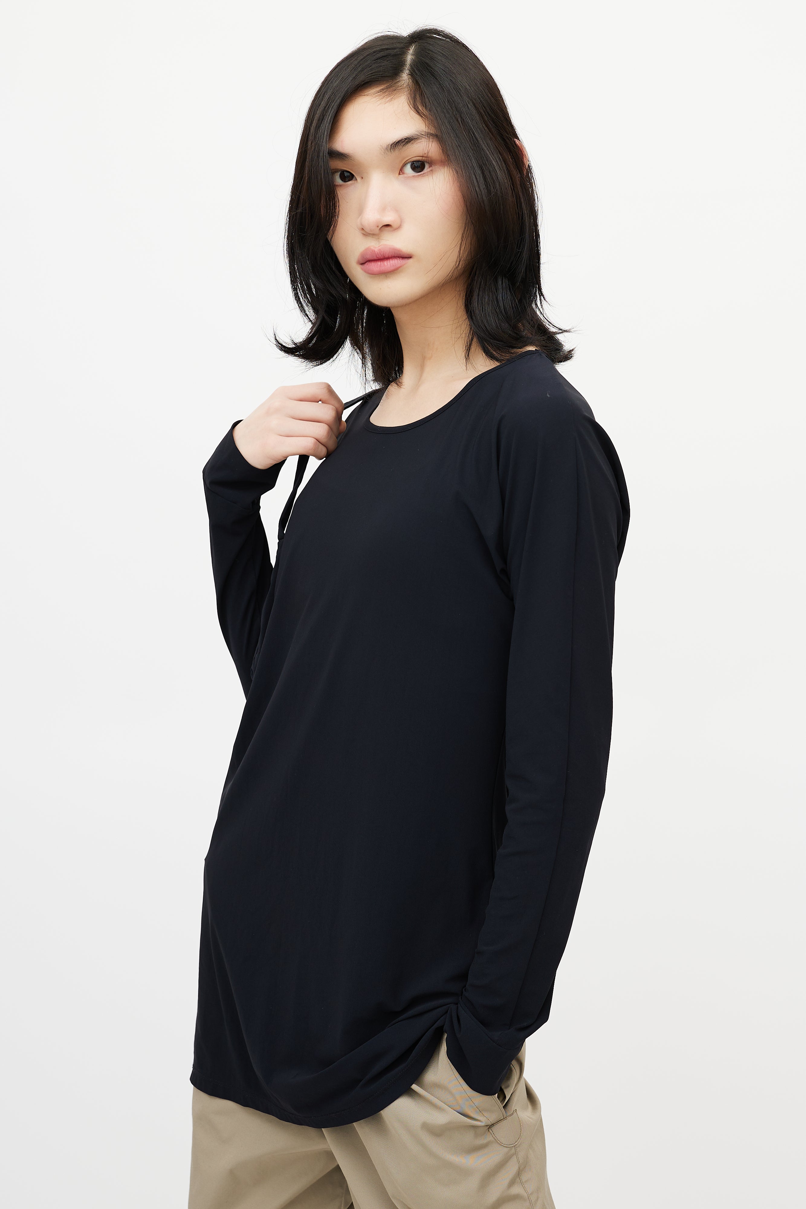 Pre-owned Maison Margiela black long sleeve top featuring crew neckline, purse with strap detail at right shoulder, and signature white stitching at back.