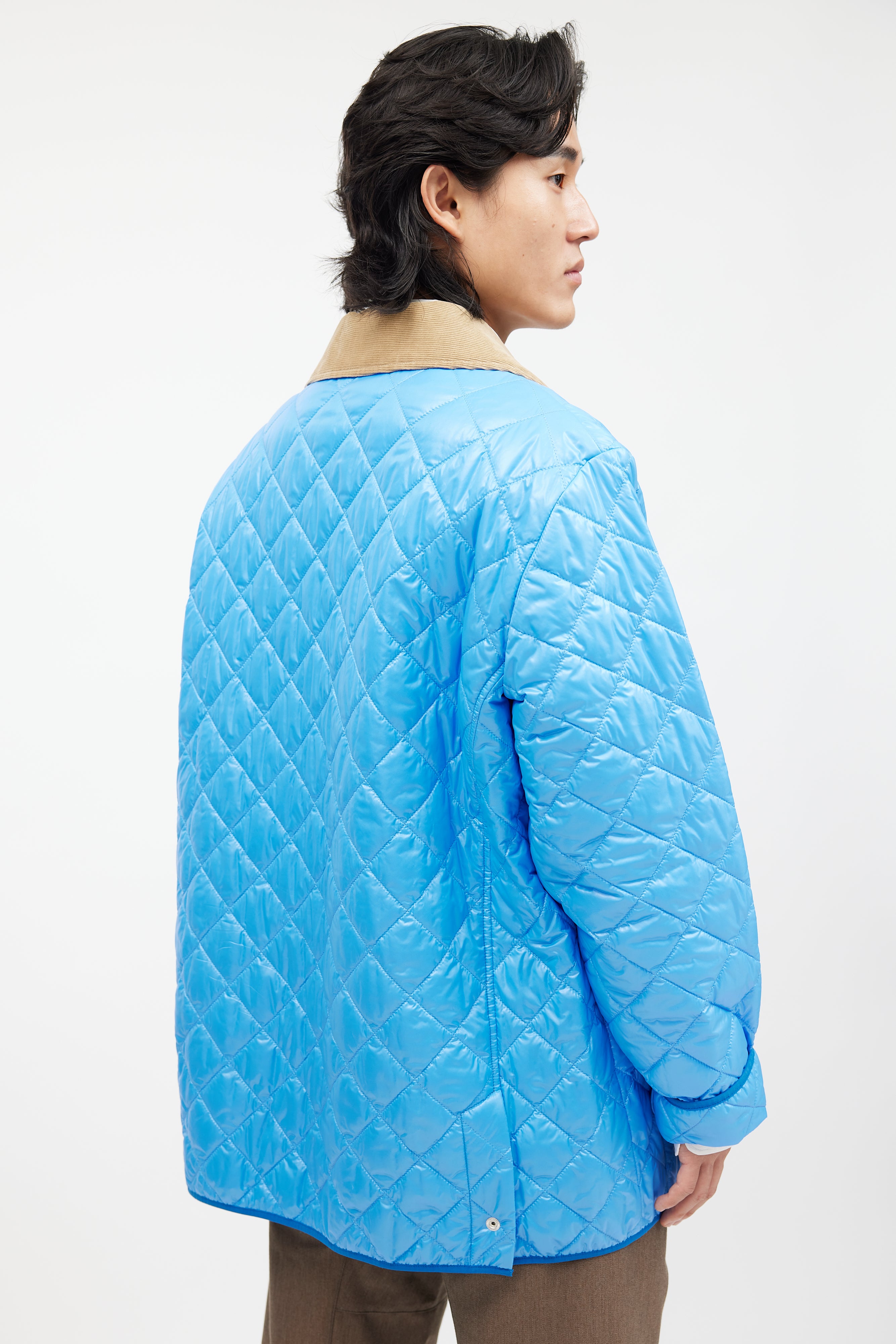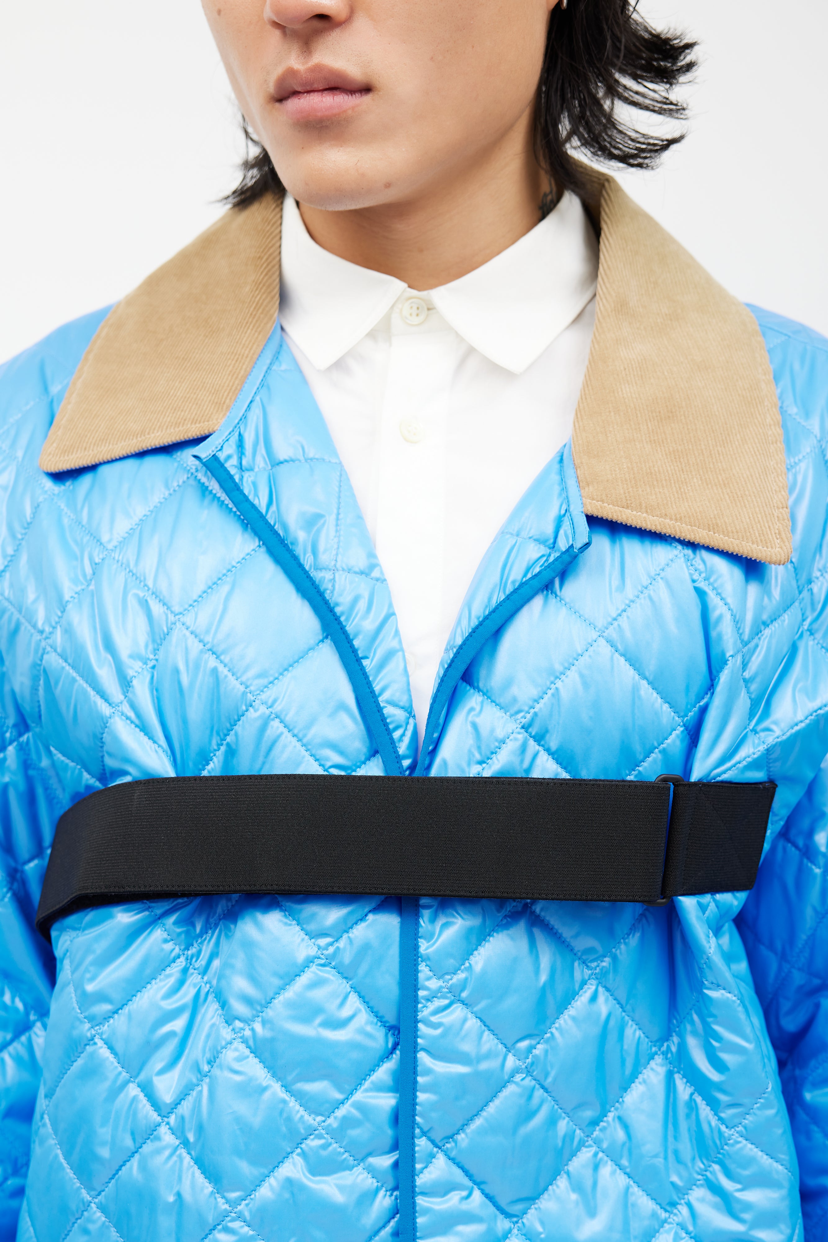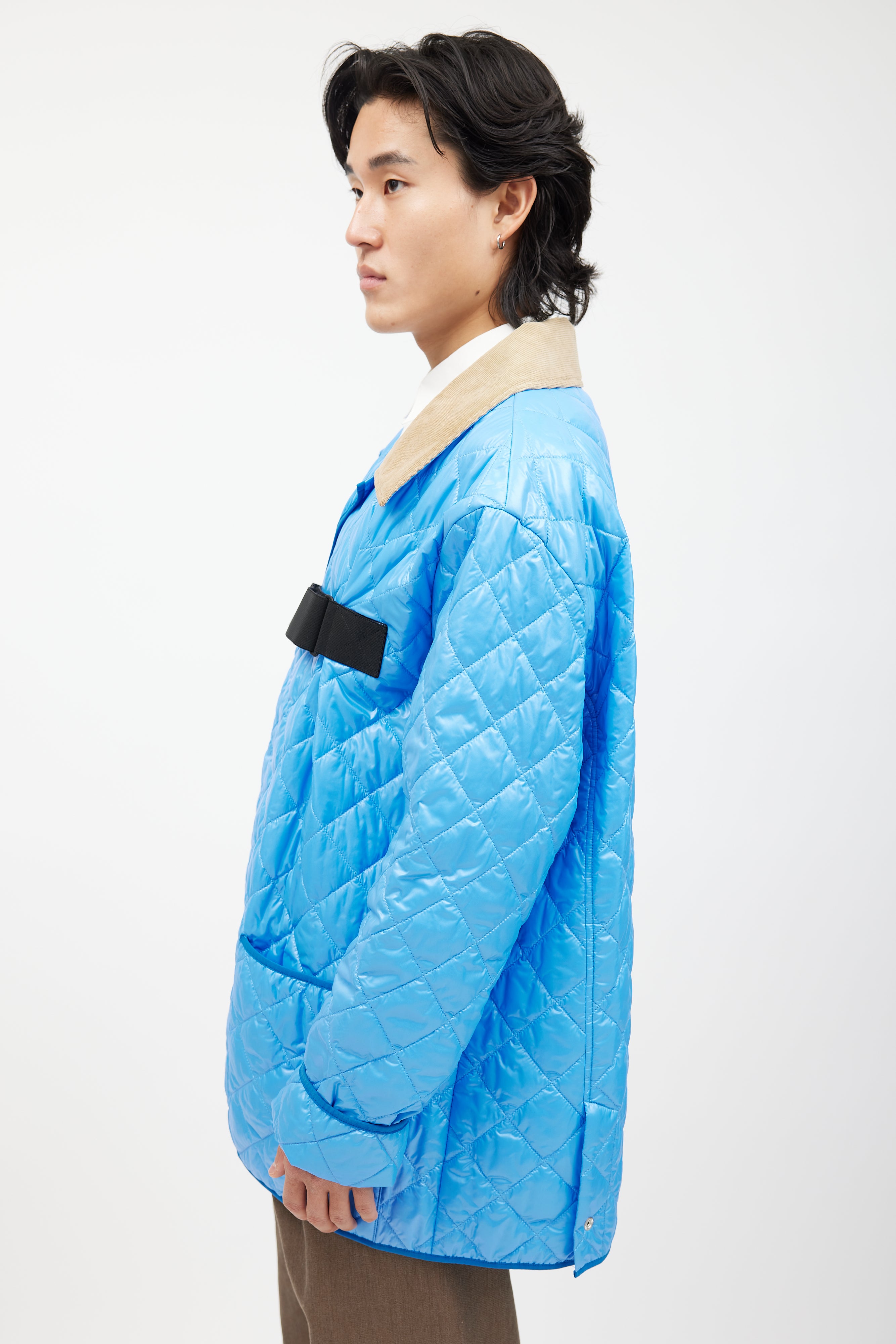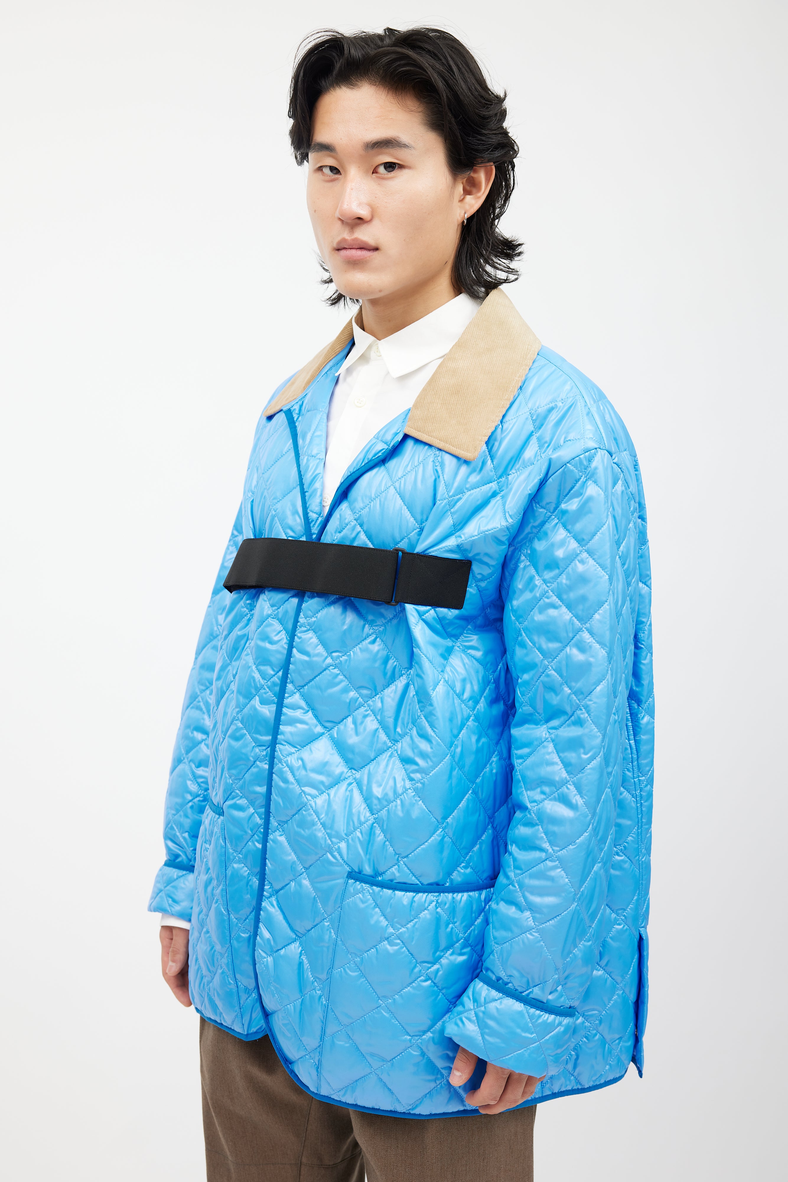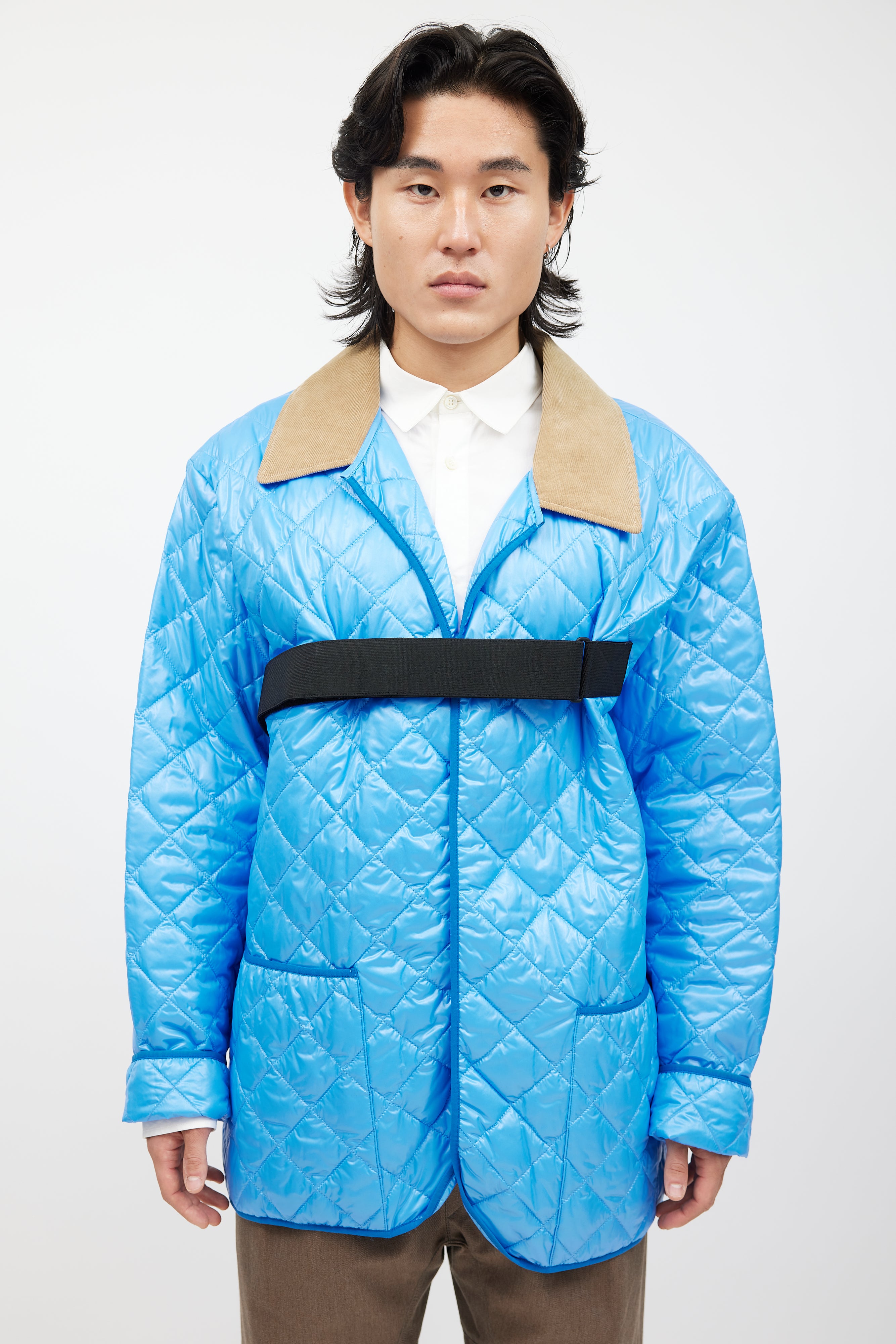 Pre-owned Maison Margiela blue quilted chore jacket featuring a pointed corduroy collar, long sleeves, two patch pockets at hip, and black velcro strap closure.