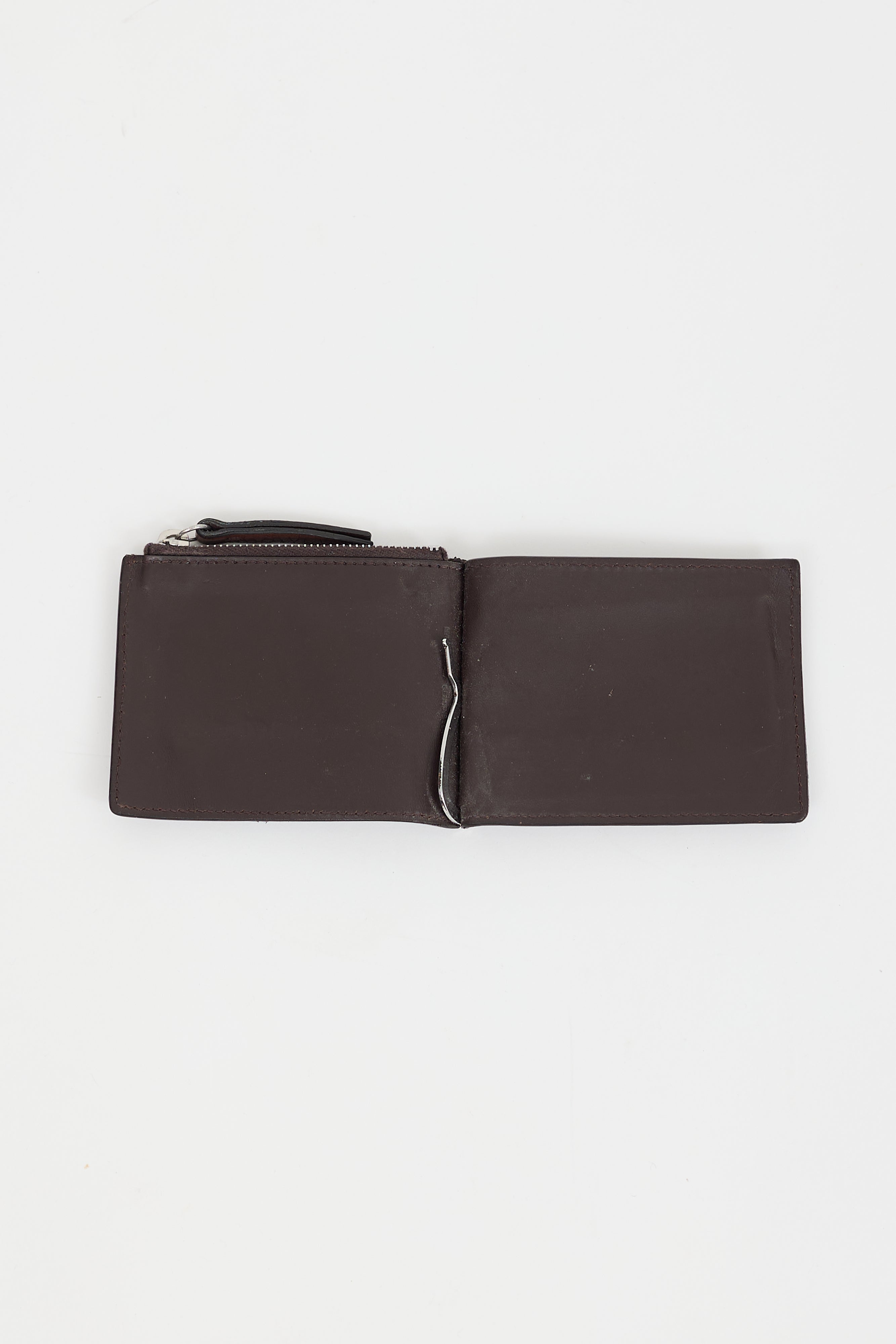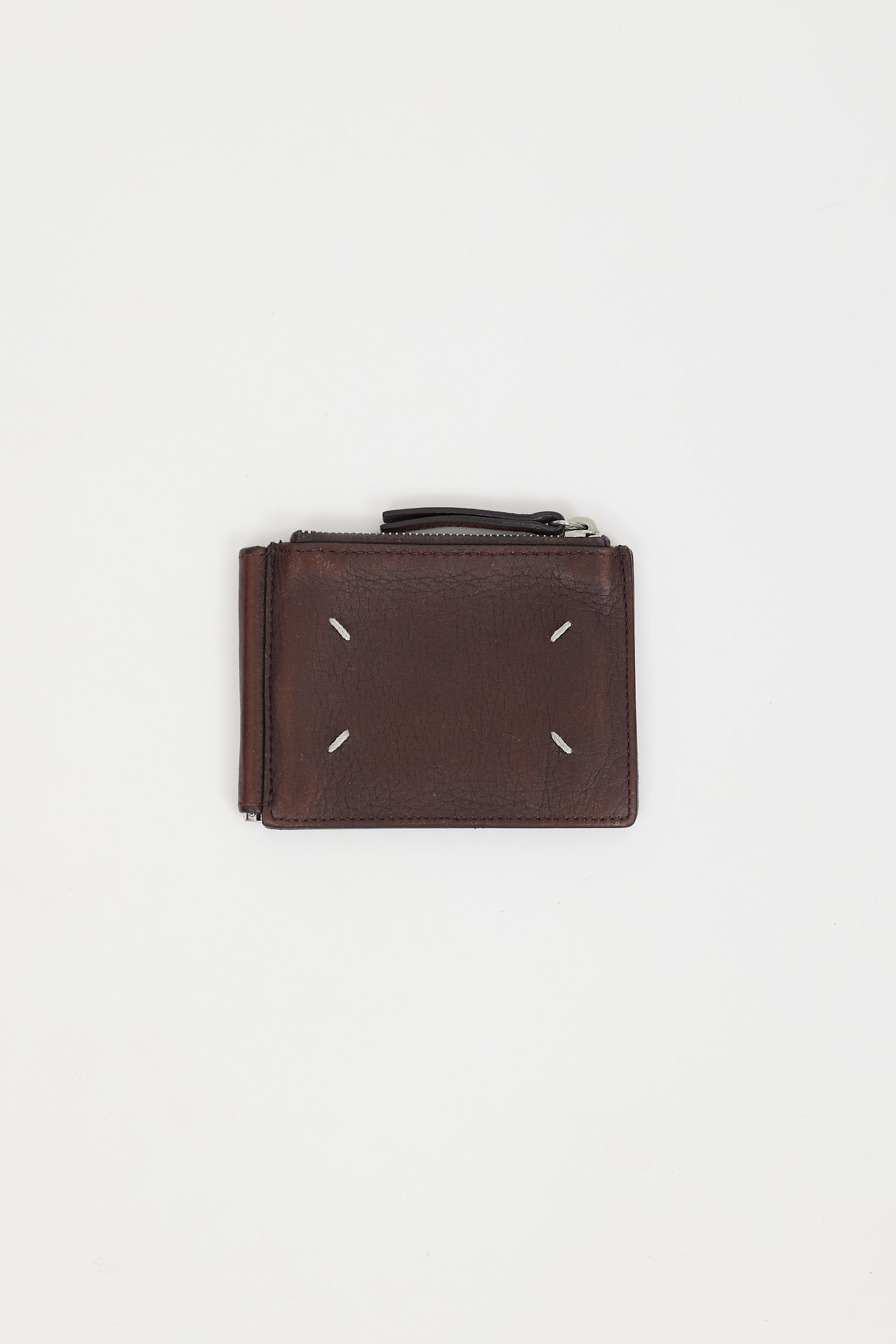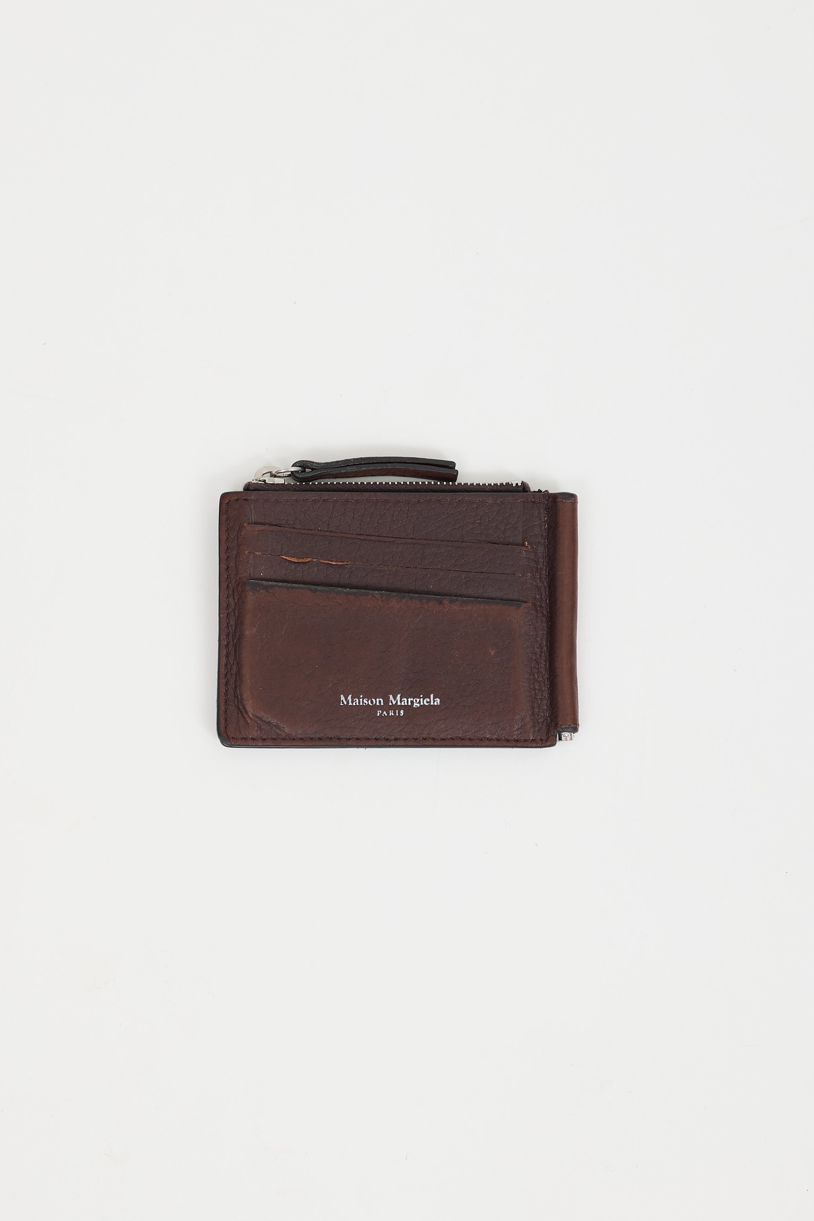 Pre-owned Maison Margiela brown leather money clip wallet featuring signature four stitch at front, zip pocket at top, three card slots at back, silver stamped logo at back, and bifold opening with money clip.