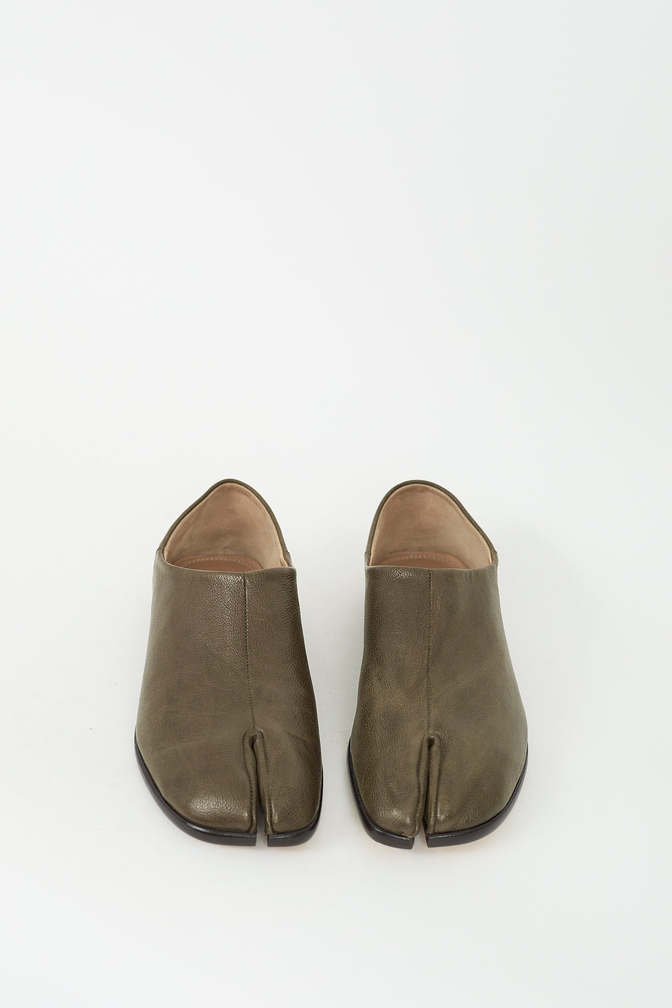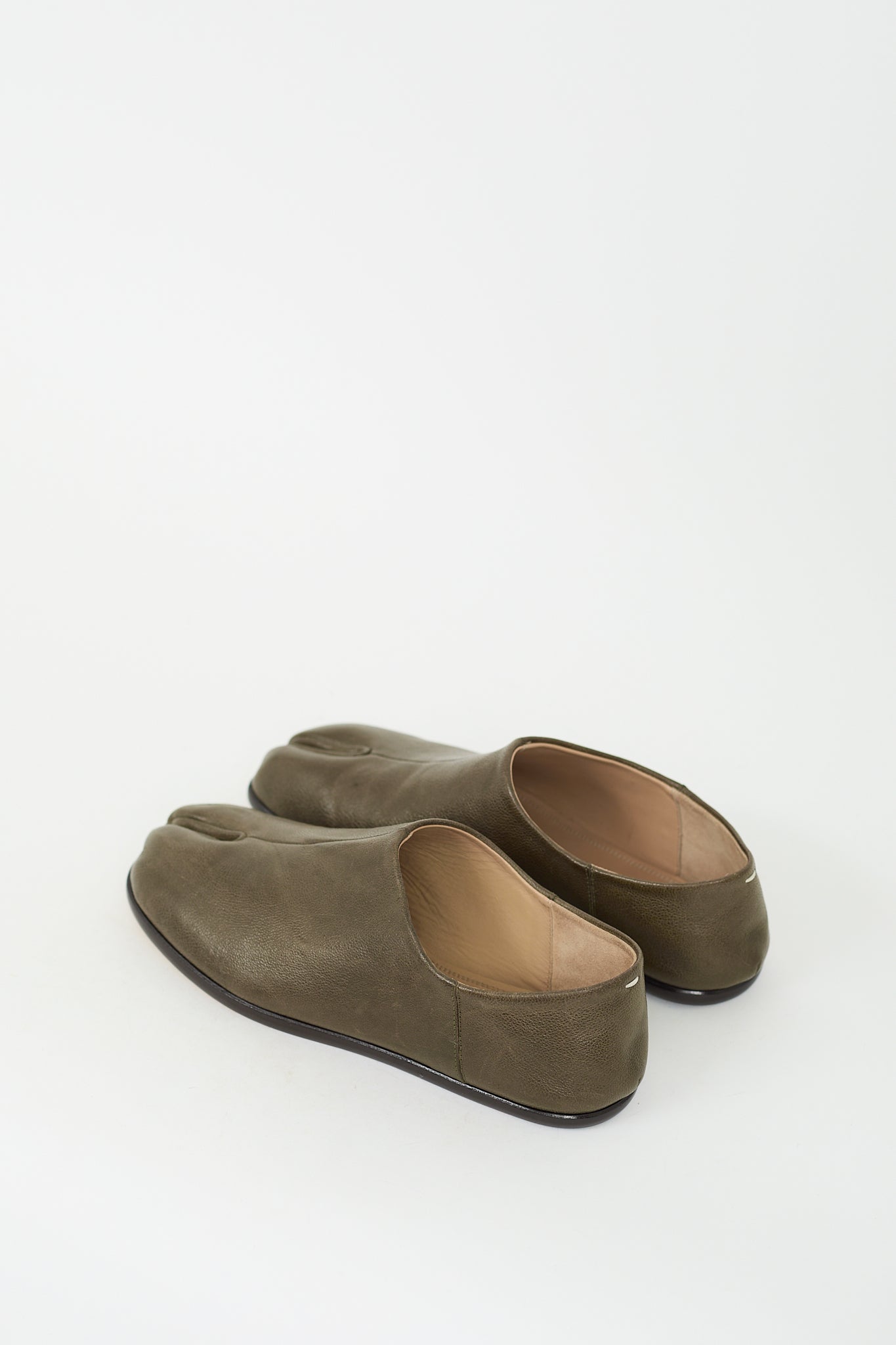 Pre-owned Maison Margiela khaki green leather Babouche Tabi flats featuring split toe, slip on entry, leather insole and outsole, and signature white single stitch at back.