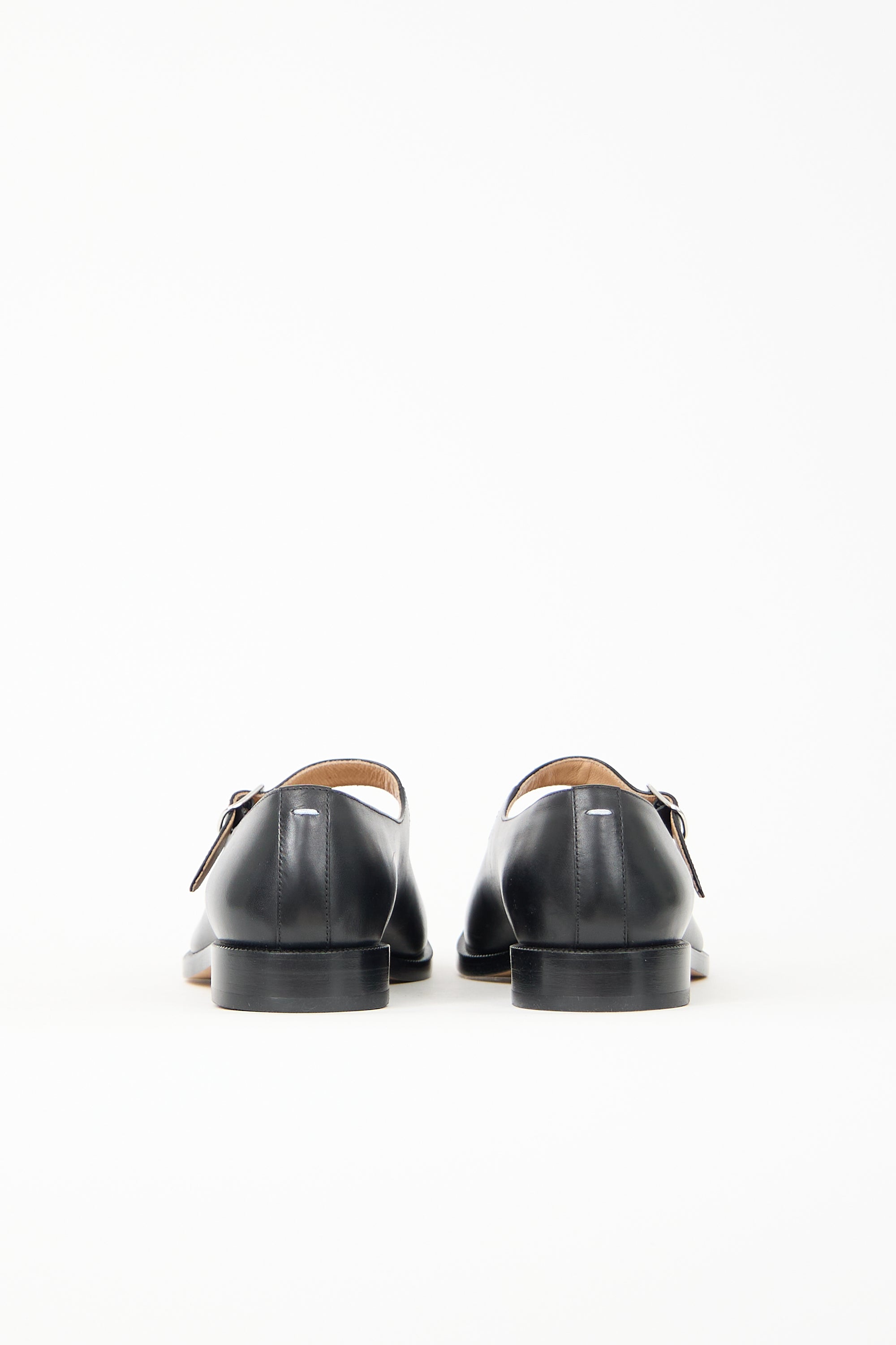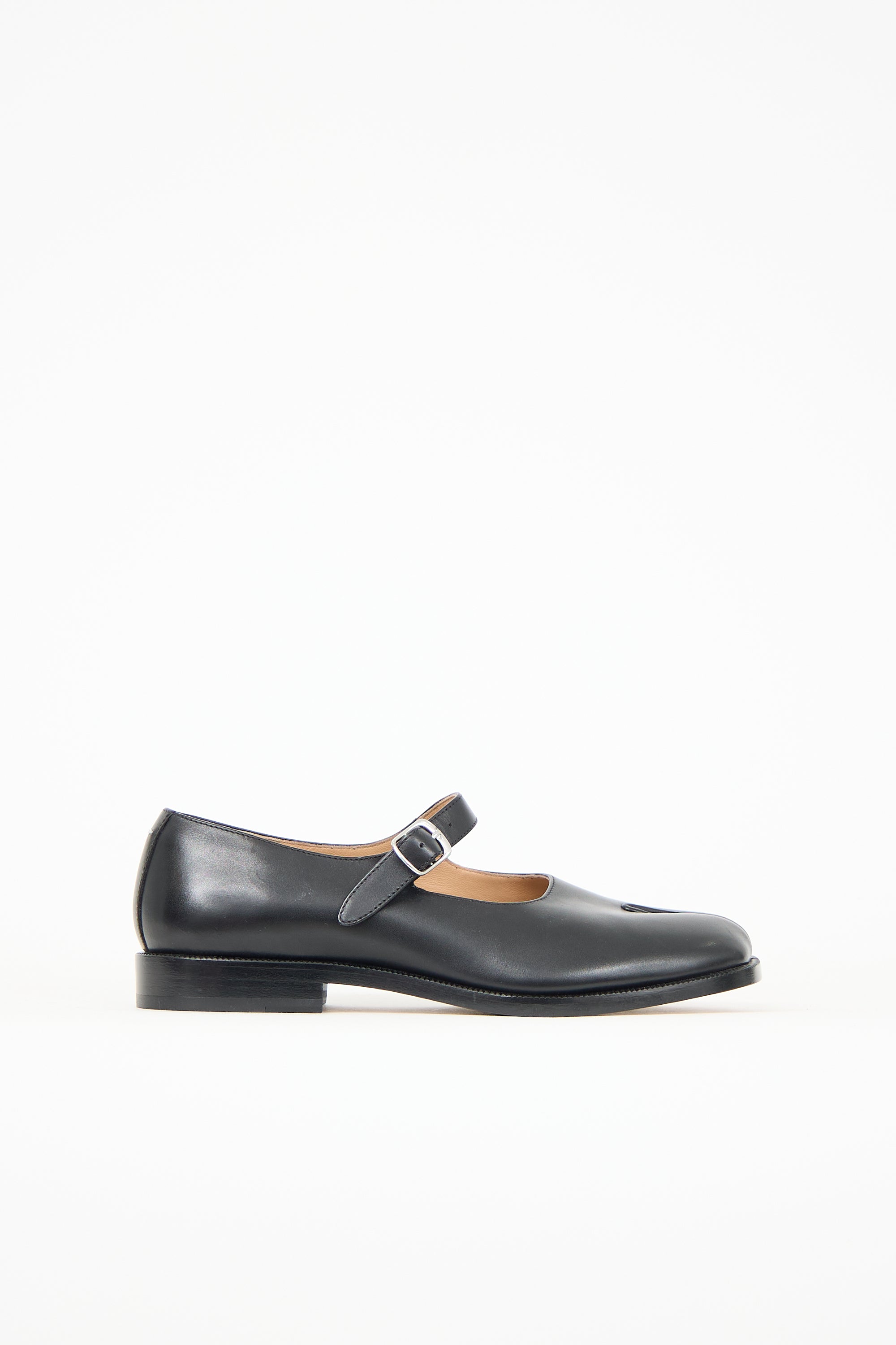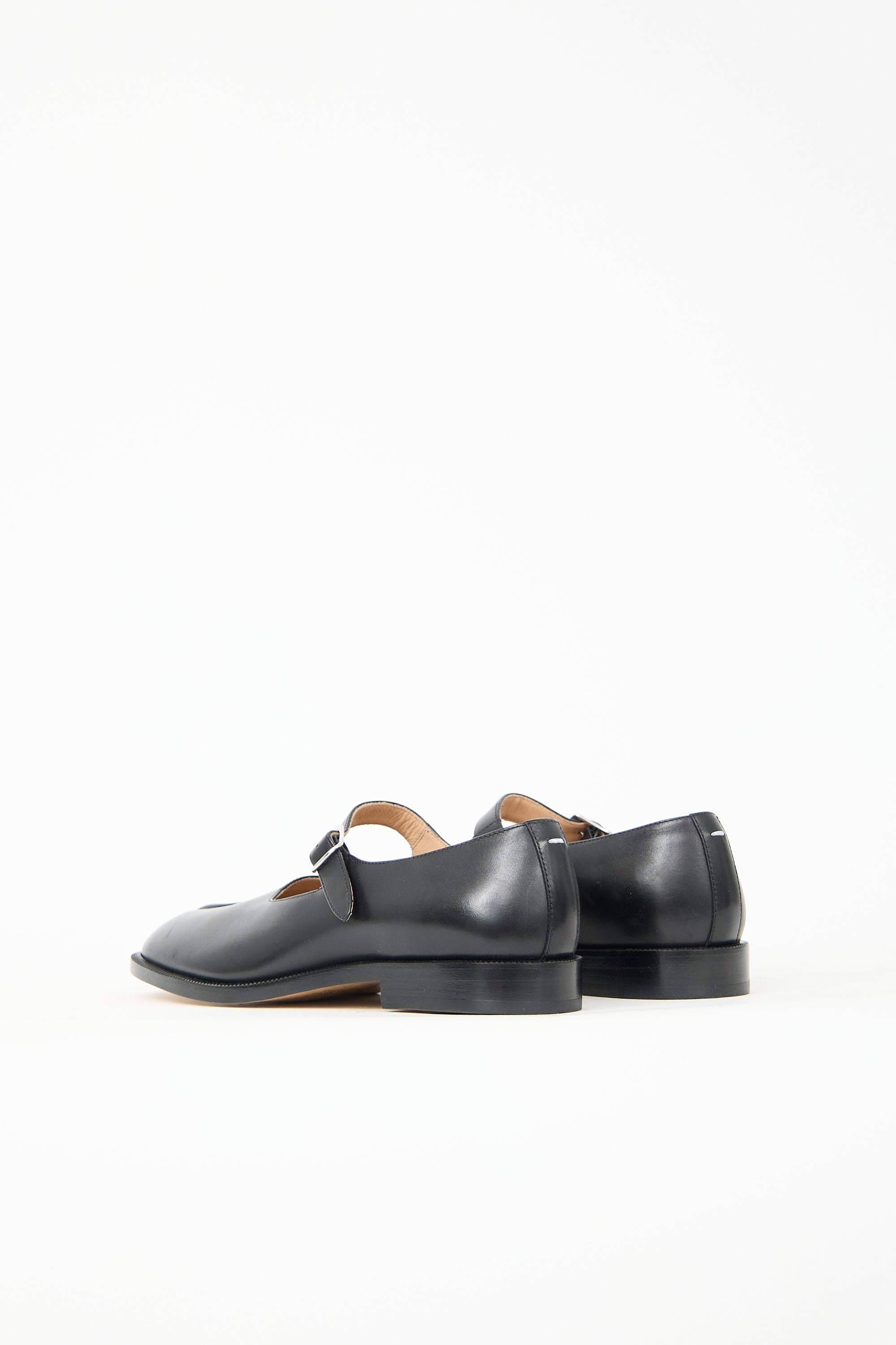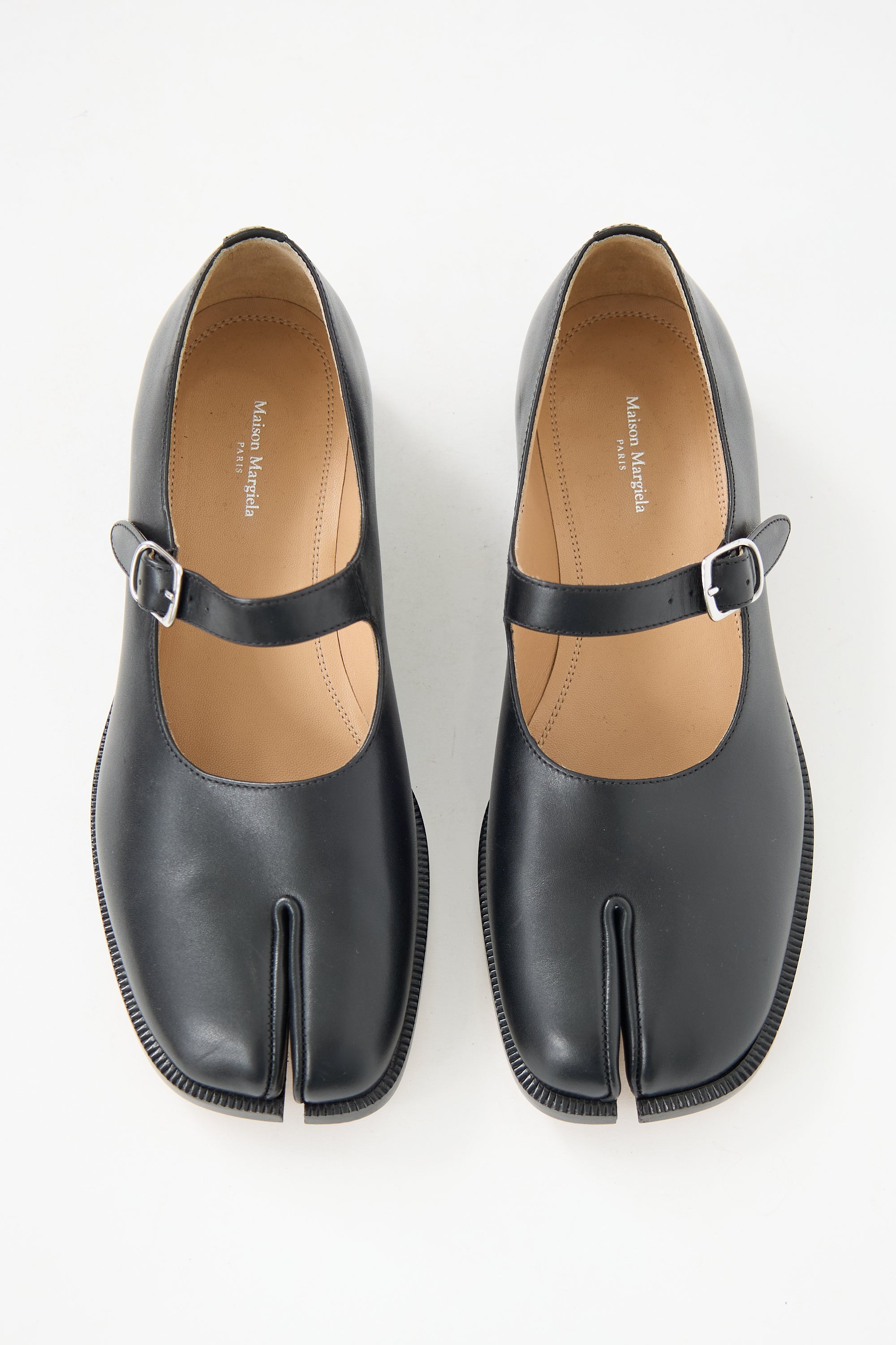 Pre-owned Maison Margiela black leather Mary Jane flats featuring signature split toe, adjustable instep strap, and short stacked heel.