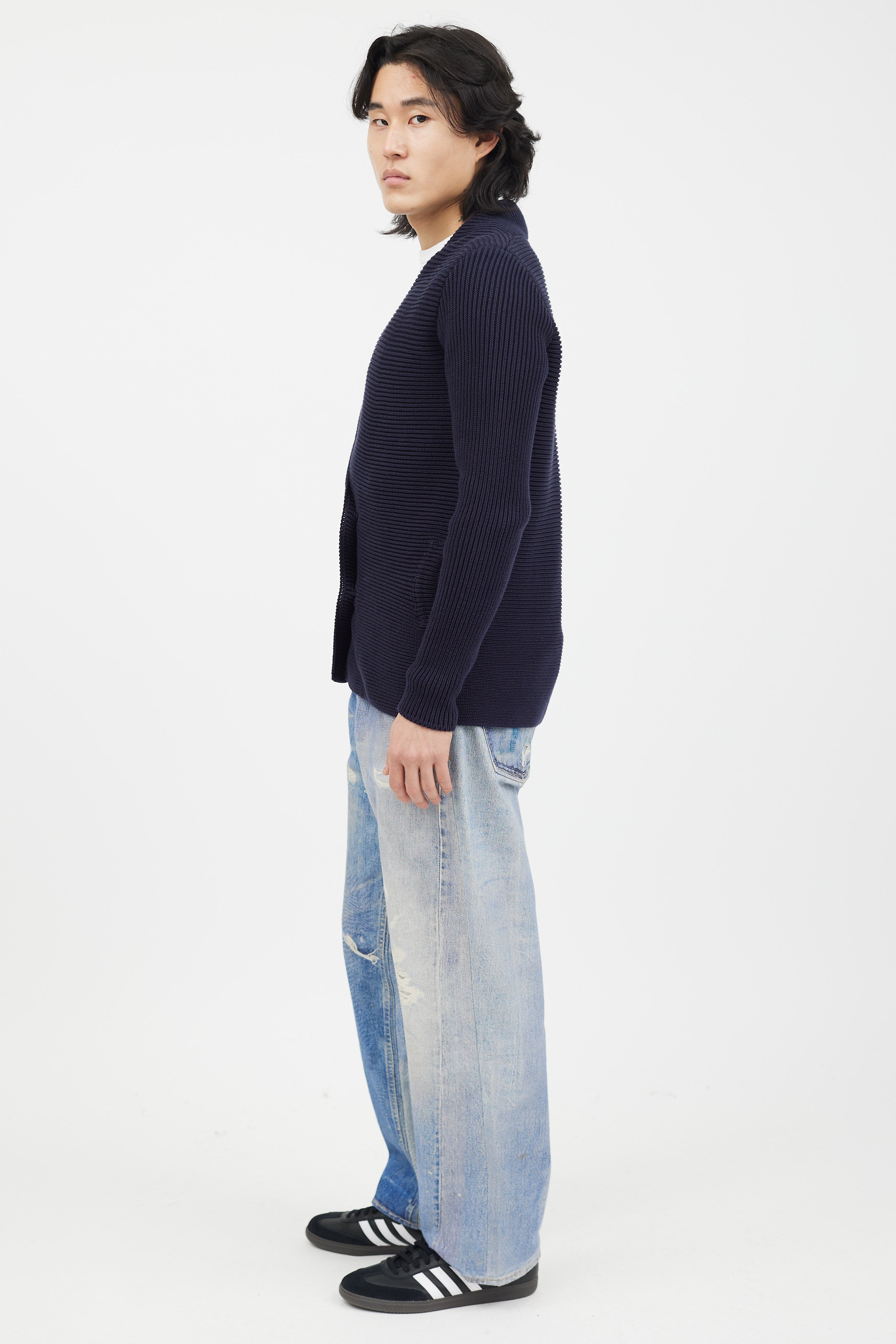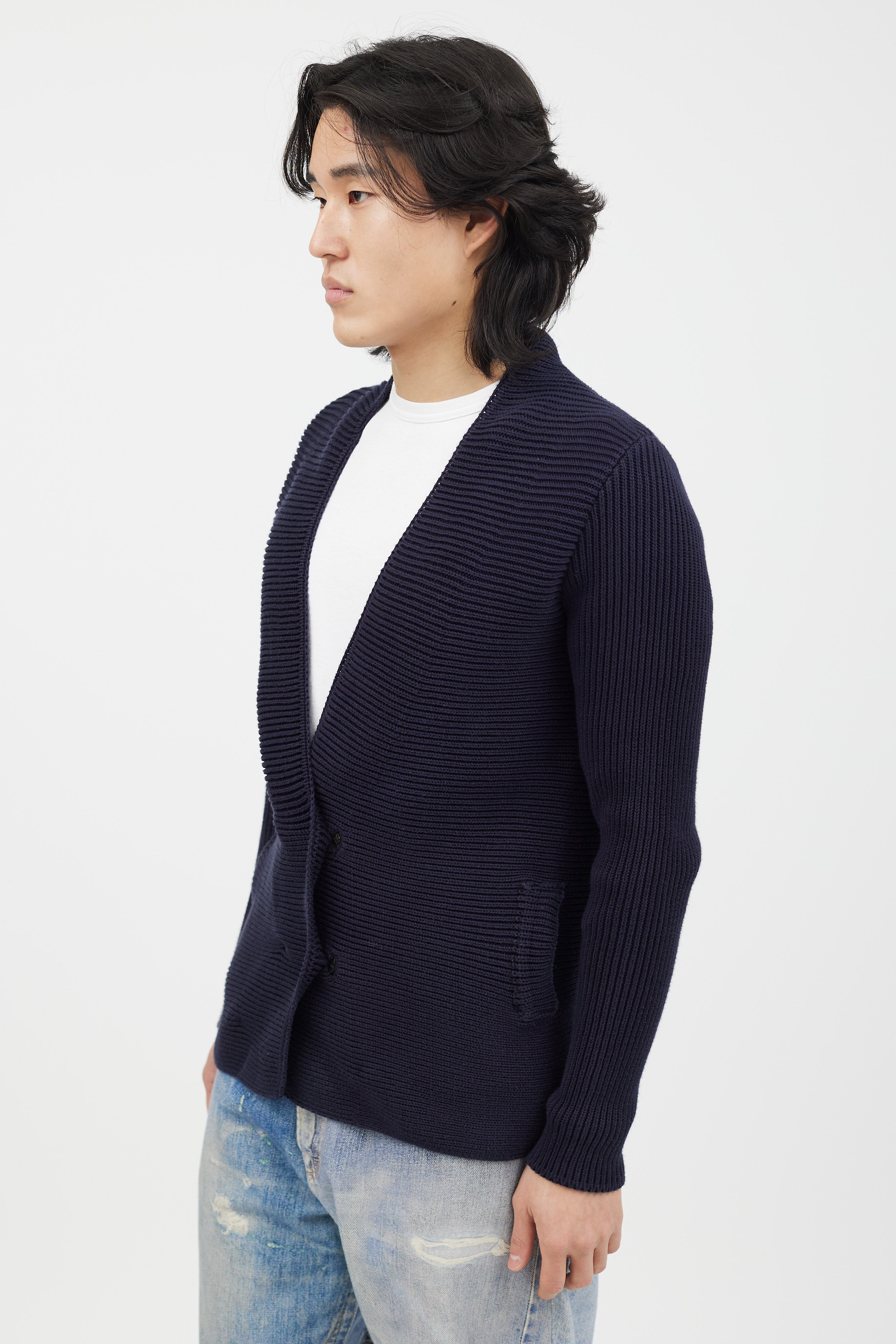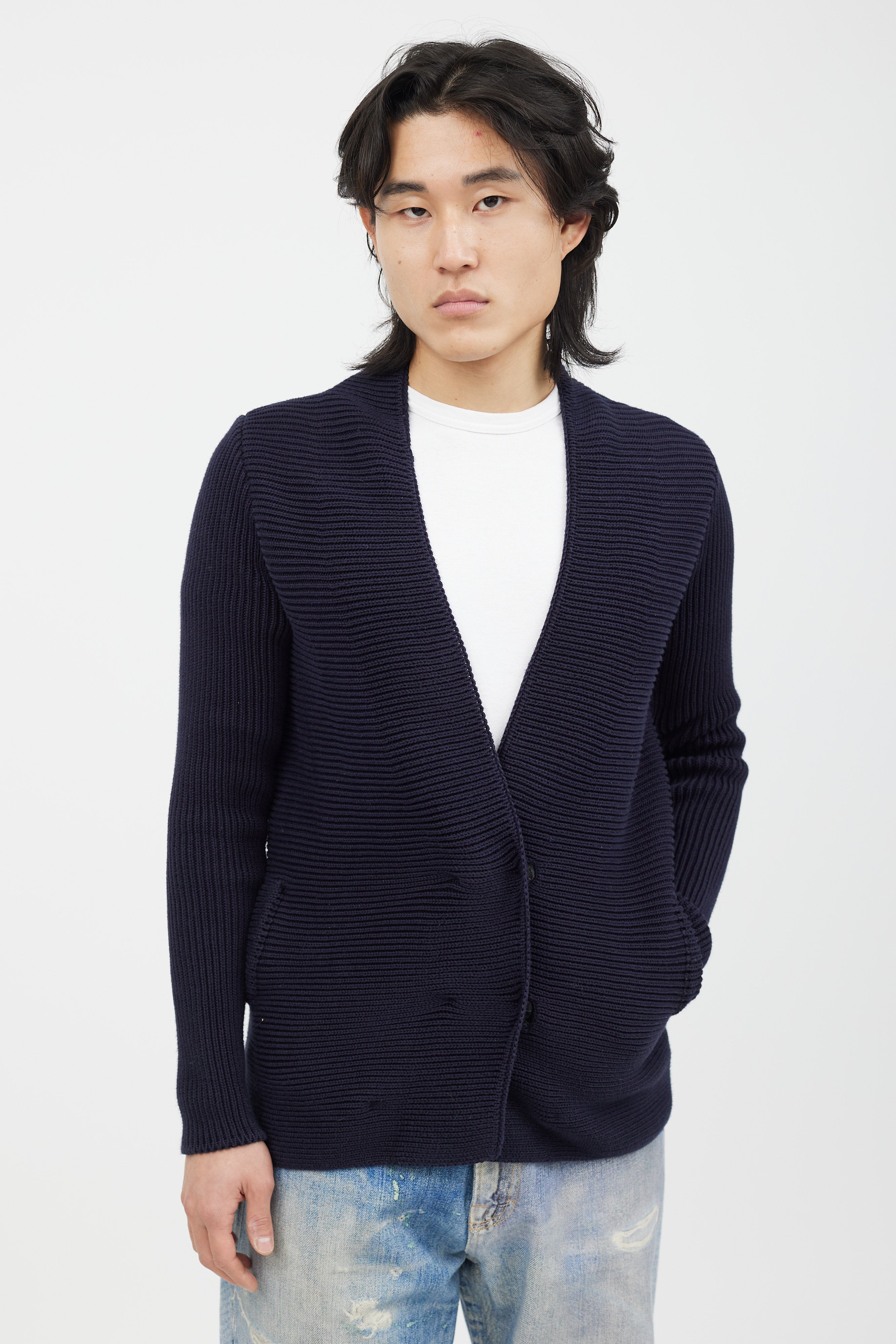 Pre-owned Maison Margiela navy double breasted knit cardigan featuring ribbed knit, V-neck, two slip pockets at hip, and four stitch label at back.