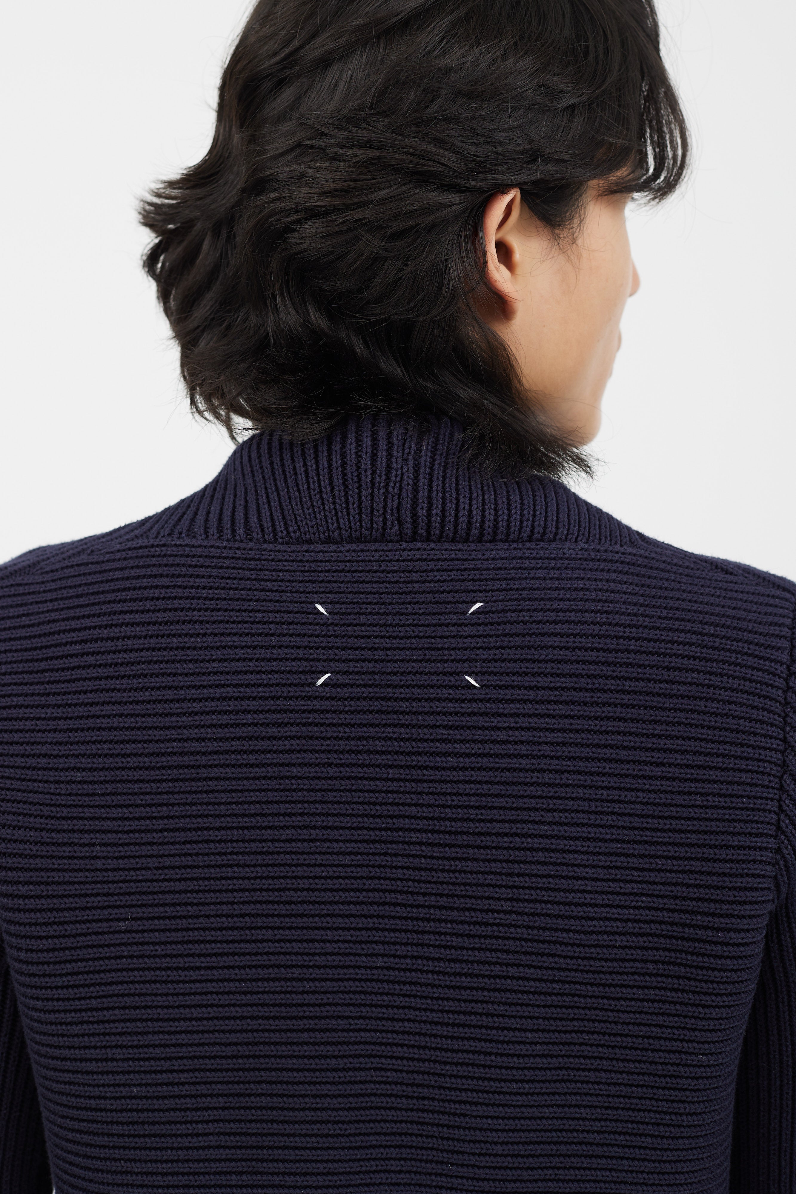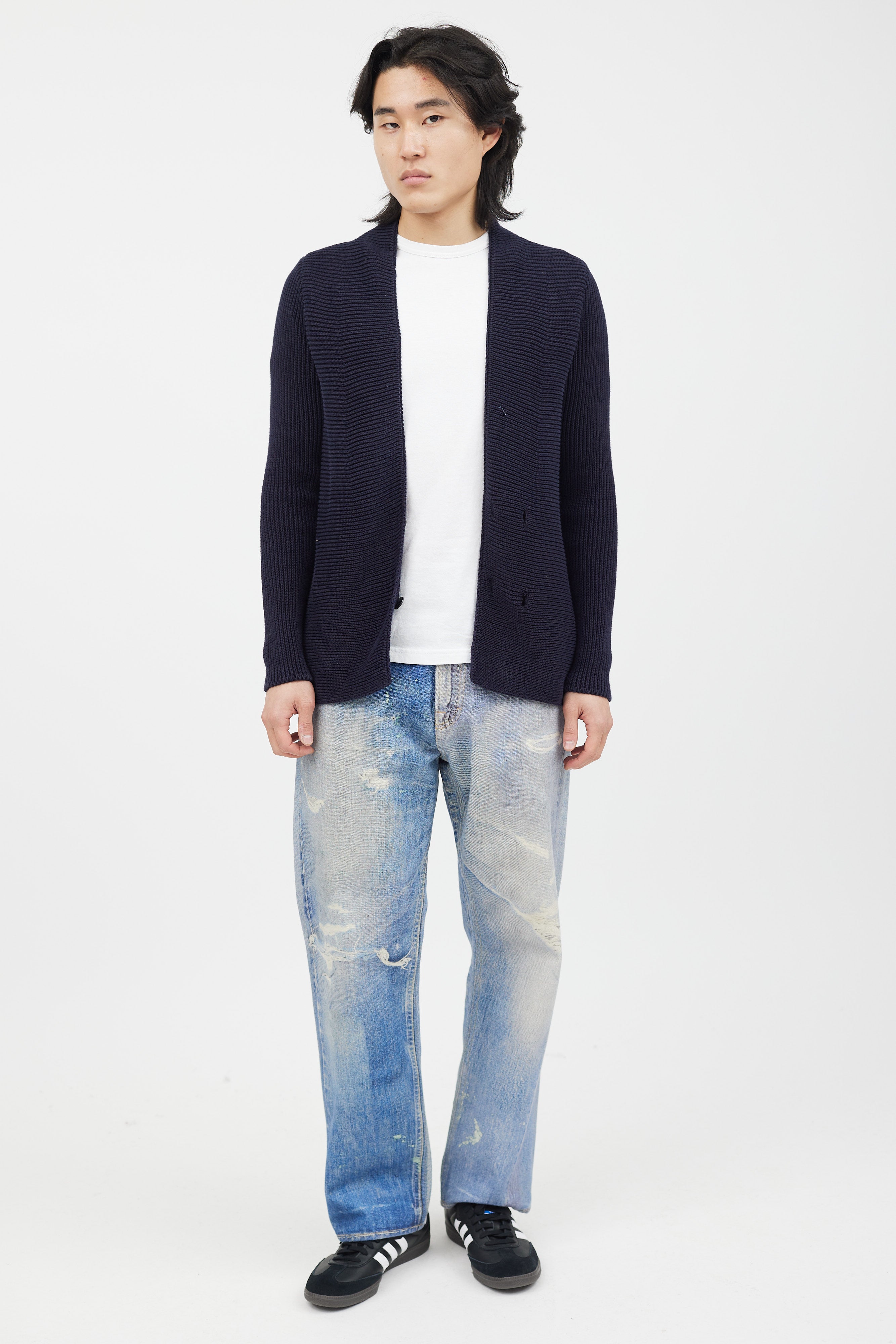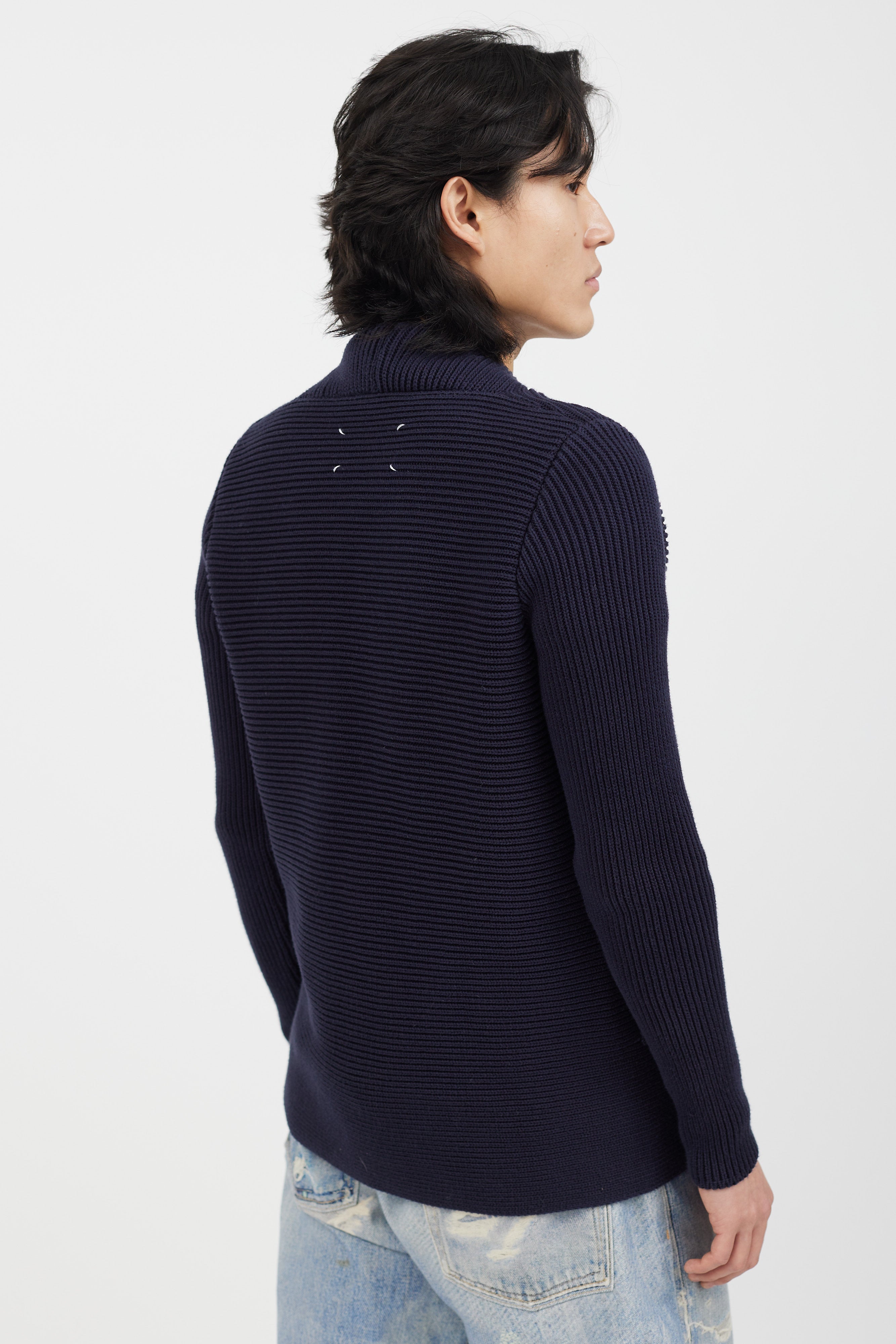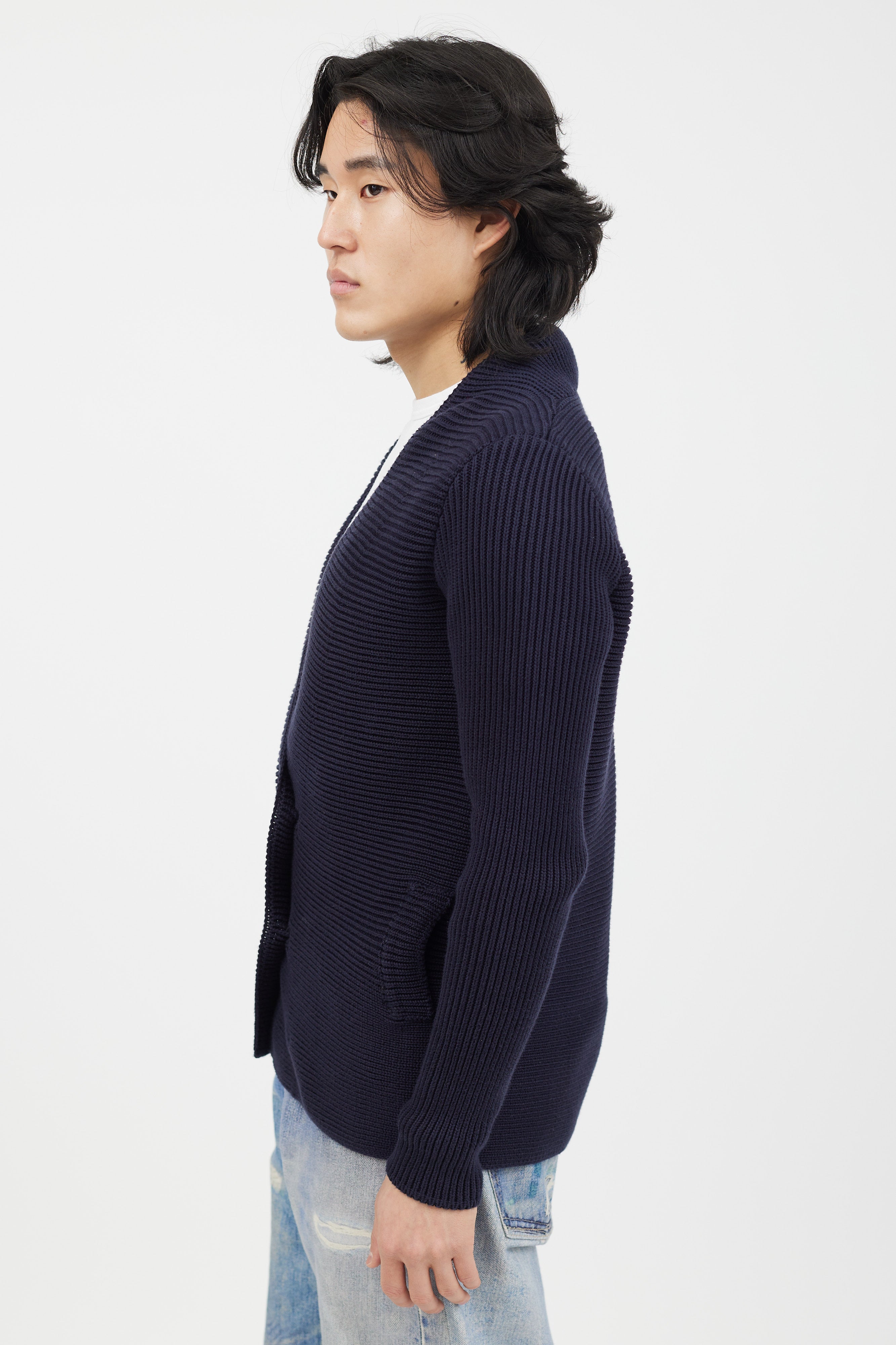 Pre-owned Maison Margiela navy double breasted knit cardigan featuring ribbed knit, V-neck, two slip pockets at hip, and four stitch label at back.