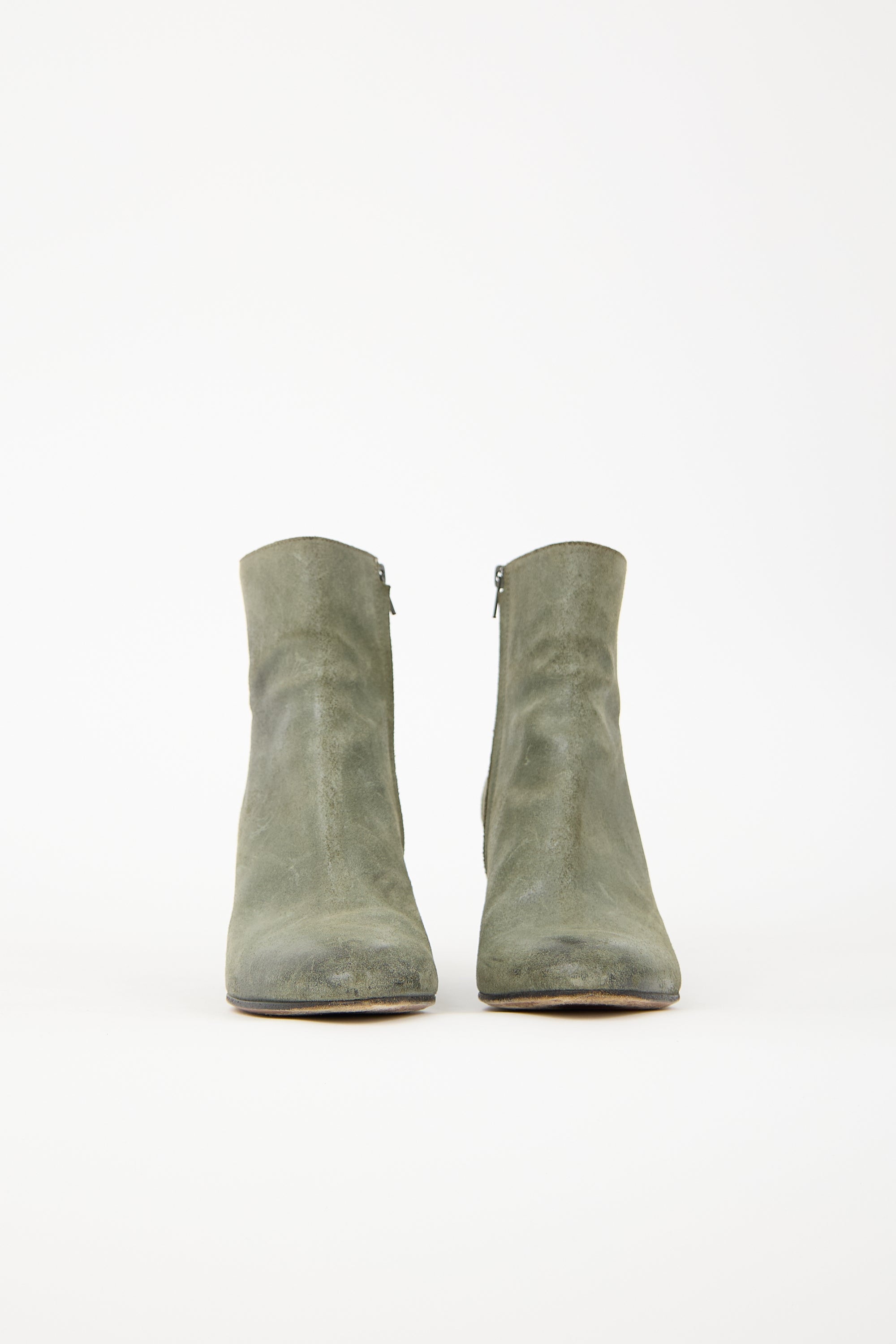 Pre-owned Maison Margiela green leather boots featuring intentional patina, rounded toe, zip closure at side, signature single stitch at back, and stacked cone heel.