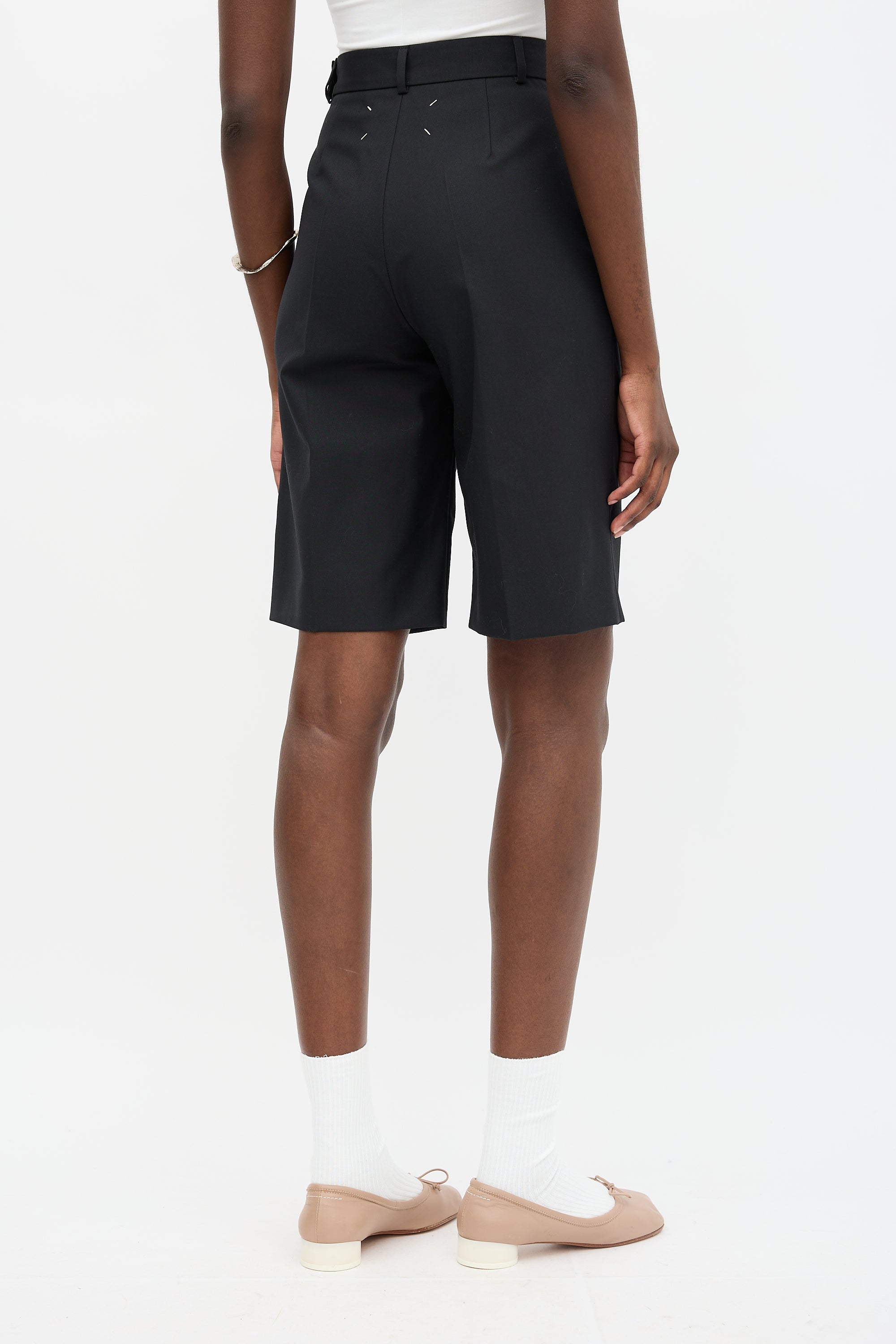 Pre-owned Maison Margiela black cropped trousers featuring high waist, front pleats, two front double welt pockets, signature four white stitches at back waist, and concealed side zip.