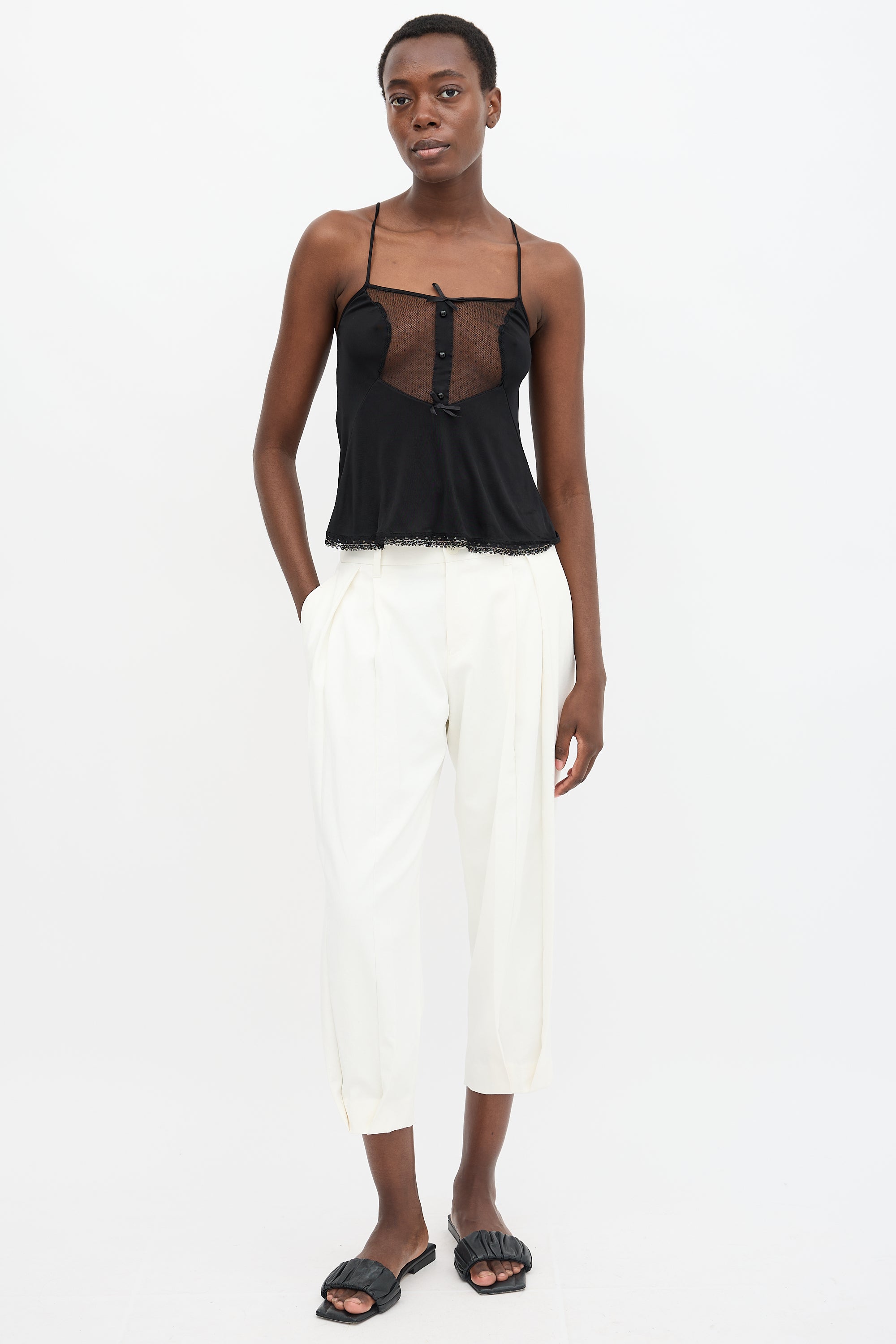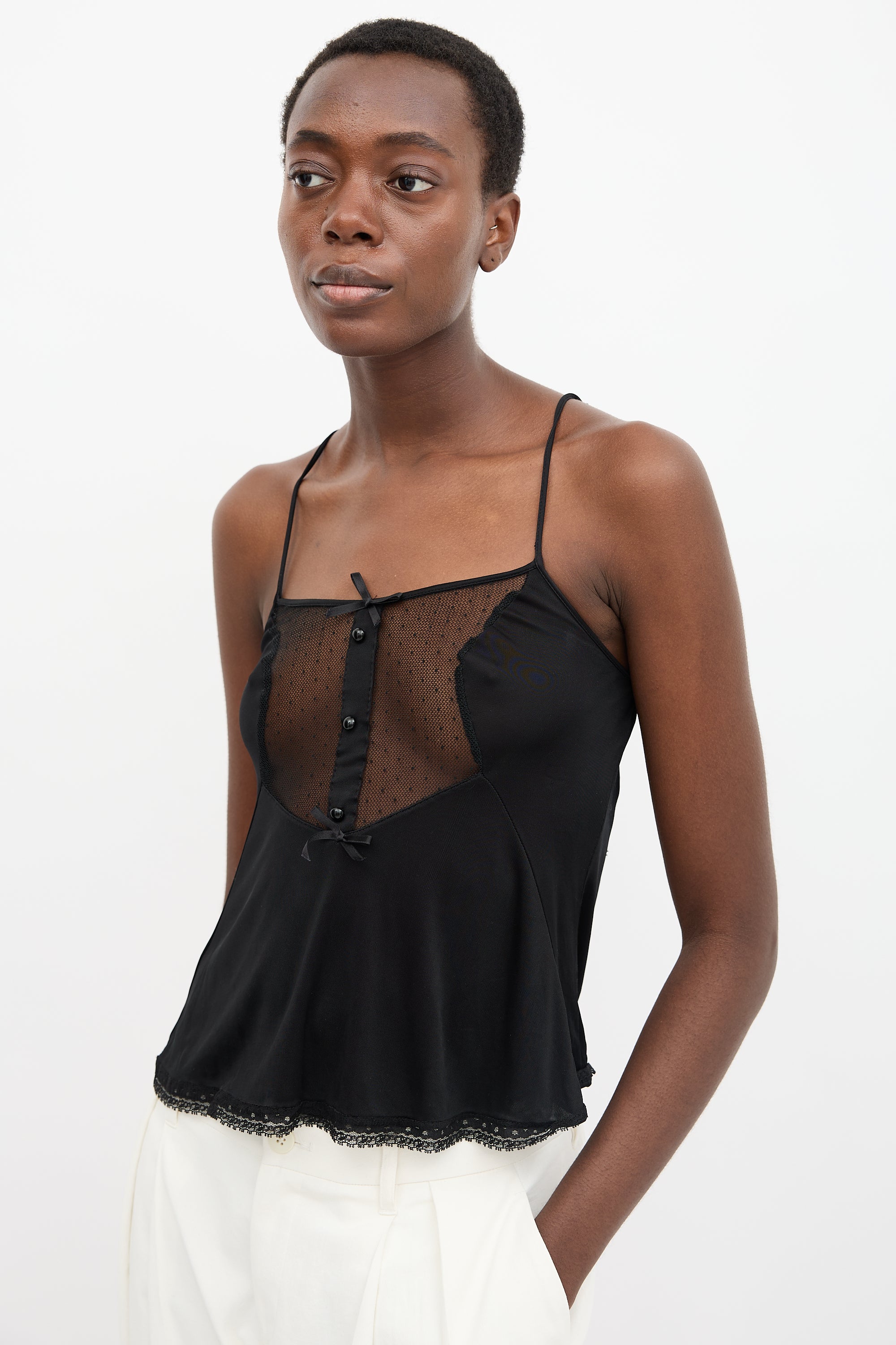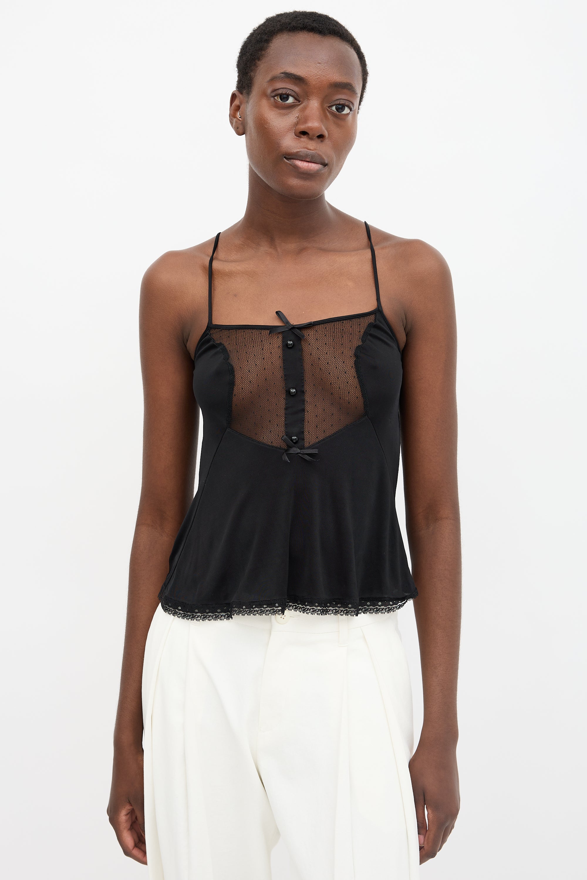 Pre-owned Maison Margiela black satin camisole featuring adjustable straps, round neckline, dot mesh front yoke with bow and button embellishments, lace hem trim, and signature four white stitched at upper back. Replica of 1982 nighty.