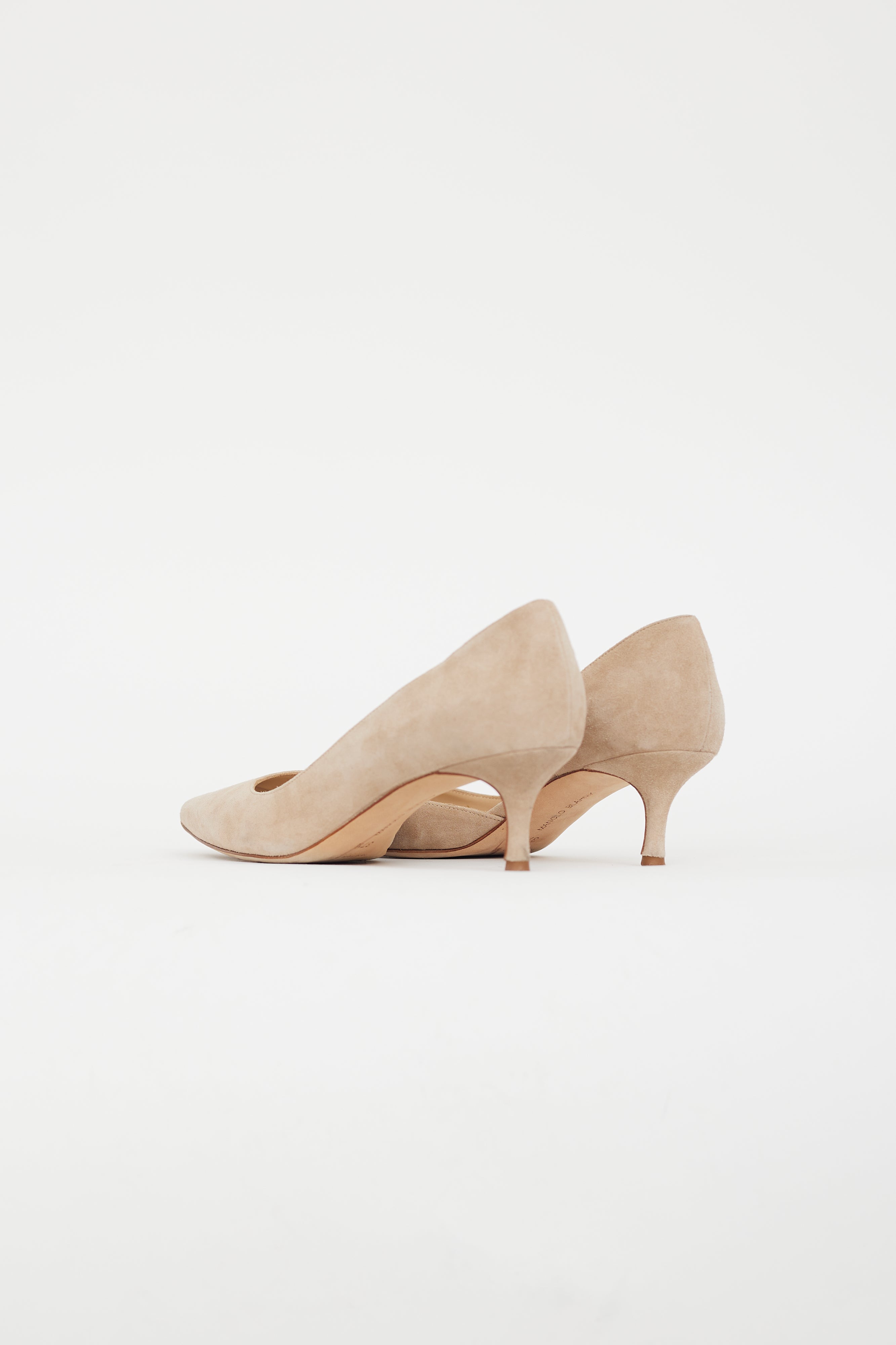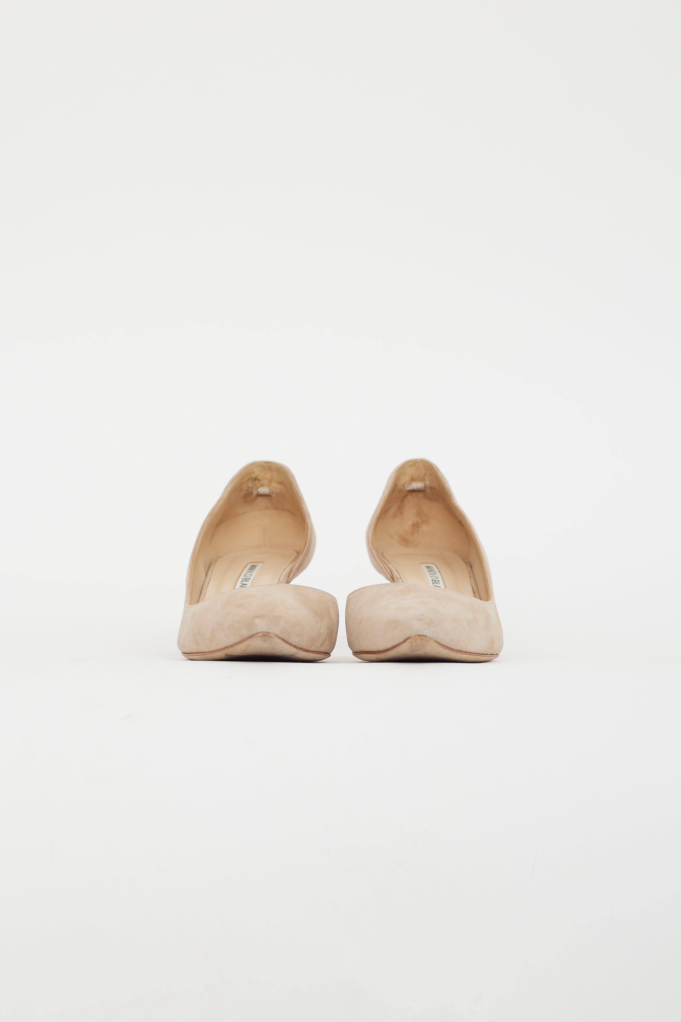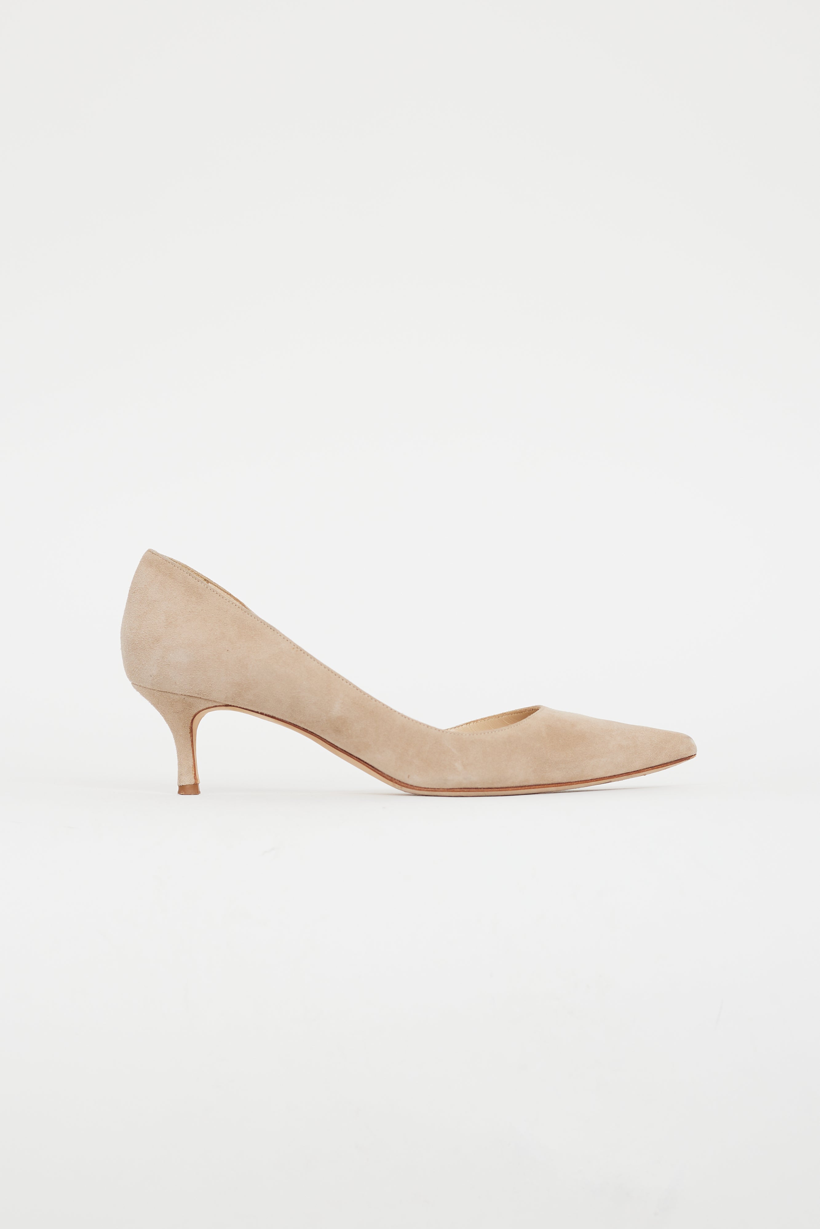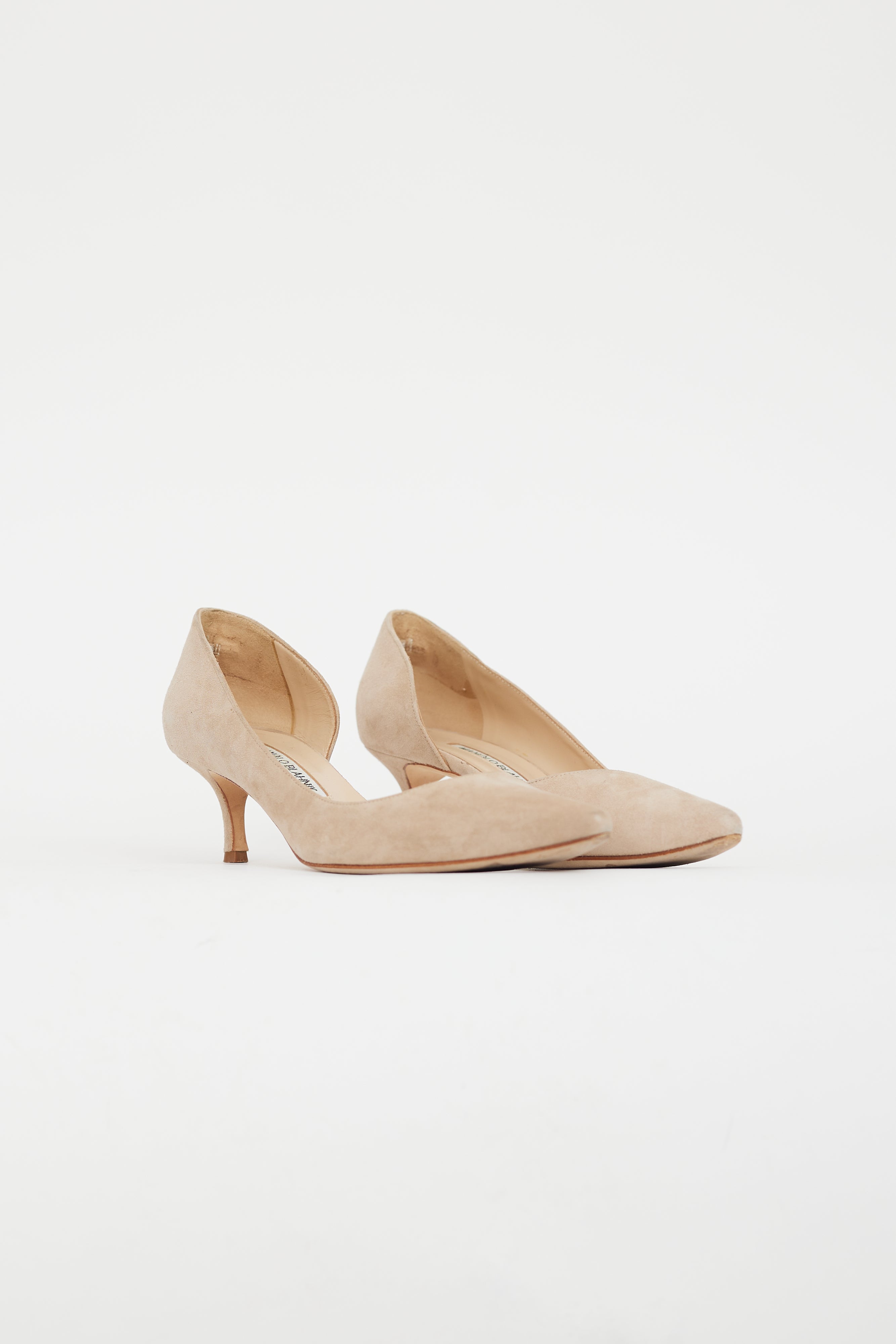 Pre-owned Manolo Blahnik beige suede D'Orsay pumps featuring a pointed toe, wrapped kitten heel, and cut out at side.
