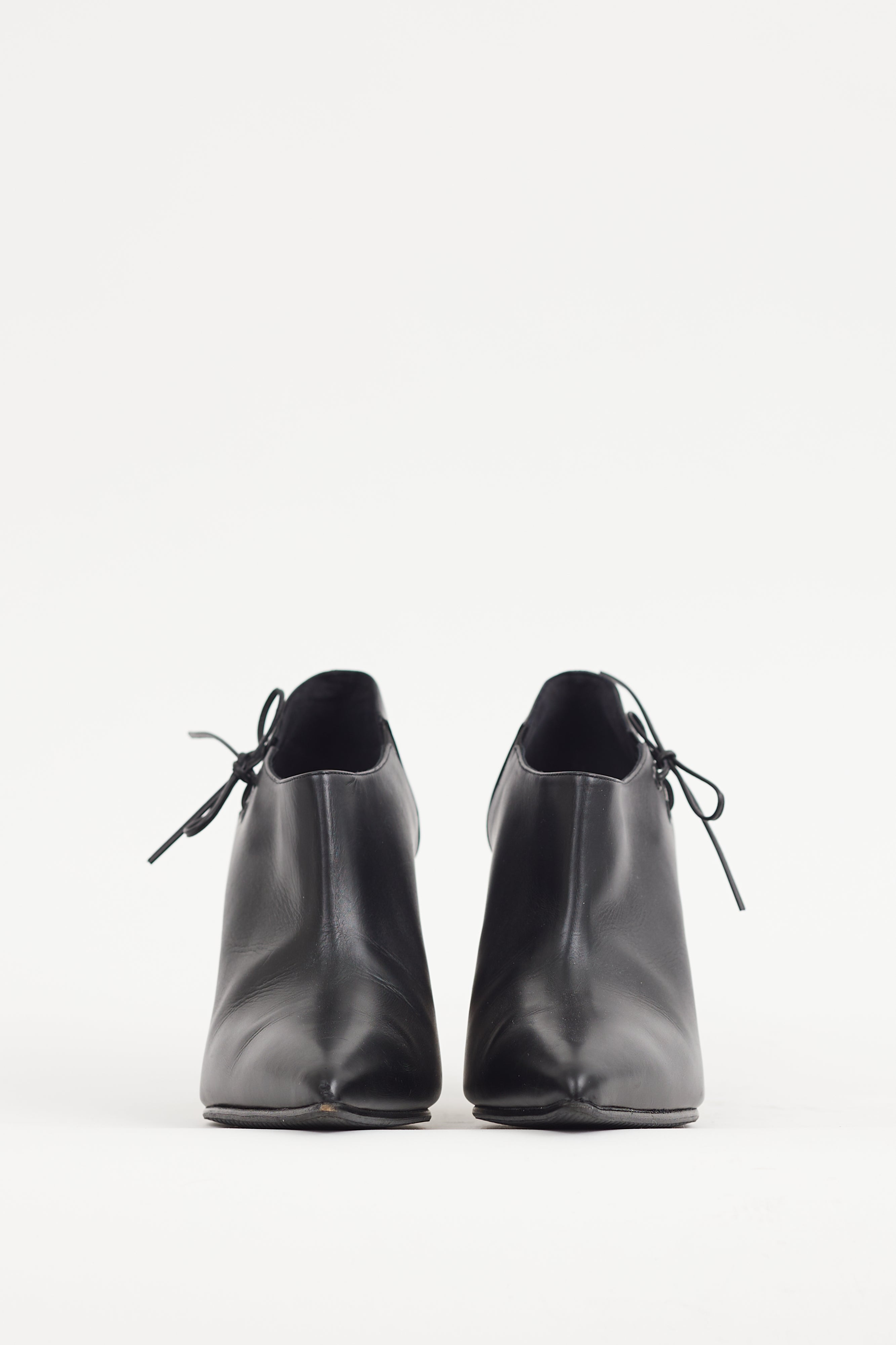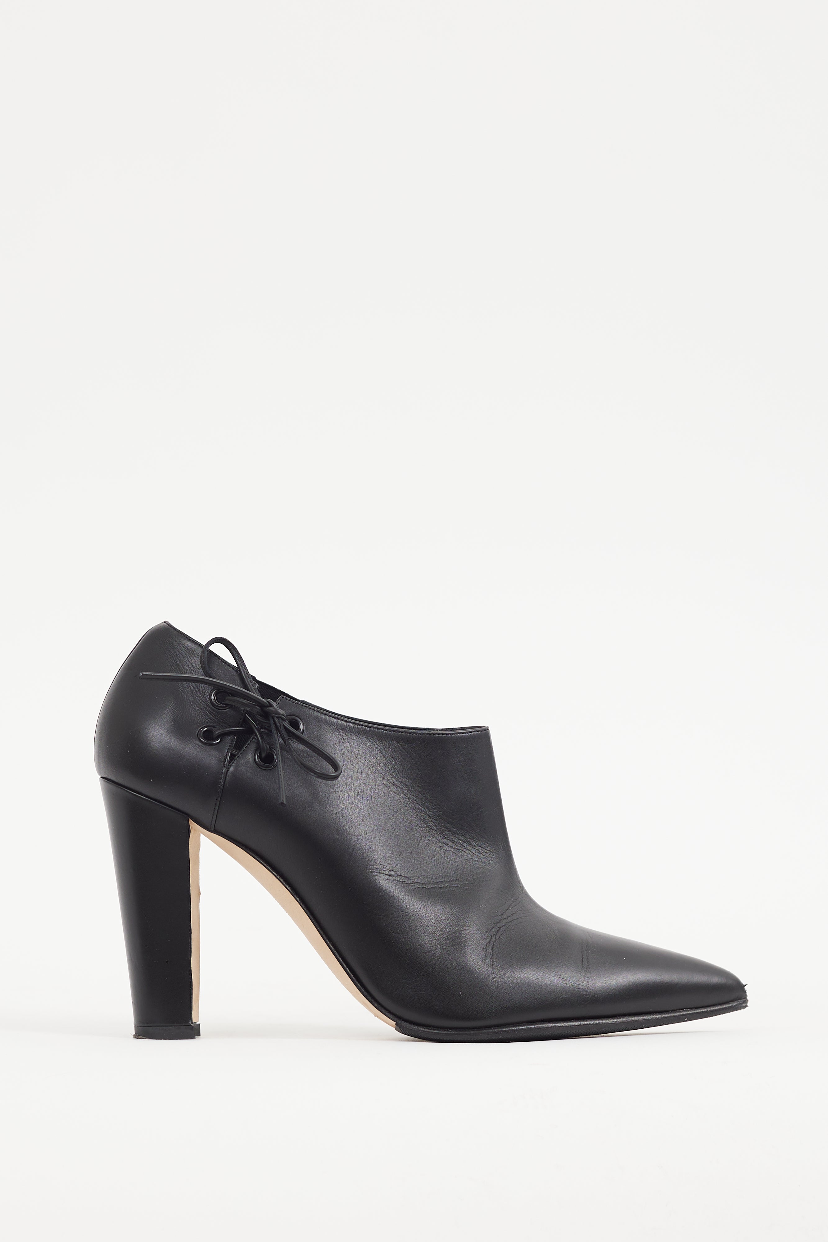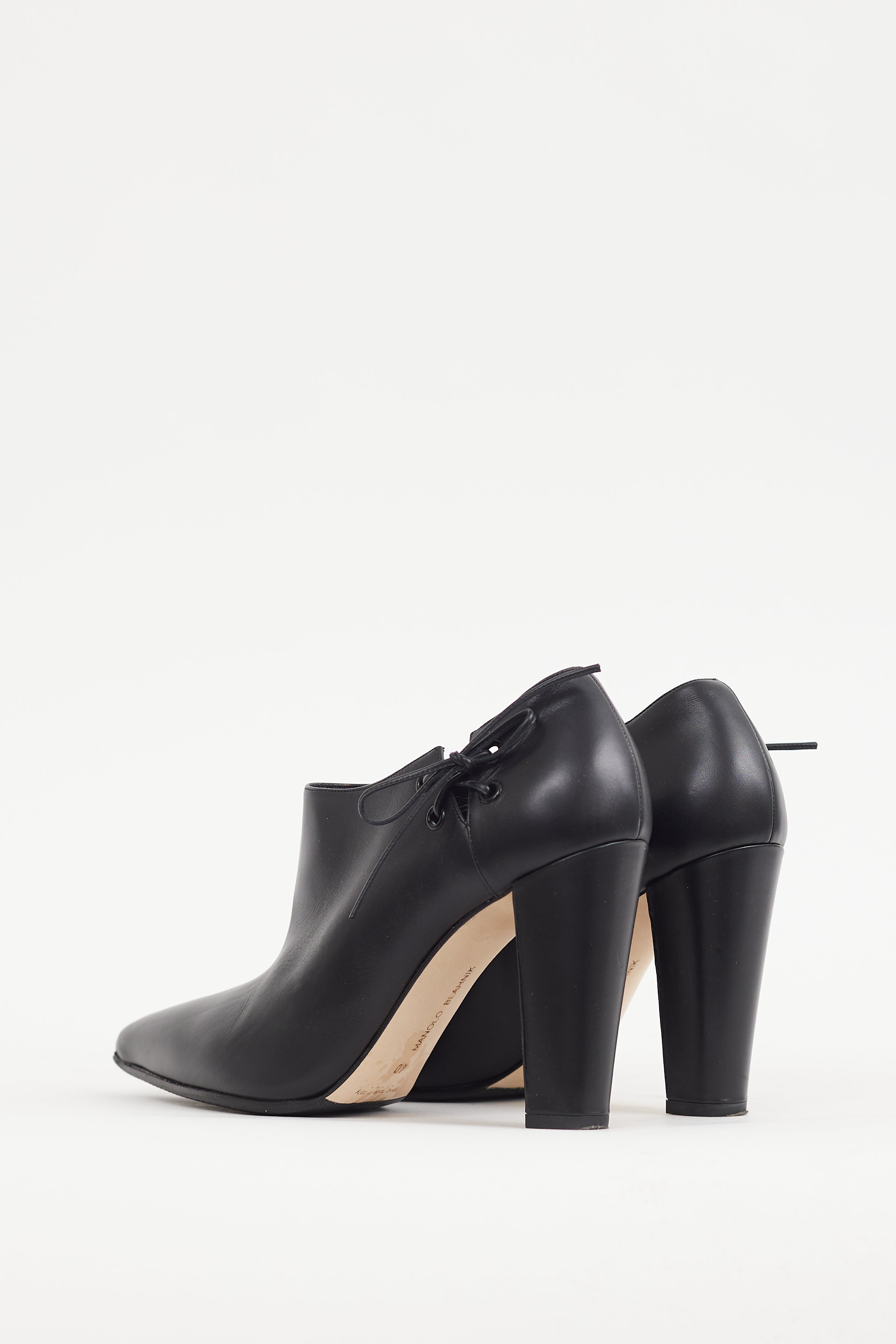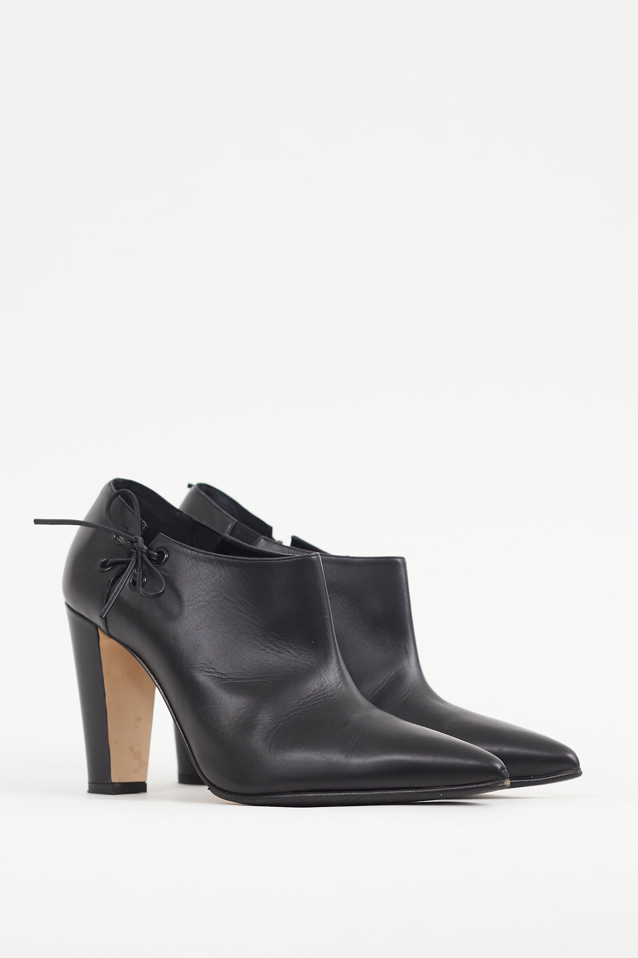 Pre-owned Manolo Blahnik black leather booties featuring a pointed toe, wrapped blocked heel, and lace up detail at side.