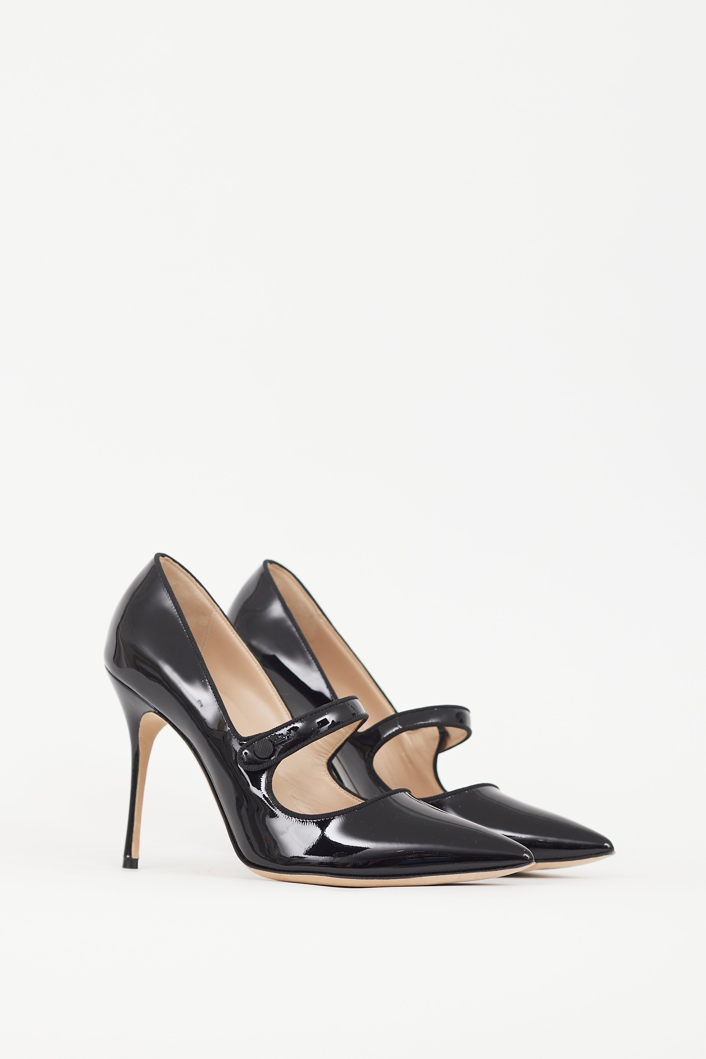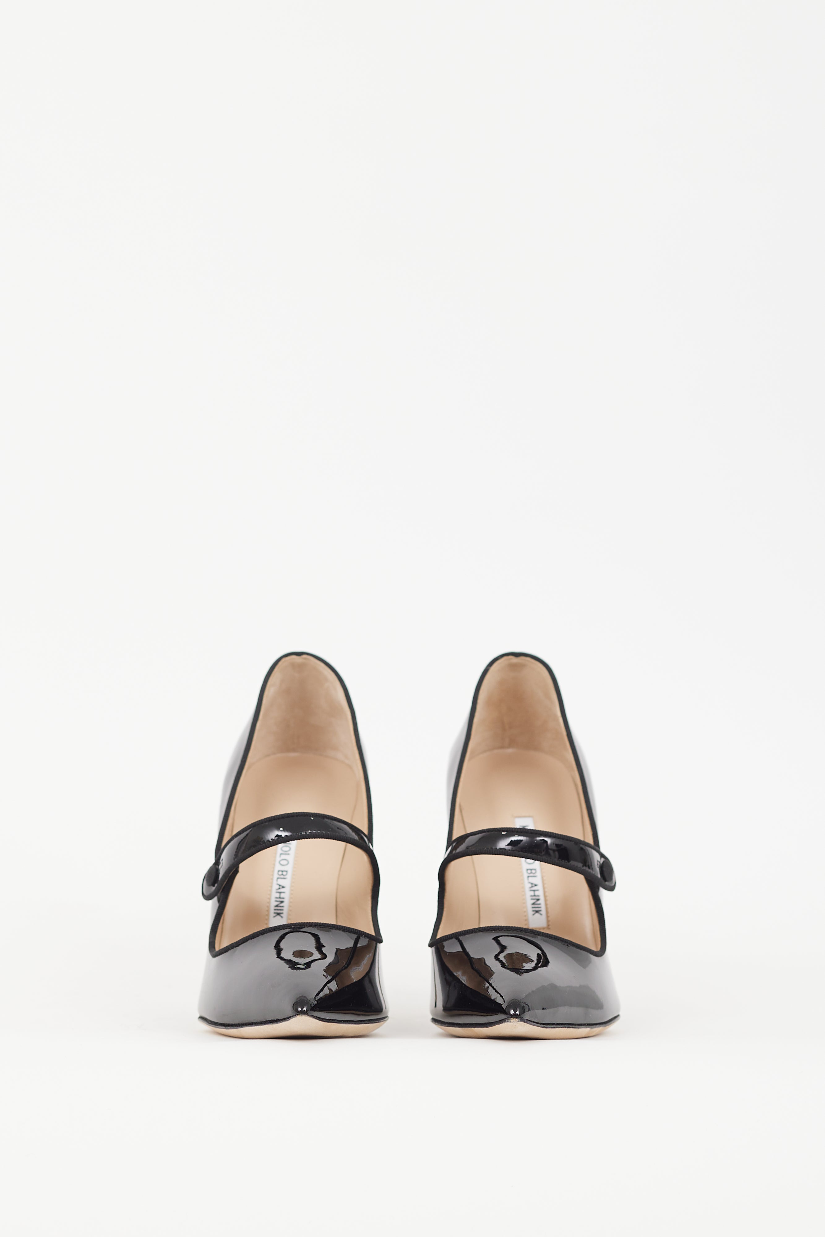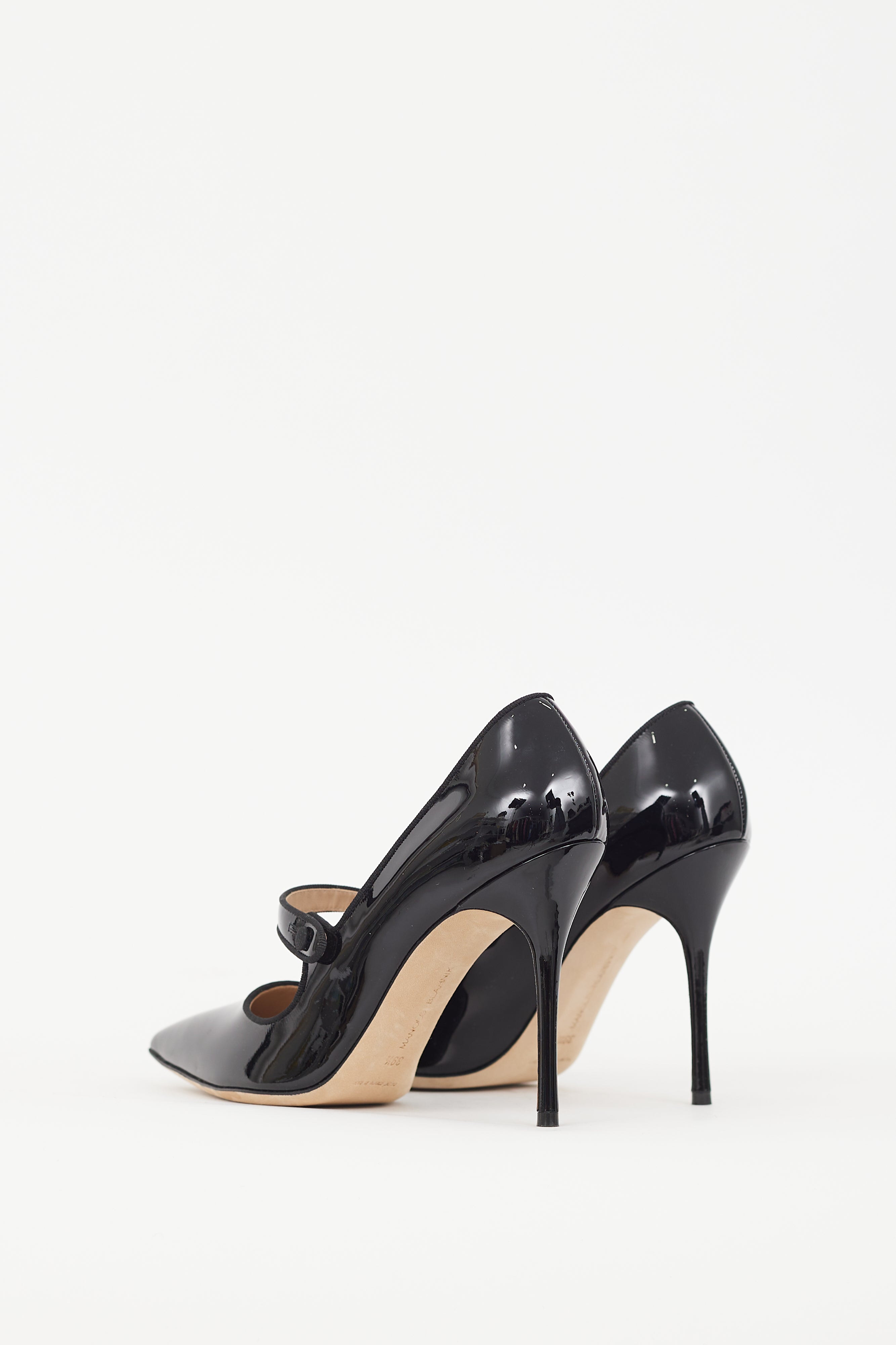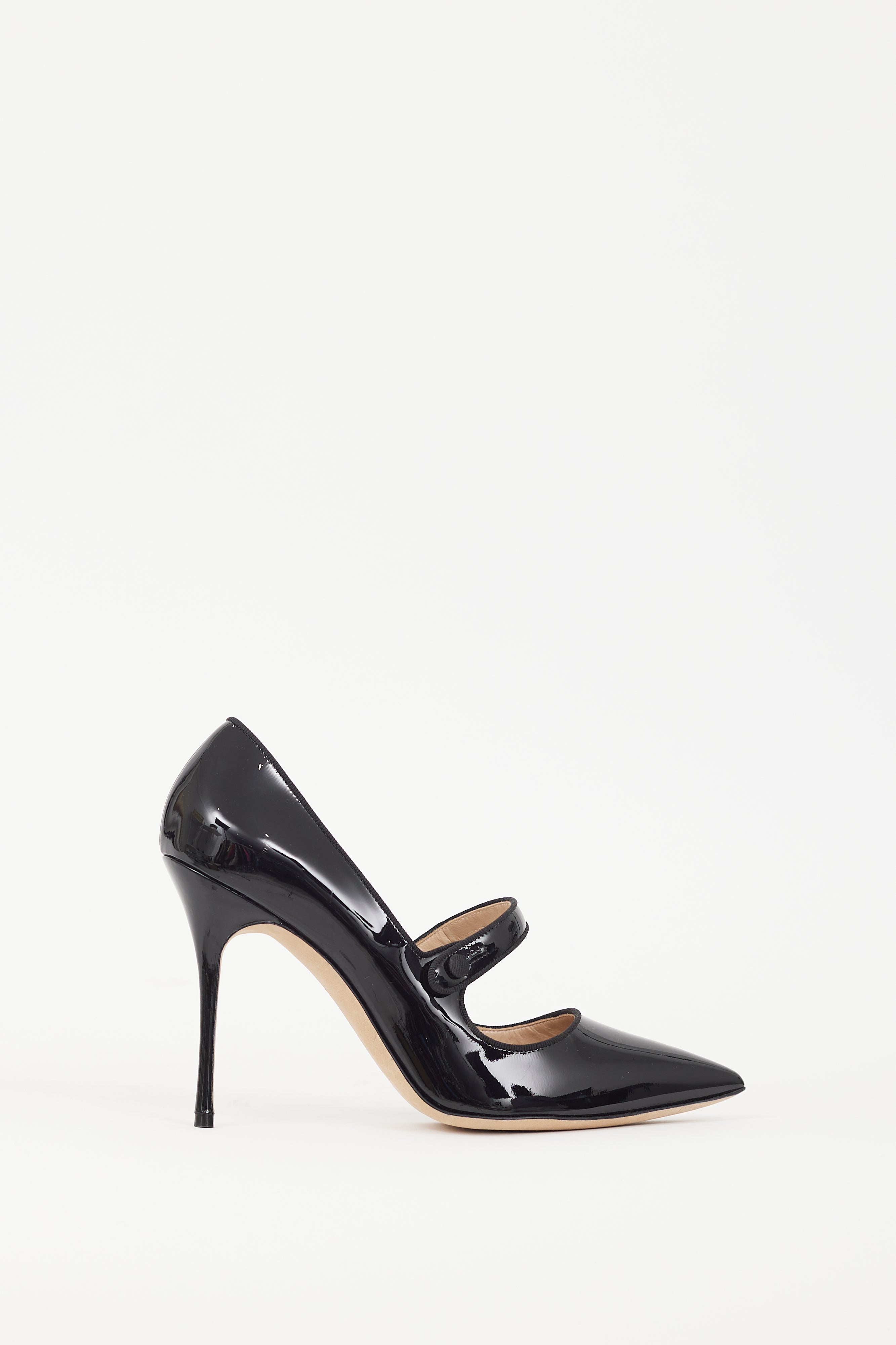 Pre-owned Manolo Blahnik black patent Camparinew mary jane pumps featuring pointed toe, decorative strap across vamp, slip on entry, and covered stiletto heel. Comes with original dust bag.