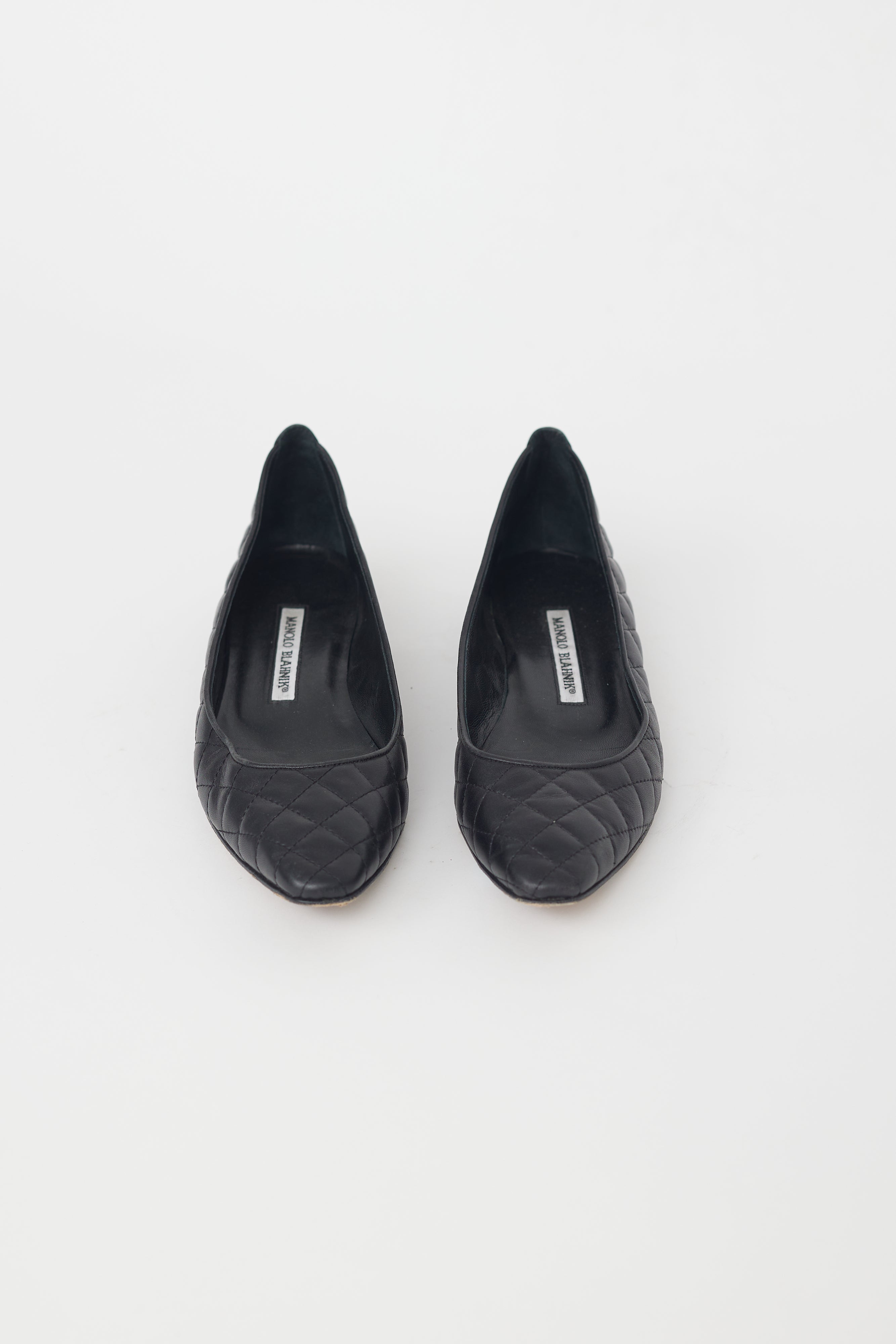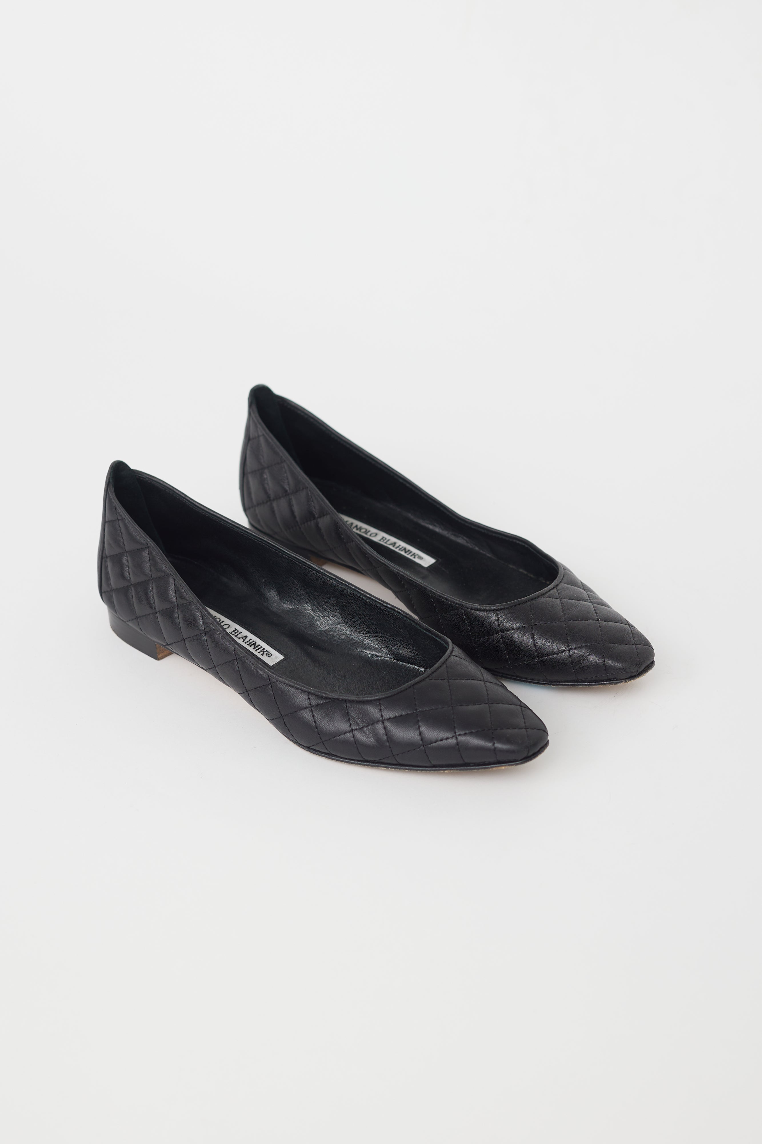 Pre-owned Manolo Blahnik black quilted leather flats featuring square pointed toe, slip on entry, and short stacked block heel.